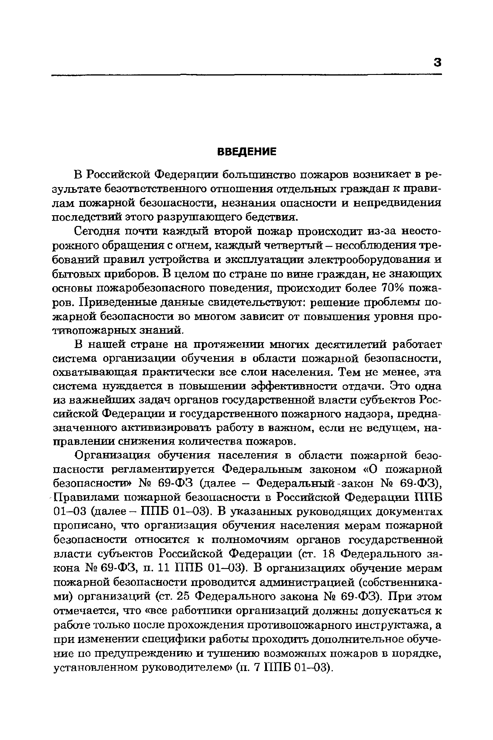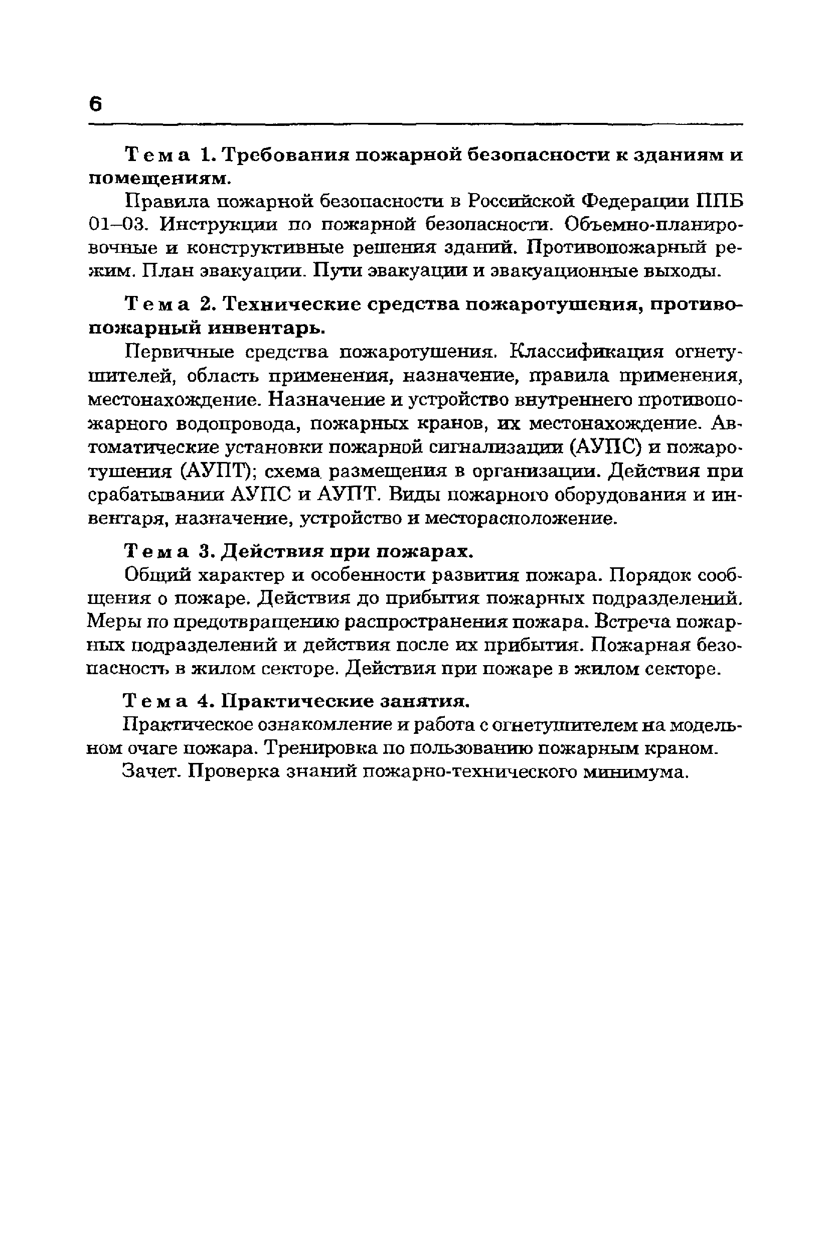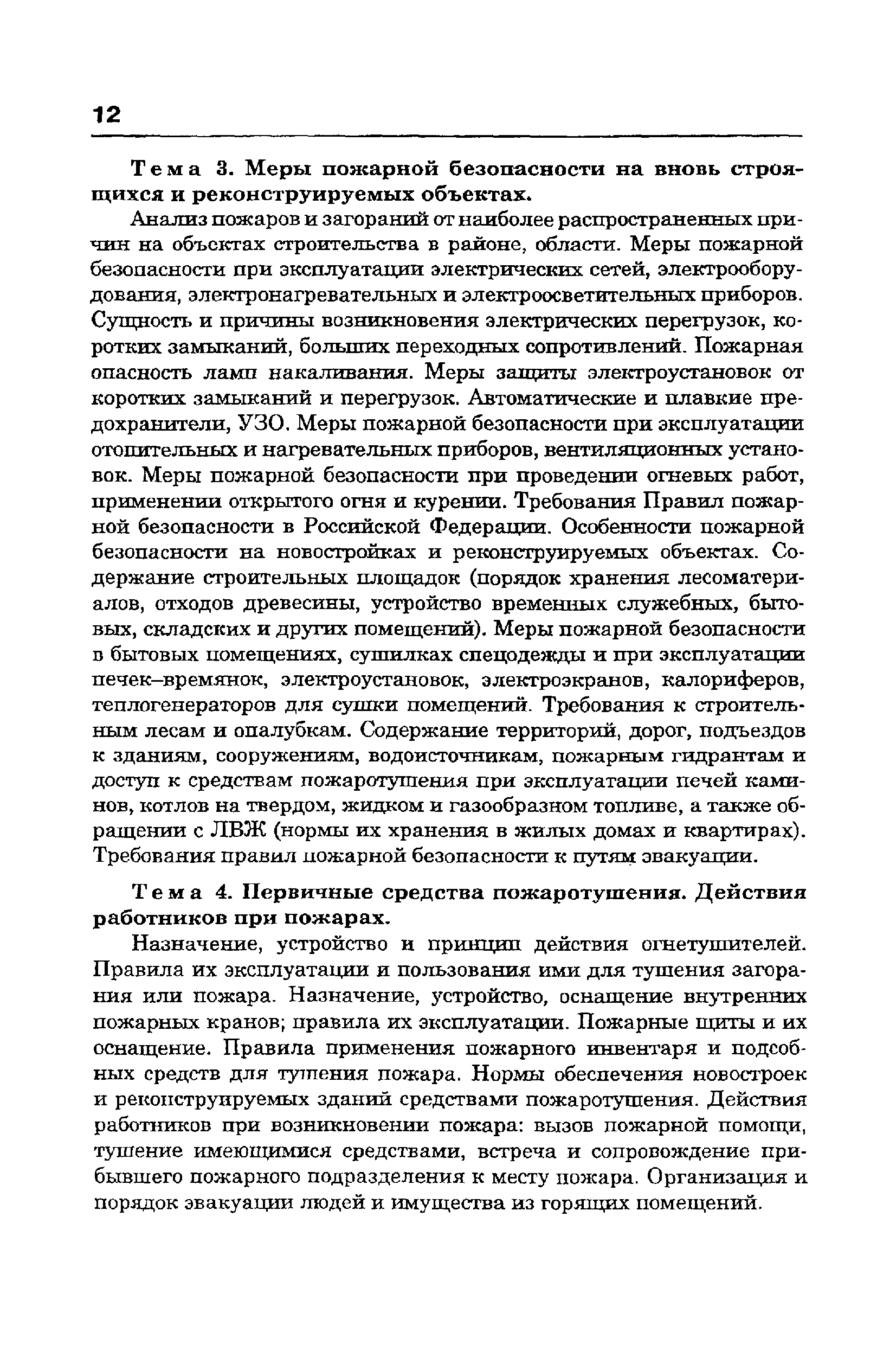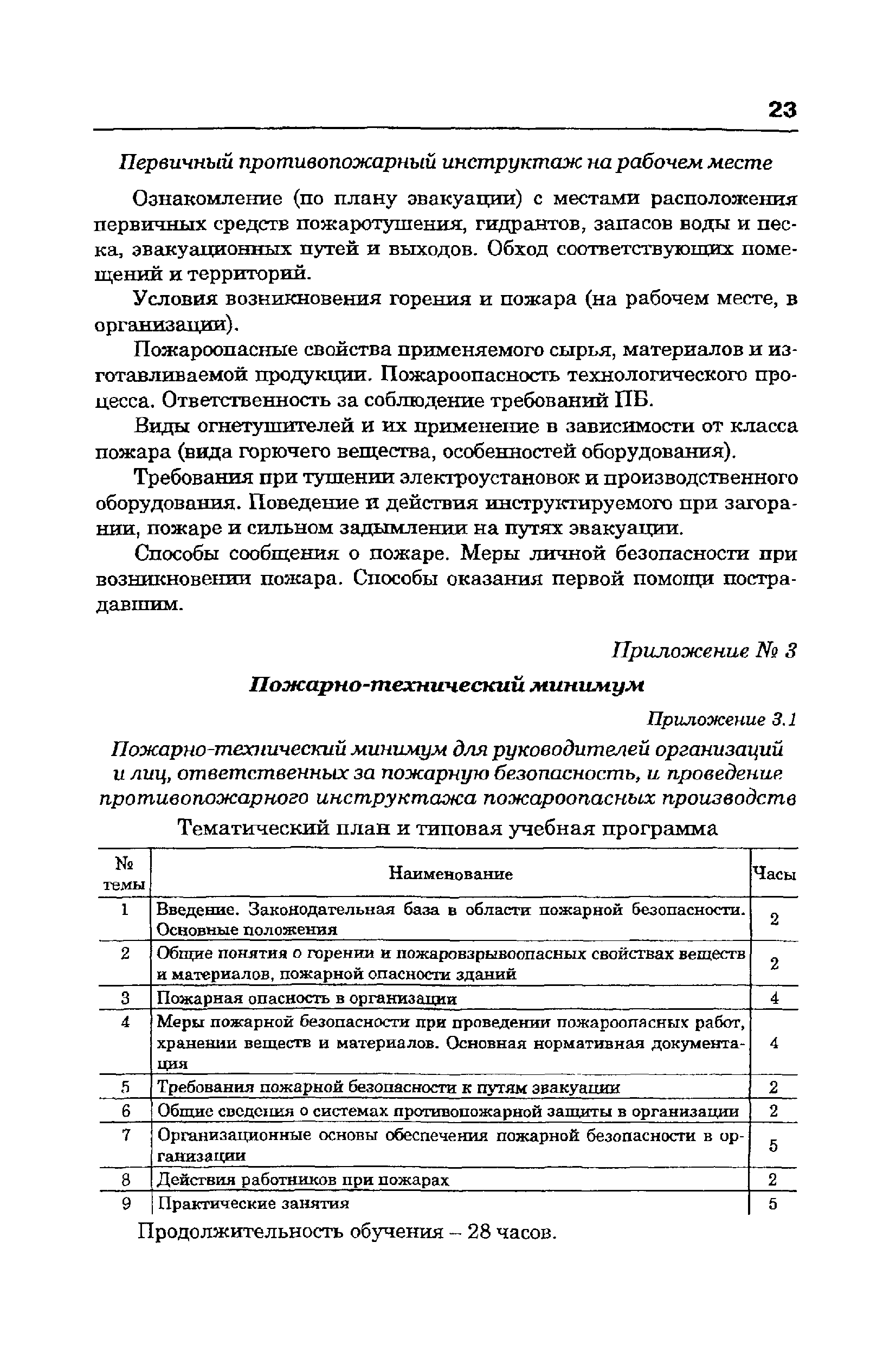 | Оглавление: | Введение 1 Термины и определения. Условные сокращения 2 Цели и задачи обучения руководителей и работников организаций в области пожарной безопасности 3 Виды обучения 3.1. Противопожарный инструктаж 3.2. Пожарно-технический минимум 4 Учебные (специальные) программы обучения в области пожарной безопасности 5 Правила изложения учебных программ и нормативно-техническая литература 6 Методические указания по организации деятельности государственного пожарного надзора в области организации обучения населения мерам пожарной безопасности и противопожарной пропаганды Приложение 1. Журнал учета проведения инструктажей по пожарной безопасности Приложение 2. Примерная программа противопожарного инструктажа Приложение 3. Пожарно-технический минимум |