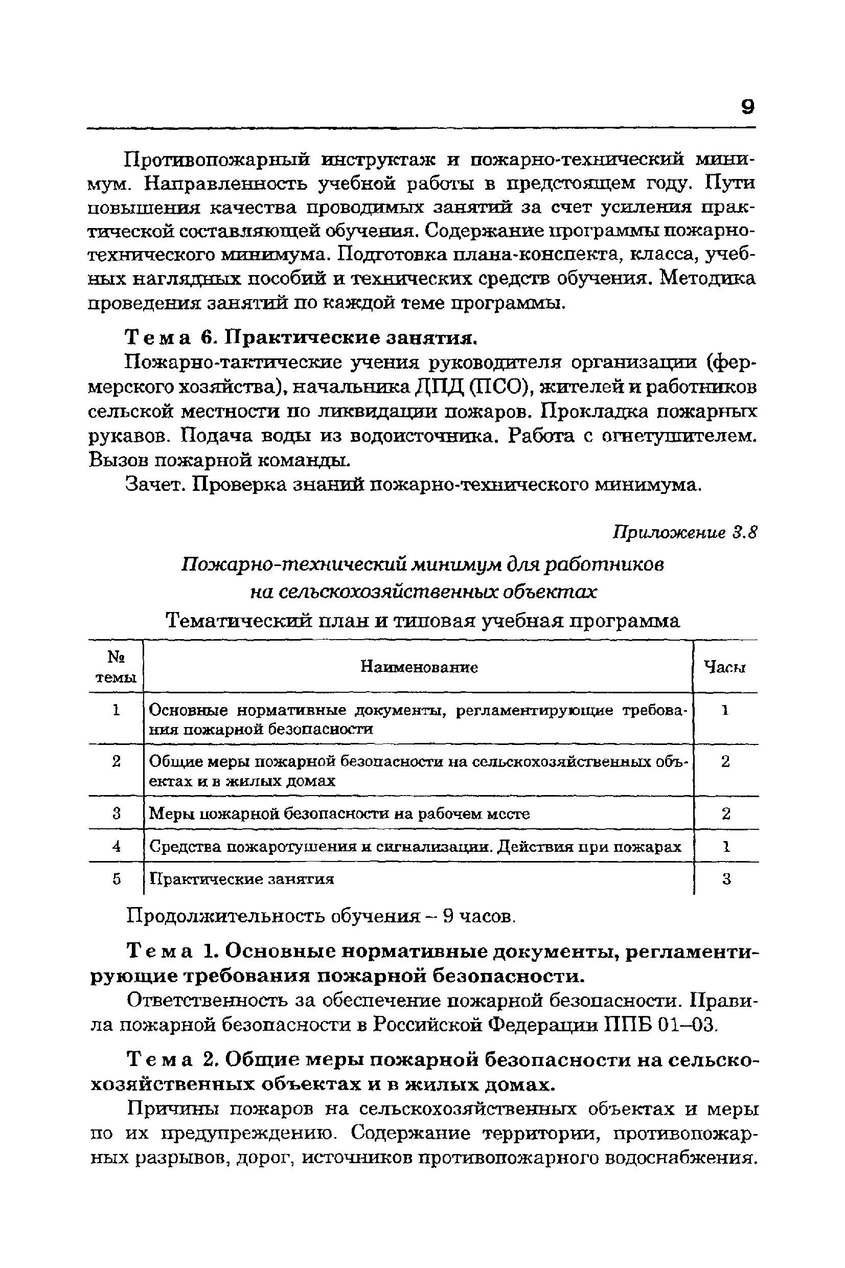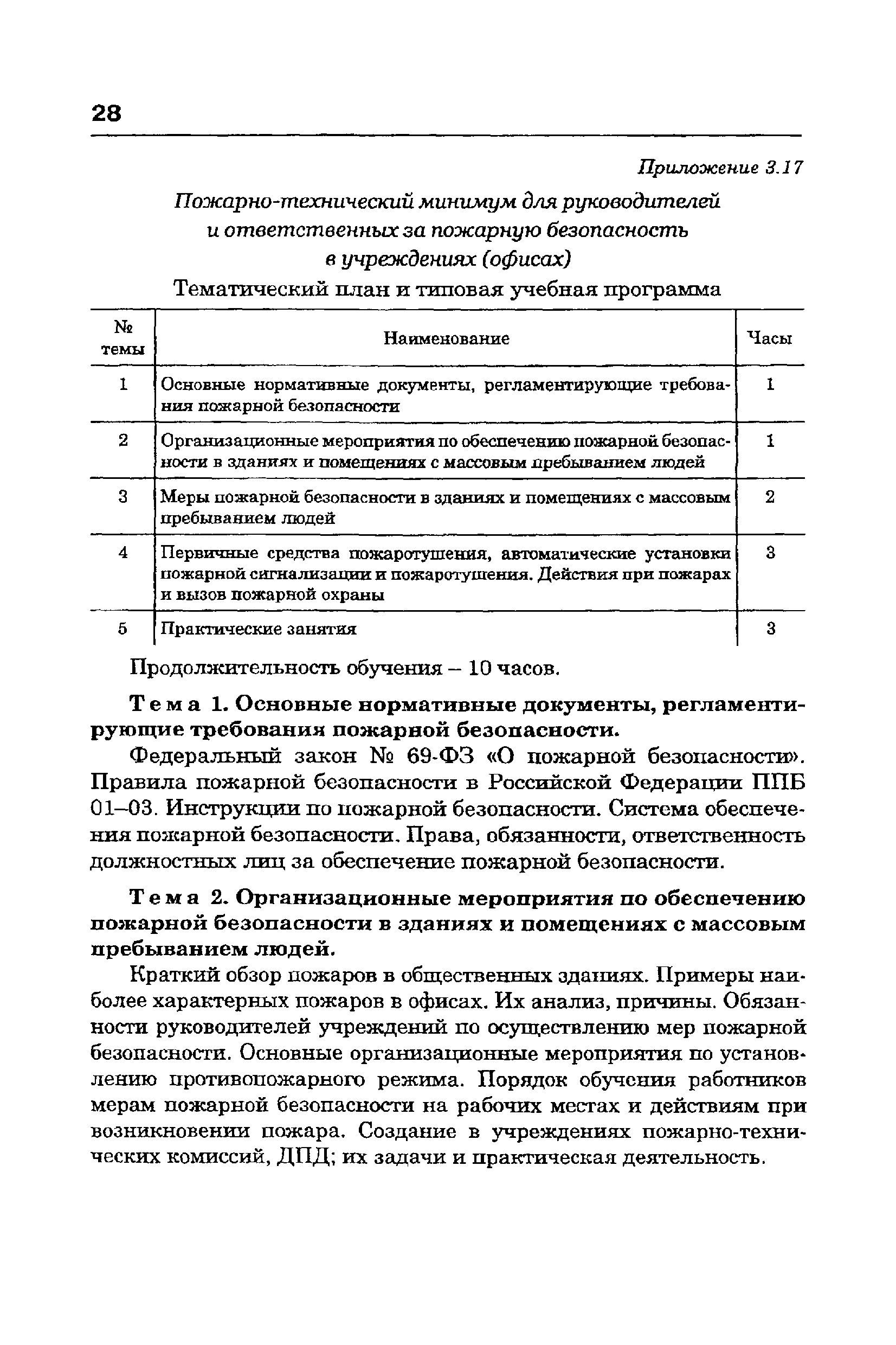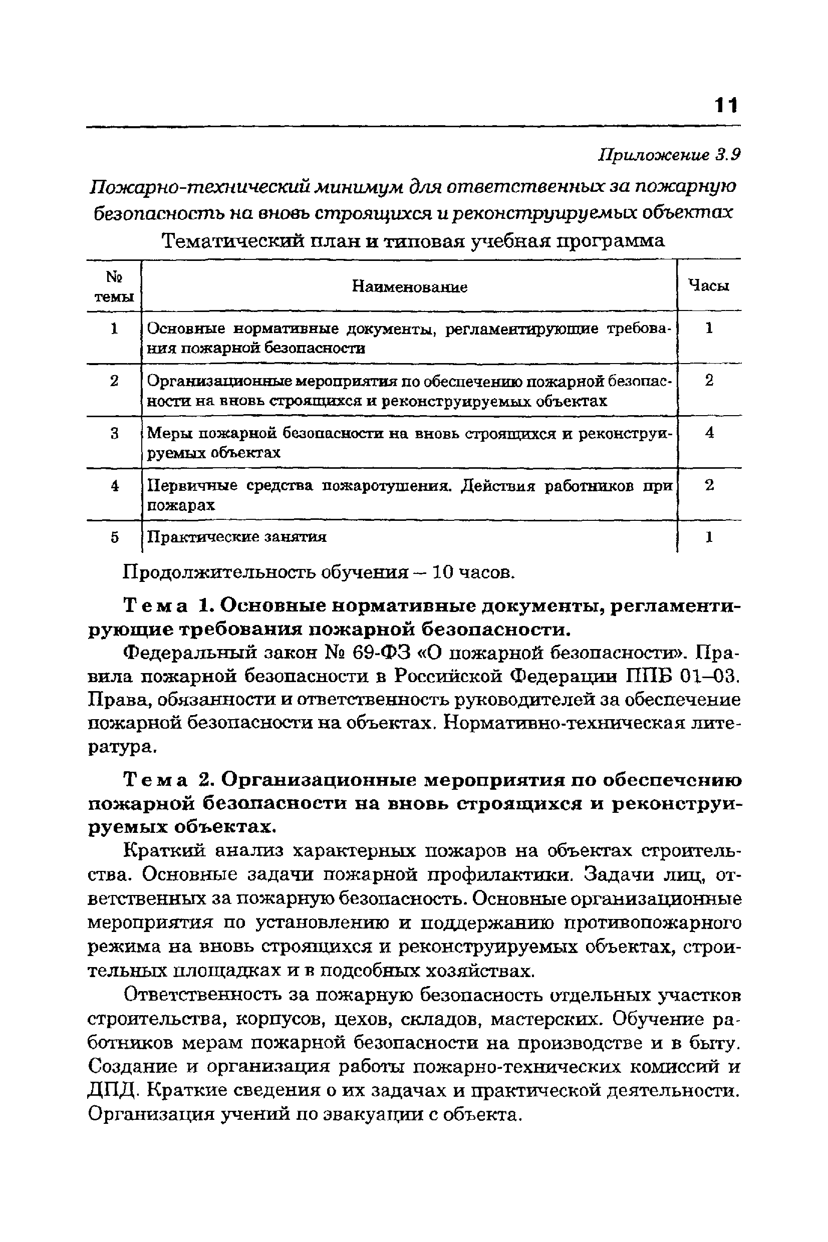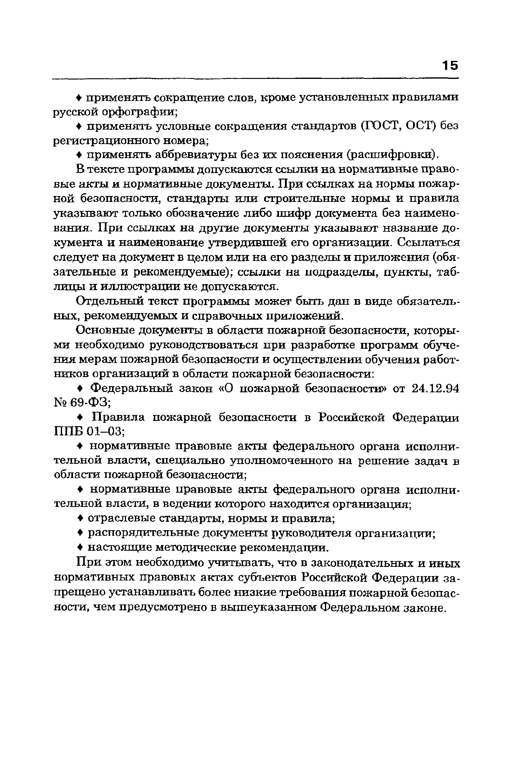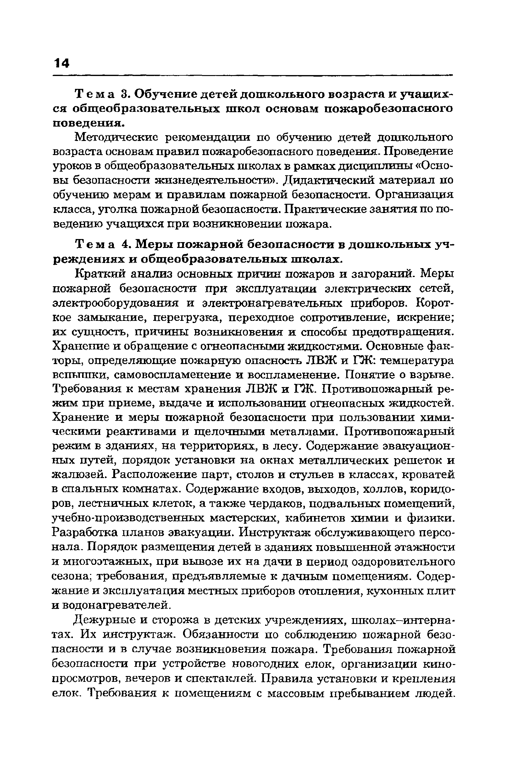 | Оглавление: | Введение 1 Термины и определения. Условные сокращения 2 Цели и задачи обучения руководителей и работников организаций в области пожарной безопасности 3 Виды обучения 3.1. Противопожарный инструктаж 3.2. Пожарно-технический минимум 4 Учебные (специальные) программы обучения в области пожарной безопасности 5 Правила изложения учебных программ и нормативно-техническая литература 6 Методические указания по организации деятельности государственного пожарного надзора в области организации обучения населения мерам пожарной безопасности и противопожарной пропаганды Приложение 1. Журнал учета проведения инструктажей по пожарной безопасности Приложение 2. Примерная программа противопожарного инструктажа Приложение 3. Пожарно-технический минимум |