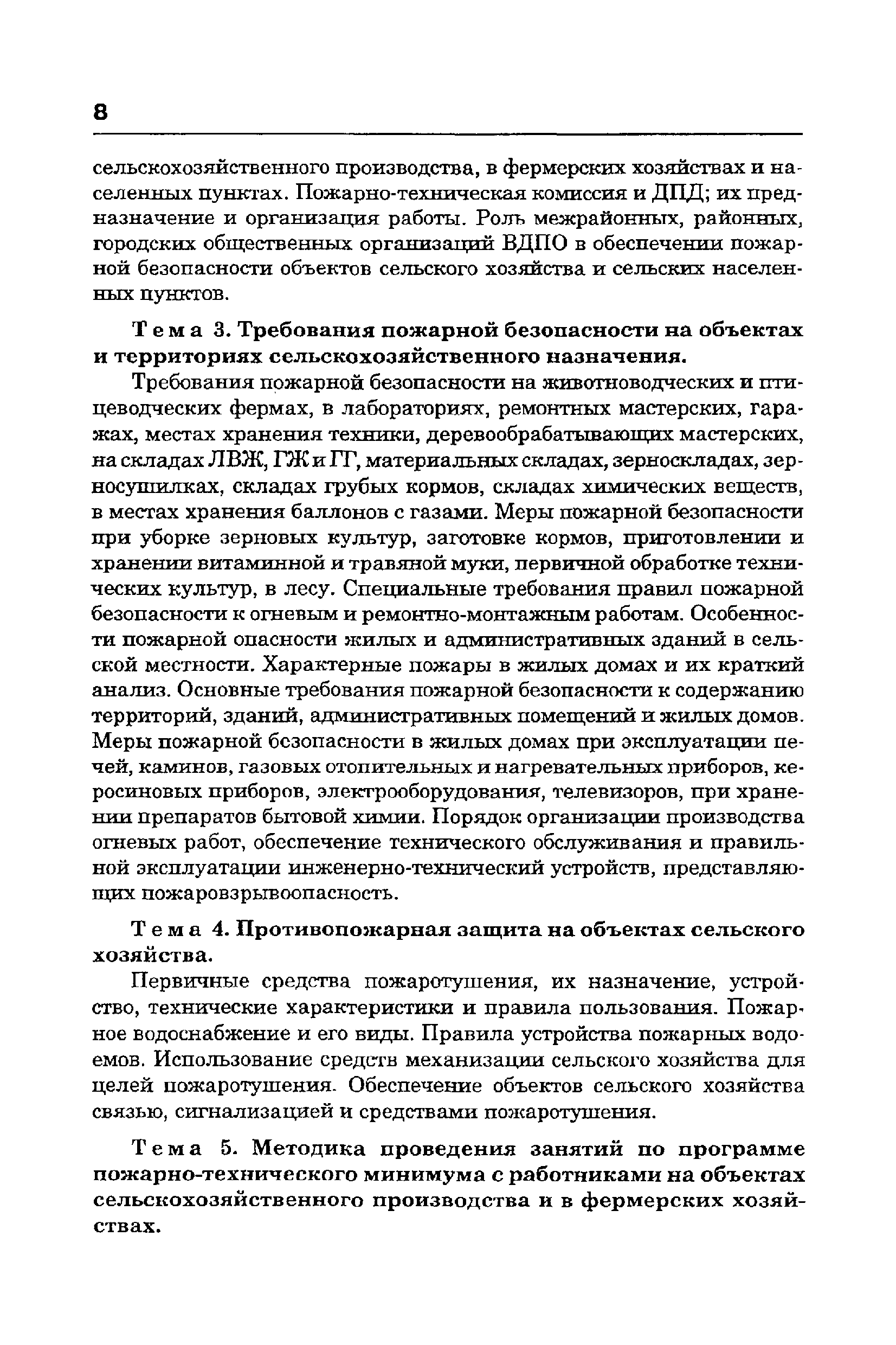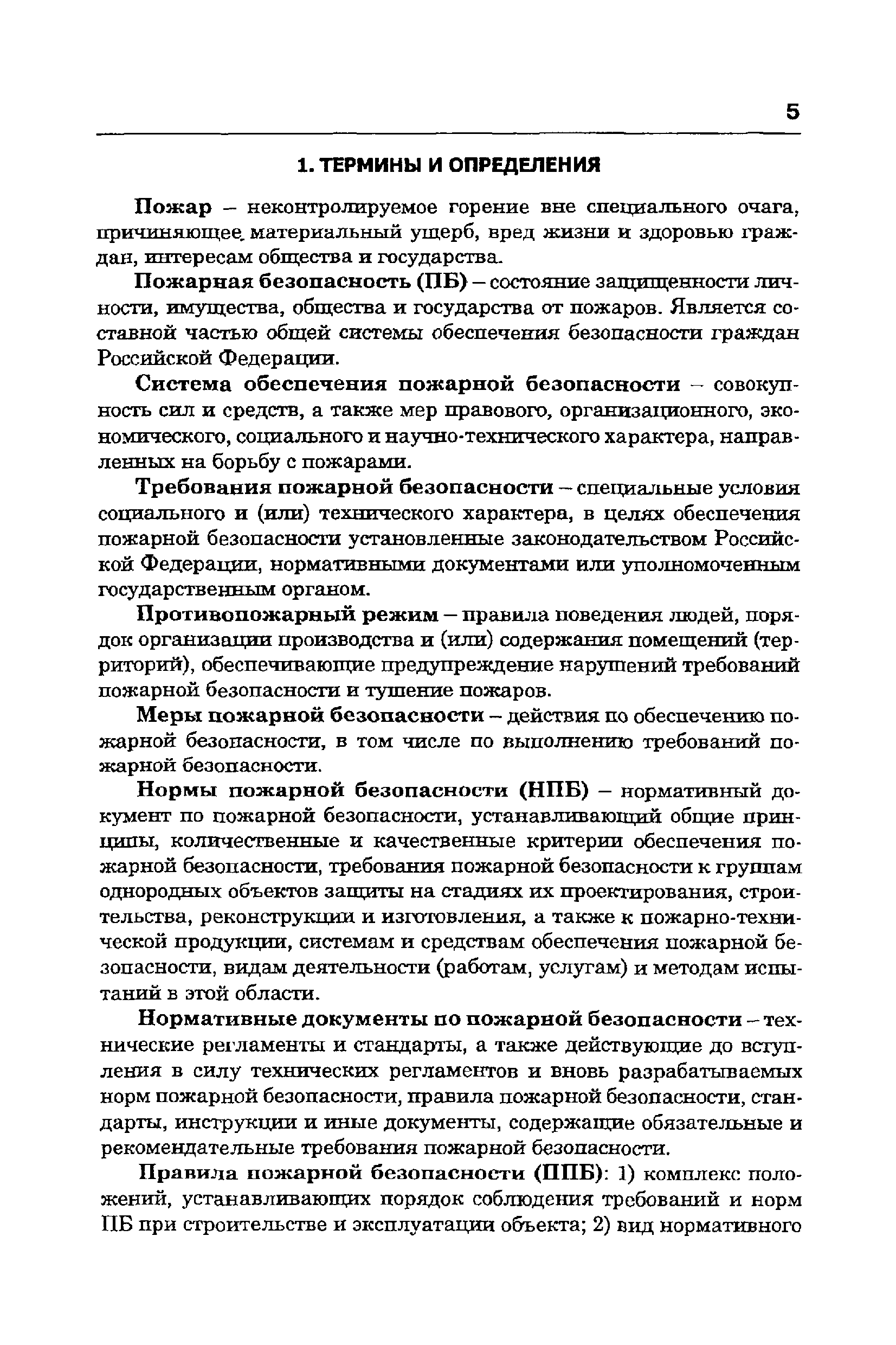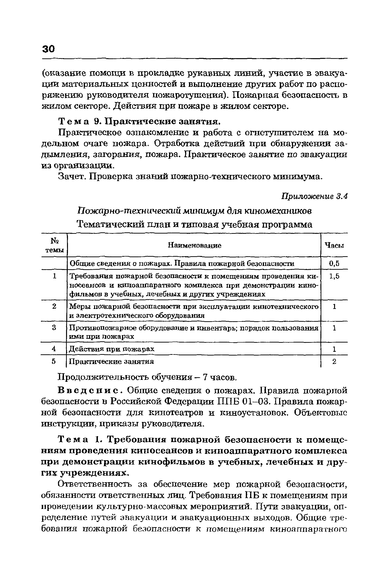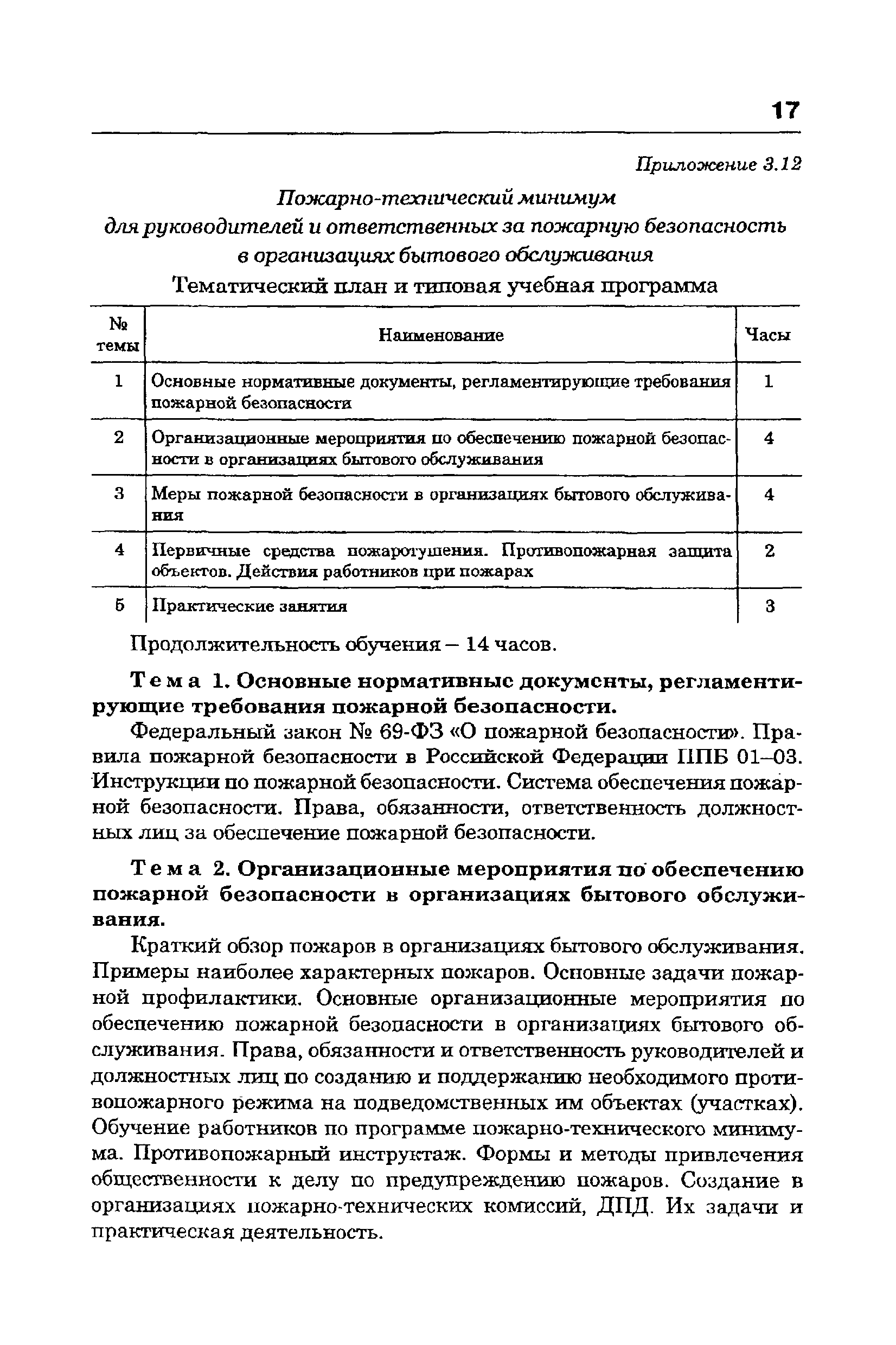 | Оглавление: | Введение 1 Термины и определения. Условные сокращения 2 Цели и задачи обучения руководителей и работников организаций в области пожарной безопасности 3 Виды обучения 3.1. Противопожарный инструктаж 3.2. Пожарно-технический минимум 4 Учебные (специальные) программы обучения в области пожарной безопасности 5 Правила изложения учебных программ и нормативно-техническая литература 6 Методические указания по организации деятельности государственного пожарного надзора в области организации обучения населения мерам пожарной безопасности и противопожарной пропаганды Приложение 1. Журнал учета проведения инструктажей по пожарной безопасности Приложение 2. Примерная программа противопожарного инструктажа Приложение 3. Пожарно-технический минимум |