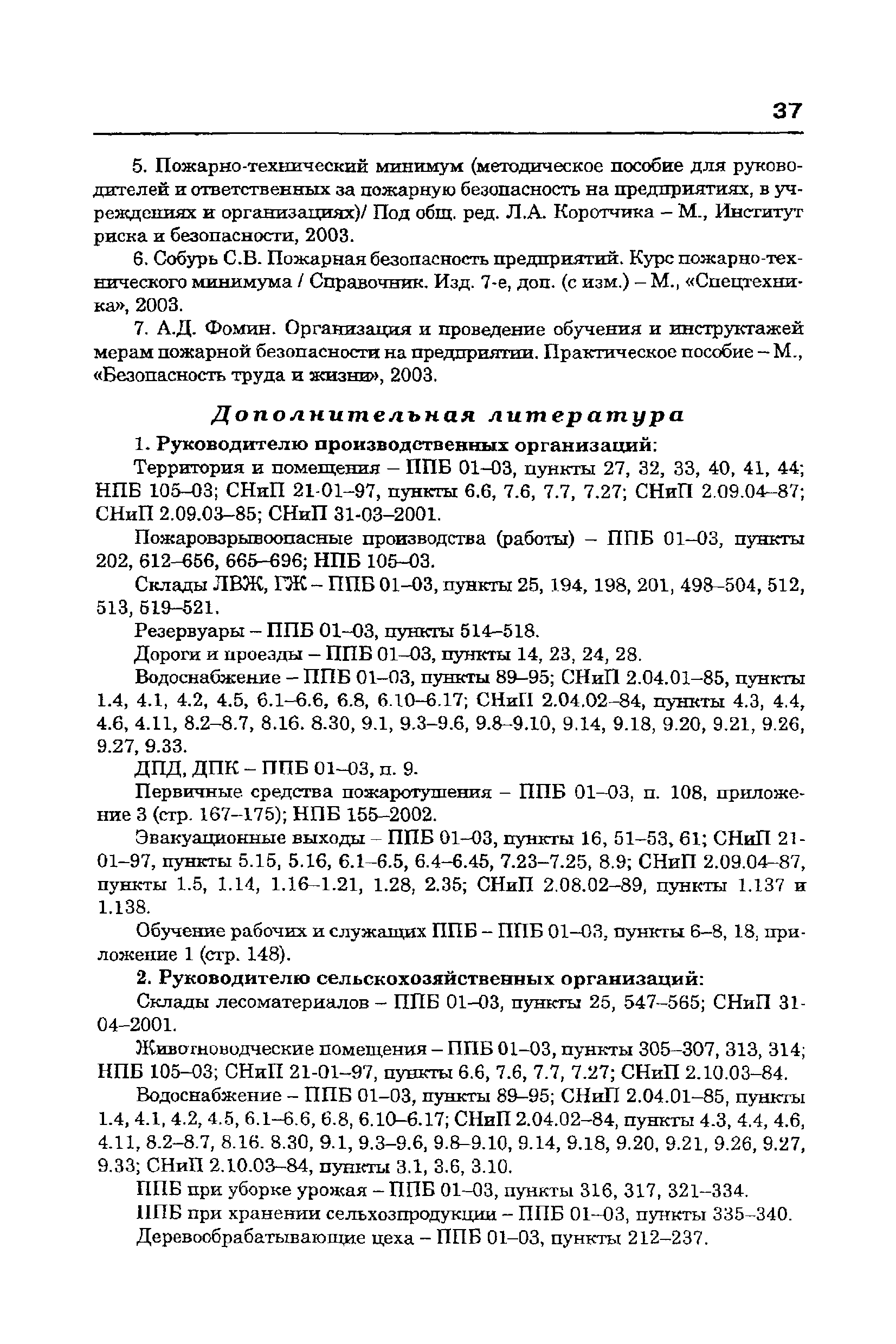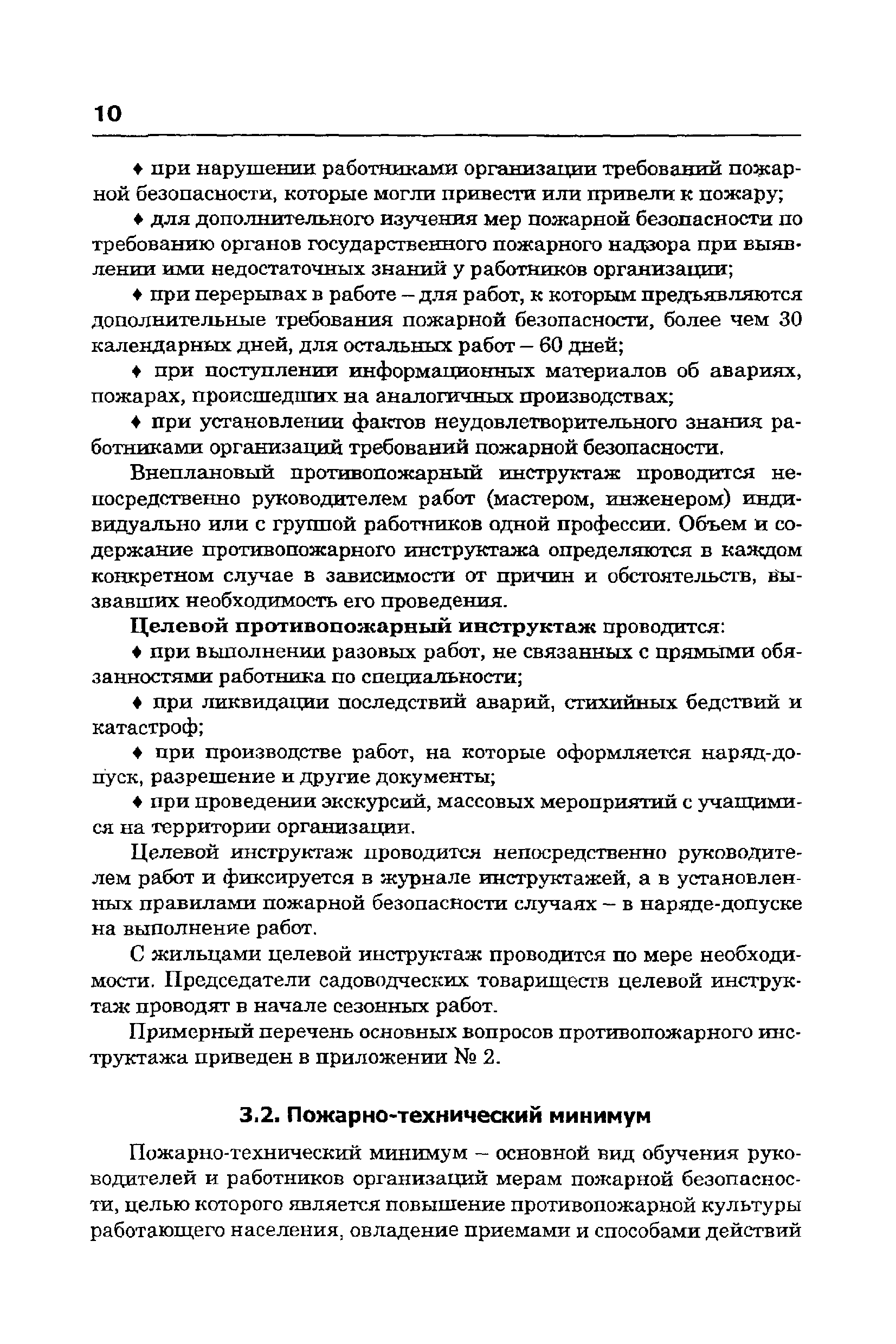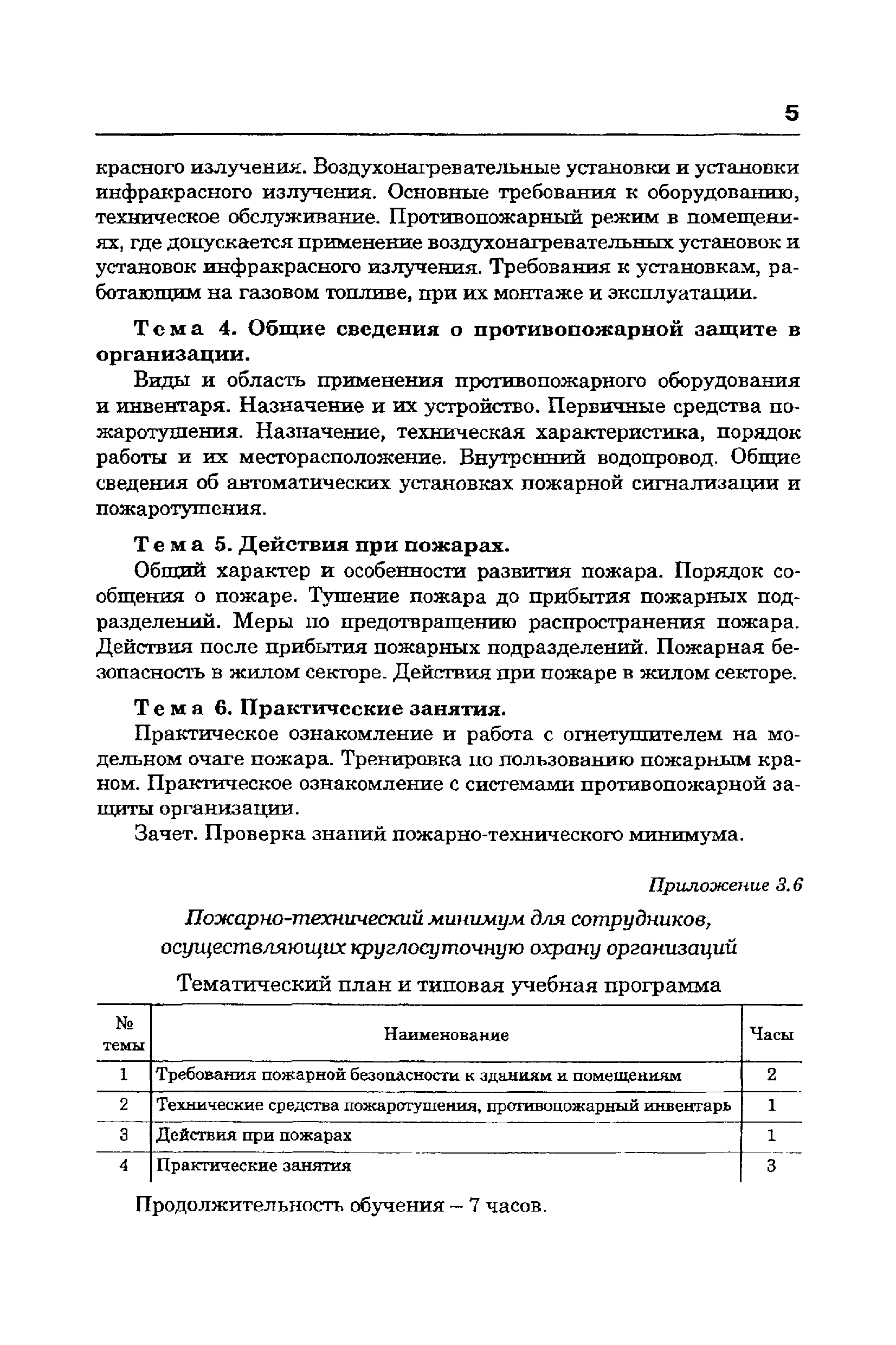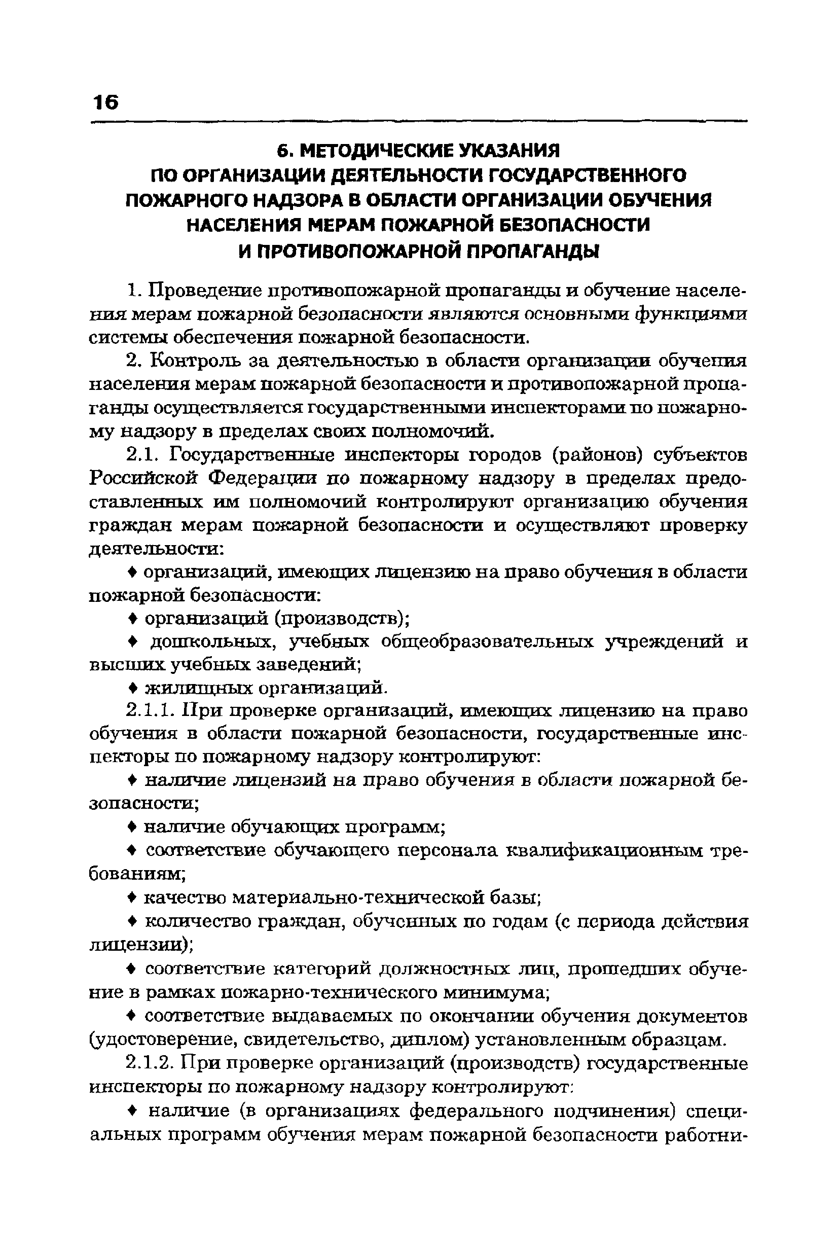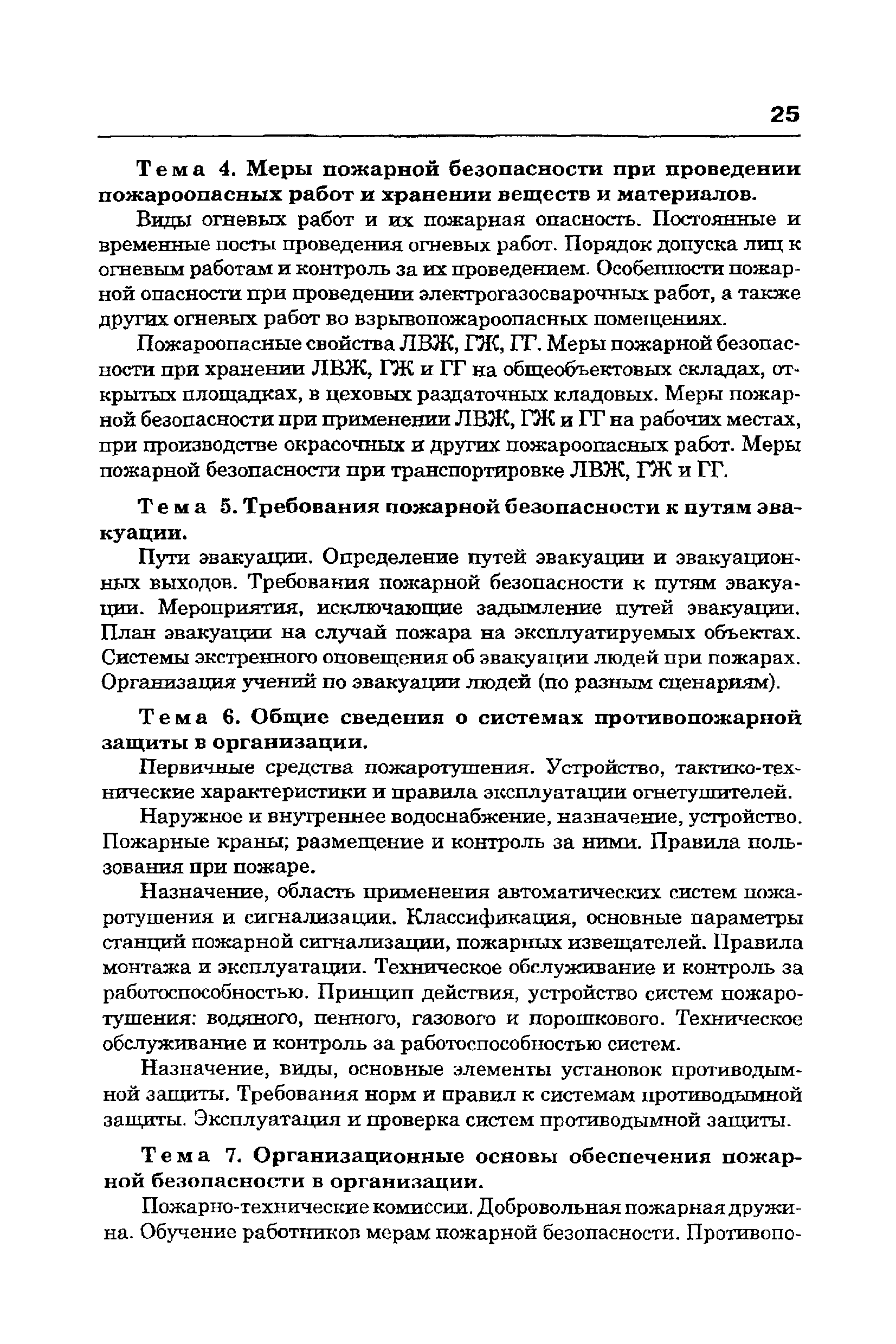 | Оглавление: | Введение 1 Термины и определения. Условные сокращения 2 Цели и задачи обучения руководителей и работников организаций в области пожарной безопасности 3 Виды обучения 3.1. Противопожарный инструктаж 3.2. Пожарно-технический минимум 4 Учебные (специальные) программы обучения в области пожарной безопасности 5 Правила изложения учебных программ и нормативно-техническая литература 6 Методические указания по организации деятельности государственного пожарного надзора в области организации обучения населения мерам пожарной безопасности и противопожарной пропаганды Приложение 1. Журнал учета проведения инструктажей по пожарной безопасности Приложение 2. Примерная программа противопожарного инструктажа Приложение 3. Пожарно-технический минимум |