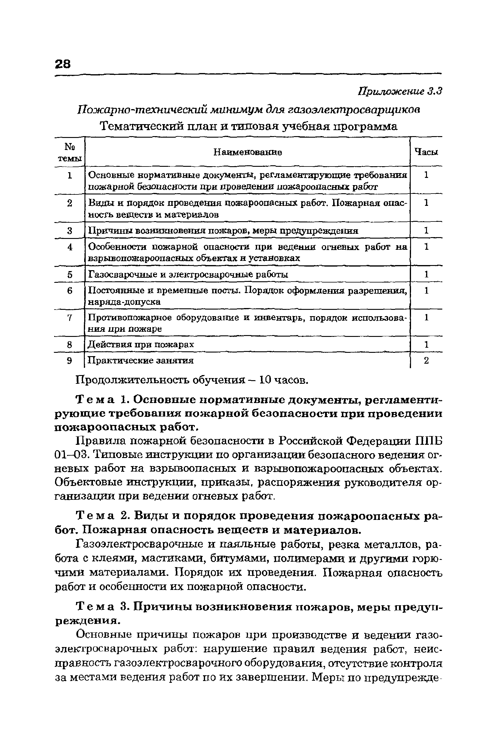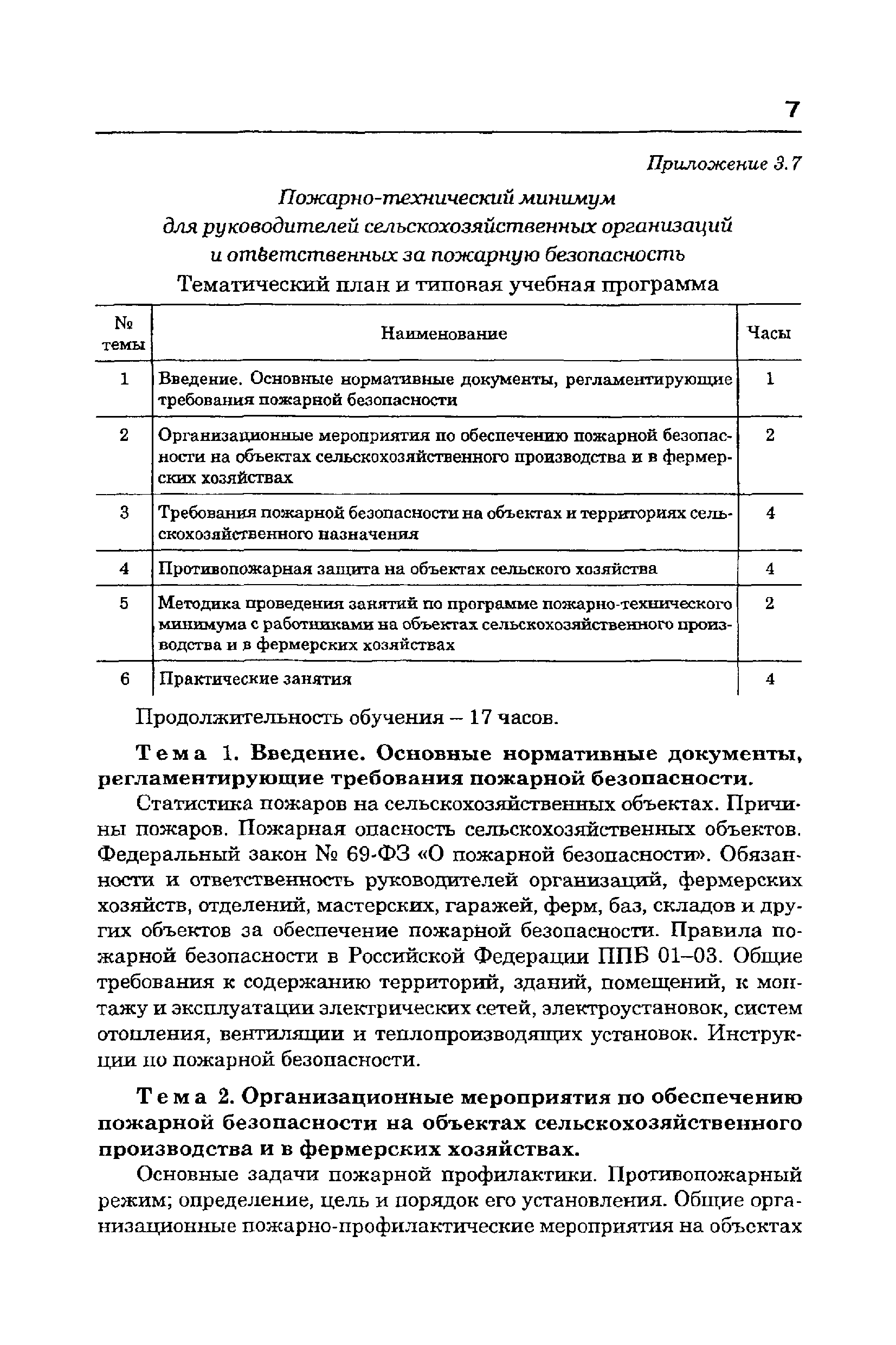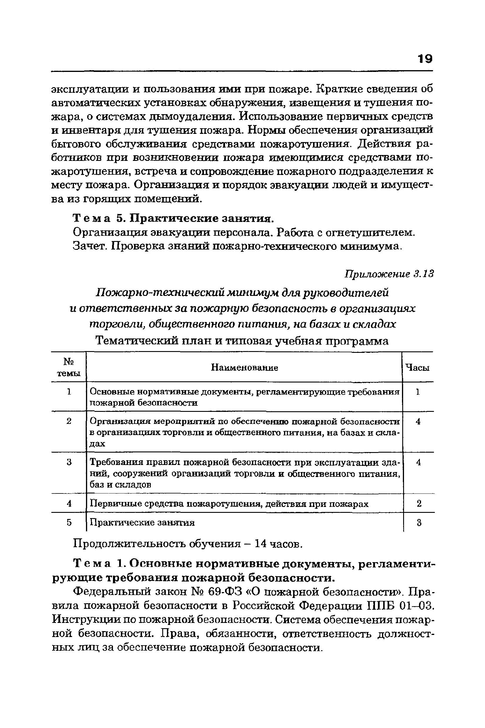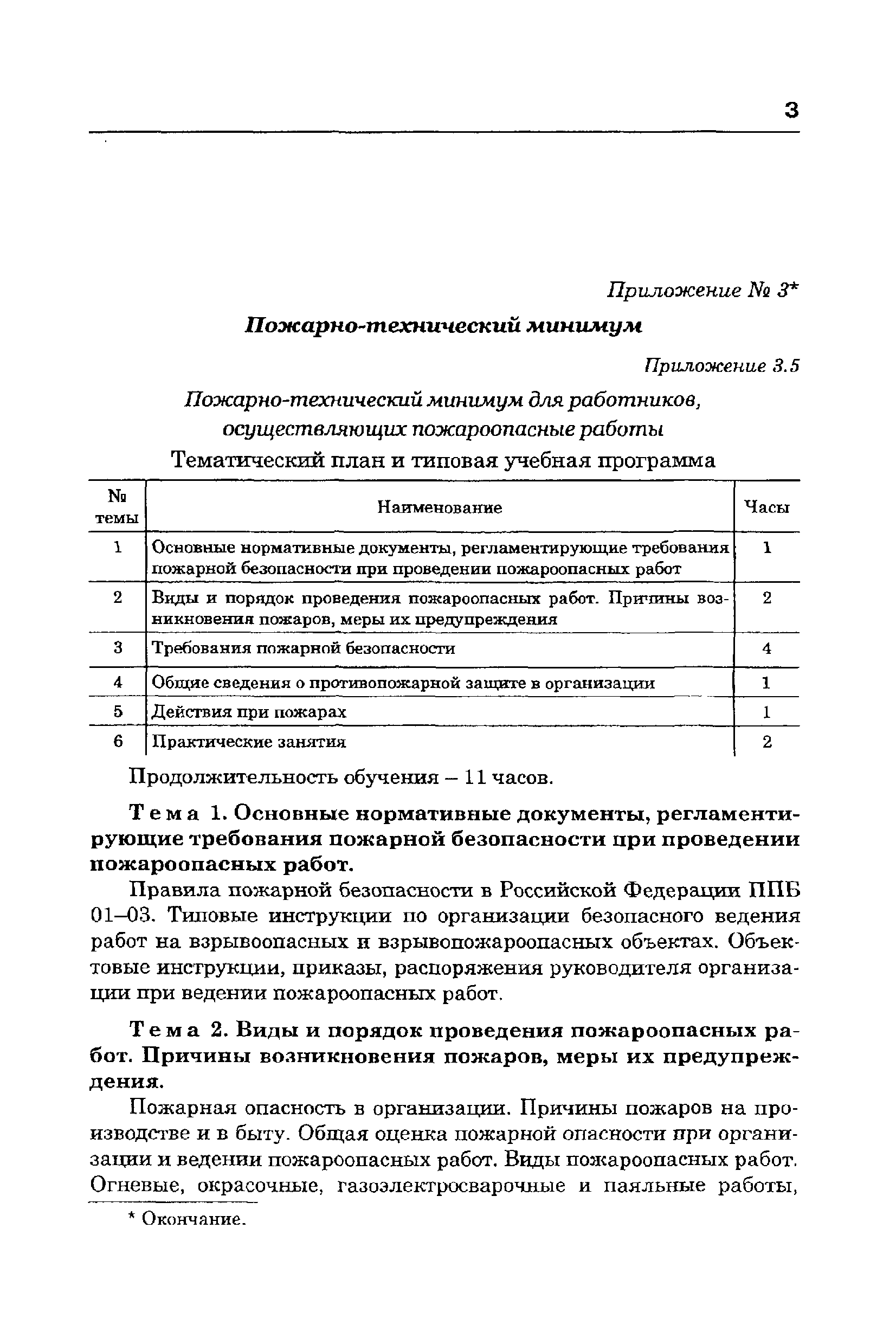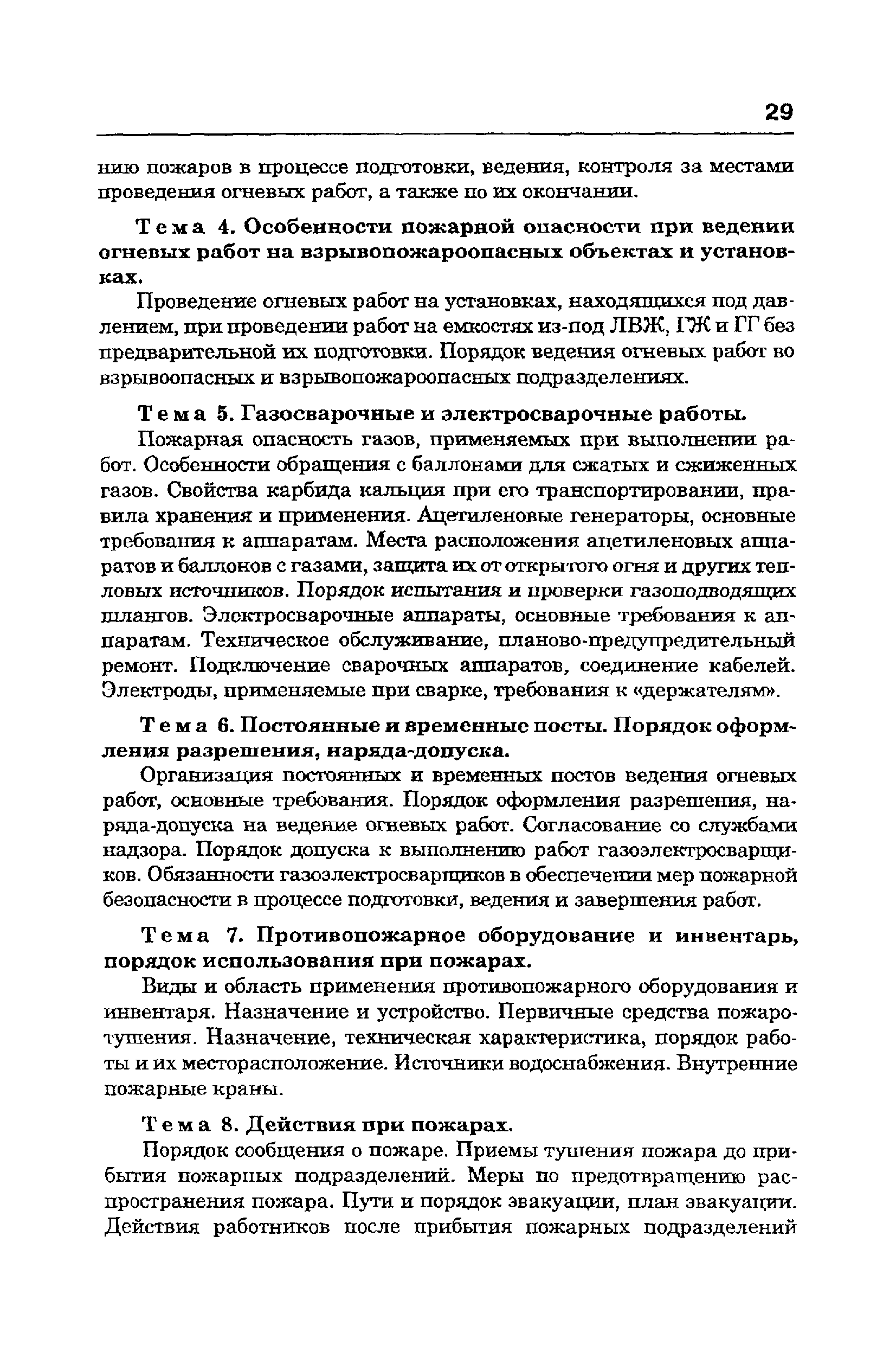 | Оглавление: | Введение 1 Термины и определения. Условные сокращения 2 Цели и задачи обучения руководителей и работников организаций в области пожарной безопасности 3 Виды обучения 3.1. Противопожарный инструктаж 3.2. Пожарно-технический минимум 4 Учебные (специальные) программы обучения в области пожарной безопасности 5 Правила изложения учебных программ и нормативно-техническая литература 6 Методические указания по организации деятельности государственного пожарного надзора в области организации обучения населения мерам пожарной безопасности и противопожарной пропаганды Приложение 1. Журнал учета проведения инструктажей по пожарной безопасности Приложение 2. Примерная программа противопожарного инструктажа Приложение 3. Пожарно-технический минимум |