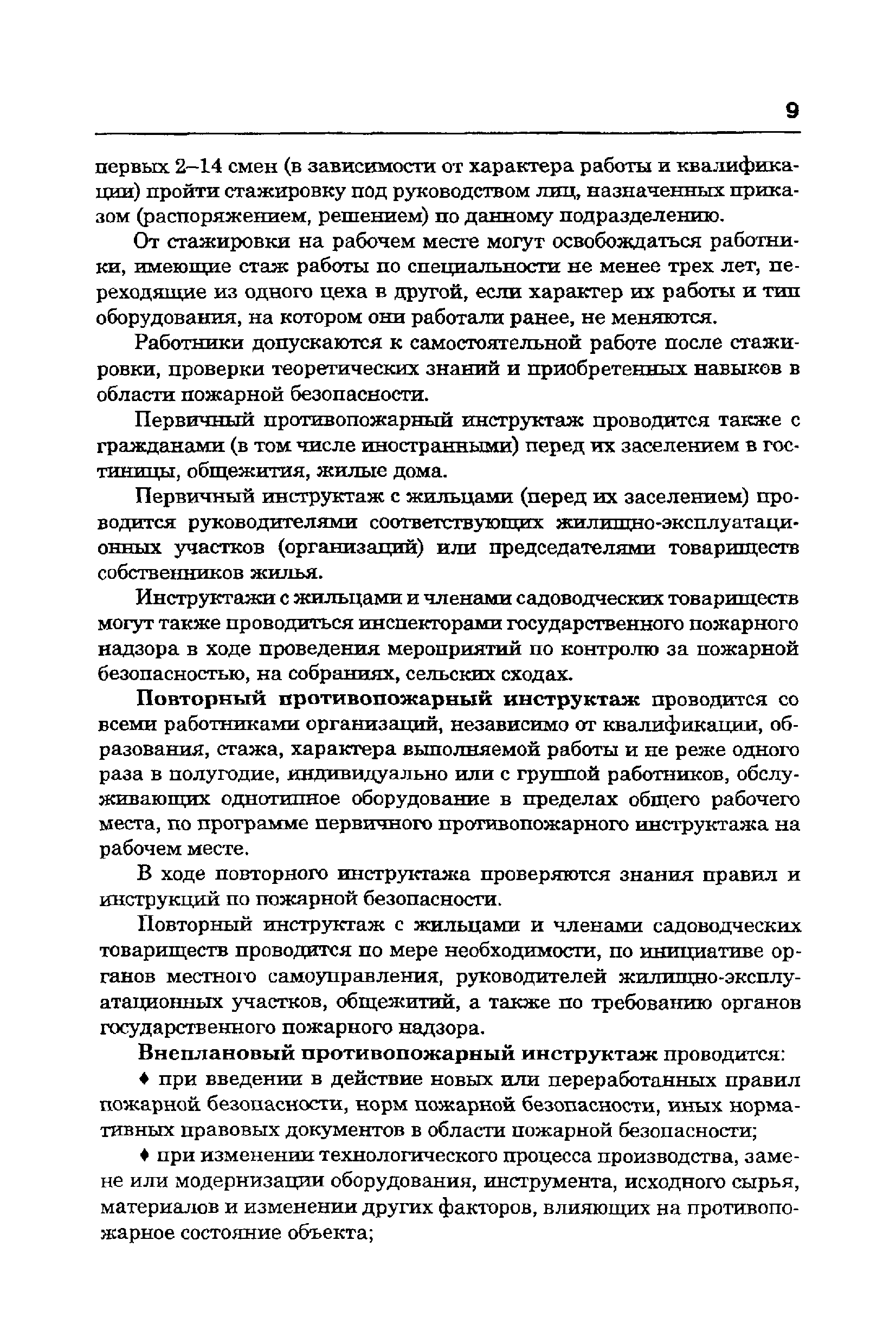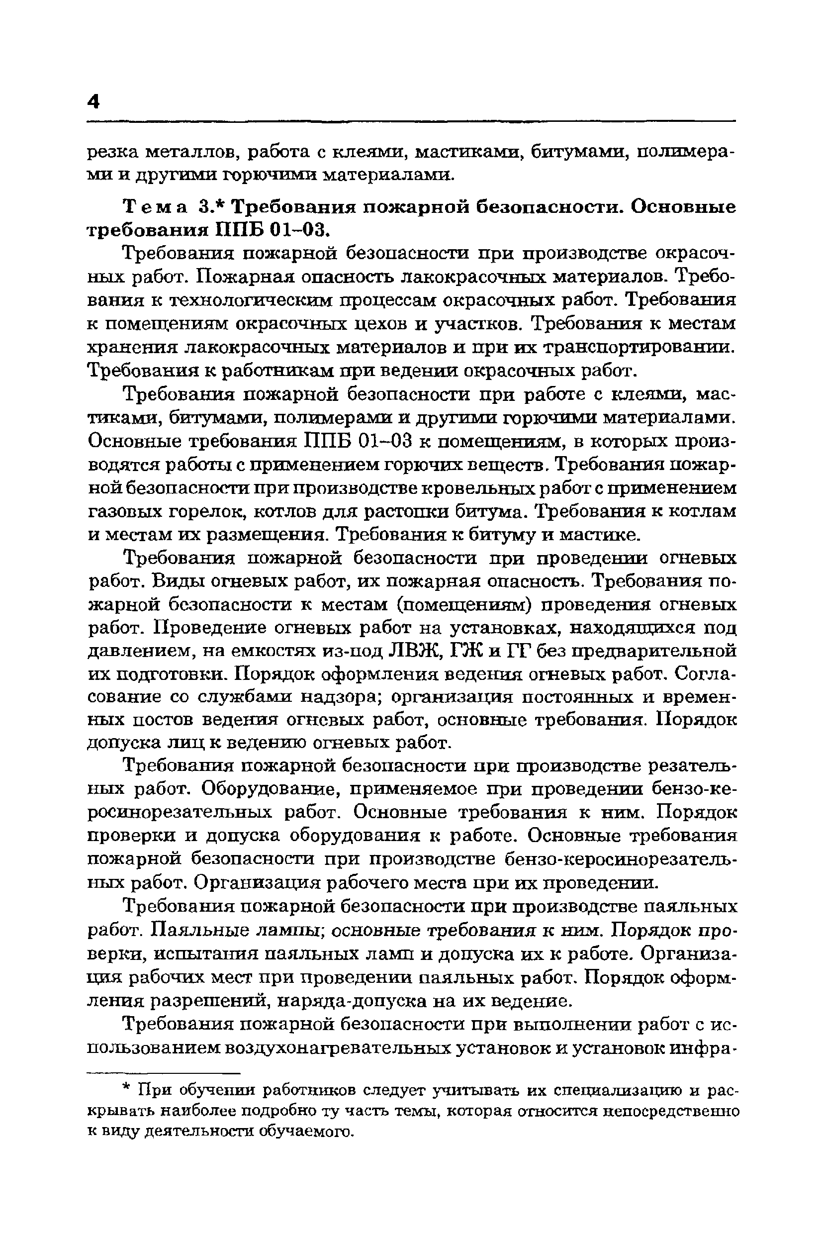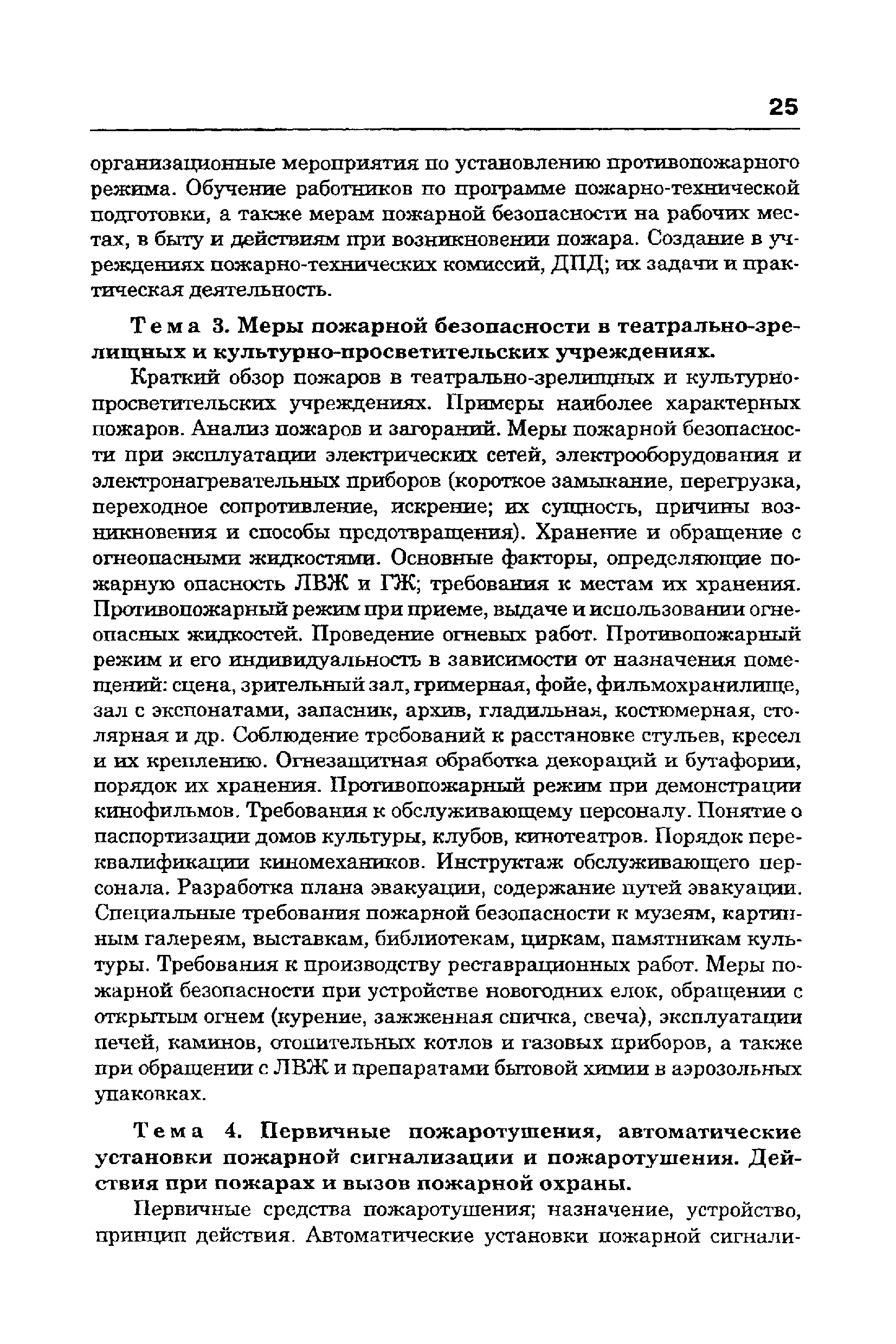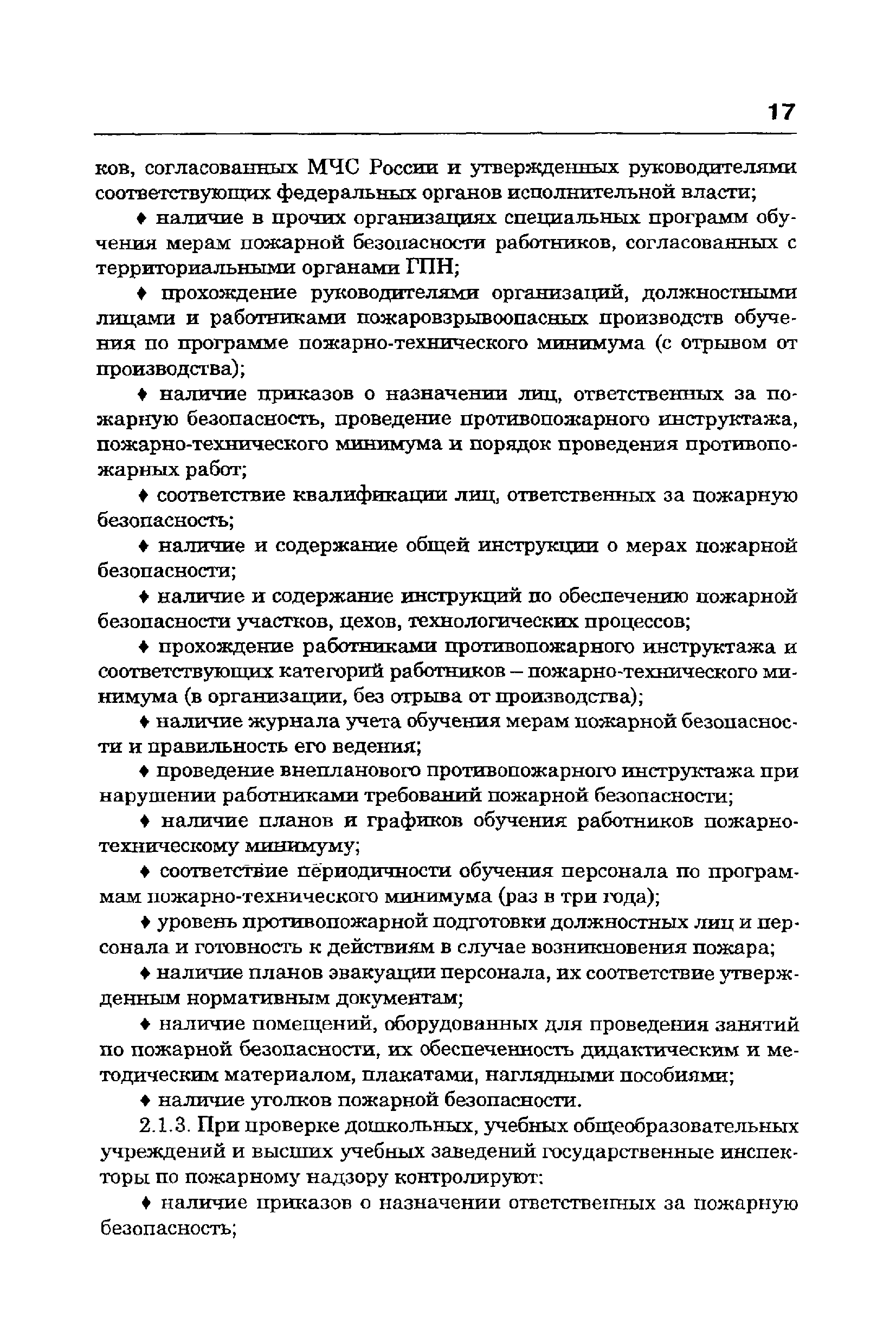 | Оглавление: | Введение 1 Термины и определения. Условные сокращения 2 Цели и задачи обучения руководителей и работников организаций в области пожарной безопасности 3 Виды обучения 3.1. Противопожарный инструктаж 3.2. Пожарно-технический минимум 4 Учебные (специальные) программы обучения в области пожарной безопасности 5 Правила изложения учебных программ и нормативно-техническая литература 6 Методические указания по организации деятельности государственного пожарного надзора в области организации обучения населения мерам пожарной безопасности и противопожарной пропаганды Приложение 1. Журнал учета проведения инструктажей по пожарной безопасности Приложение 2. Примерная программа противопожарного инструктажа Приложение 3. Пожарно-технический минимум |