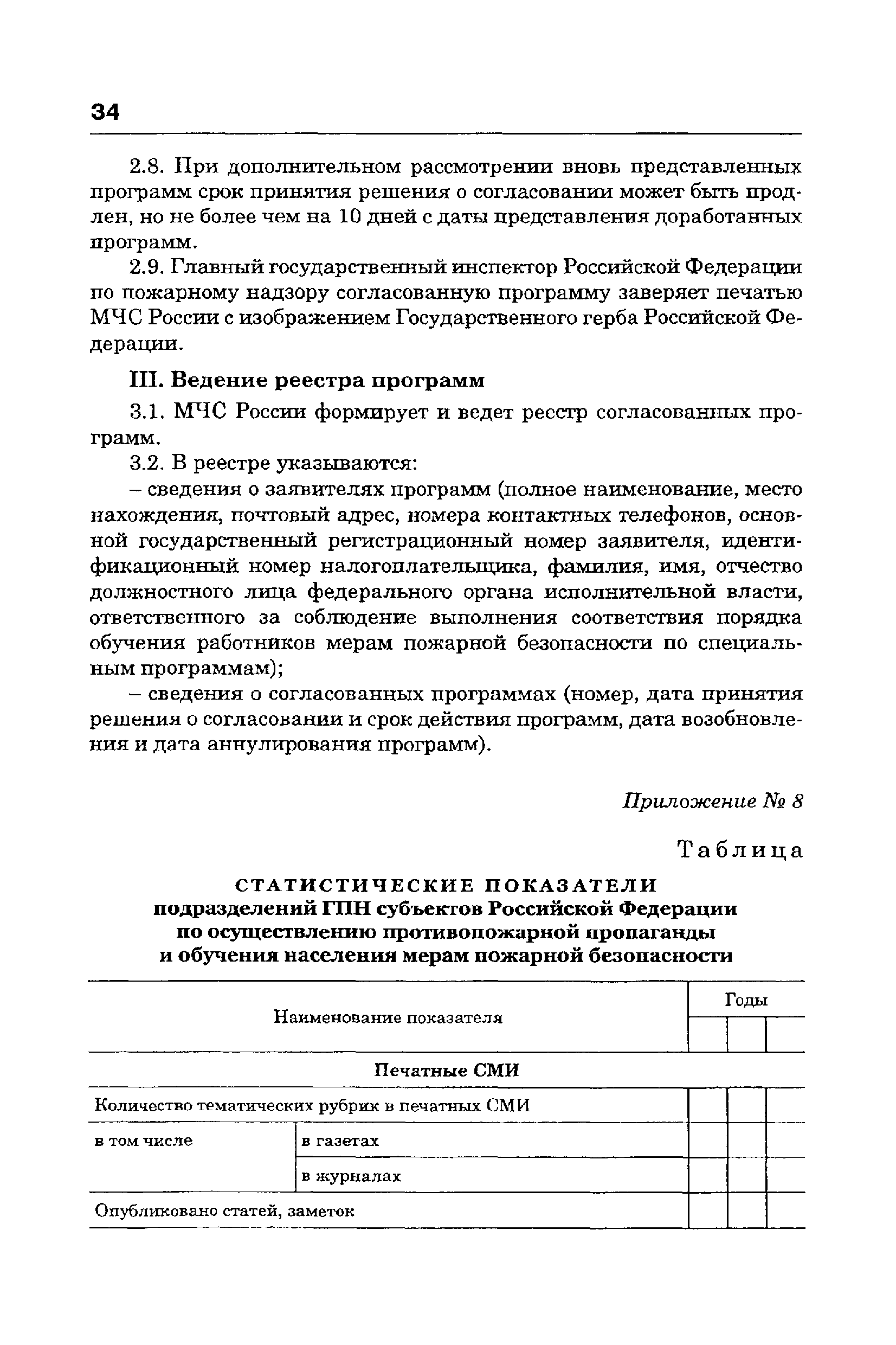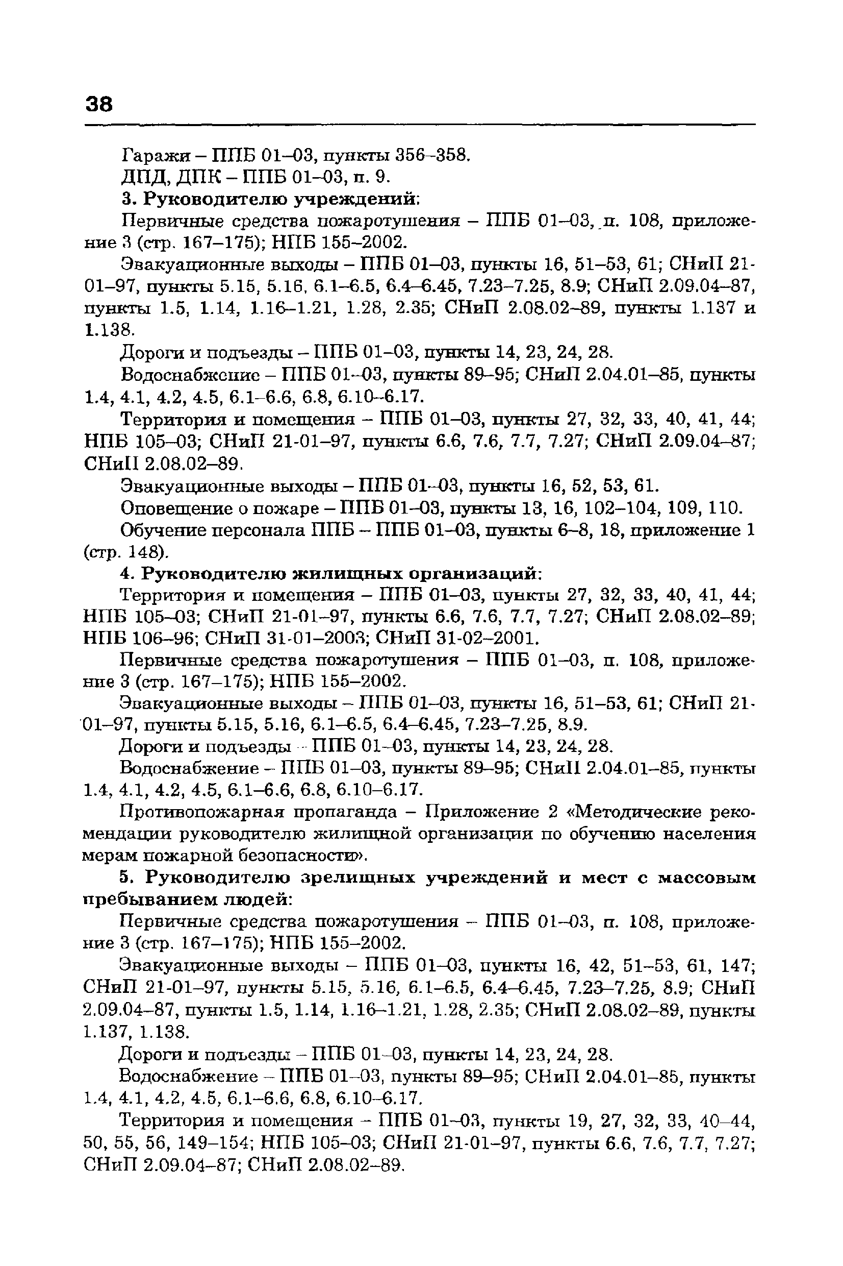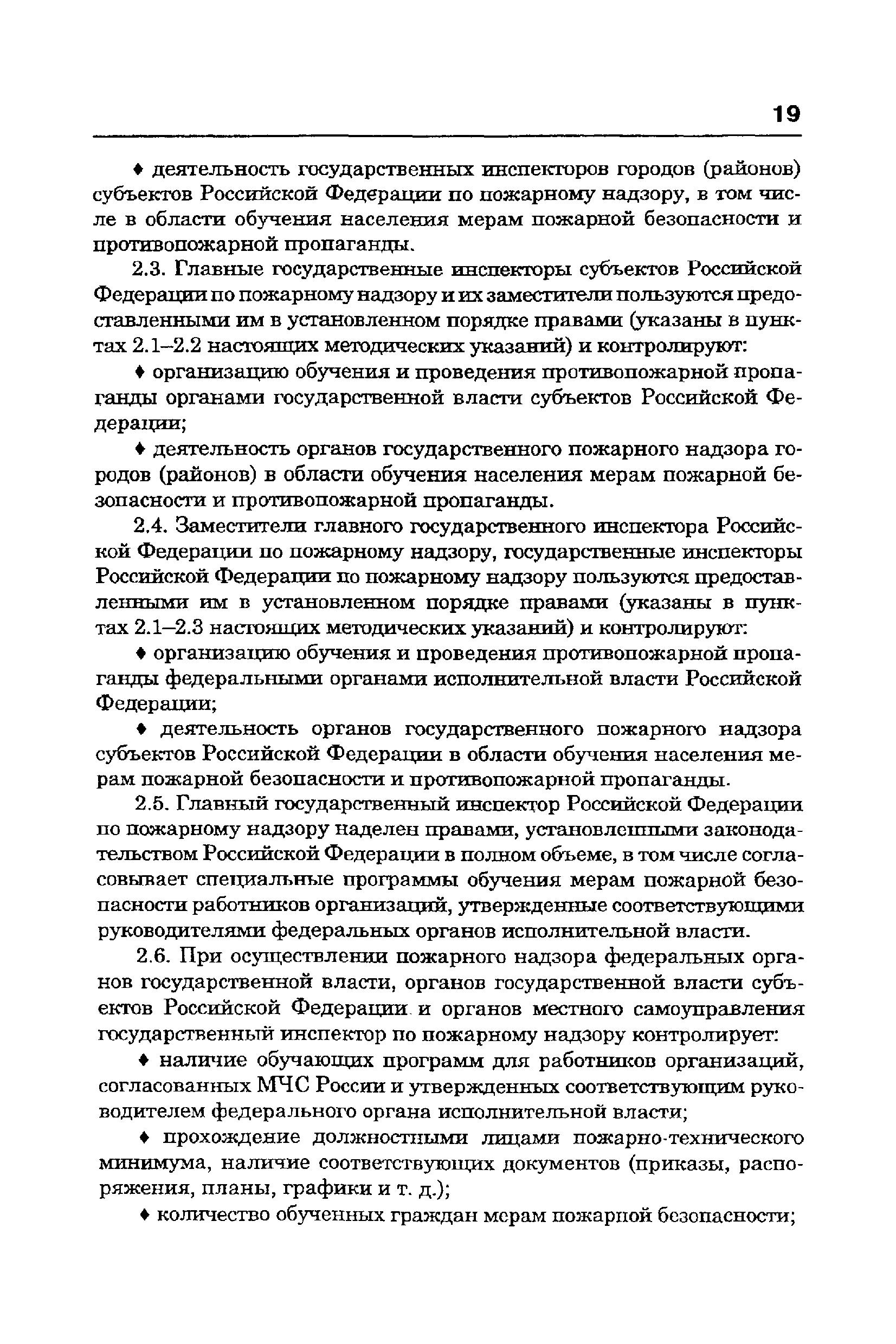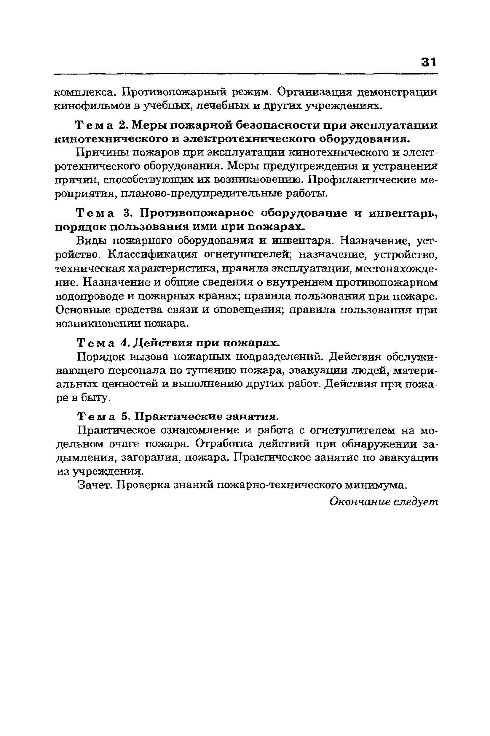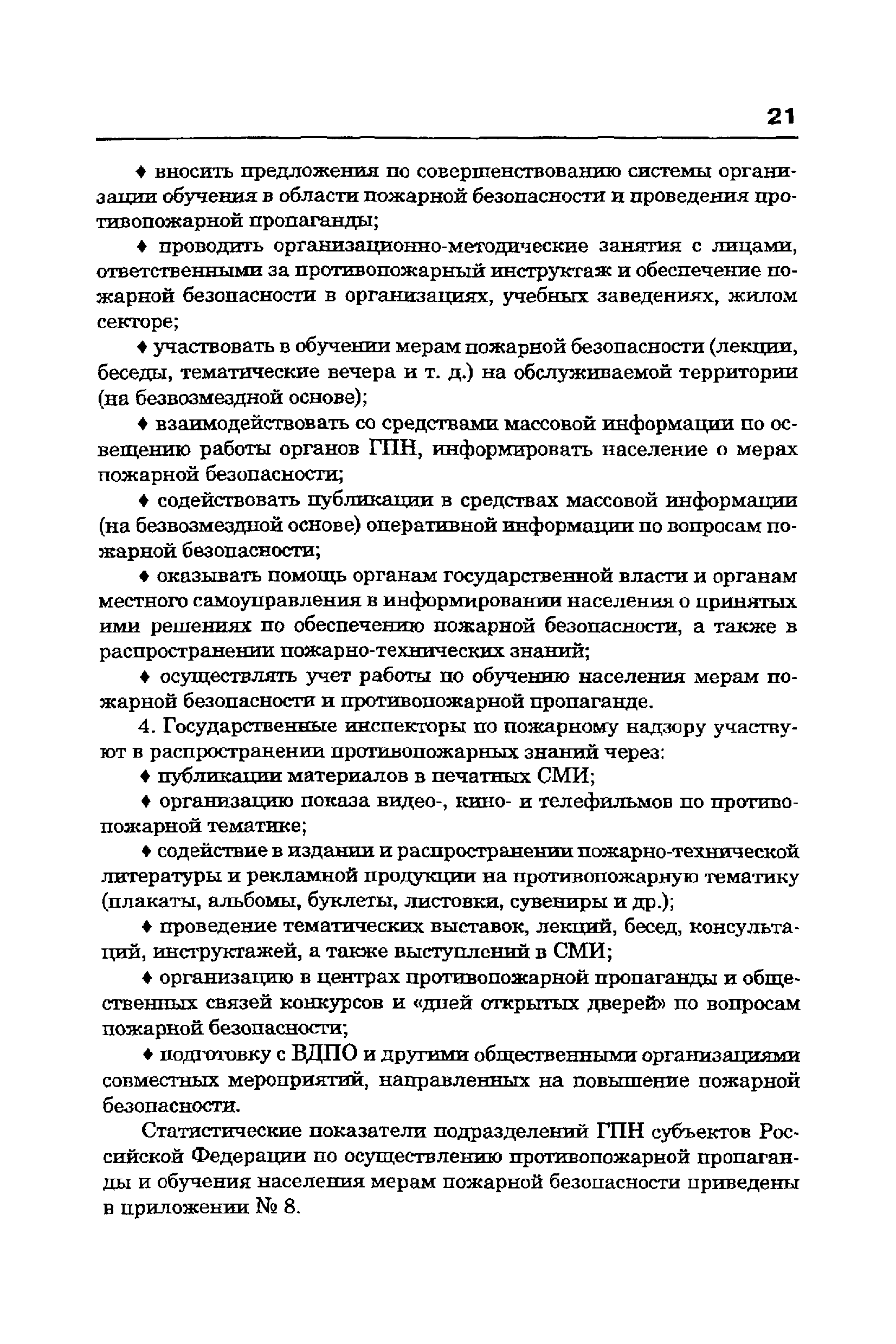 | Оглавление: | Введение 1 Термины и определения. Условные сокращения 2 Цели и задачи обучения руководителей и работников организаций в области пожарной безопасности 3 Виды обучения 3.1. Противопожарный инструктаж 3.2. Пожарно-технический минимум 4 Учебные (специальные) программы обучения в области пожарной безопасности 5 Правила изложения учебных программ и нормативно-техническая литература 6 Методические указания по организации деятельности государственного пожарного надзора в области организации обучения населения мерам пожарной безопасности и противопожарной пропаганды Приложение 1. Журнал учета проведения инструктажей по пожарной безопасности Приложение 2. Примерная программа противопожарного инструктажа Приложение 3. Пожарно-технический минимум |