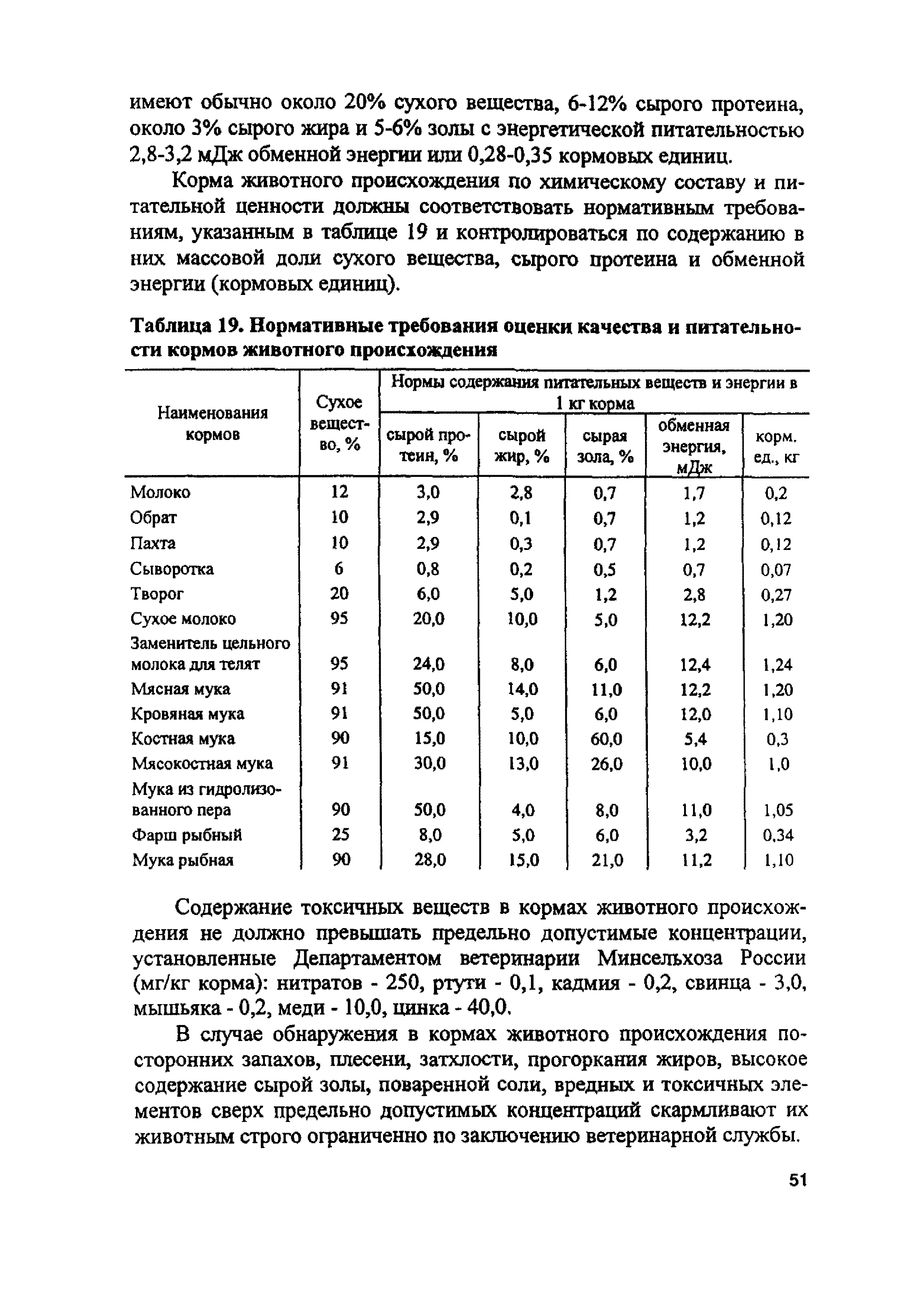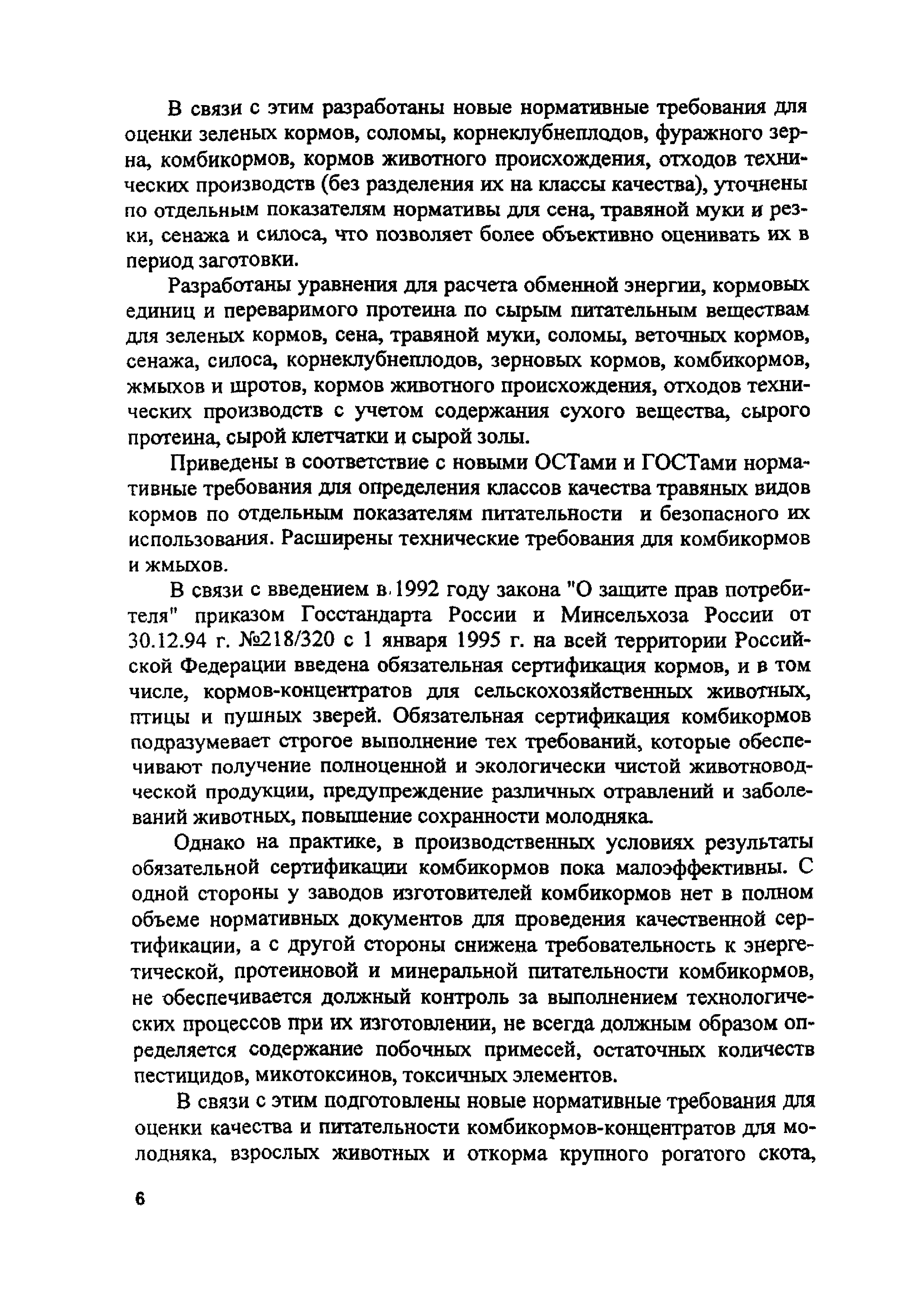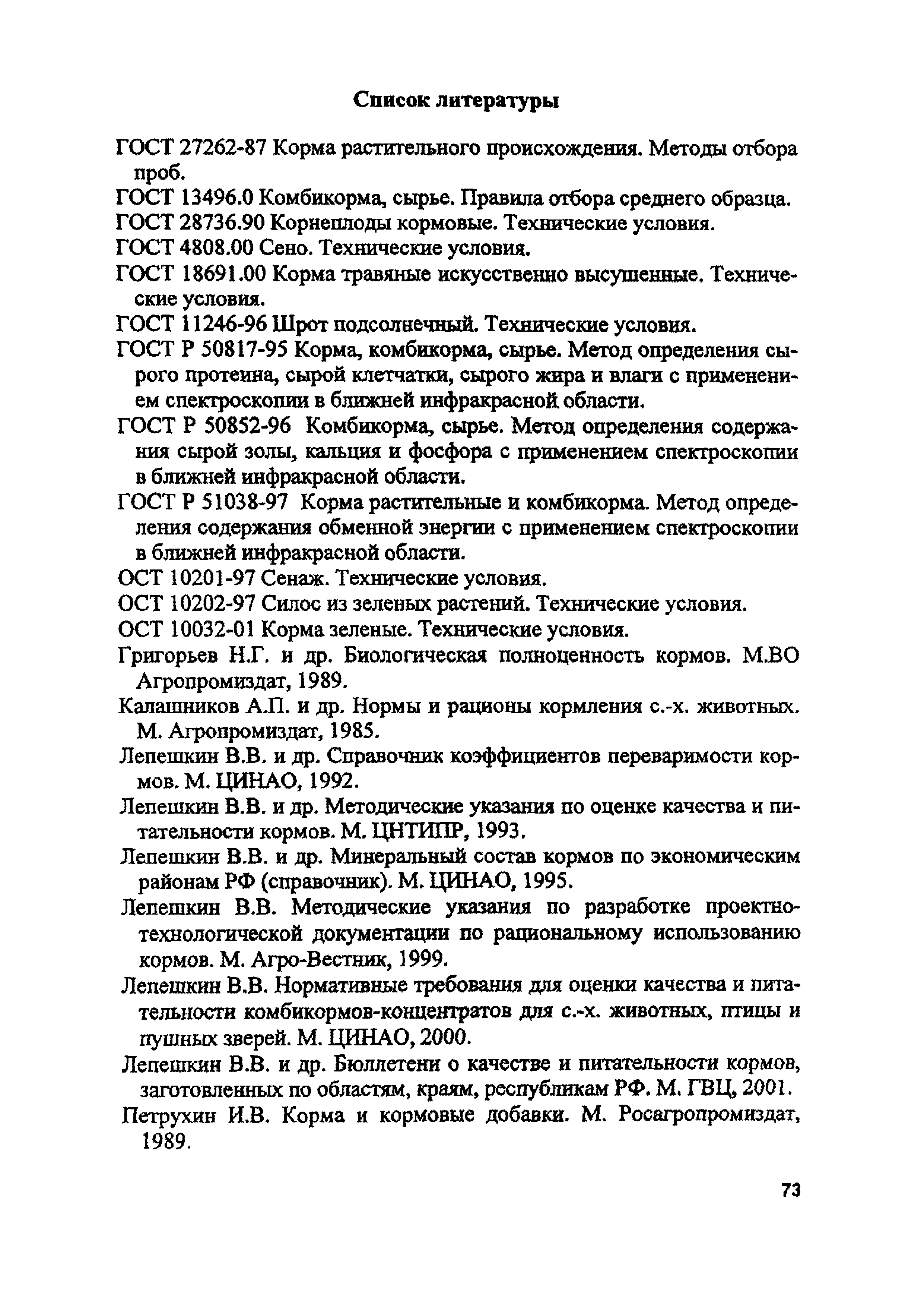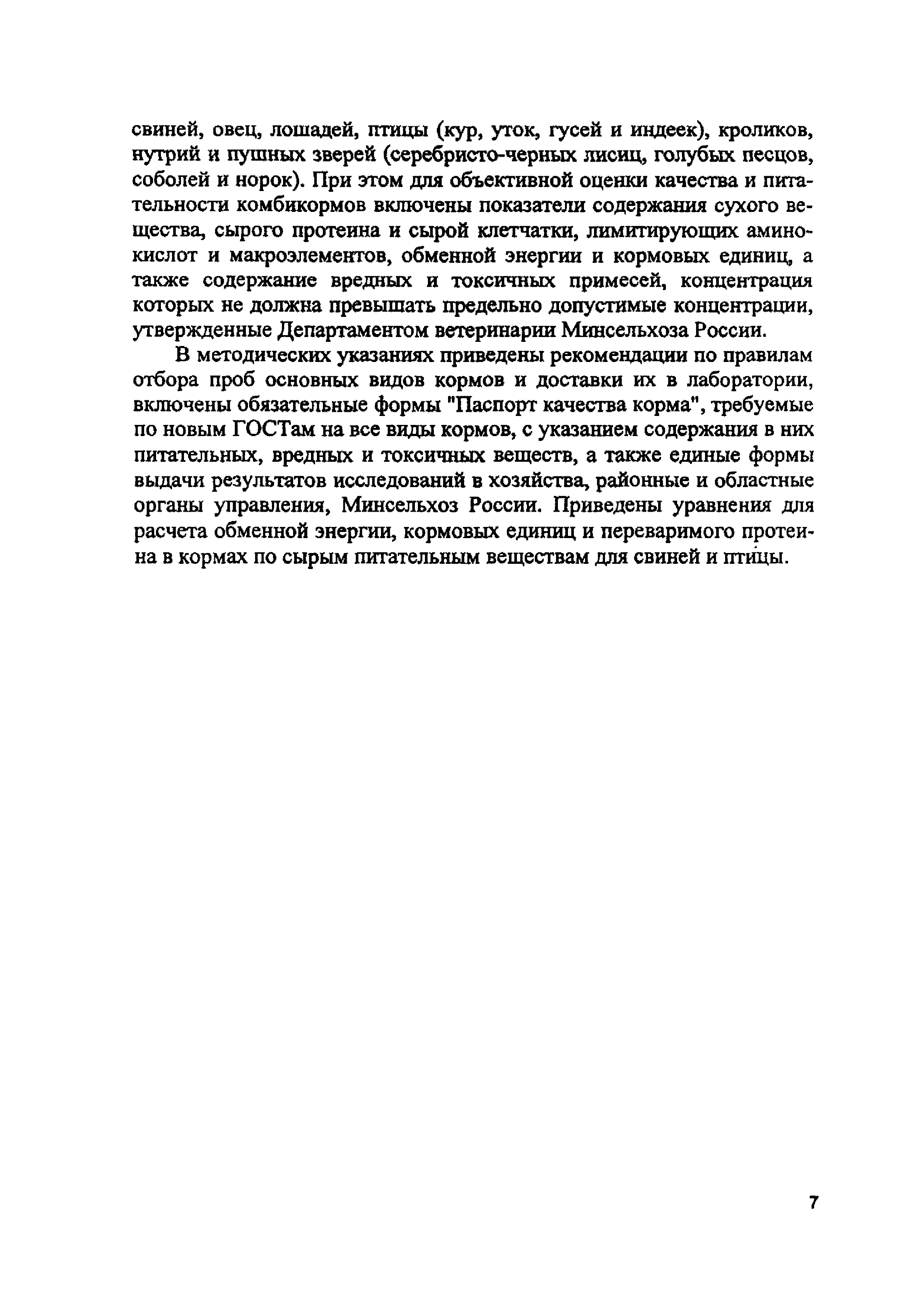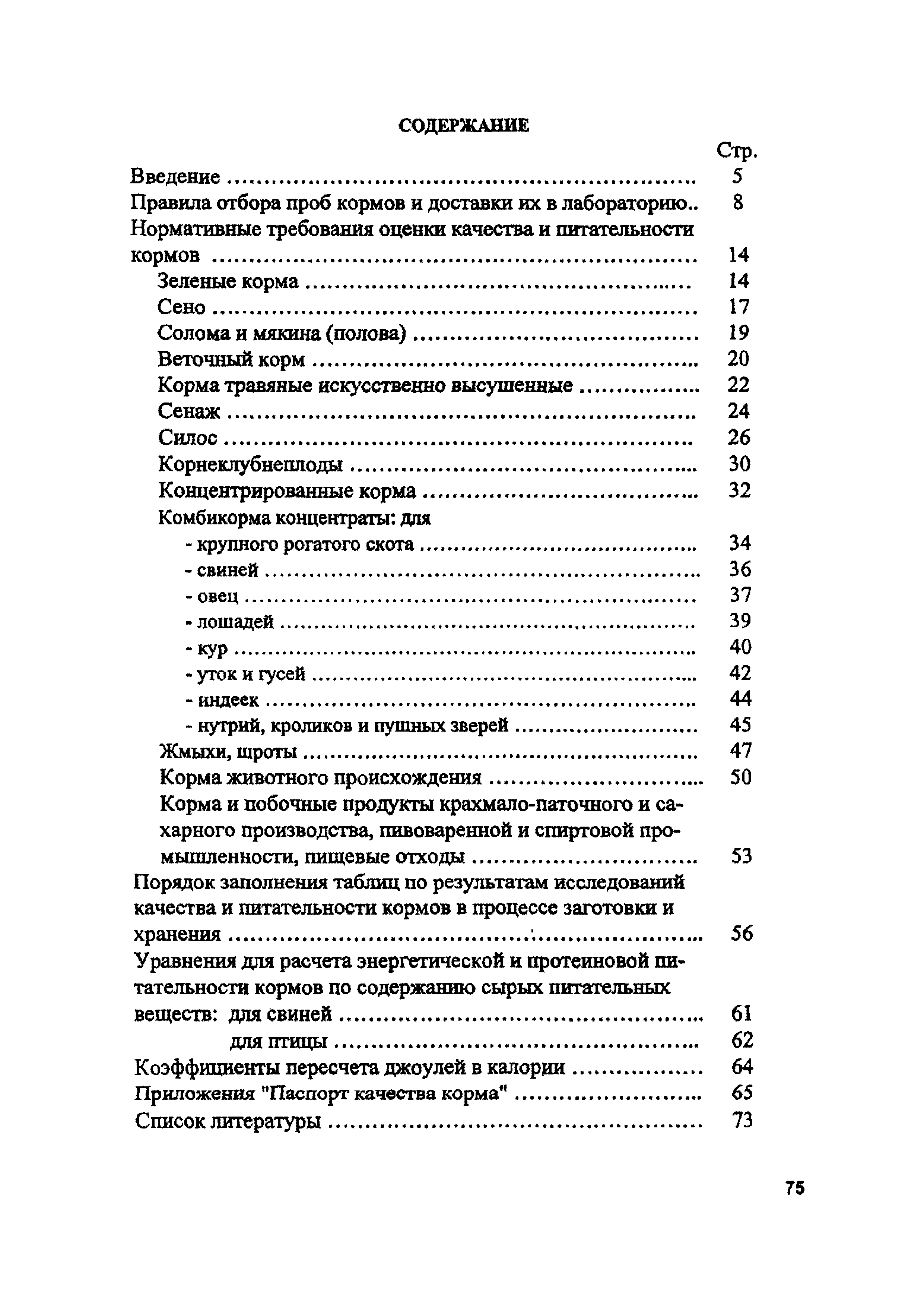 | Оглавление: | Введение Правила отбора проб кормов и доставки их в лабораторию Нормативные требования оценки качества и питательности кормов Зеленые корма Сено Солома и мякина (полова) Веточный корм Корма травяные искусственно высушенные Сенаж Силос Корнеклубнеплоды Концентрированные корма Комбикорма концентраты: для - крупного рогатого скота - свиней - овец - лошадей - кур - уток и гусей - индеек - нутрий, кроликов и пушных зверей Жмыхи, шроты Корма животного происхождения Корма и побочные продукты крахмало-паточного и сахарного производства, пивоваренной и спиртовой промышленности, пищевые отходы Порядок заполнения таблиц по результатам исследований качества и питательности кормов в процессе заготовки и хранения Уравнения для расчета энергетической и протеиновой питательности кормов по содержанию сырых питательных веществ: для свиней для птицы Коэффициенты пересчета джоулей в калории Приложения "Паспорт качества корма" Список литературы |