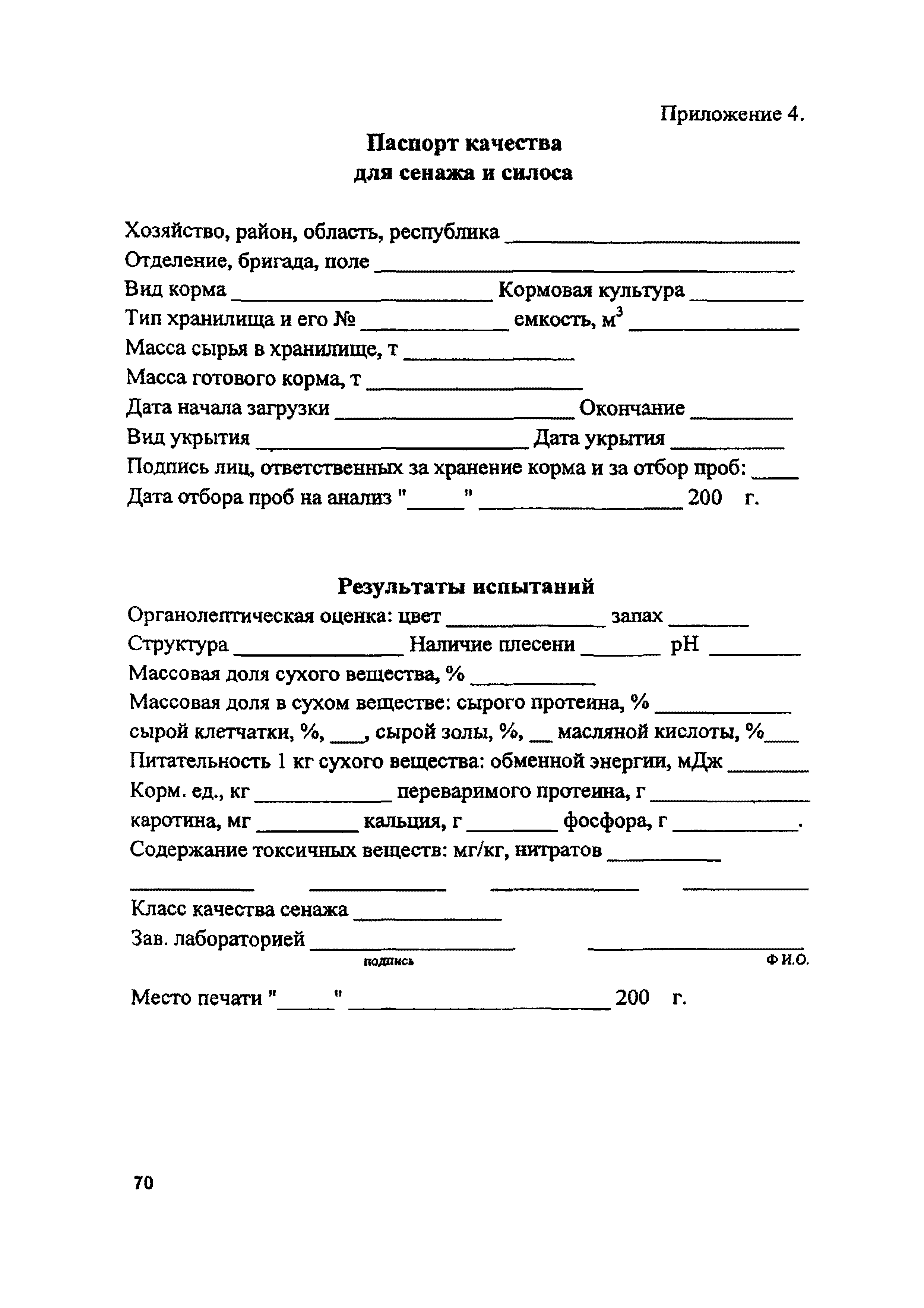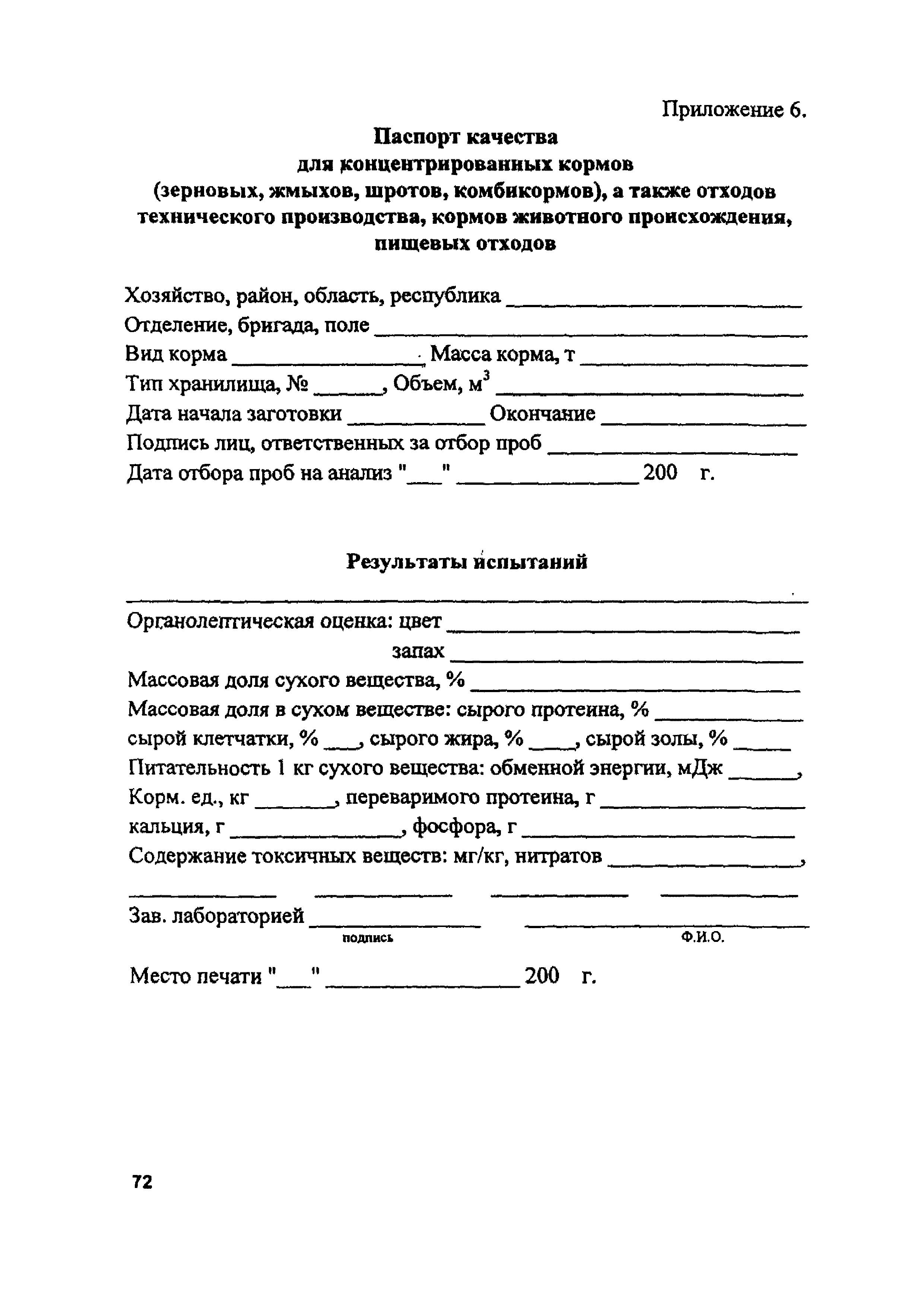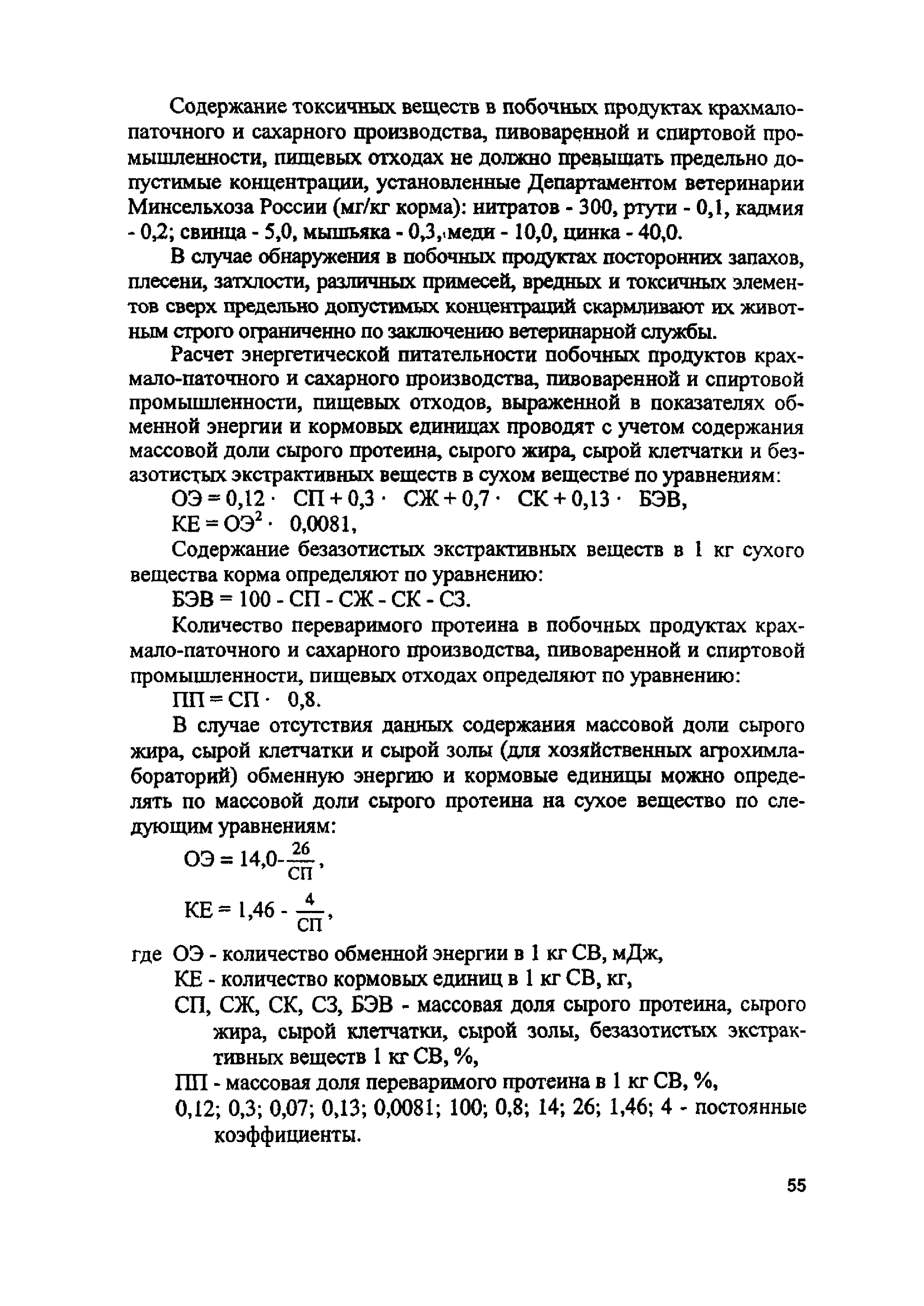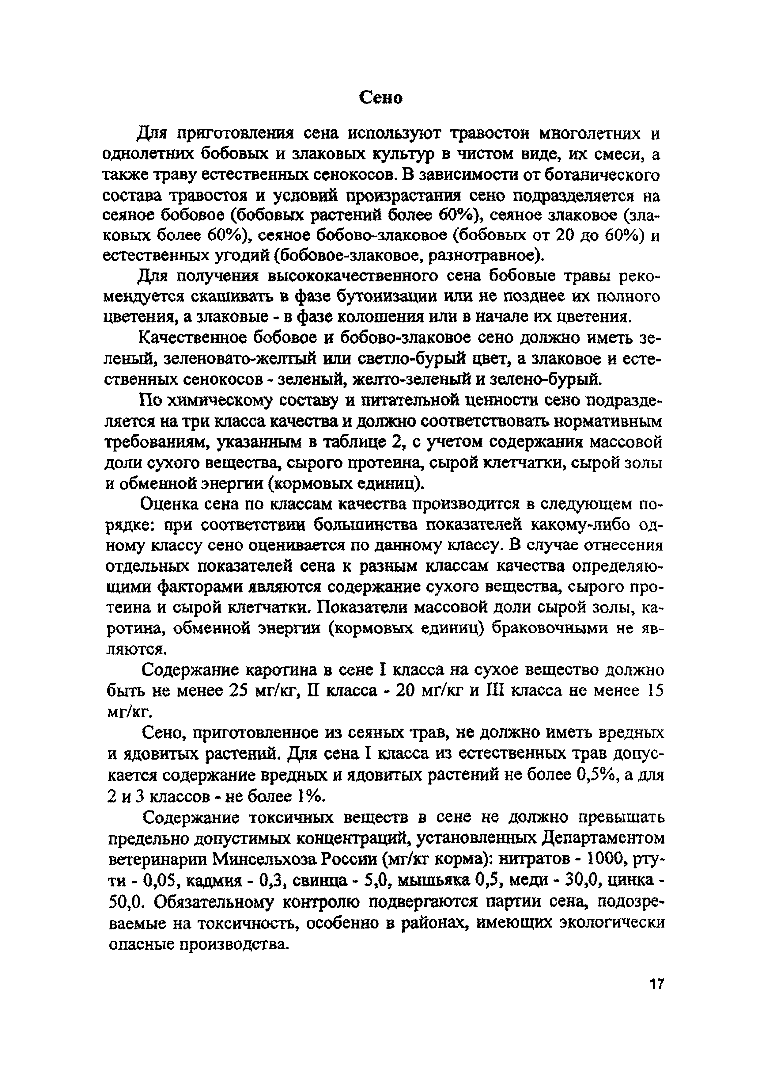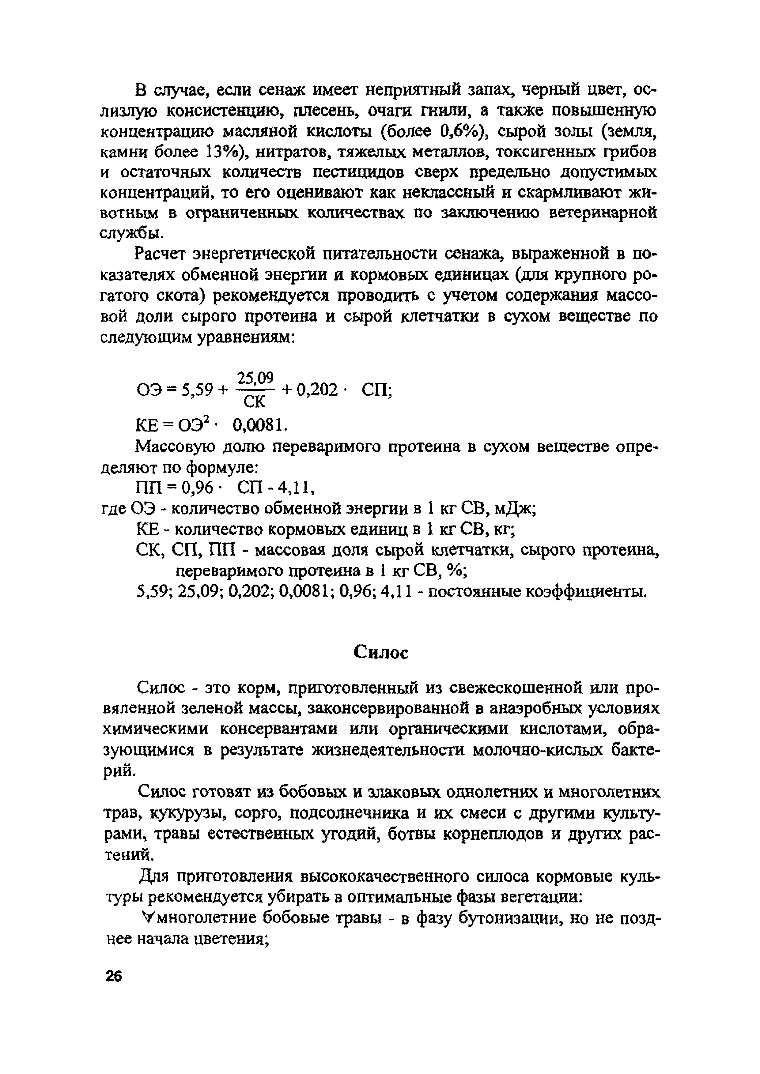 | Оглавление: | Введение Правила отбора проб кормов и доставки их в лабораторию Нормативные требования оценки качества и питательности кормов Зеленые корма Сено Солома и мякина (полова) Веточный корм Корма травяные искусственно высушенные Сенаж Силос Корнеклубнеплоды Концентрированные корма Комбикорма концентраты: для - крупного рогатого скота - свиней - овец - лошадей - кур - уток и гусей - индеек - нутрий, кроликов и пушных зверей Жмыхи, шроты Корма животного происхождения Корма и побочные продукты крахмало-паточного и сахарного производства, пивоваренной и спиртовой промышленности, пищевые отходы Порядок заполнения таблиц по результатам исследований качества и питательности кормов в процессе заготовки и хранения Уравнения для расчета энергетической и протеиновой питательности кормов по содержанию сырых питательных веществ: для свиней для птицы Коэффициенты пересчета джоулей в калории Приложения "Паспорт качества корма" Список литературы |