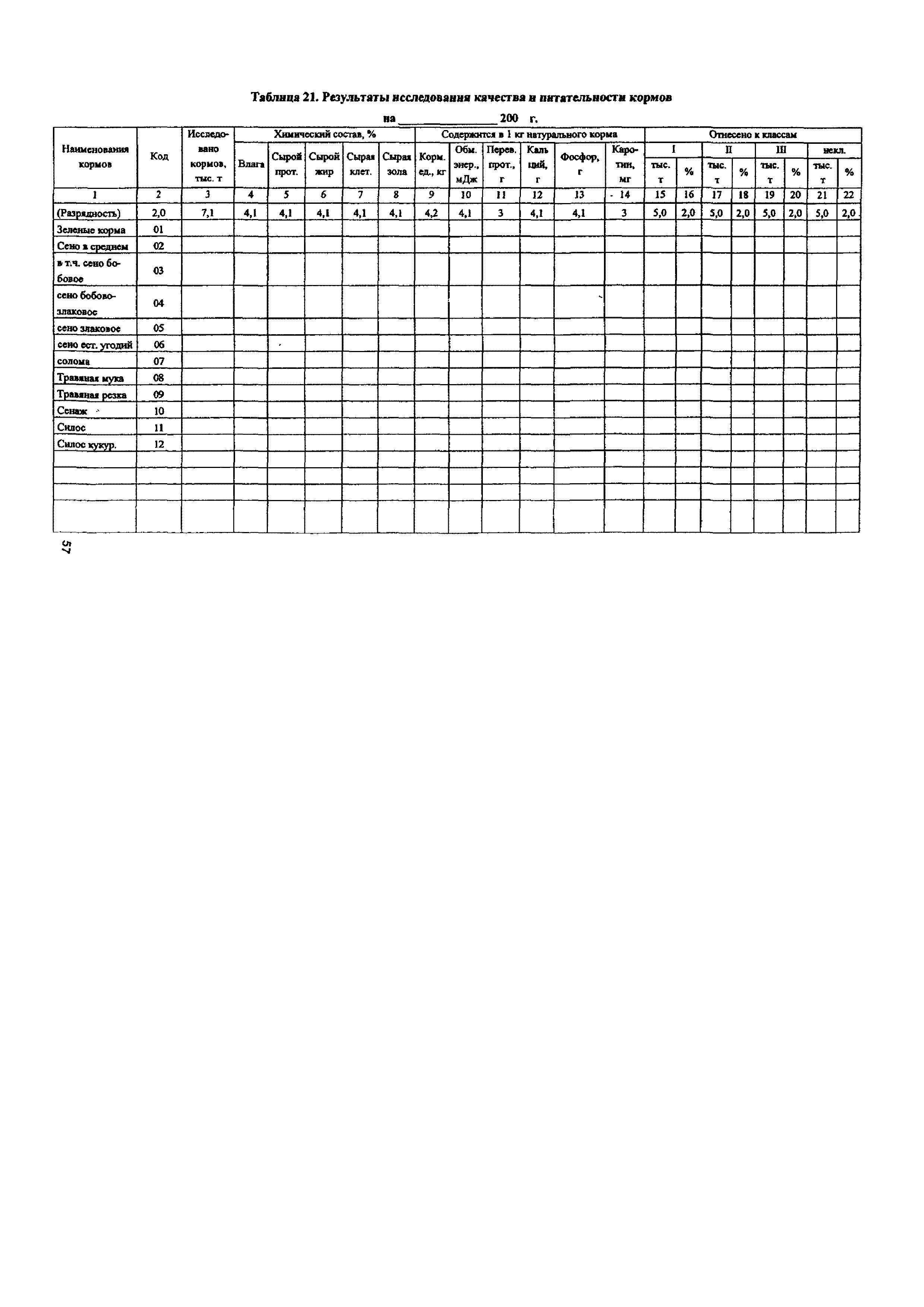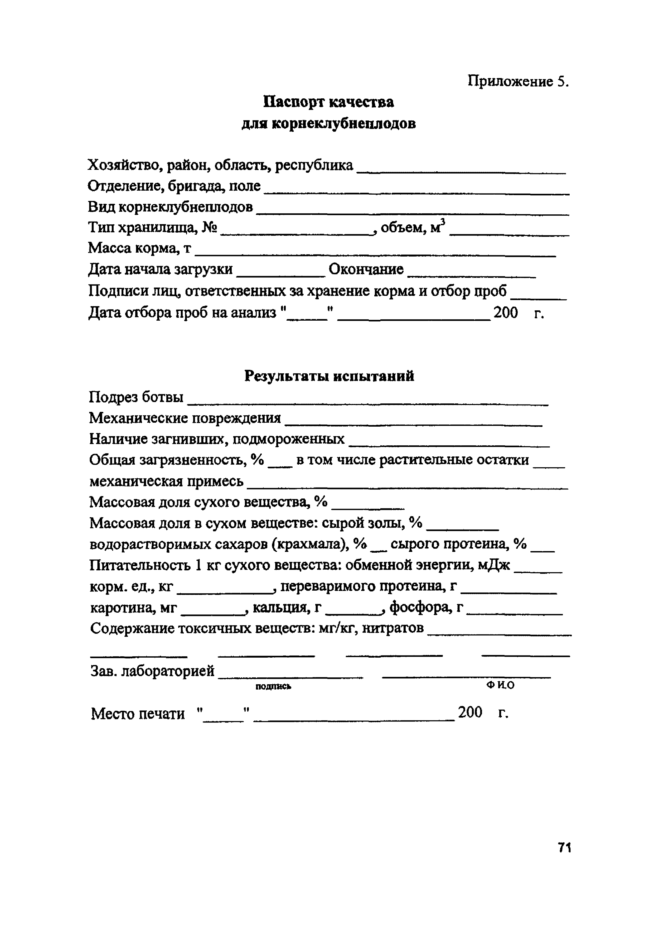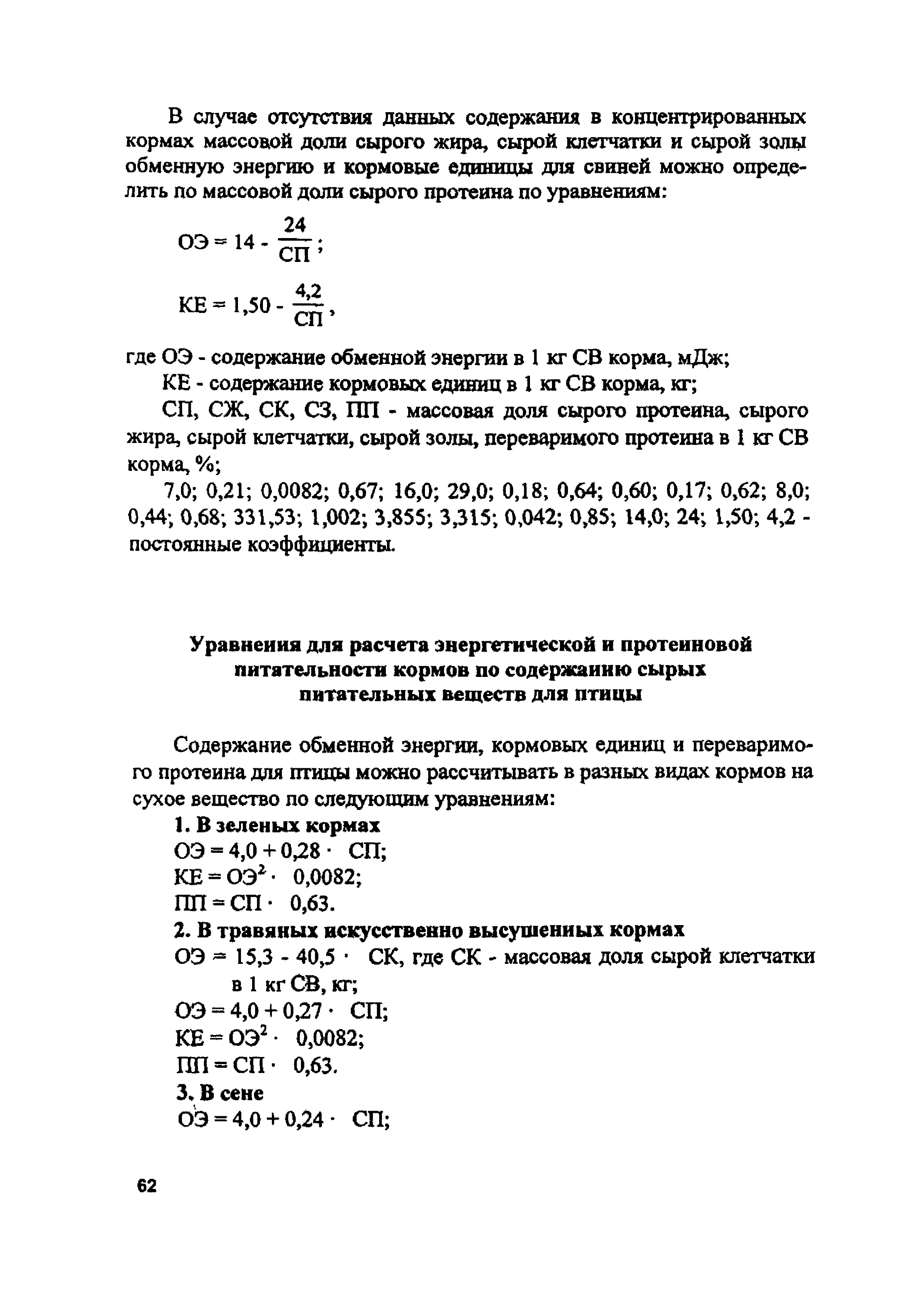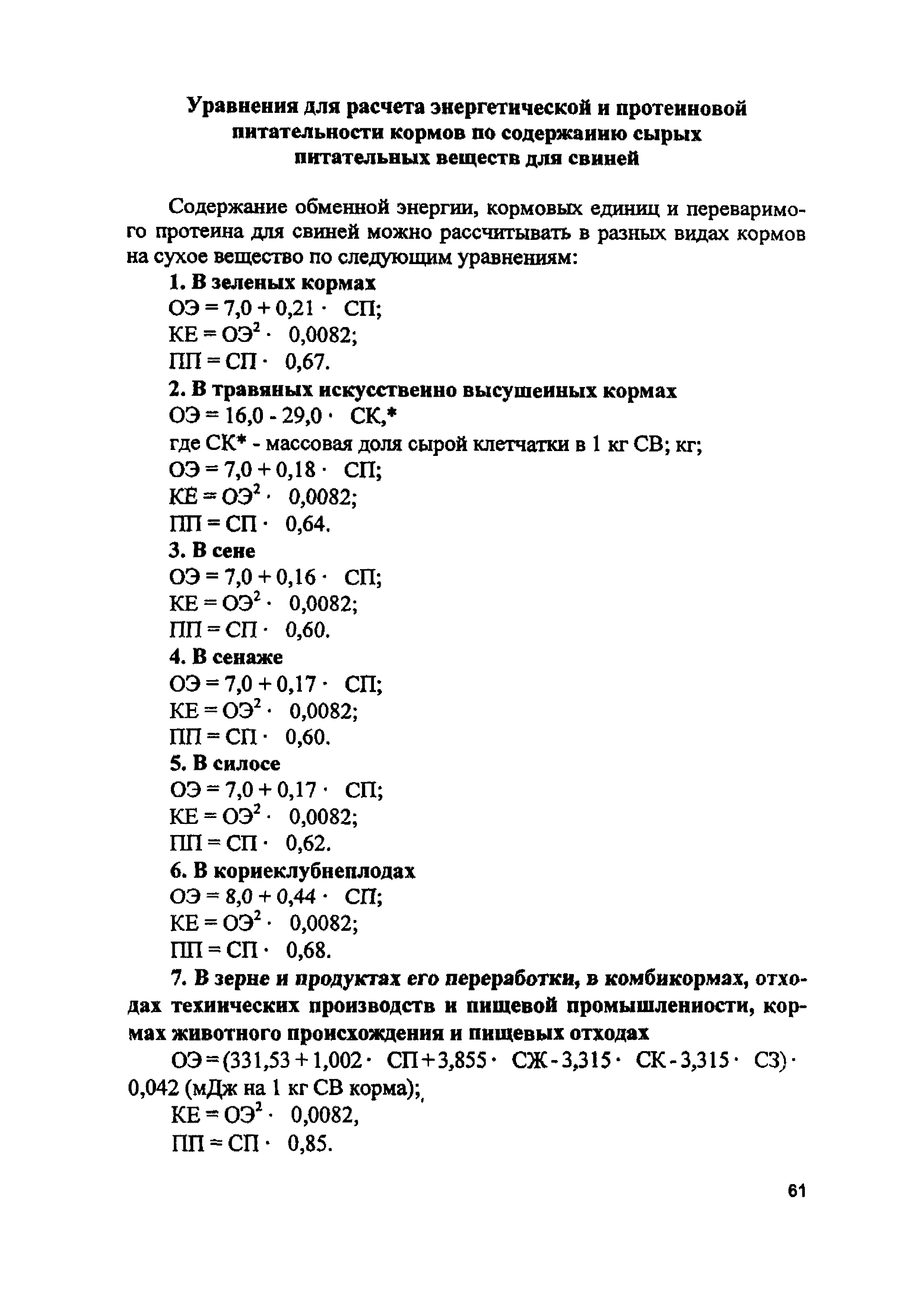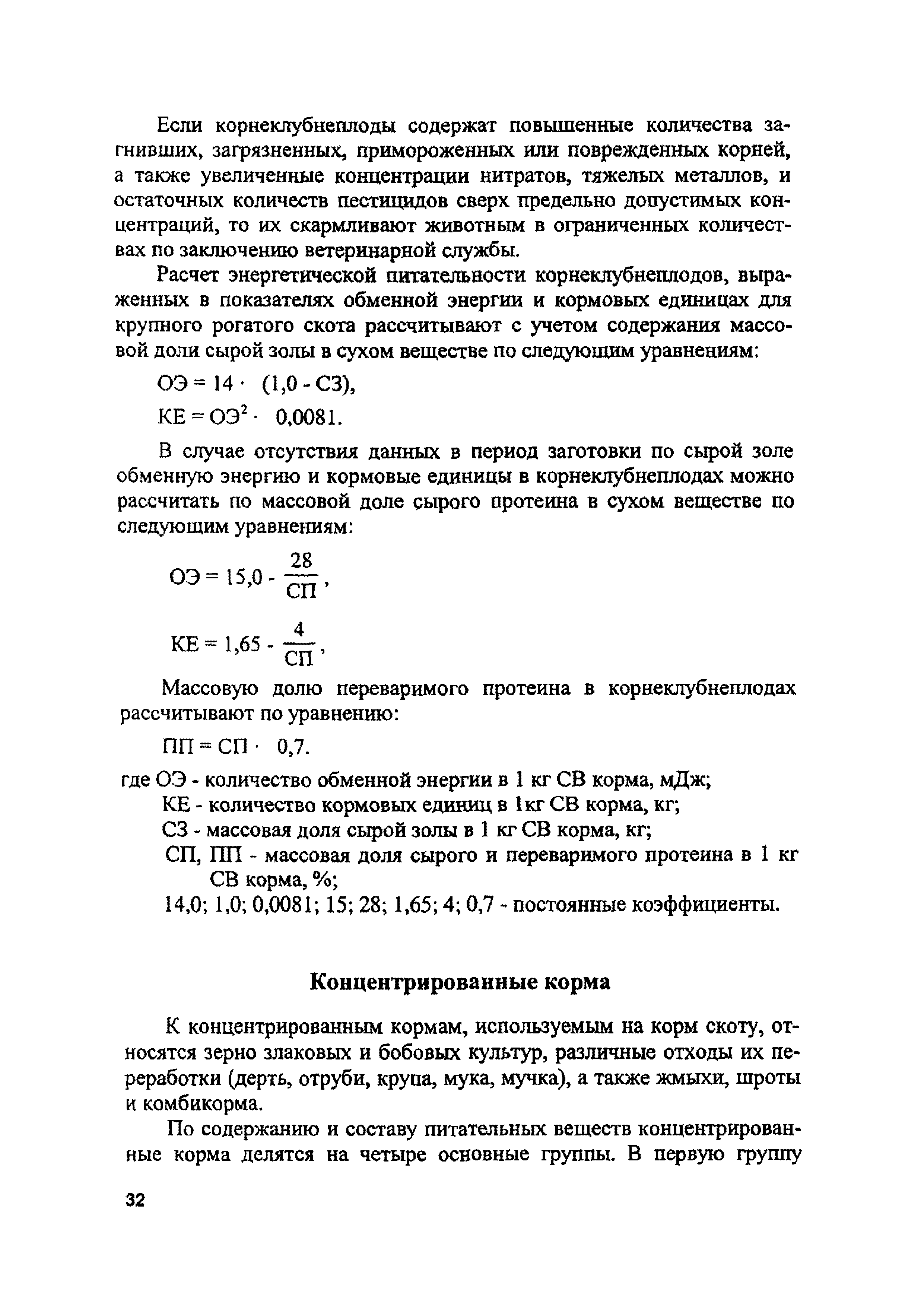 | Оглавление: | Введение Правила отбора проб кормов и доставки их в лабораторию Нормативные требования оценки качества и питательности кормов Зеленые корма Сено Солома и мякина (полова) Веточный корм Корма травяные искусственно высушенные Сенаж Силос Корнеклубнеплоды Концентрированные корма Комбикорма концентраты: для - крупного рогатого скота - свиней - овец - лошадей - кур - уток и гусей - индеек - нутрий, кроликов и пушных зверей Жмыхи, шроты Корма животного происхождения Корма и побочные продукты крахмало-паточного и сахарного производства, пивоваренной и спиртовой промышленности, пищевые отходы Порядок заполнения таблиц по результатам исследований качества и питательности кормов в процессе заготовки и хранения Уравнения для расчета энергетической и протеиновой питательности кормов по содержанию сырых питательных веществ: для свиней для птицы Коэффициенты пересчета джоулей в калории Приложения "Паспорт качества корма" Список литературы |