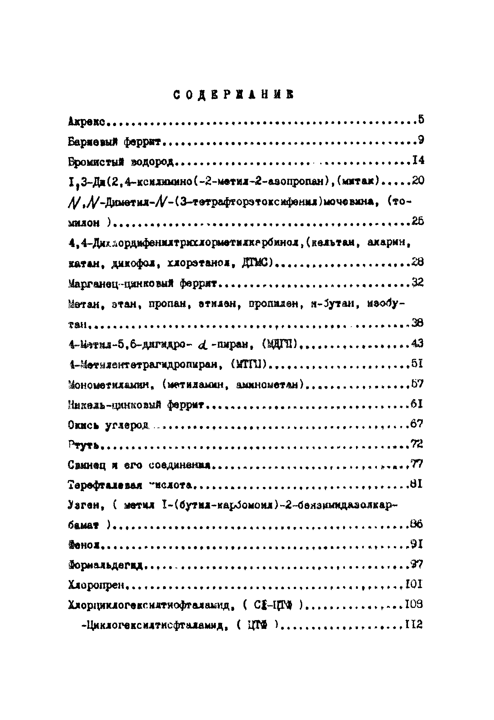 | Оглавление: | Акрекс Бариевый феррит Бромистый водород 1,3-Ди(2,4-ксилимино(-2 метил-2-азопропан) N,N-Диметил-N-(3-тетрафторэтоксифенил) мочевина, (томилон) 4,4-Дихлордифенилтрихлорметилкарбинол Марганец-цинковый феррит Метан, этан, пропан, этилен, пропилен, н-бутан, изобутан 4-Метил-5,6-дигидро-альфа-пиран 4-Метилентетрагидропиран Монометиламин Никель-цинковый феррит Окись углерода Ртуть Свинец и его соединения Терефталевая кислота Узген Фенол Формальдегид Хлоропрен Хлорциклогексилтиофталамид Циклогексилтиофталамид |