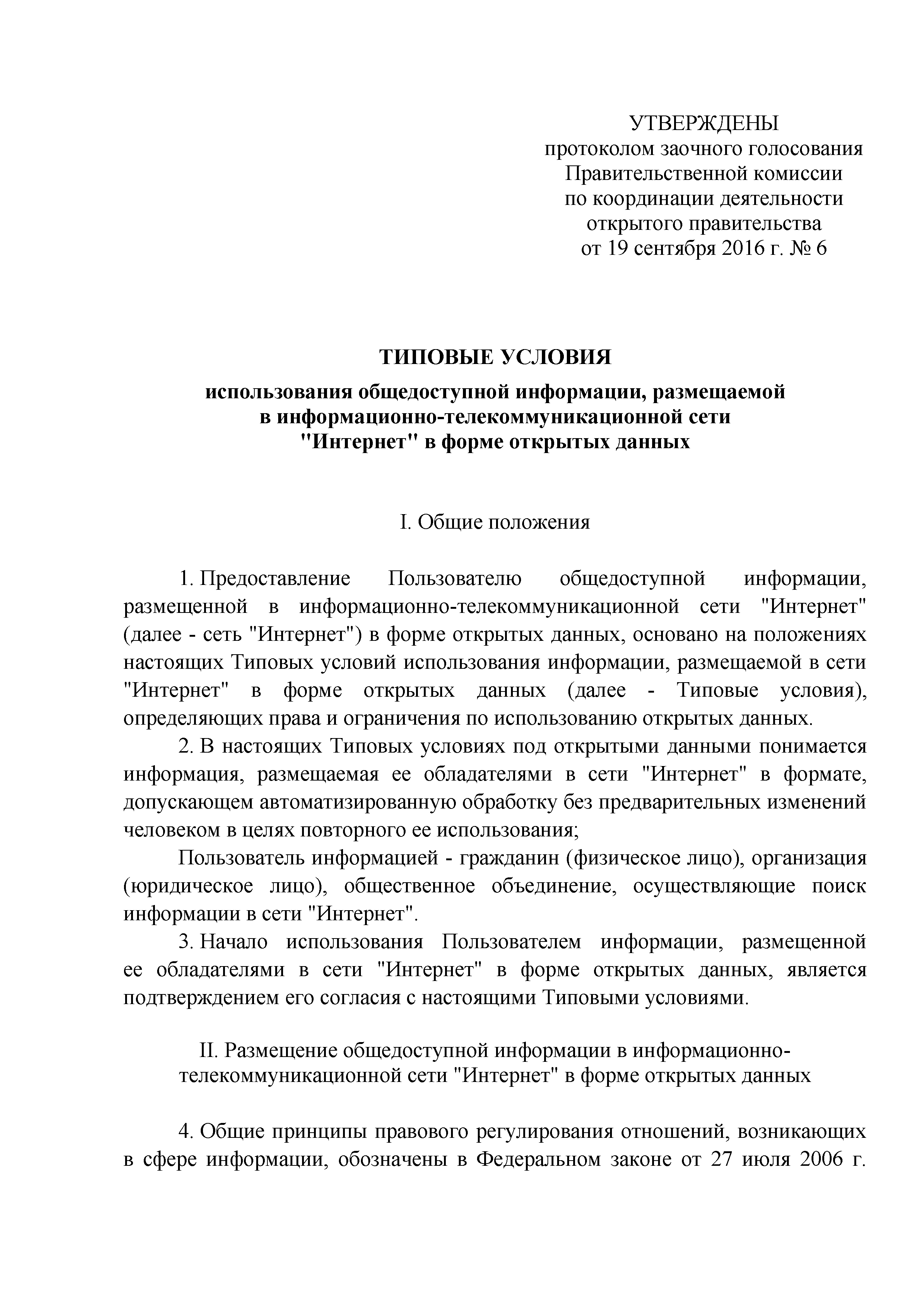| Название рус.: | Типовые условия использования общедоступной информации, размещаемой в информационно-телекоммуникационной сети "Интернет" в форме открытых данных |