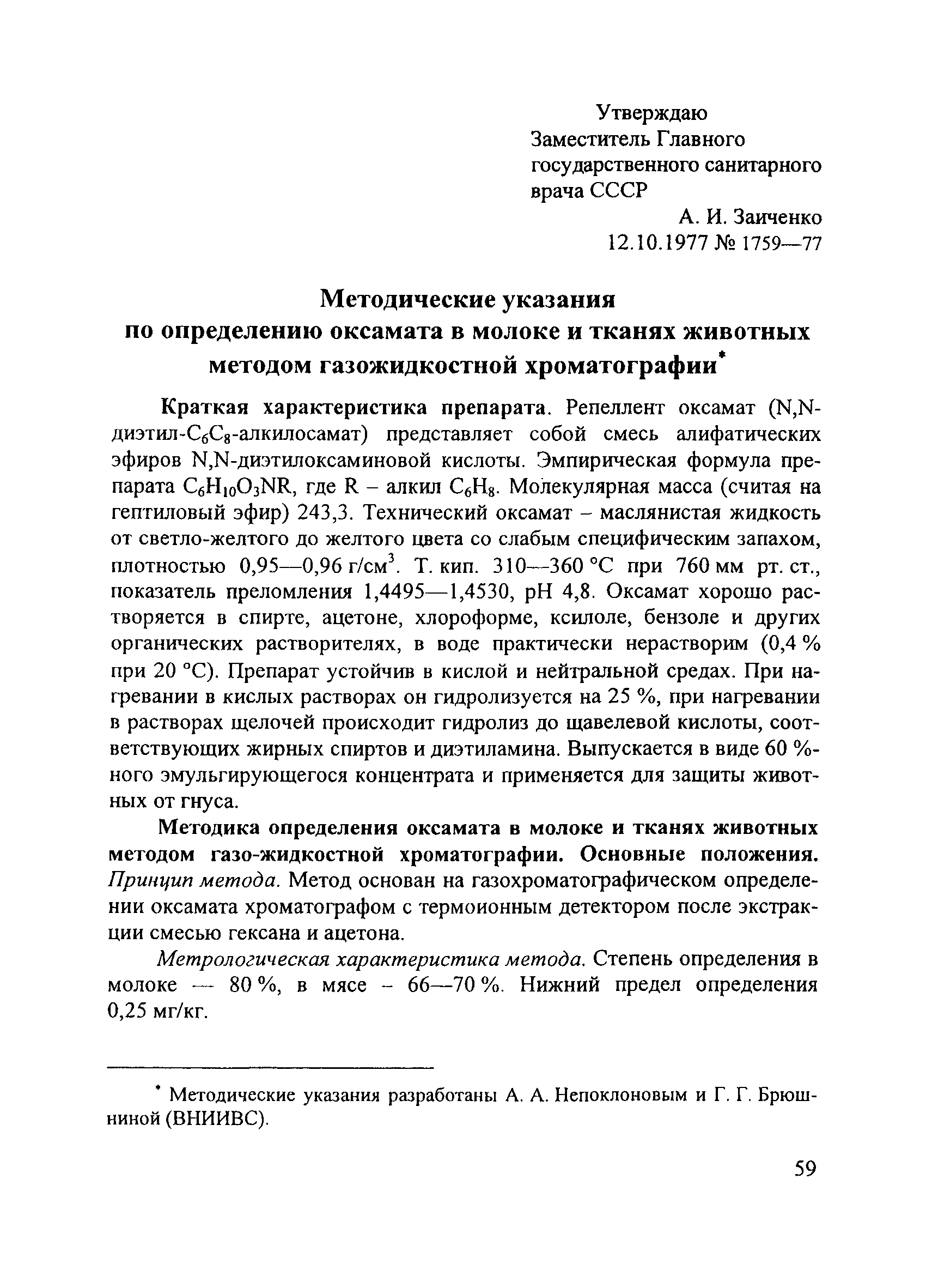 | Утверждён: | 12.10.1977 Заместитель Главного государственного санитарного врача CCCР (1759-77)