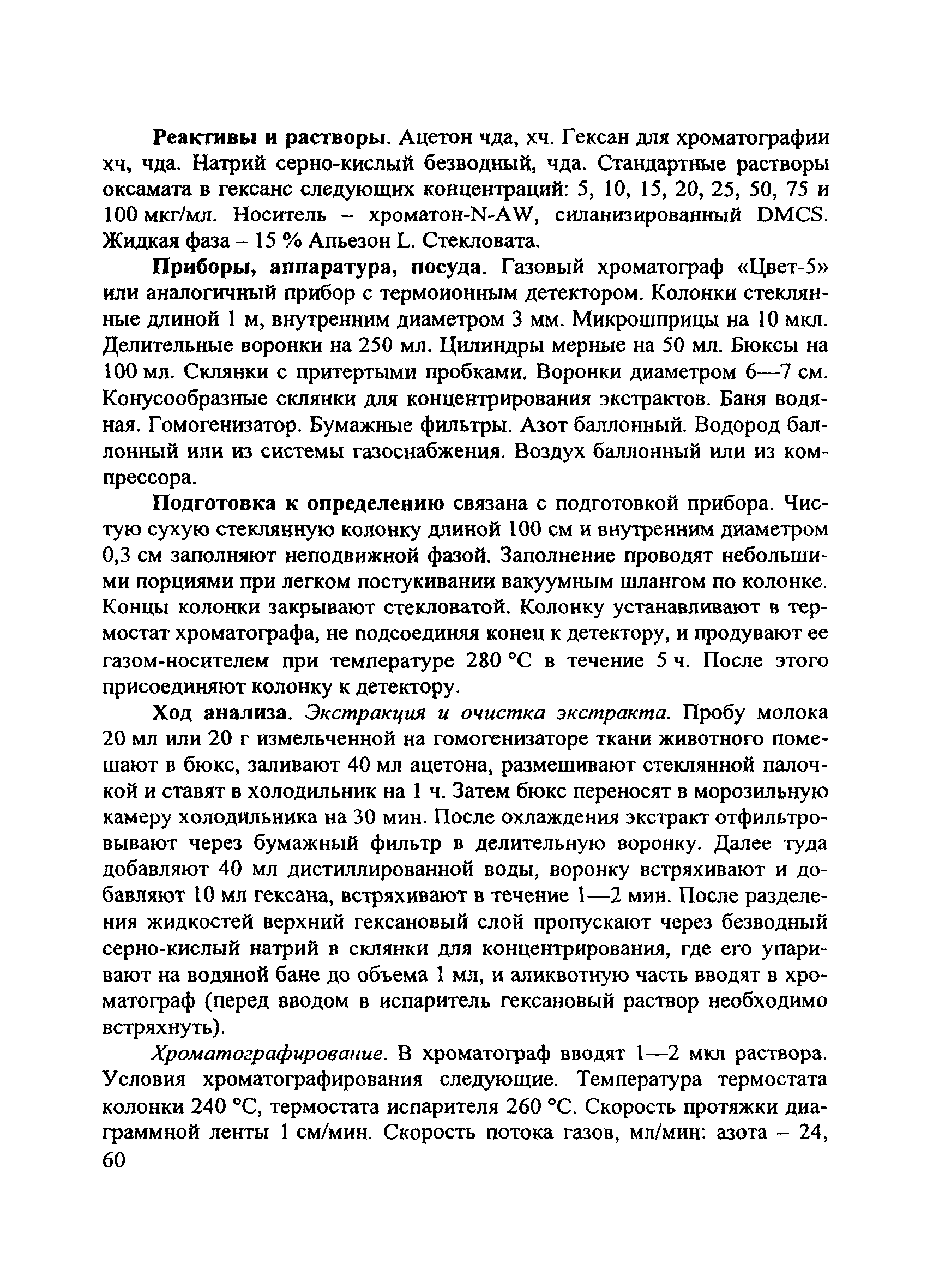 | Оглавление: | Краткая характеристика препарата Методика определения оксамата в молоке и тканях животных методом газожидкостной хроматографии. Основные положения Реактивы и растворы Приборы, аппаратура, посуда Подготовка к определению Ход анализа Обработка результатов анализа |
