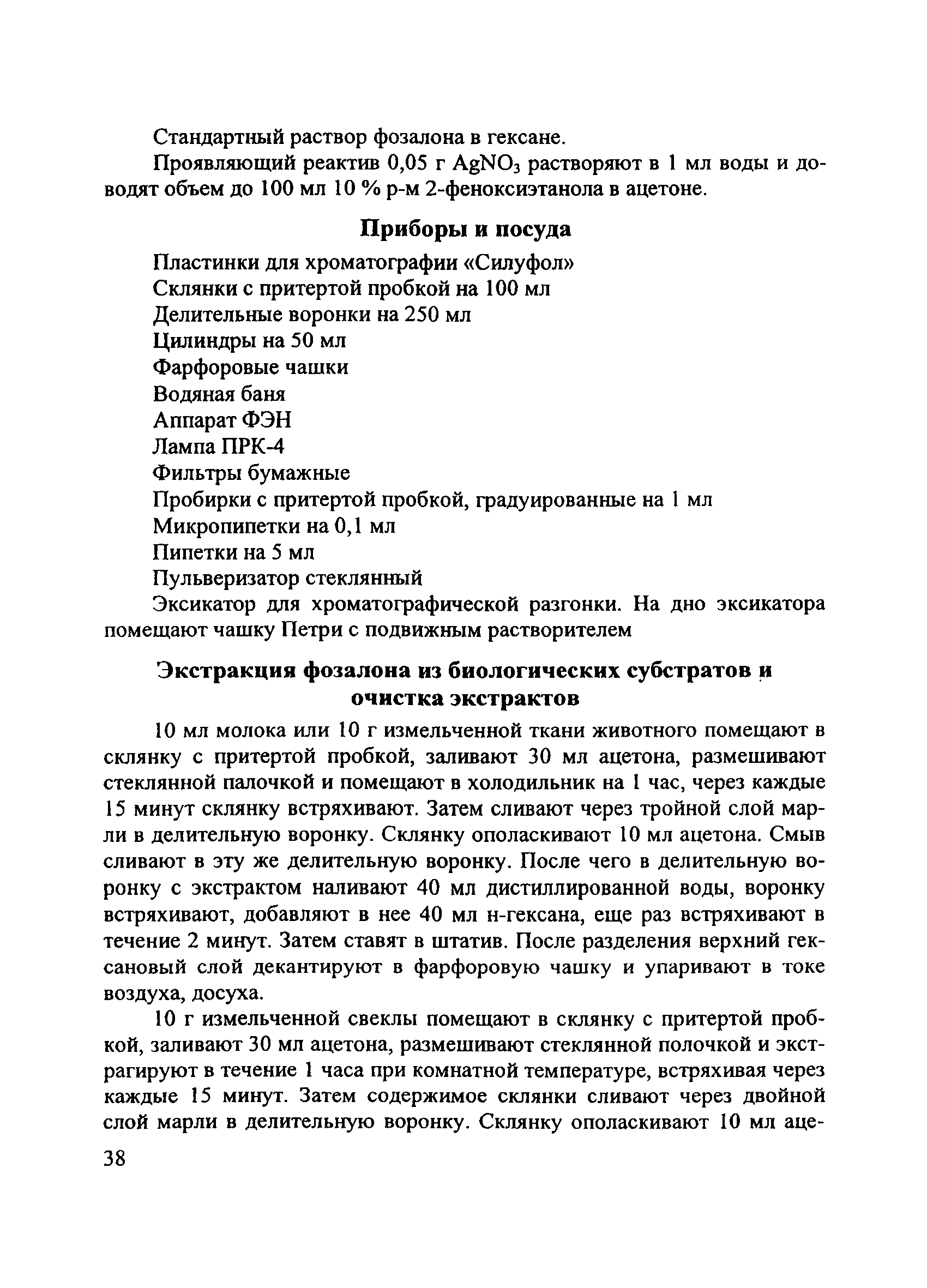 Определение фозалона в молоке и тканях животных, траве, свекле, картофеле и комбикорме с помощью тонкослойной хроматографии| Статус: | действует | | Название рус.: | Определение фозалона в молоке и тканях животных, траве, свекле, картофеле и комбикорме с помощью тонкослойной хроматографии | | Дата добавления в базу: | 01.02.2017 | | Дата актуализации: | 01.01.2021 | | Оглавление: | Характеристика препарата Принцип метода Реактивы и растворы Приборы и посуда Экстракция фозалона из биологических субстратов и очистка экстрактов Хроматографирование | | Разработан: | ВНИИ ветеринарной санитарии