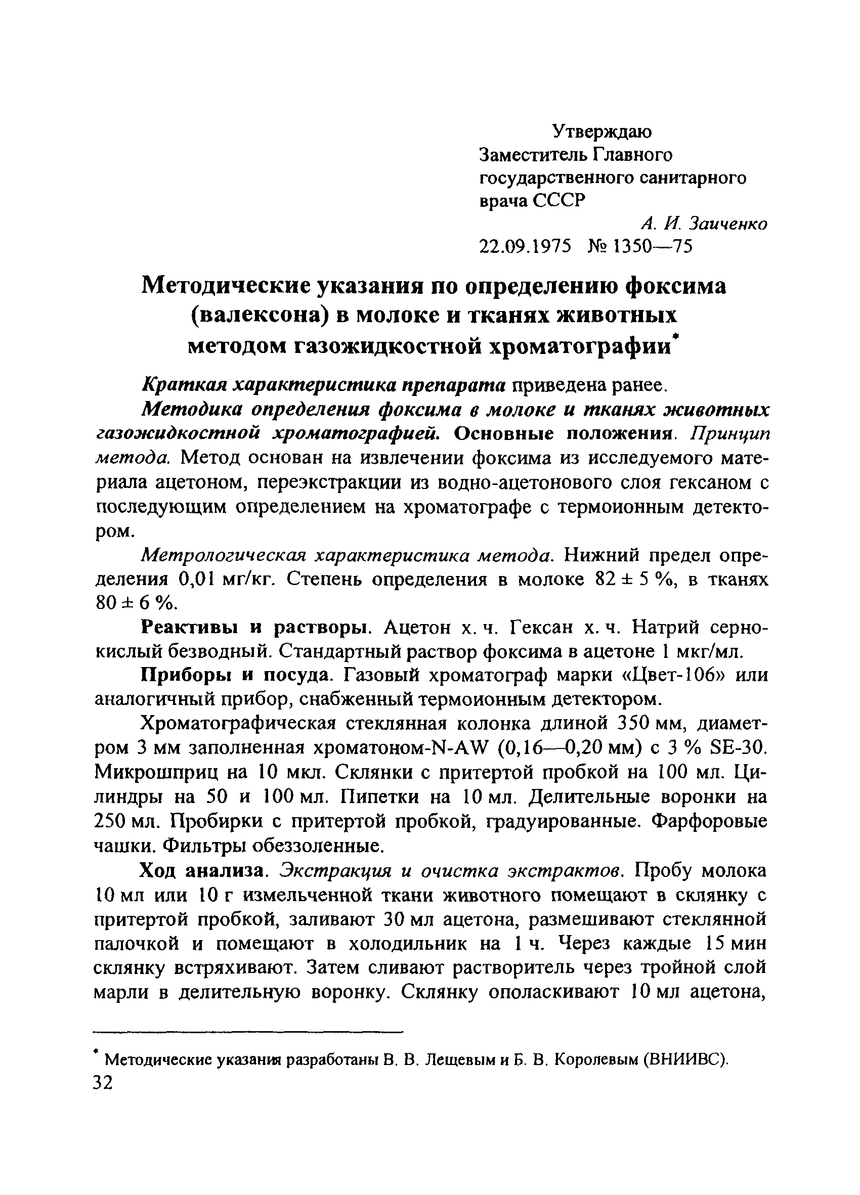 | Название рус.: | Методические указания по определению фоксима (валексона) в молоке и тканях животных методом газожидкостной хроматографии |