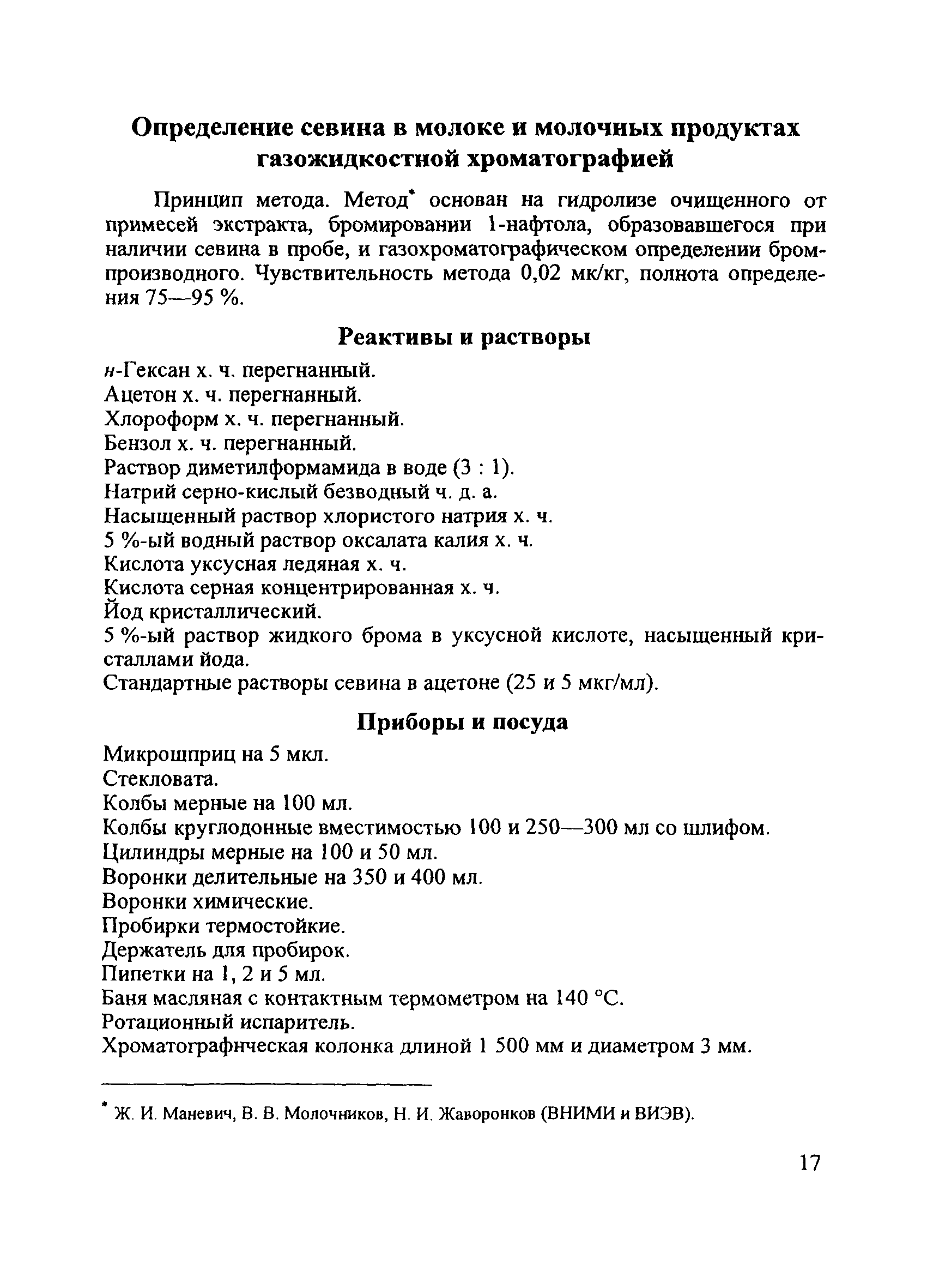 | Название рус.: | Определение севина в молоке и молочных продуктах газожидкостной хроматографией |