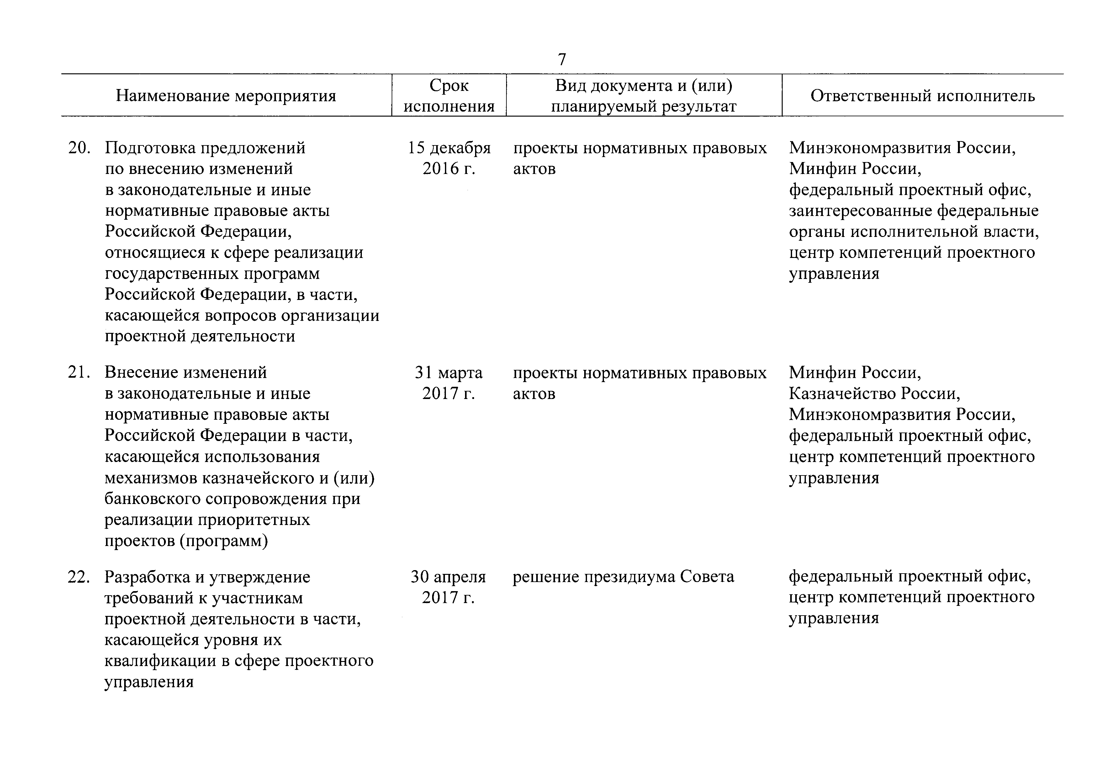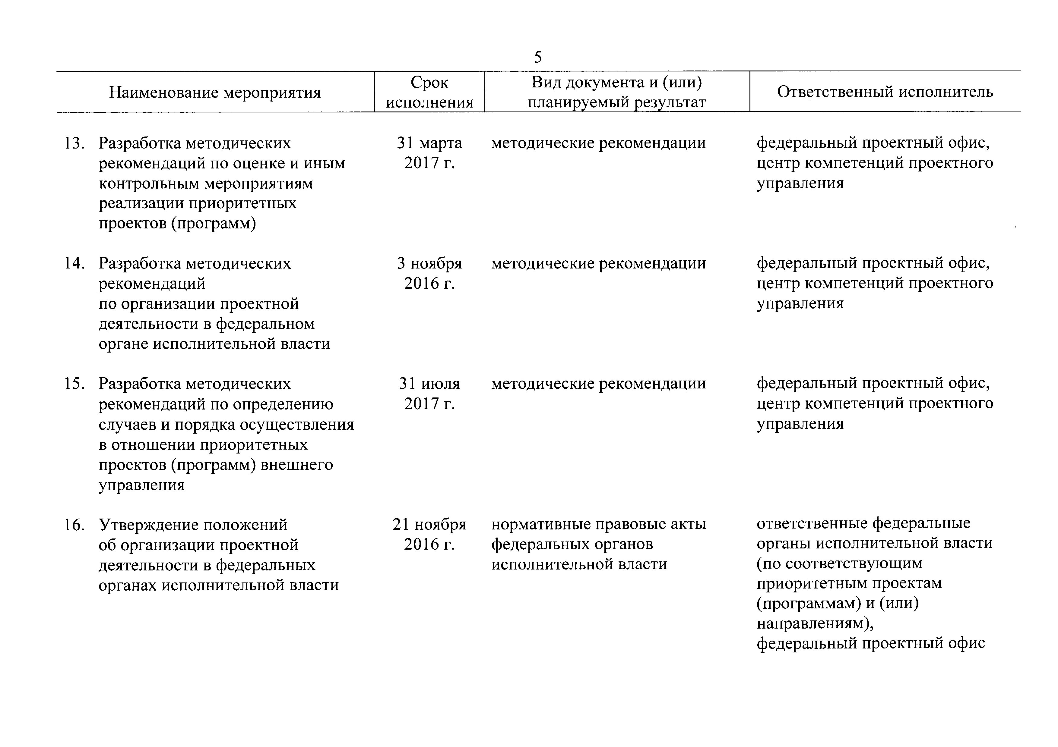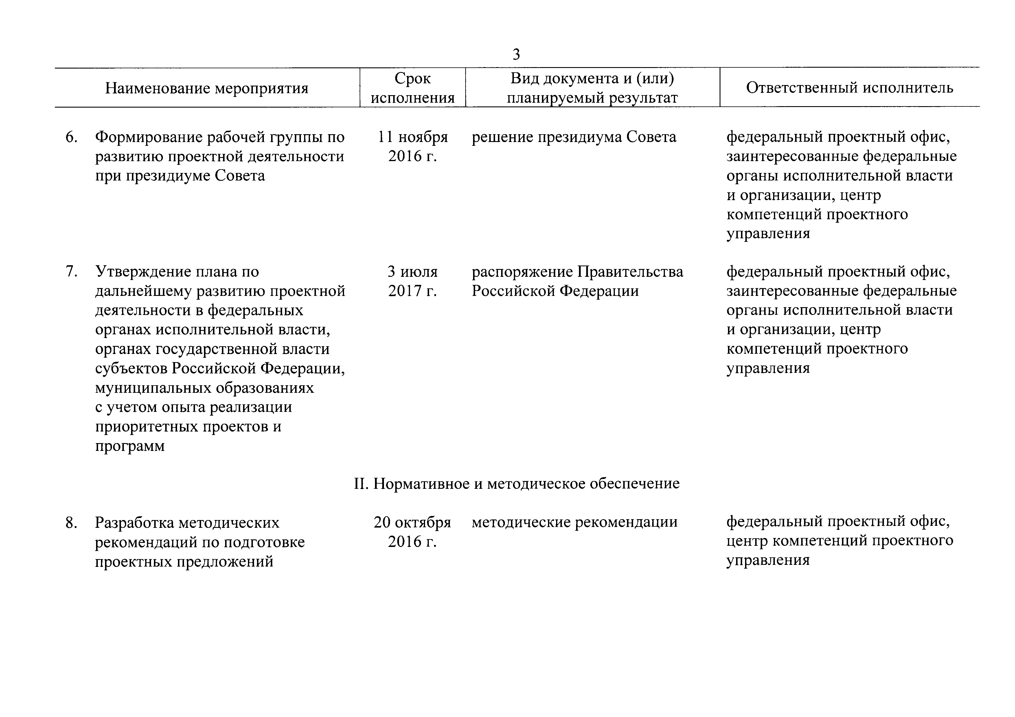 План первоочередных мероприятий по организации проектной деятельности в Правительстве Российской Федерации на 2016 и 2017 годы| Статус: | действует | | Название рус.: | План первоочередных мероприятий по организации проектной деятельности в Правительстве Российской Федерации на 2016 и 2017 годы | | Дата добавления в базу: | 01.02.2017 | | Дата актуализации: | 01.01.2021 | | Дата введения: | 15.10.2016 | | Утверждён: | 15.10.2016 Правительство Российской Федерации (2165-р)