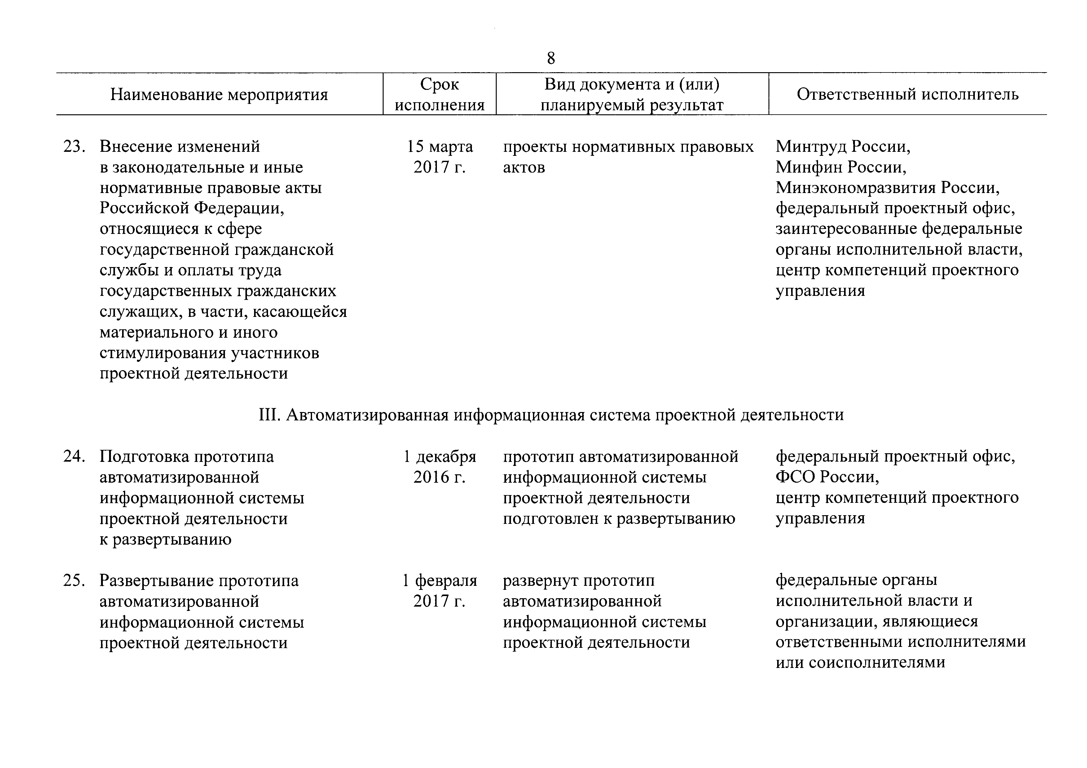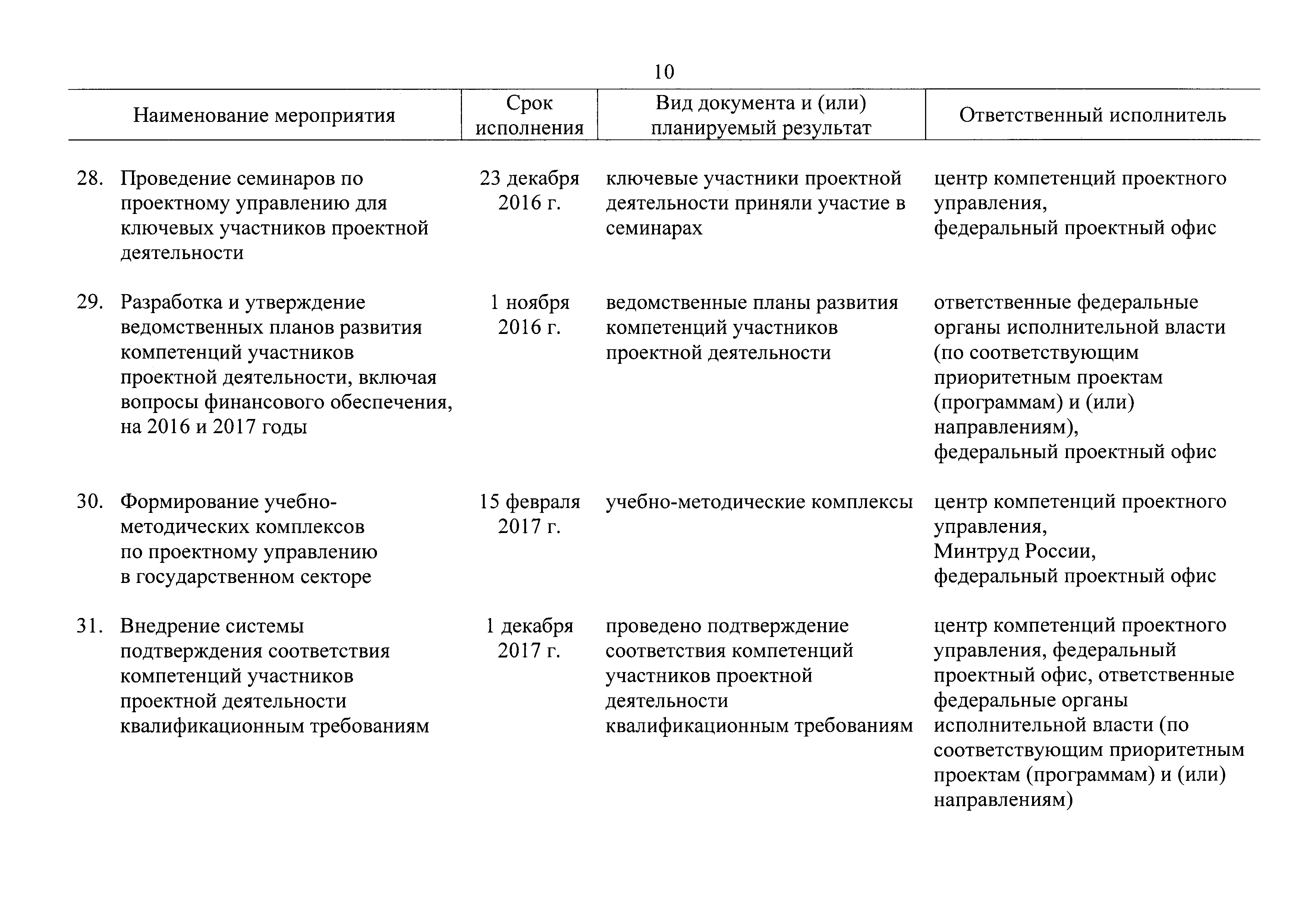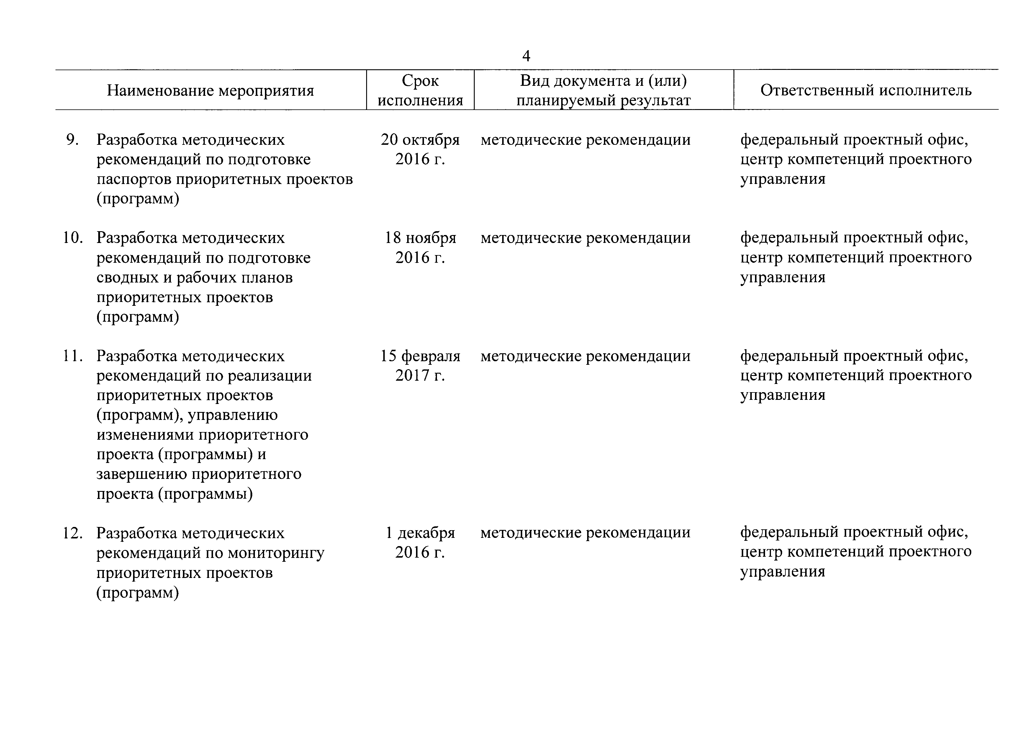 План первоочередных мероприятий по организации проектной деятельности в Правительстве Российской Федерации на 2016 и 2017 годы| Статус: | действует | | Название рус.: | План первоочередных мероприятий по организации проектной деятельности в Правительстве Российской Федерации на 2016 и 2017 годы | | Дата добавления в базу: | 01.02.2017 | | Дата актуализации: | 01.01.2021 | | Дата введения: | 15.10.2016 | | Утверждён: | 15.10.2016 Правительство Российской Федерации (2165-р)