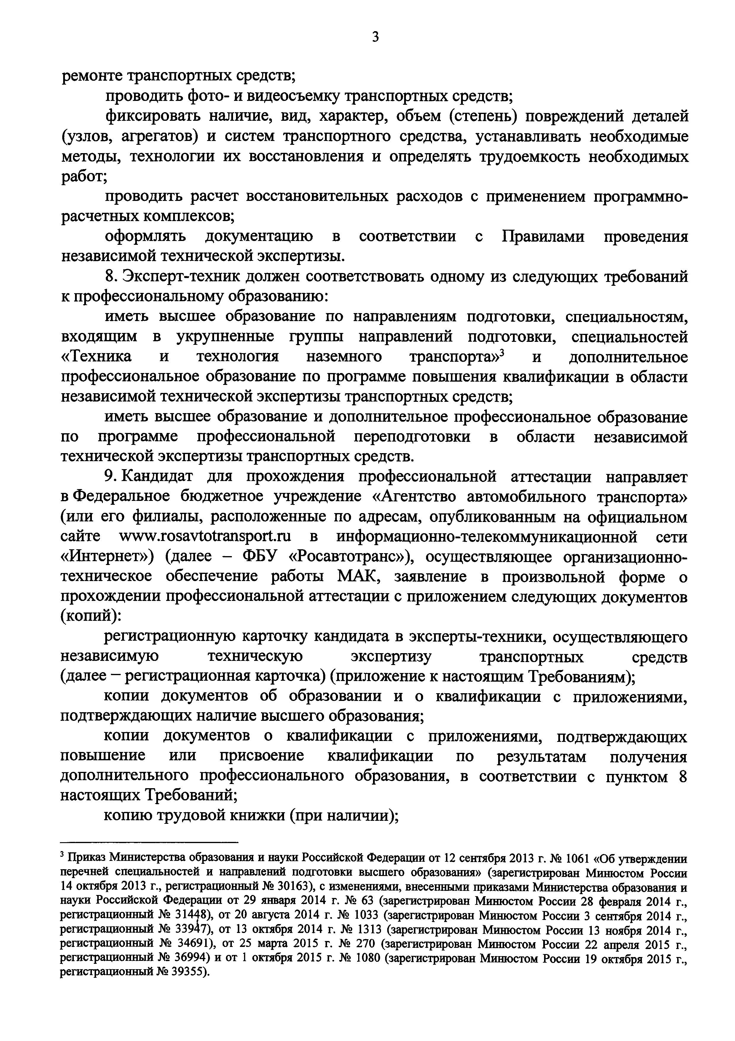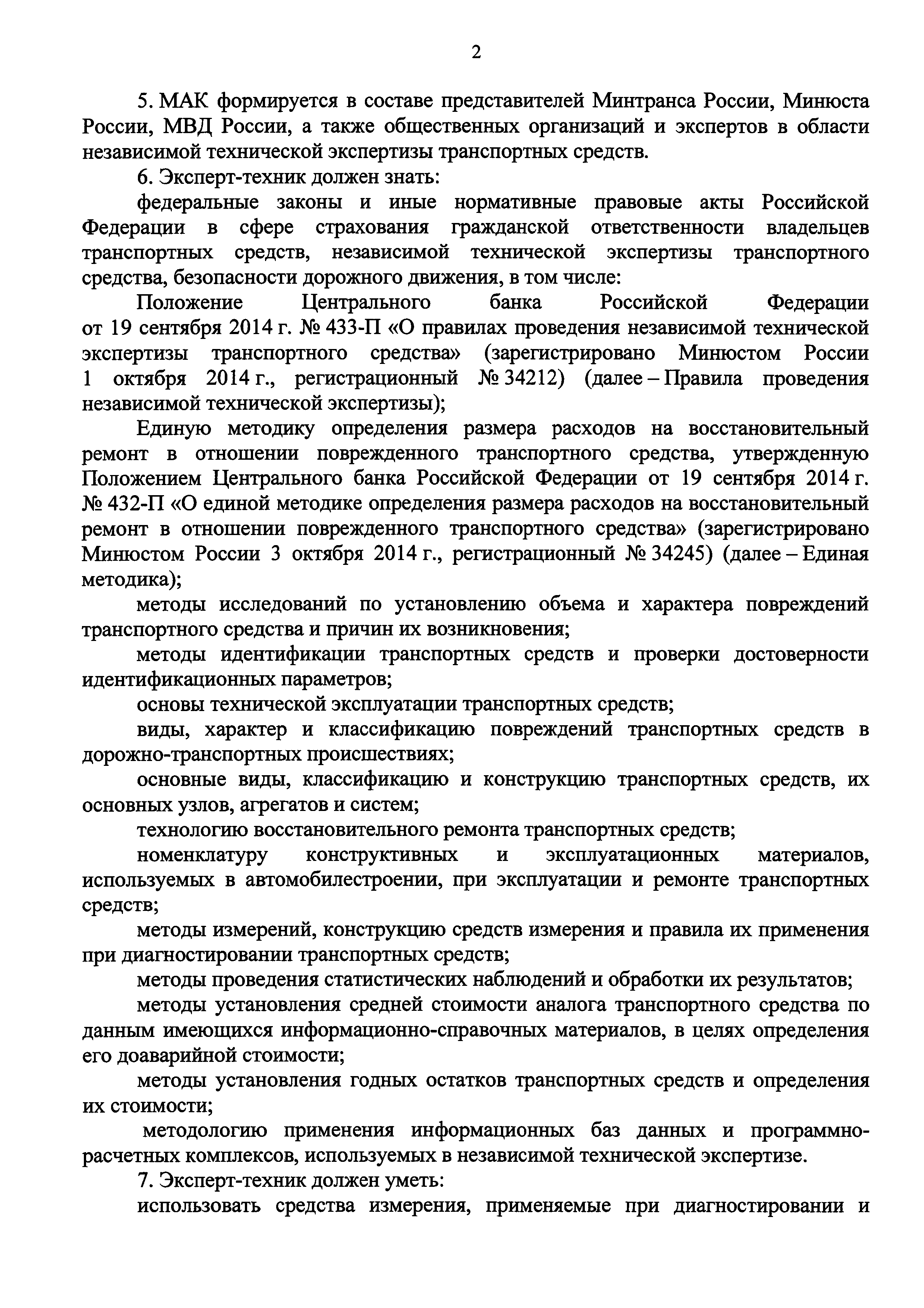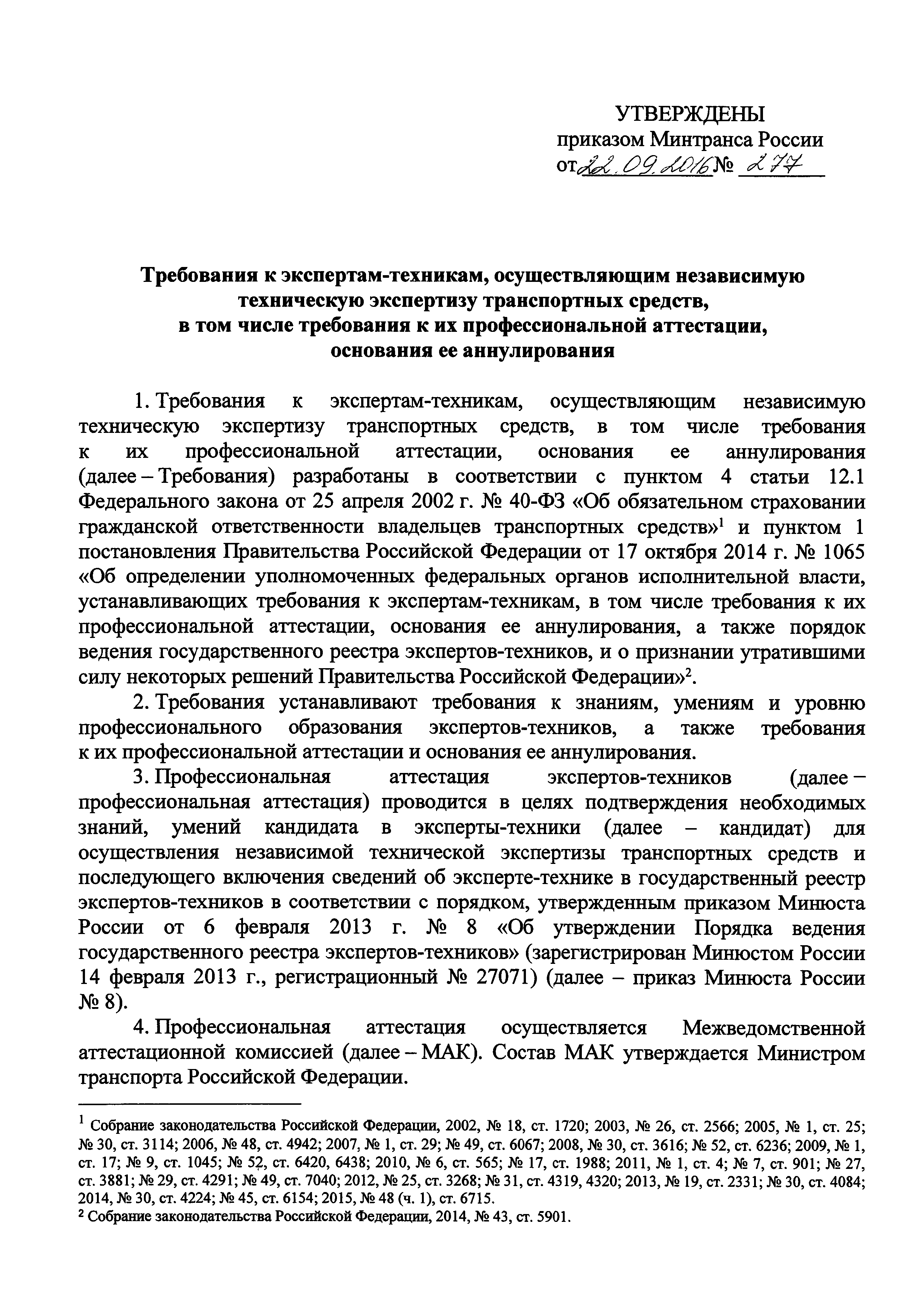 Требования к экспертам-техникам, осуществляющим независимую техническую экспертизу транспортных средств, в том числе требования к их профессиональной аттестации, основания ее аннулирования| Статус: | действует | | Название рус.: | Требования к экспертам-техникам, осуществляющим независимую техническую экспертизу транспортных средств, в том числе требования к их профессиональной аттестации, основания ее аннулирования | | Дата добавления в базу: | 01.02.2017 | | Дата актуализации: | 01.01.2021 | | Дата введения: | 19.12.2016 | | Область применения: | Требования устанавливают требования к знаниям, умениям и уровню профессионального образования экспертов-техников, а также требования к их профессиональной аттестации и основания ее аннулирования | | Оглавление: | Приложение. Регистрационная карточка кандидата в эксперты-техники, осуществляющего независимую техническую экспертизу транспортных средств | | Утверждён: | 22.09.2016 Минтранс России (Russian Federation Mintrans 277)