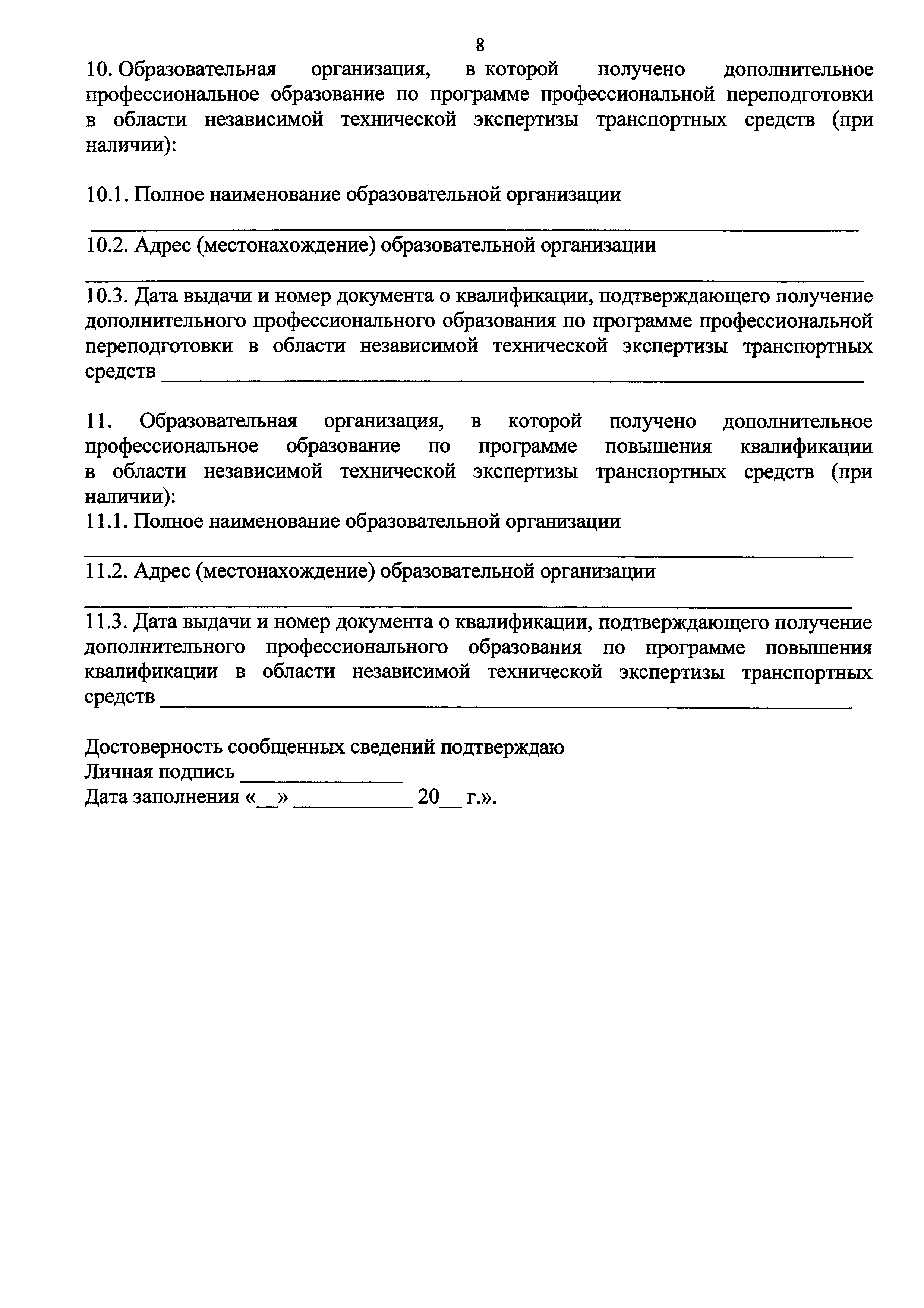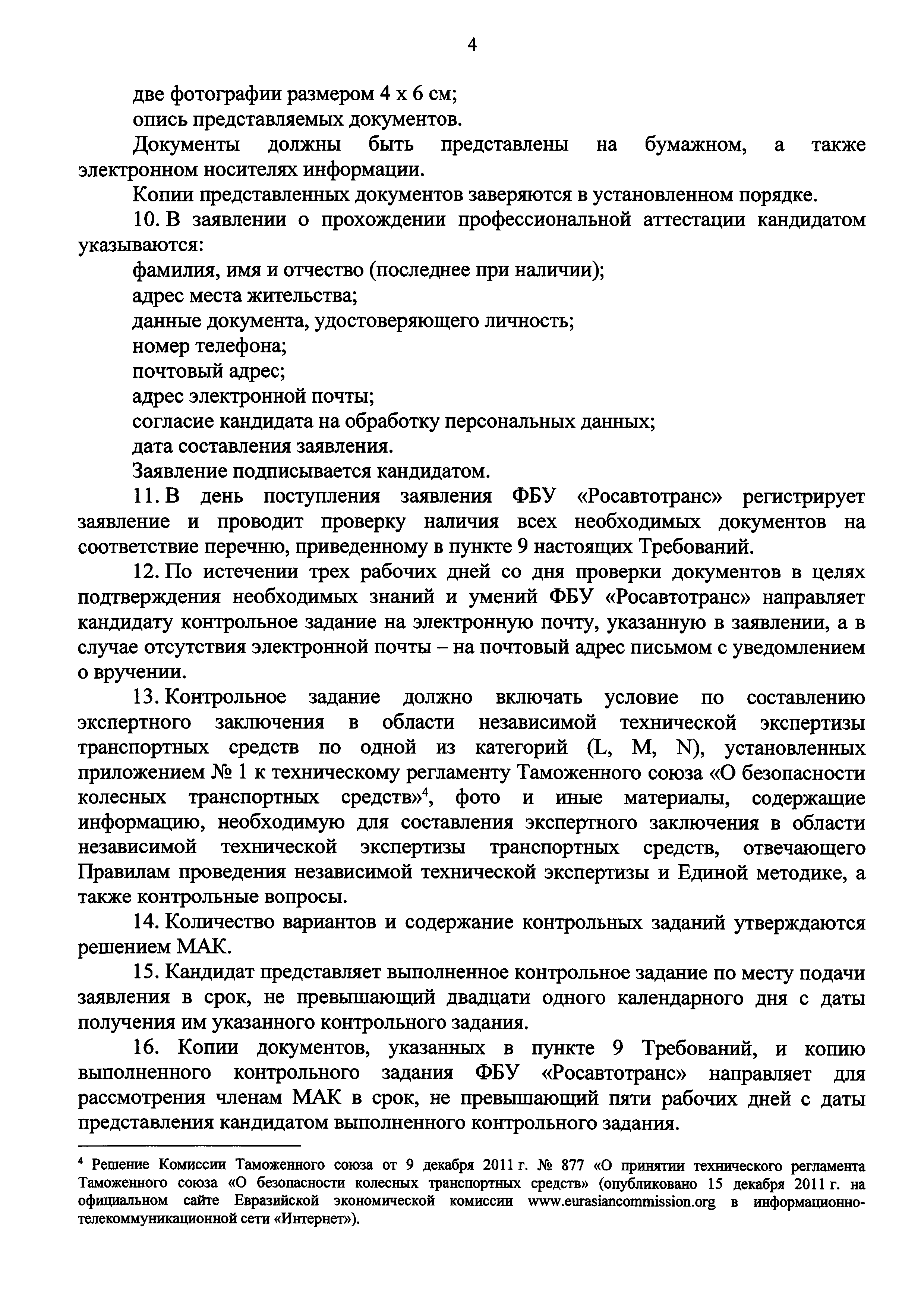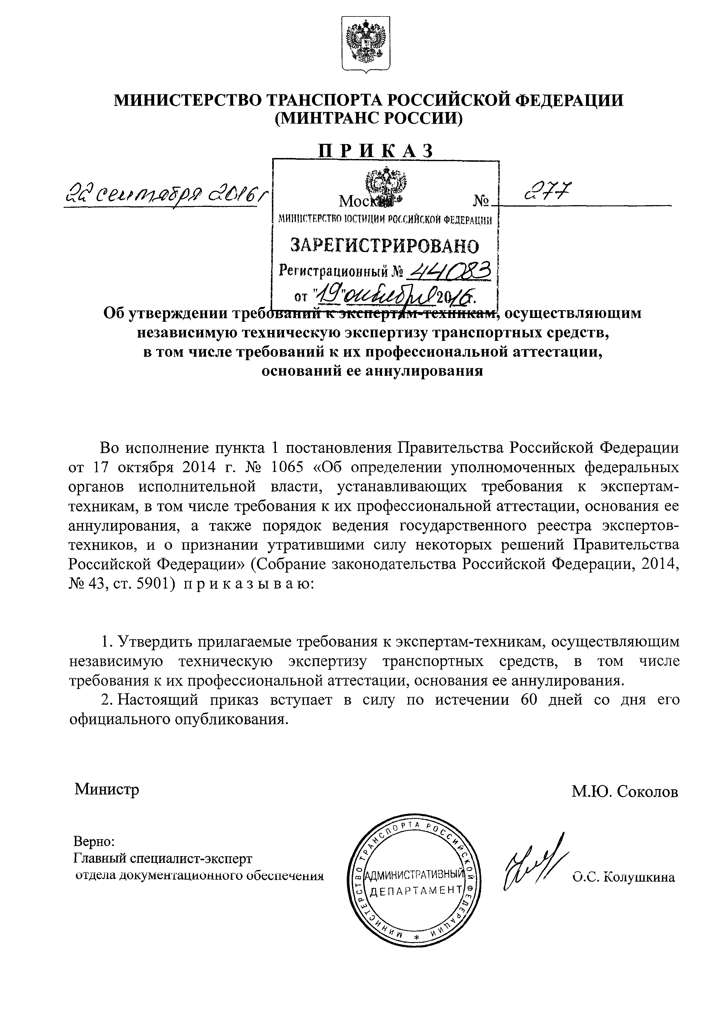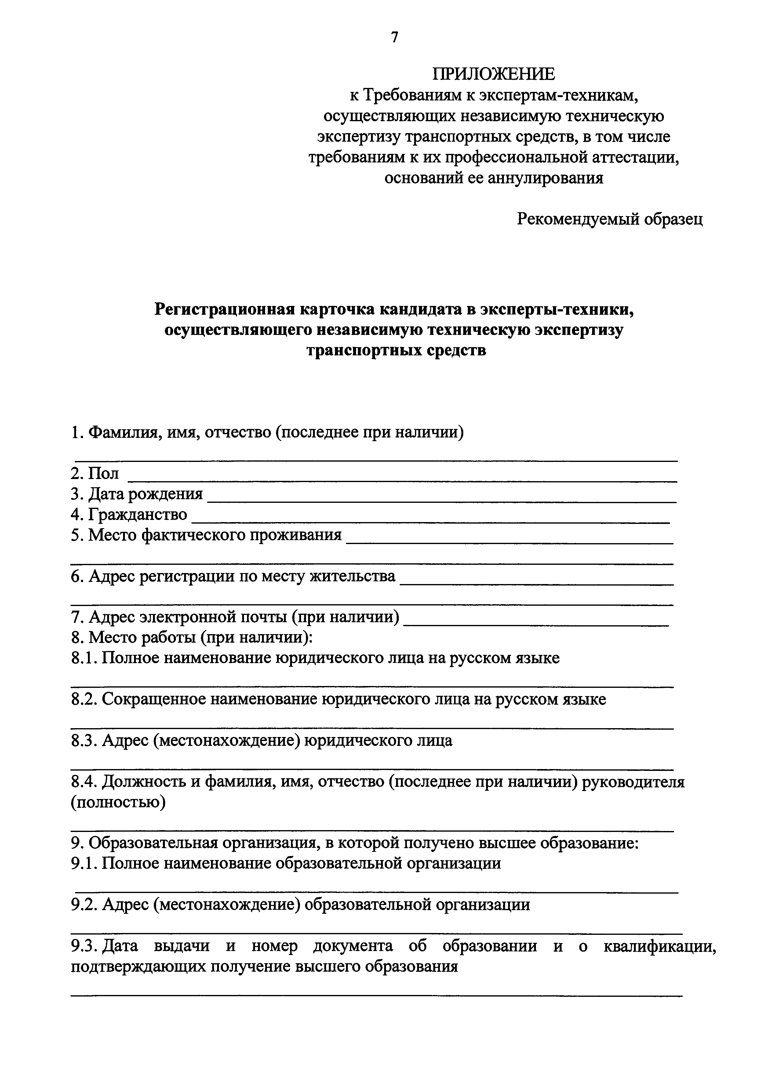 Требования к экспертам-техникам, осуществляющим независимую техническую экспертизу транспортных средств, в том числе требования к их профессиональной аттестации, основания ее аннулирования| Статус: | действует | | Название рус.: | Требования к экспертам-техникам, осуществляющим независимую техническую экспертизу транспортных средств, в том числе требования к их профессиональной аттестации, основания ее аннулирования | | Дата добавления в базу: | 01.02.2017 | | Дата актуализации: | 01.01.2021 | | Дата введения: | 19.12.2016 | | Область применения: | Требования устанавливают требования к знаниям, умениям и уровню профессионального образования экспертов-техников, а также требования к их профессиональной аттестации и основания ее аннулирования | | Оглавление: | Приложение. Регистрационная карточка кандидата в эксперты-техники, осуществляющего независимую техническую экспертизу транспортных средств | | Утверждён: | 22.09.2016 Минтранс России (Russian Federation Mintrans 277)