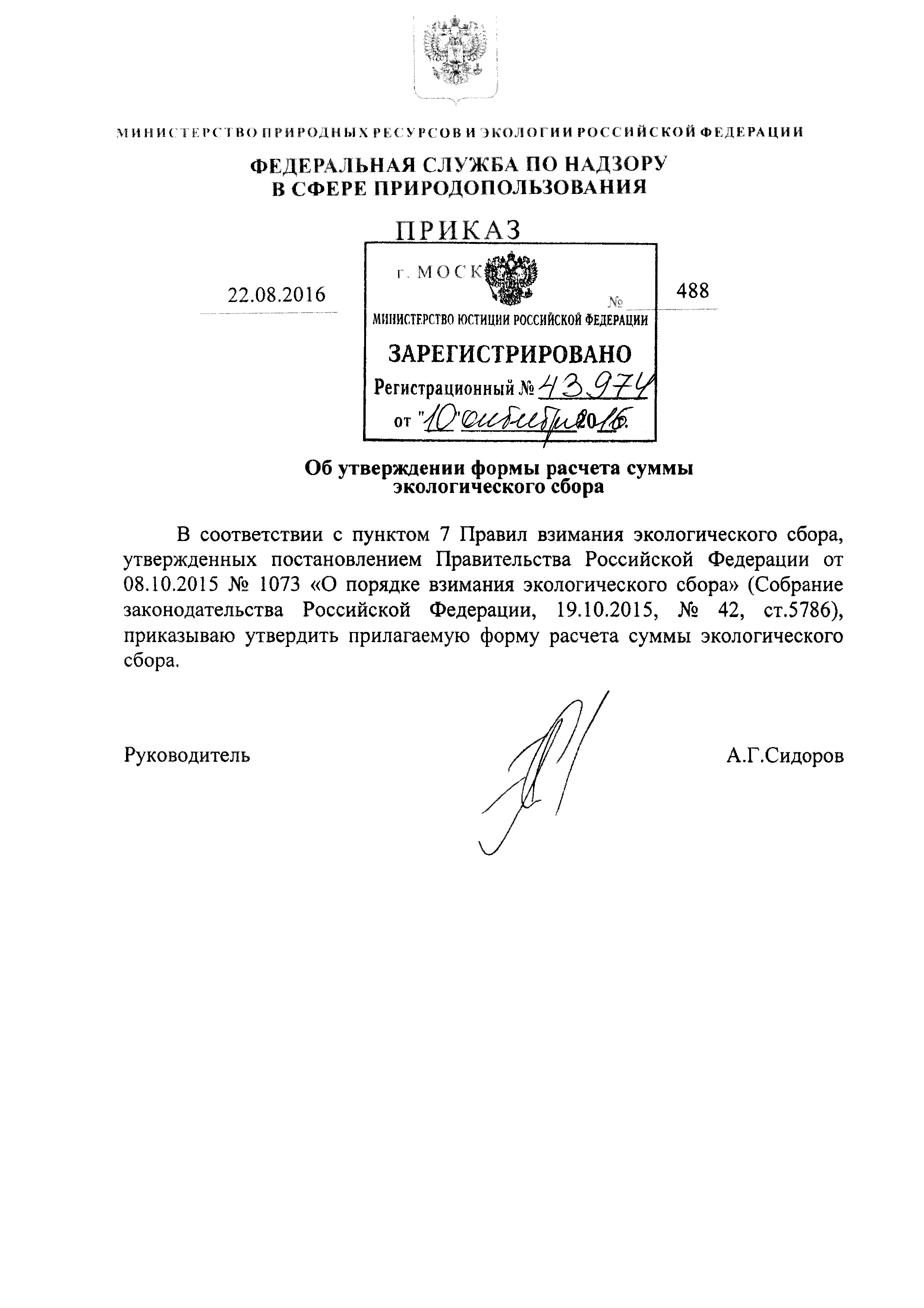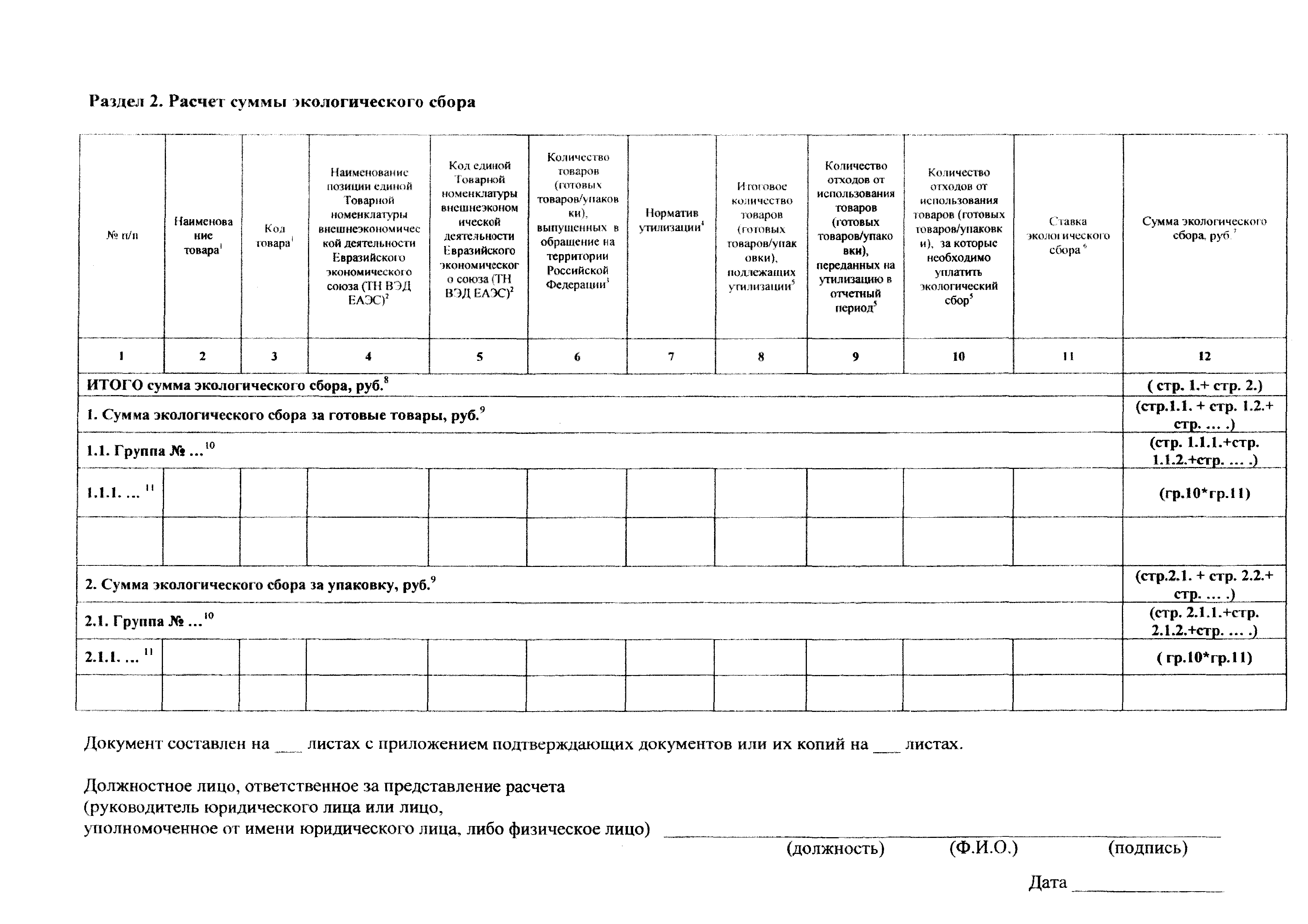 Форма расчета суммы экологического сбора| Статус: | действует | | Название рус.: | Форма расчета суммы экологического сбора | | Дата добавления в базу: | 01.02.2017 | | Дата актуализации: | 01.01.2021 | | Дата введения: | 22.10.2016 | | Оглавление: | Раздел 1. Общие сведения о производителе, импортере готовых товаров, в том числе упаковки таких товаров Раздел 2. Расчет суммы экологического сбора | | Утверждён: | 22.08.2016 Федеральная служба по надзору в сфере природопользования (488)