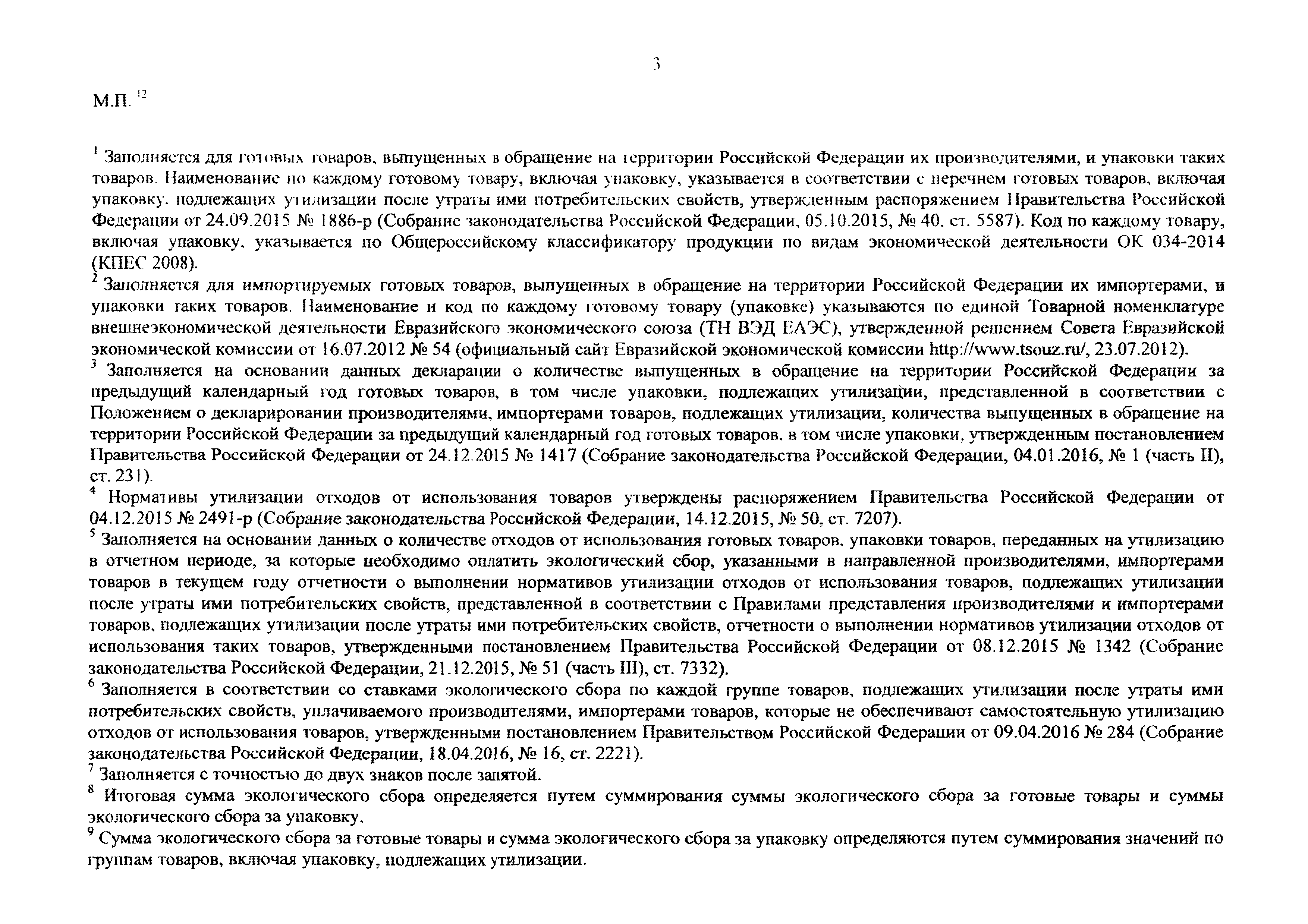 | | Нормативные ссылки: |   «Перечень готовых товаров, включая упаковку, подлежащих утилизации после утраты ими потребительских свойств»  Постановление 1073 «О порядке взимания экологического сбора»  «Нормативы утилизации отходов от использования товаров»  «Положение о декларировании производителями, импортерами товаров, подлежащих утилизации, количества выпущенных в обращение на территории Российской Федерации за предыдущий календарный год готовых товаров, в том числе упаковки»  «Ставки сбора по каждой группе товаров, группе упаковки товаров, отходы от использования которых подлежат утилизации, уплачиваемого производителями товаров, импортерами товаров, которые не обеспечивают самостоятельную утилизацию отходов от использования товаров (экологического сбора)»