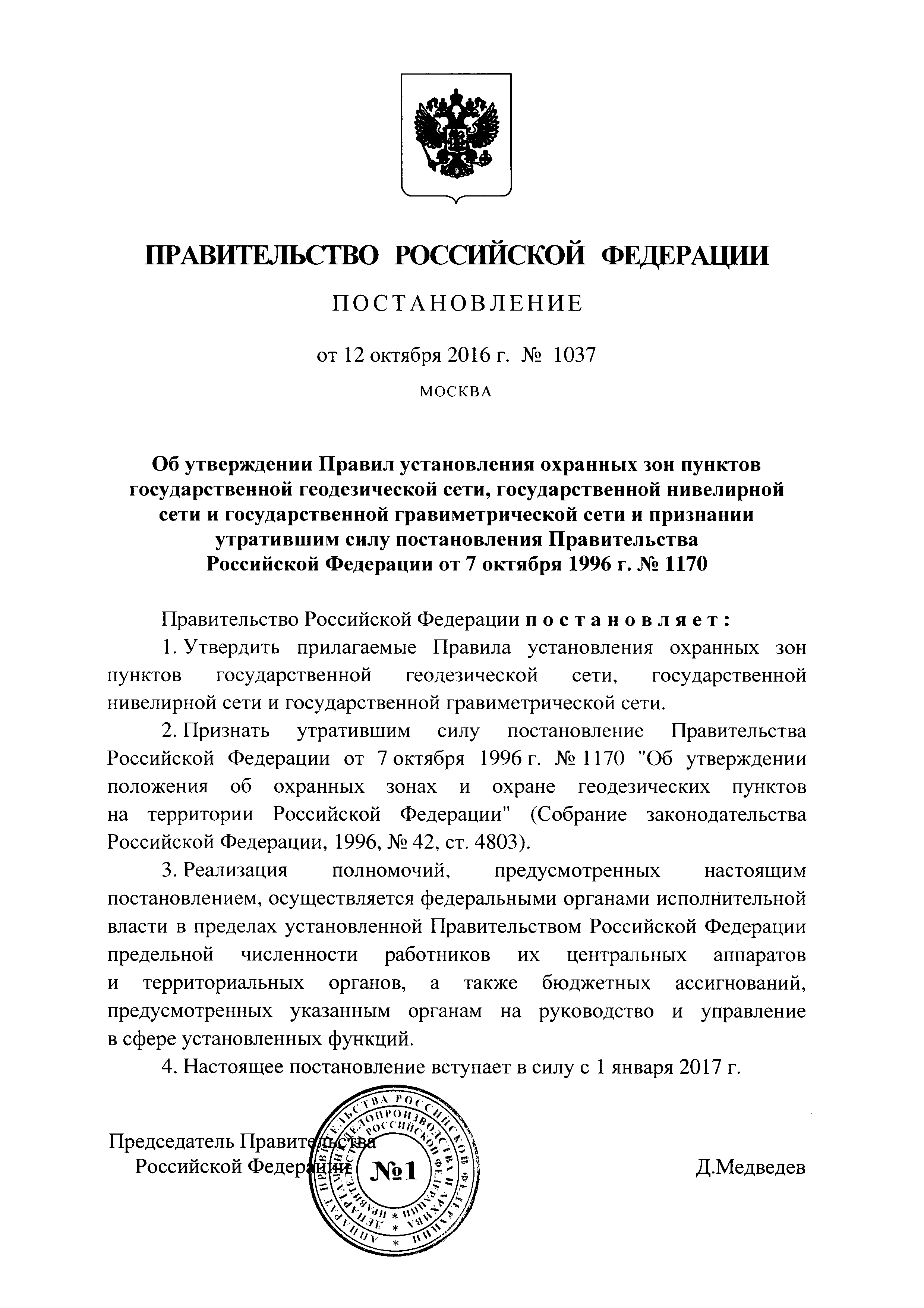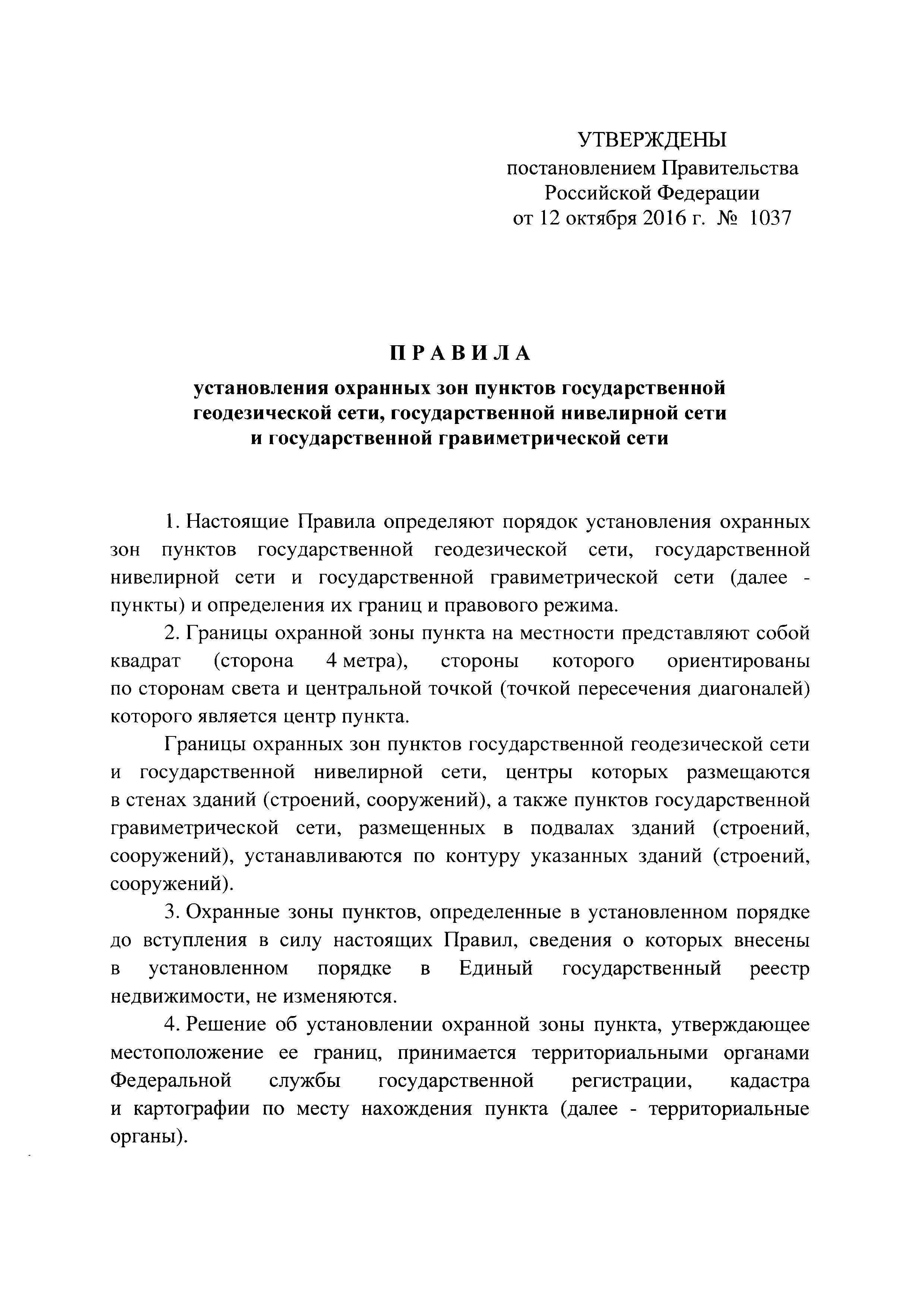 Правила установления охранных зон пунктов государственной геодезической сети, государственной нивелирной сети и государственной гравиметрической сети| Статус: | утратил силу | | Название рус.: | Правила установления охранных зон пунктов государственной геодезической сети, государственной нивелирной сети и государственной гравиметрической сети | | Дата добавления в базу: | 01.02.2017 | | Дата актуализации: | 01.01.2021 | | Дата введения: | 01.01.2017 | | Дата окончания срока действия: | 31.08.2019 | | Область применения: | Правила определяют порядок установления охранных зон пунктов государственной геодезической сети, государственной нивелирной сети и государственной гравиметрической сети и определения их границ и правового режима | | Утверждён: | 12.10.2016 Правительство Российской Федерации (1037)