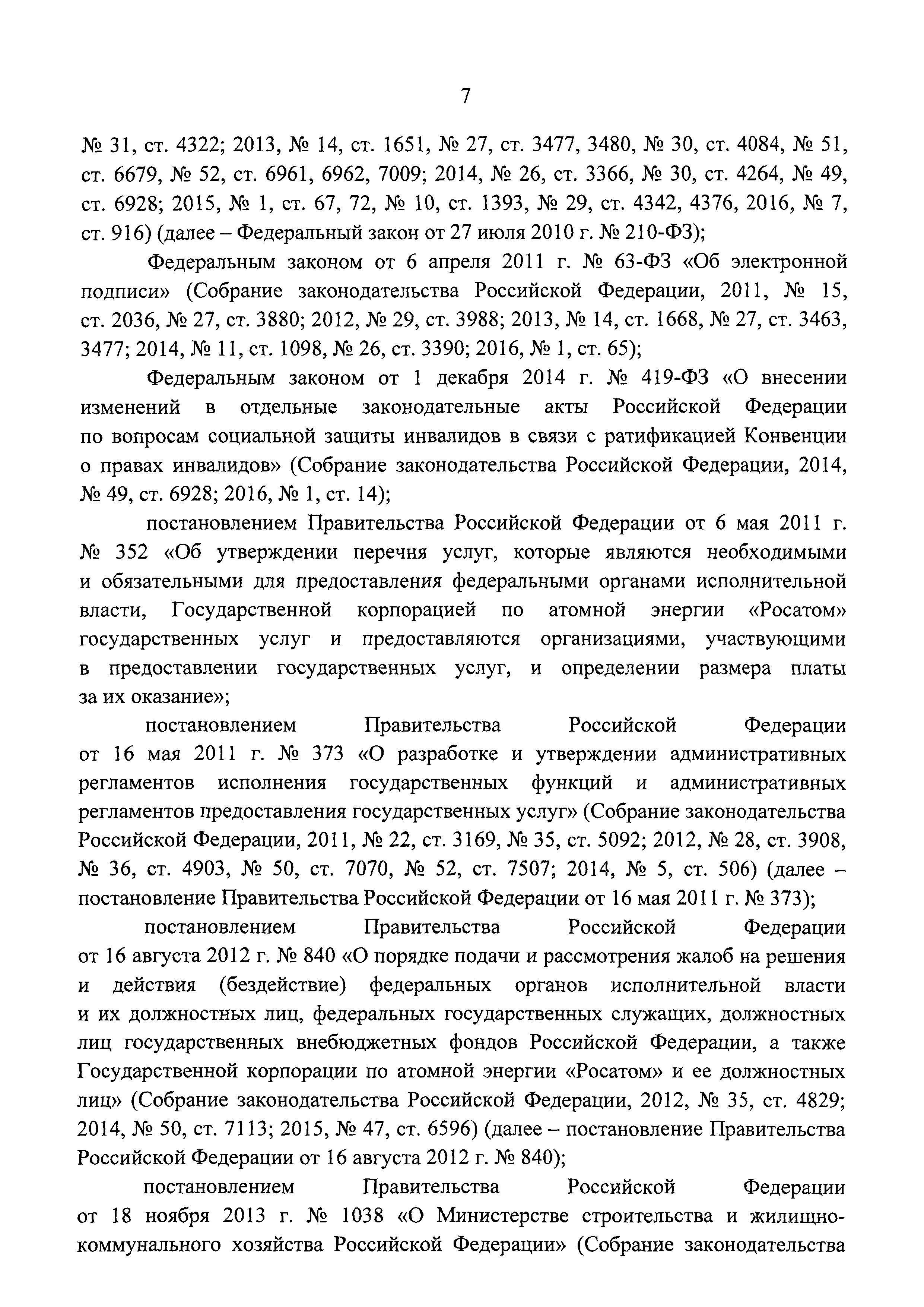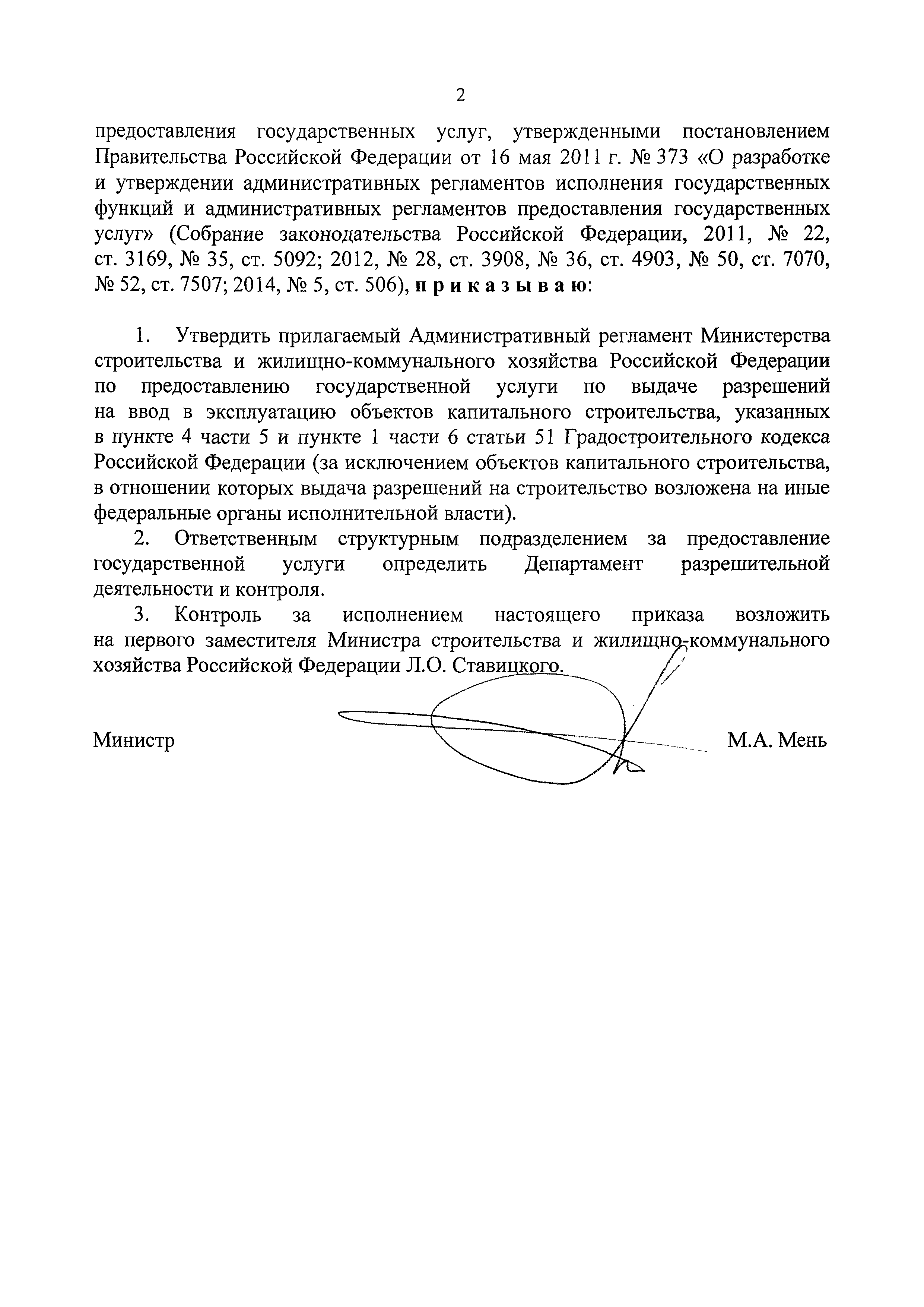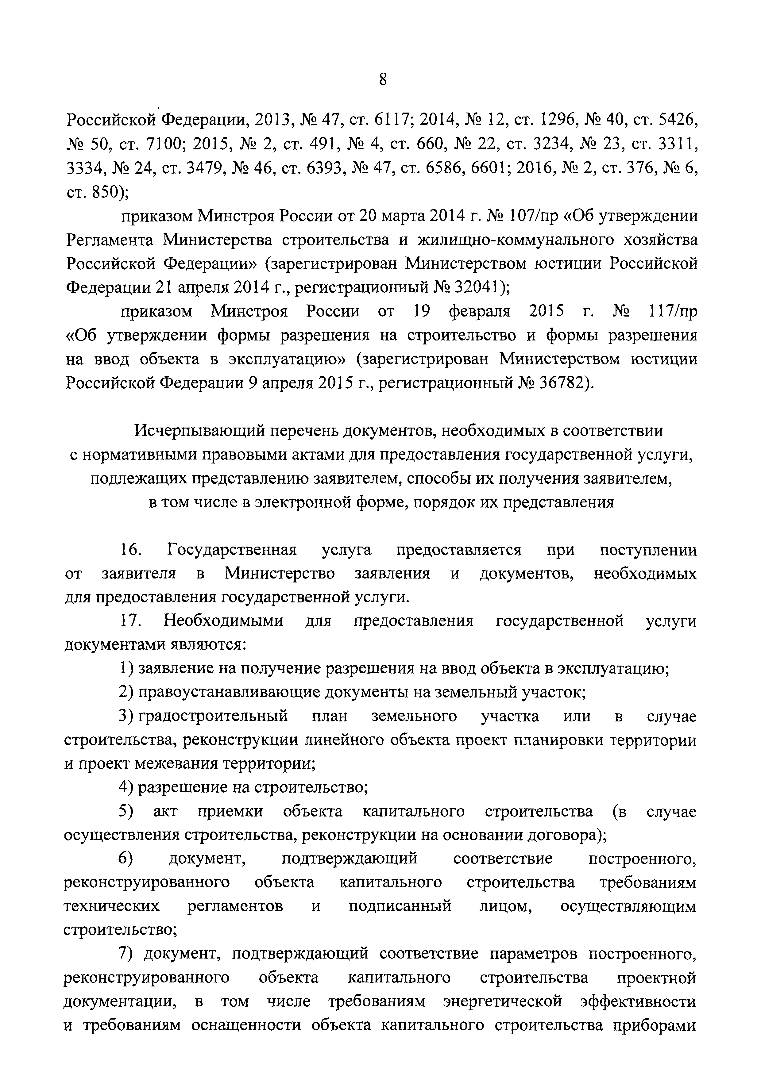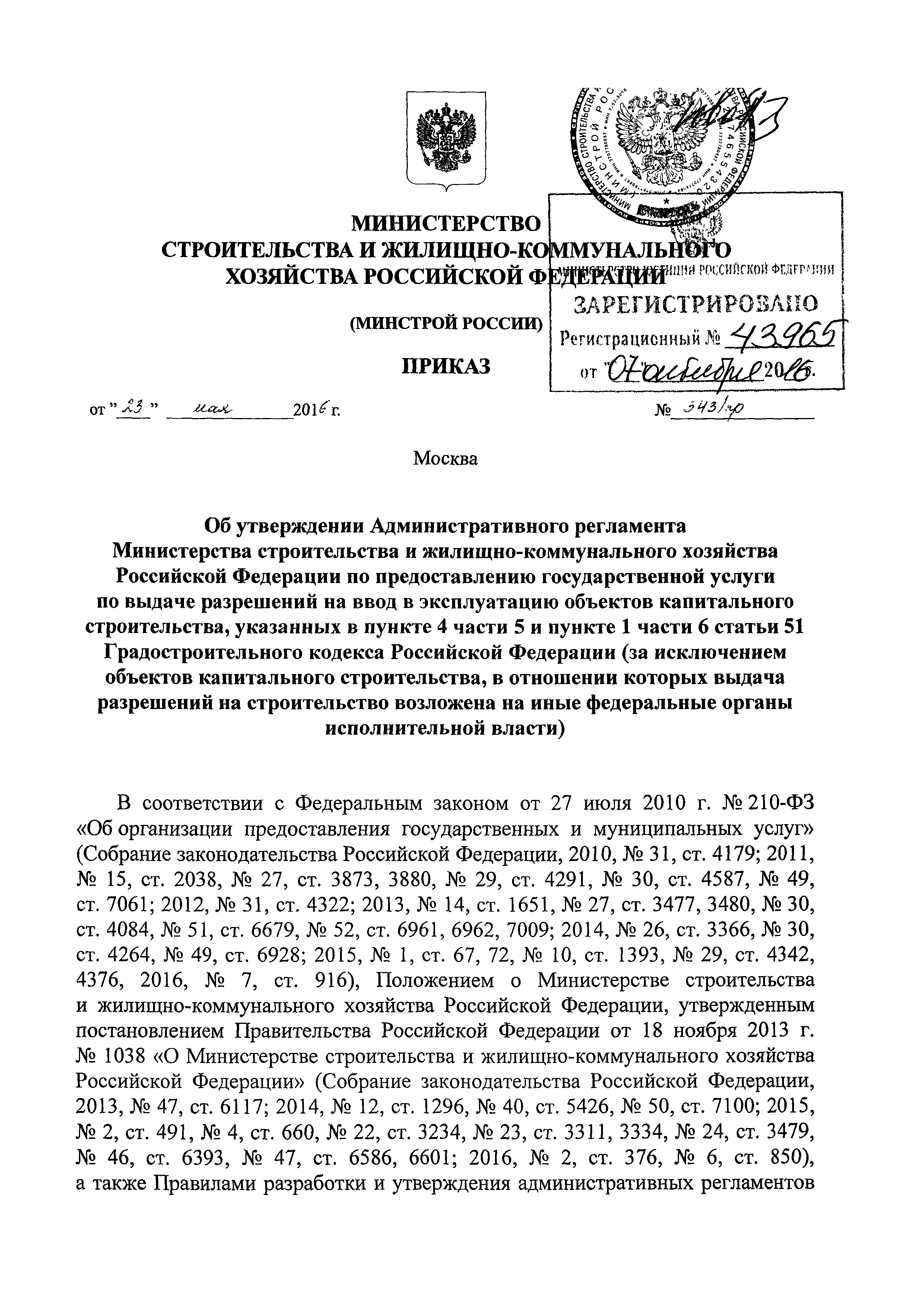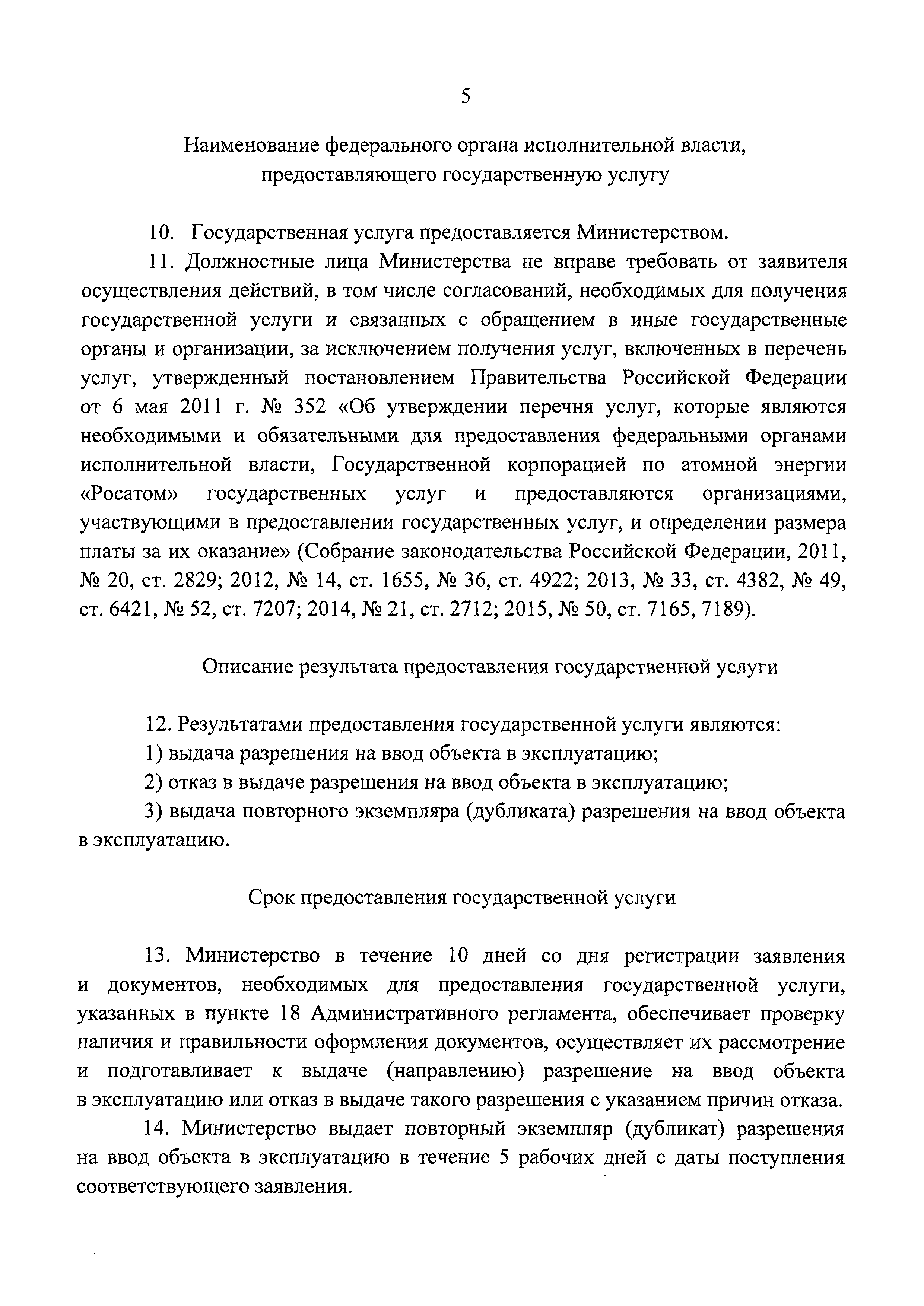 | Название рус.: | Административный регламент Министерства строительства и жилищно-коммунального хозяйства Российской Федерации по предоставлению государственной услуги по выдаче разрешений на ввод в эксплуатацию объектов капитального строительства, указанных в пункте 4 части 5 и пункте 1 части 6 статьи 51 Градостроительного кодекса Российской Федерации (за исключением объектов капитального строительства, в отношении которых выдача разрешений на строительство возложена на иные федеральные органы исполнительной власти) |