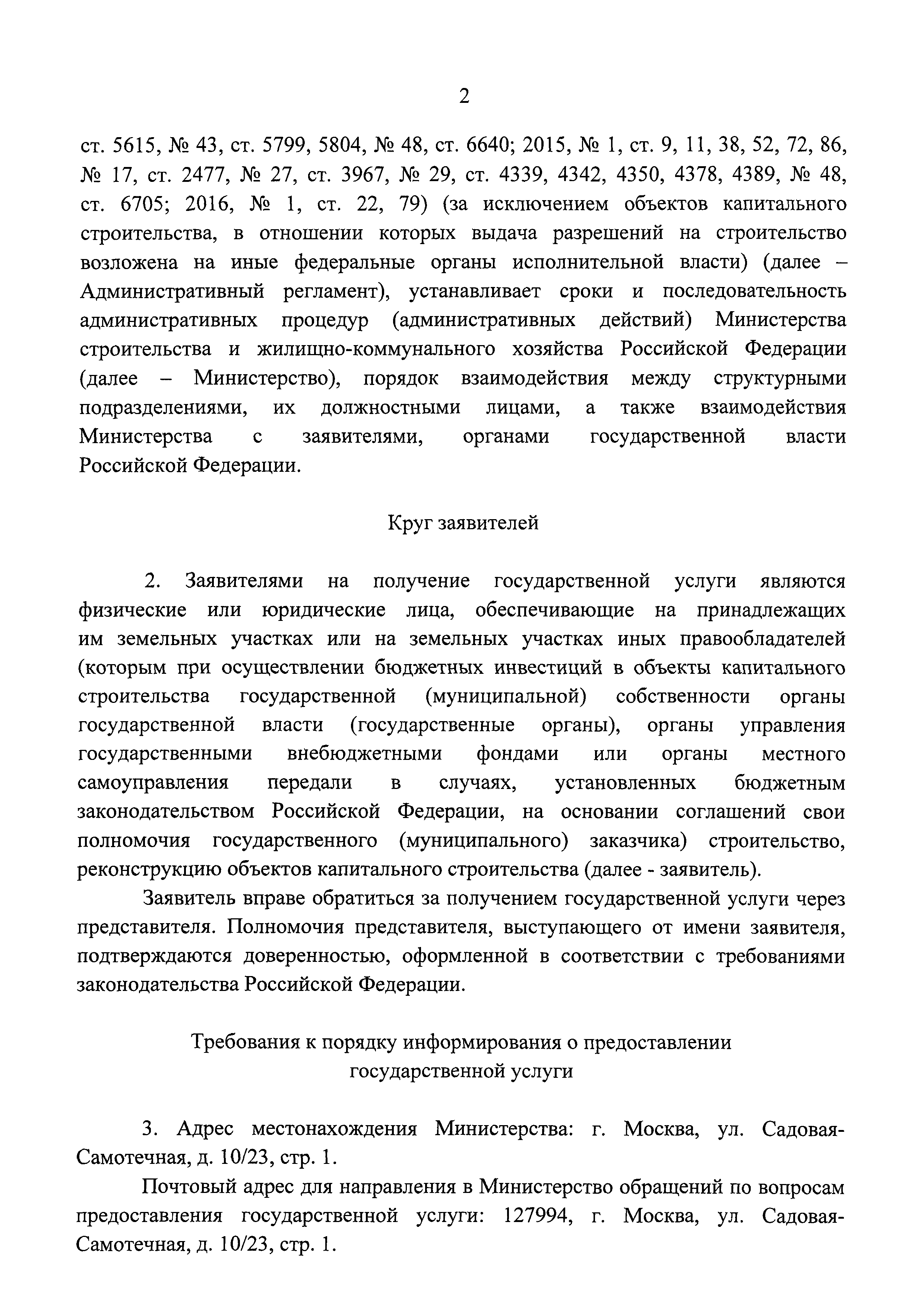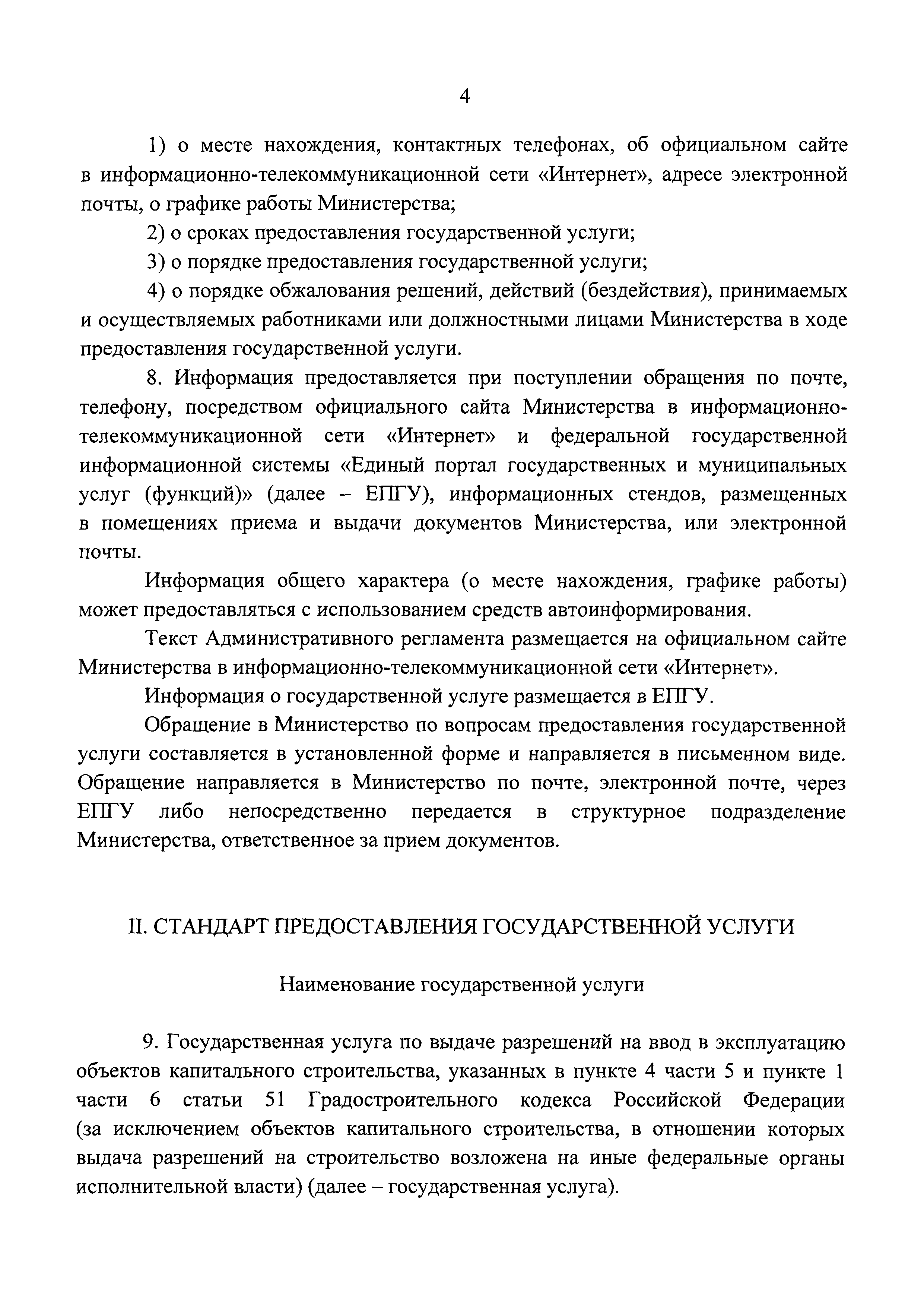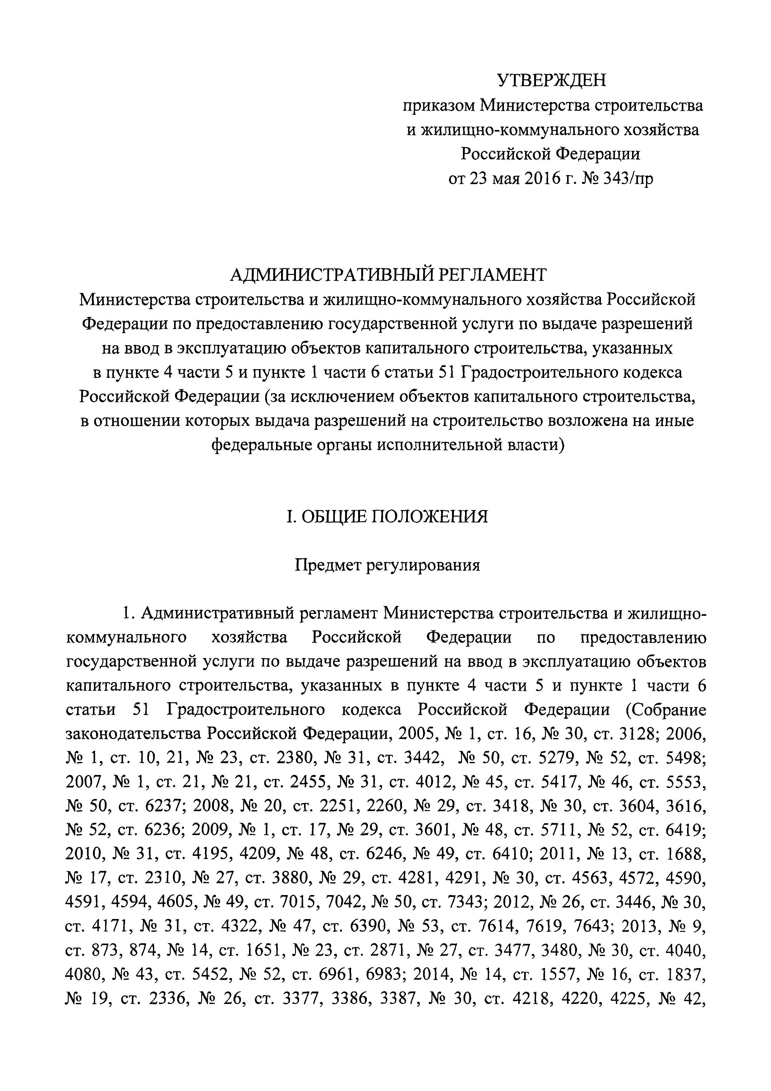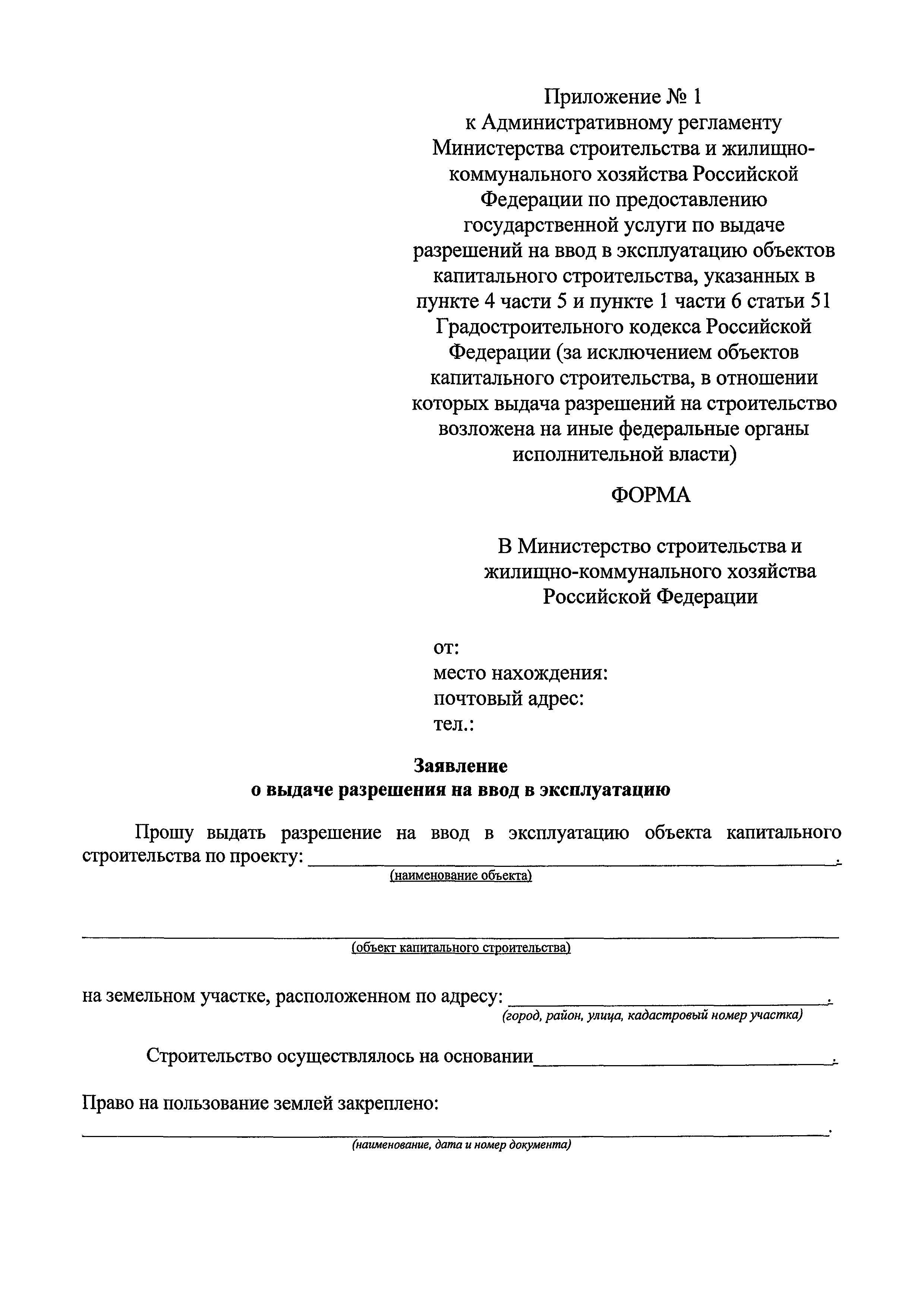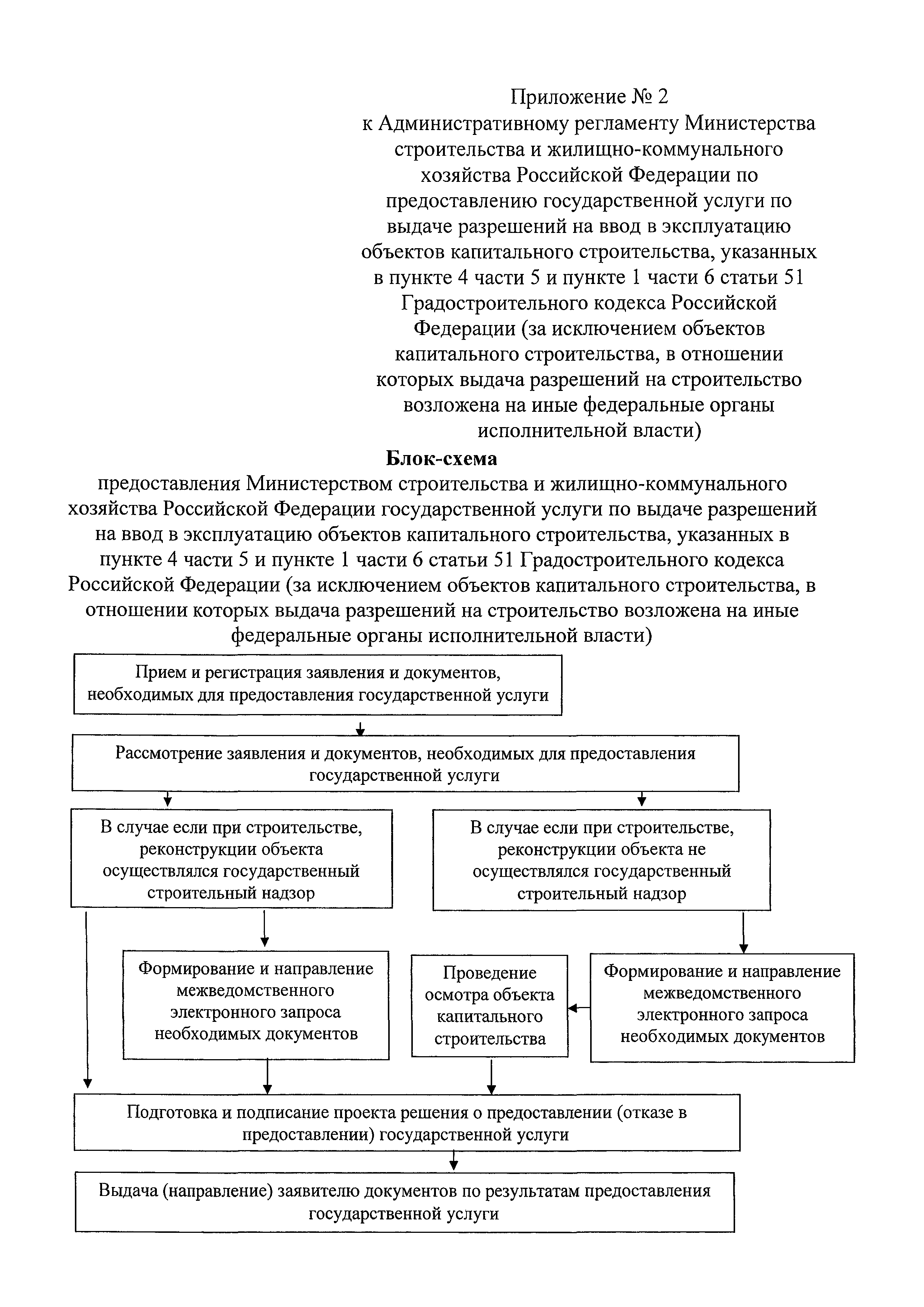 | Оглавление: | I. Общие положения II. Стандарт предоставления государственной услуги III. Состав, последовательность и сроки выполнения административных процедур, требования к порядку их выполнения, в том числе особенности выполнения административных процедур в электронной форме IV. Формы контроля за исполнением Административного регламента предоставления государственной услуги V. Досудебный (внесудебный) порядок обжалования решений и действий (бездействия) органа, предоставляющего государственную услугу, а также его должностных лиц Приложение № 1. Заявление о выдаче разрешения на ввод в эксплуатацию Приложение № 2. Блок-схема предоставления Министерством строительства и жилищно-коммунального хозяйства Российской Федерации государственной услуги по выдаче разрешений на ввод в эксплуатацию объектов капитального строительства, указанных в пункте 4 части 5 и пункте 1 части 6 статьи 51 Градостроительного кодекса Российской Федерации (за исключением объектов капитального строительства, в отношении которых выдача разрешений на строительство возложена на иные федеральные органы исполнительной власти) |