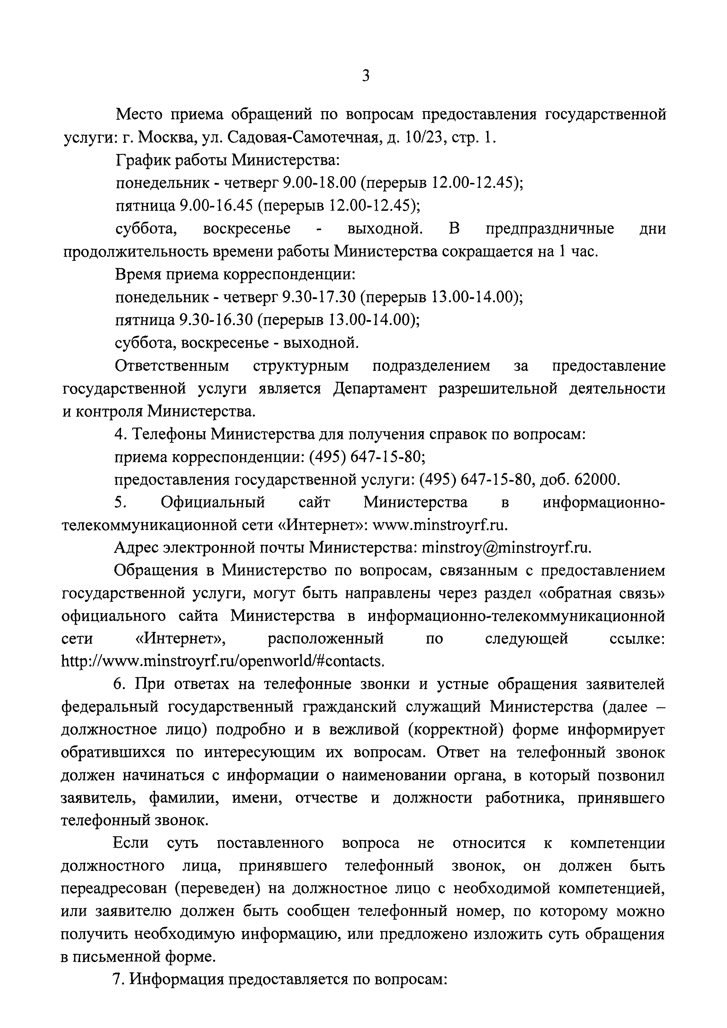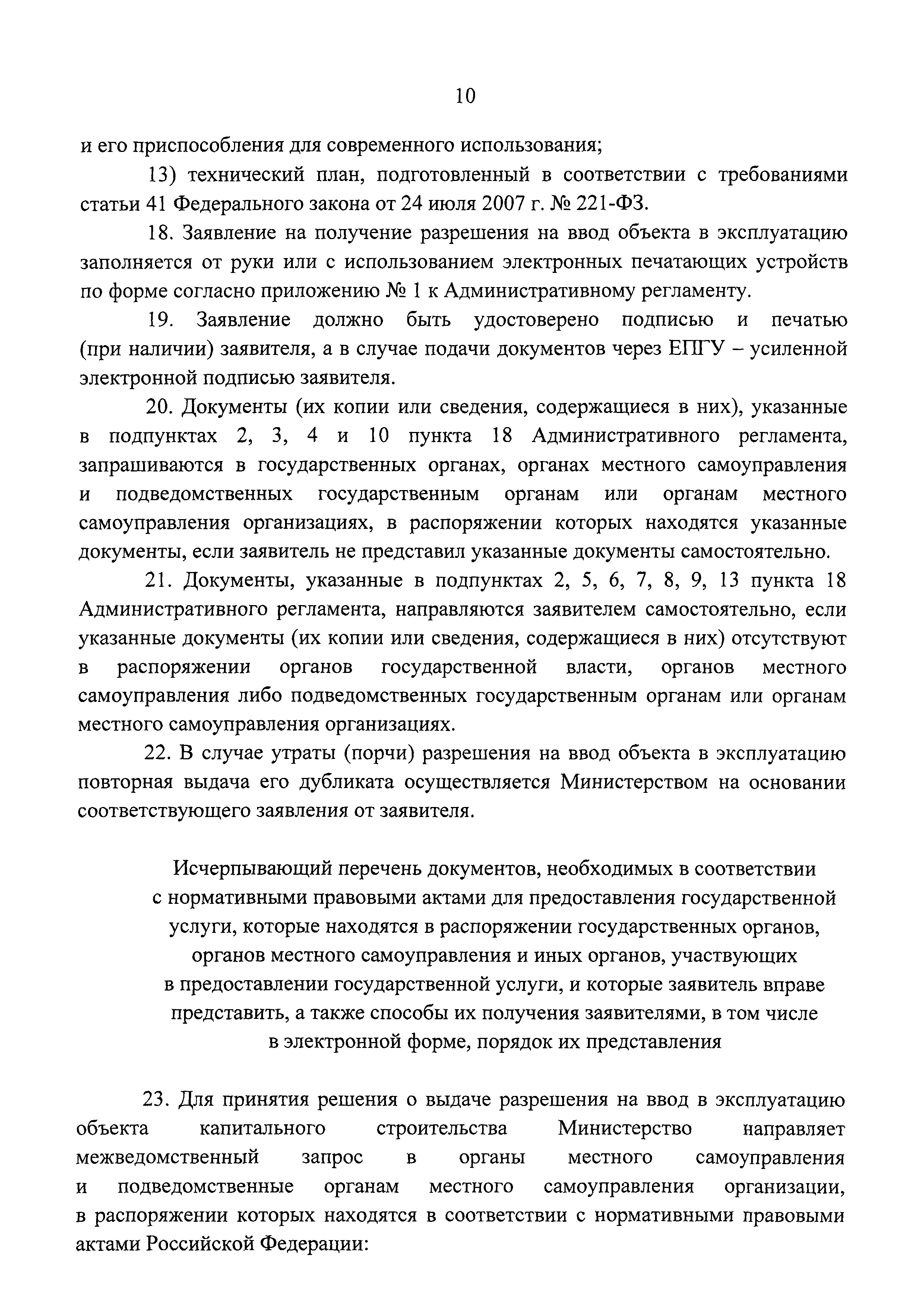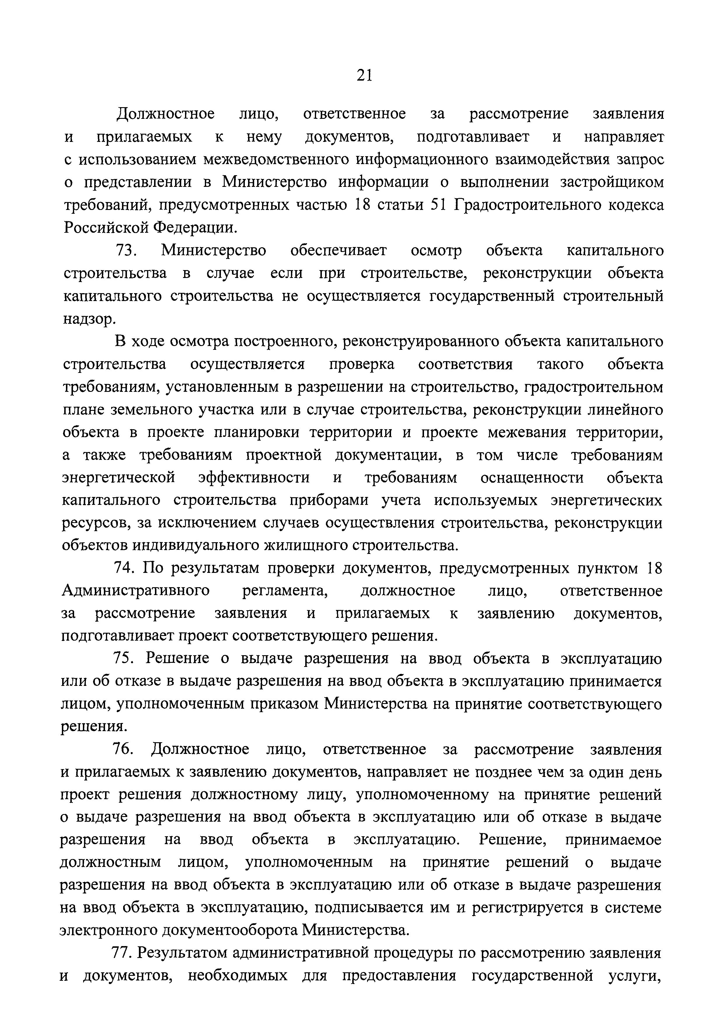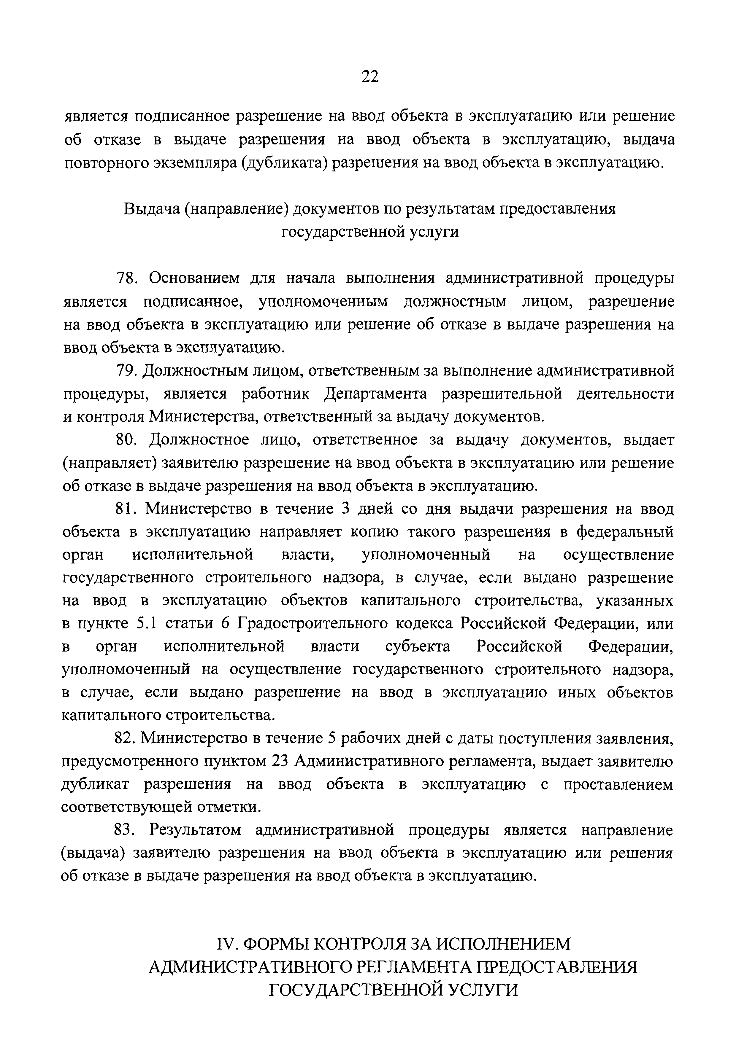 | Оглавление: | I. Общие положения II. Стандарт предоставления государственной услуги III. Состав, последовательность и сроки выполнения административных процедур, требования к порядку их выполнения, в том числе особенности выполнения административных процедур в электронной форме IV. Формы контроля за исполнением Административного регламента предоставления государственной услуги V. Досудебный (внесудебный) порядок обжалования решений и действий (бездействия) органа, предоставляющего государственную услугу, а также его должностных лиц Приложение № 1. Заявление о выдаче разрешения на ввод в эксплуатацию Приложение № 2. Блок-схема предоставления Министерством строительства и жилищно-коммунального хозяйства Российской Федерации государственной услуги по выдаче разрешений на ввод в эксплуатацию объектов капитального строительства, указанных в пункте 4 части 5 и пункте 1 части 6 статьи 51 Градостроительного кодекса Российской Федерации (за исключением объектов капитального строительства, в отношении которых выдача разрешений на строительство возложена на иные федеральные органы исполнительной власти) |