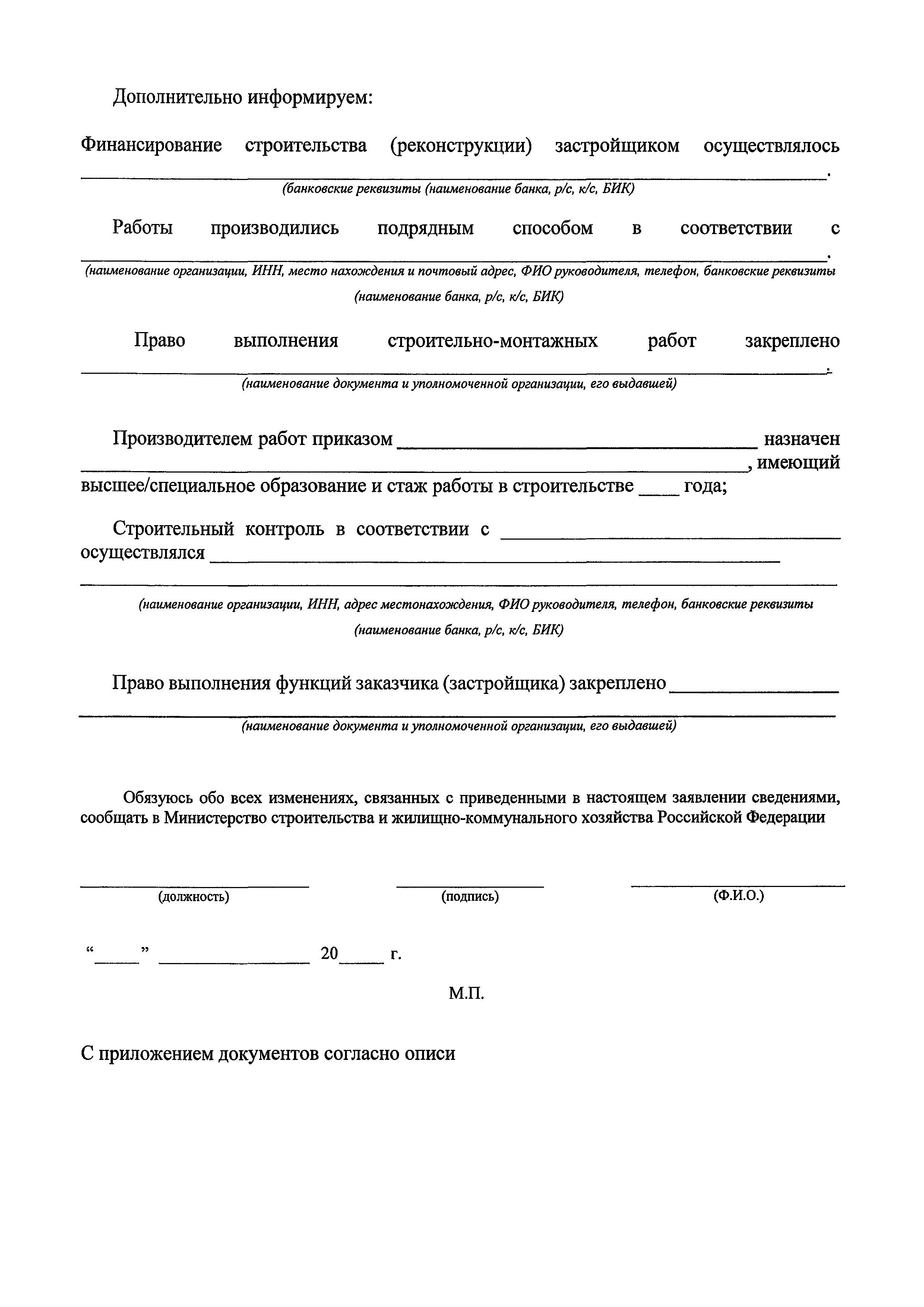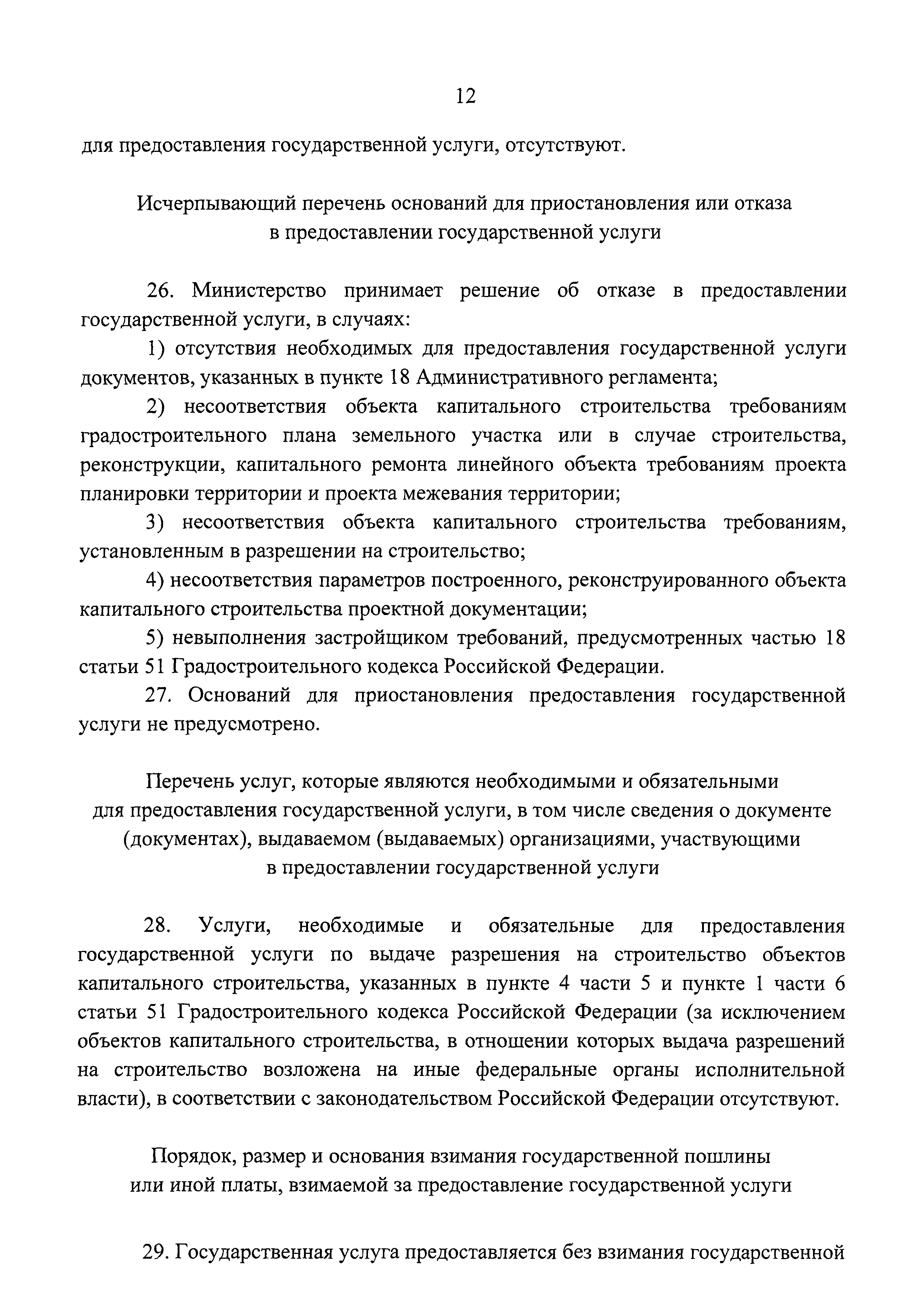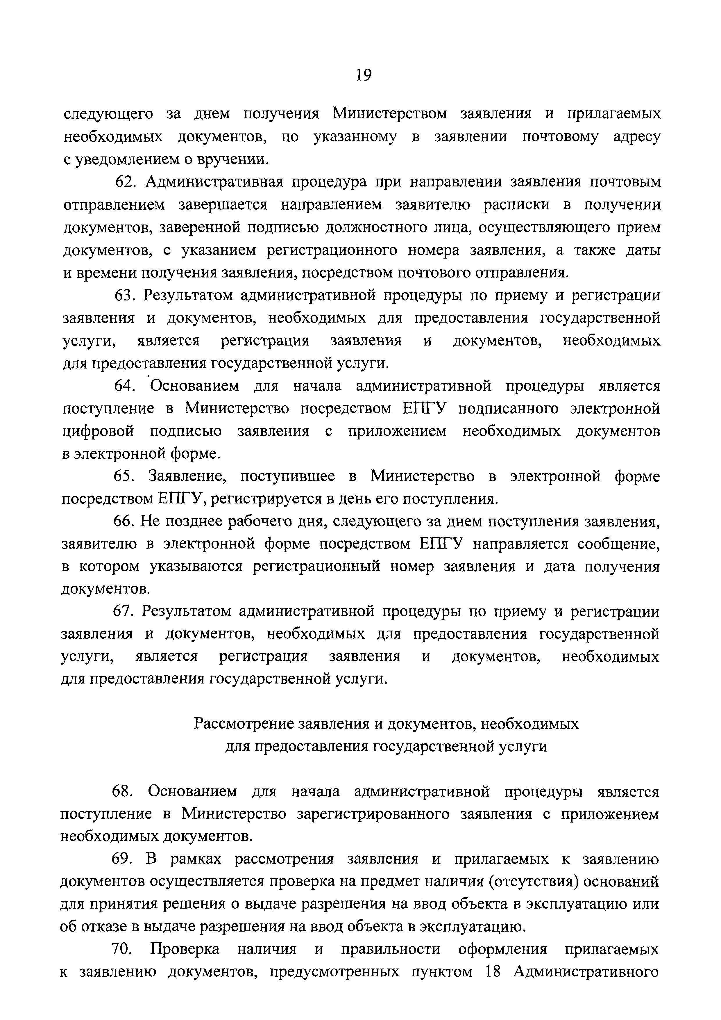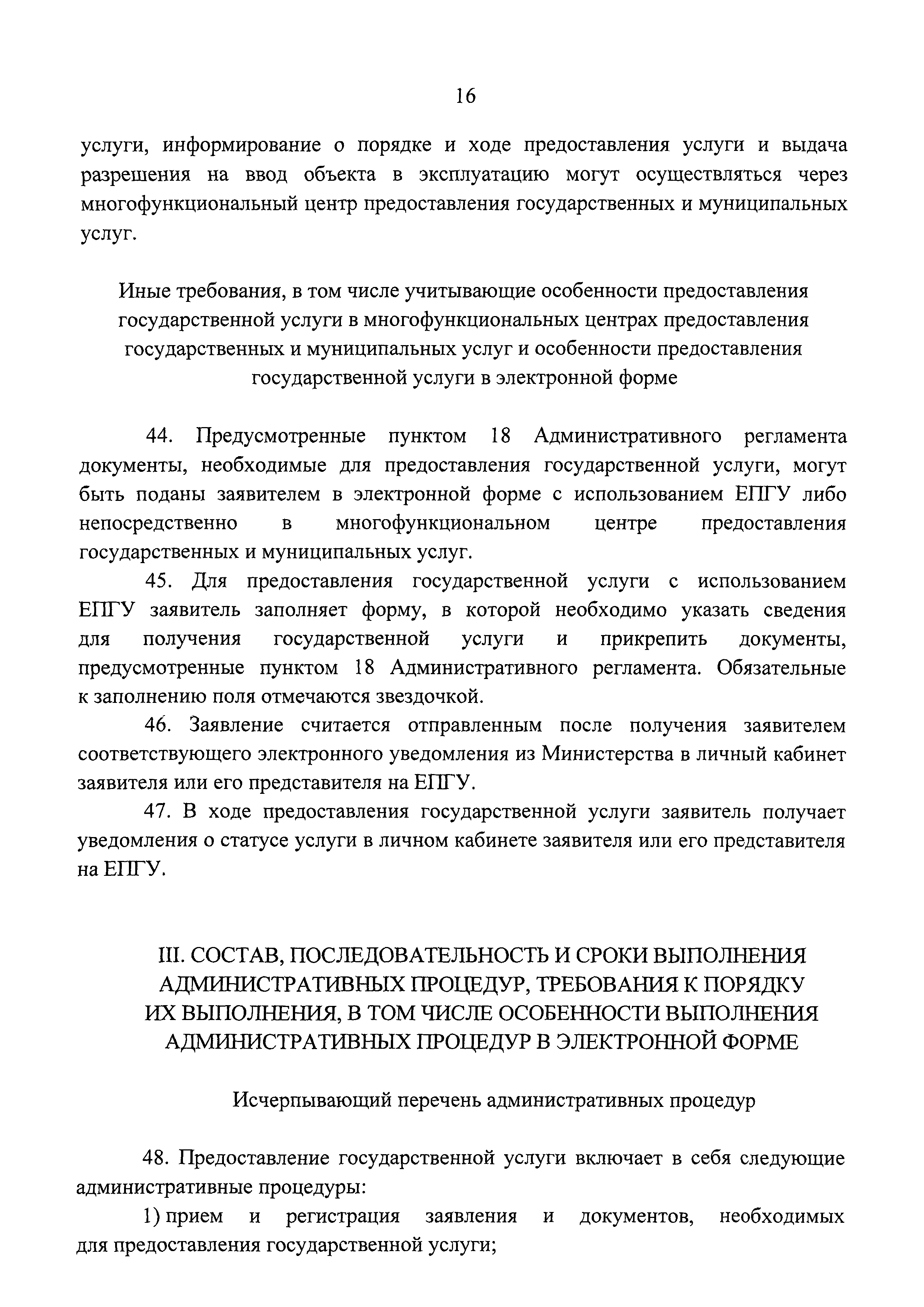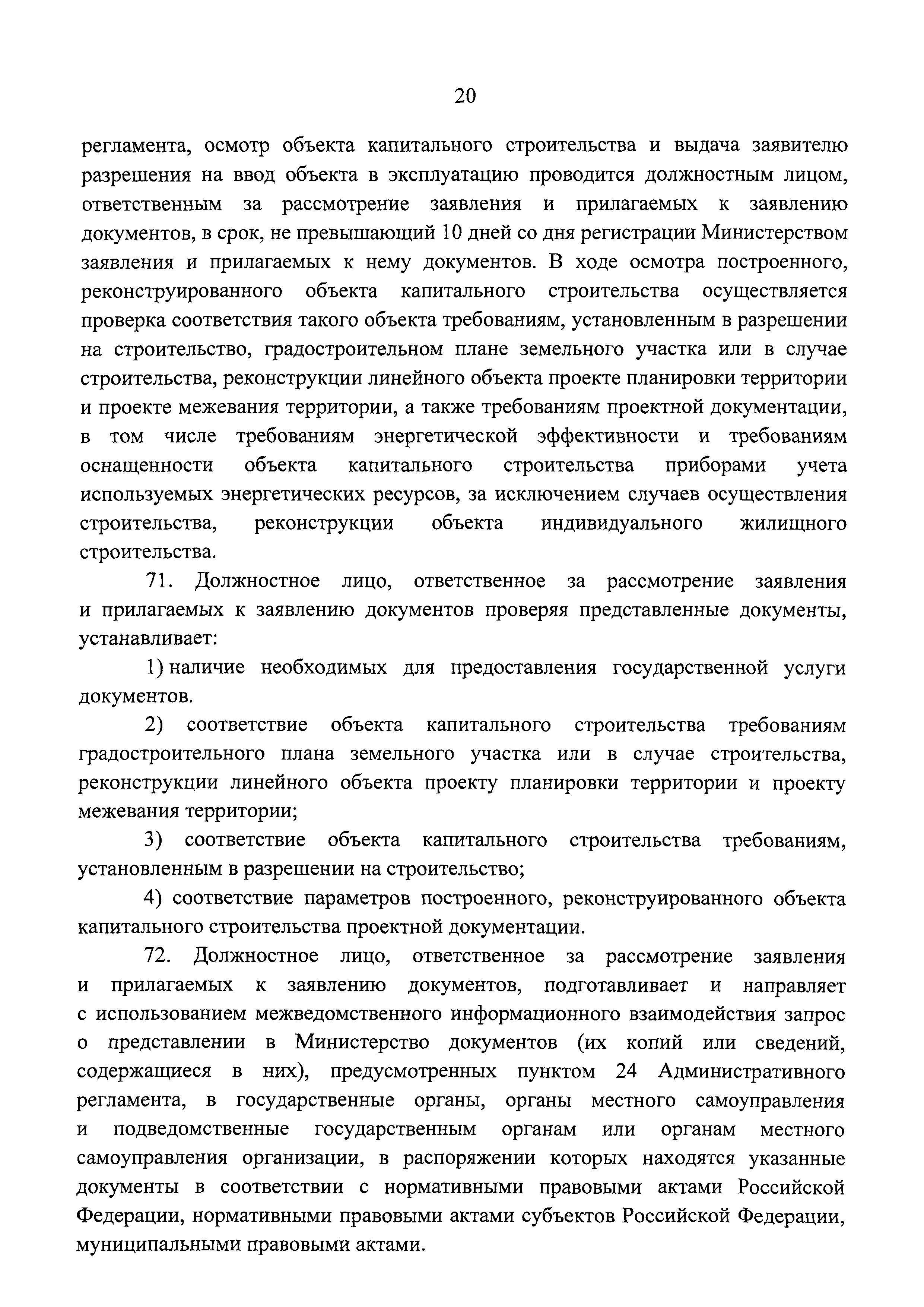 | Оглавление: | I. Общие положения II. Стандарт предоставления государственной услуги III. Состав, последовательность и сроки выполнения административных процедур, требования к порядку их выполнения, в том числе особенности выполнения административных процедур в электронной форме IV. Формы контроля за исполнением Административного регламента предоставления государственной услуги V. Досудебный (внесудебный) порядок обжалования решений и действий (бездействия) органа, предоставляющего государственную услугу, а также его должностных лиц Приложение № 1. Заявление о выдаче разрешения на ввод в эксплуатацию Приложение № 2. Блок-схема предоставления Министерством строительства и жилищно-коммунального хозяйства Российской Федерации государственной услуги по выдаче разрешений на ввод в эксплуатацию объектов капитального строительства, указанных в пункте 4 части 5 и пункте 1 части 6 статьи 51 Градостроительного кодекса Российской Федерации (за исключением объектов капитального строительства, в отношении которых выдача разрешений на строительство возложена на иные федеральные органы исполнительной власти) |