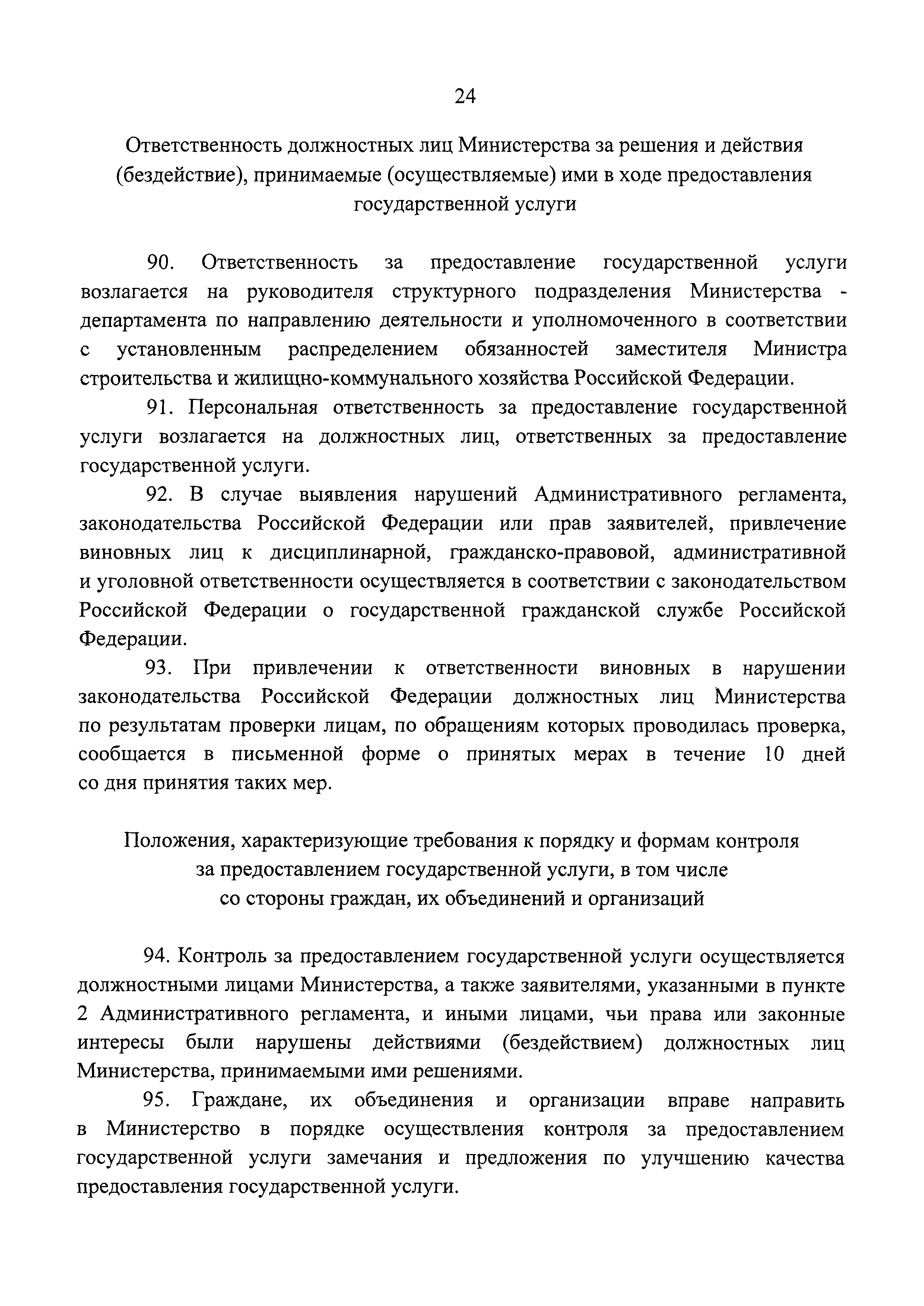 | Область применения: | Административный регламент устанавливает сроки и последовательность административных процедур (административных действий) Министерства строительства и жилищно-коммунального хозяйства Российской Федерации, порядок взаимодействия между структурными подразделениями, их должностными лицами, а также взаимодействия Министерства с заявителями, органами государственной власти Российской Федерации |