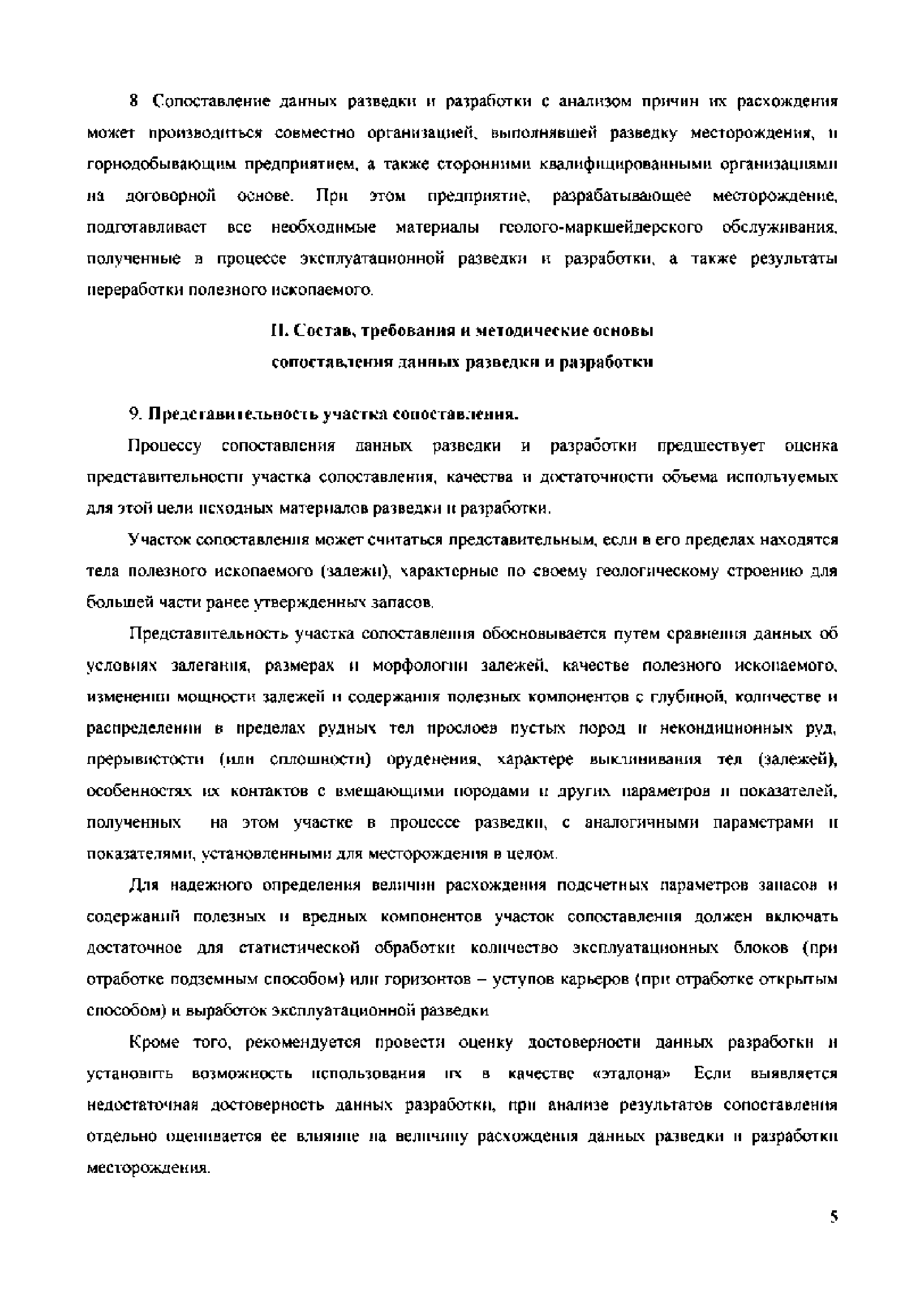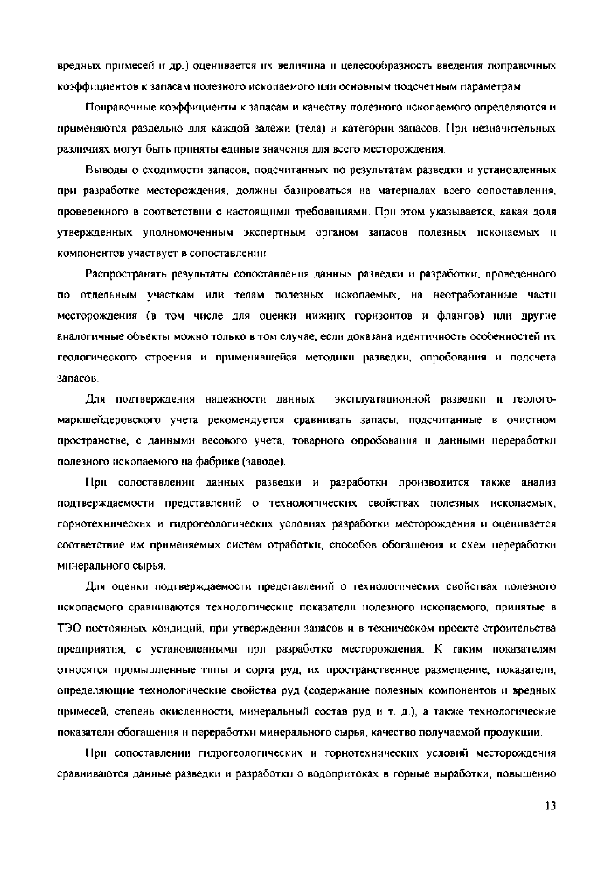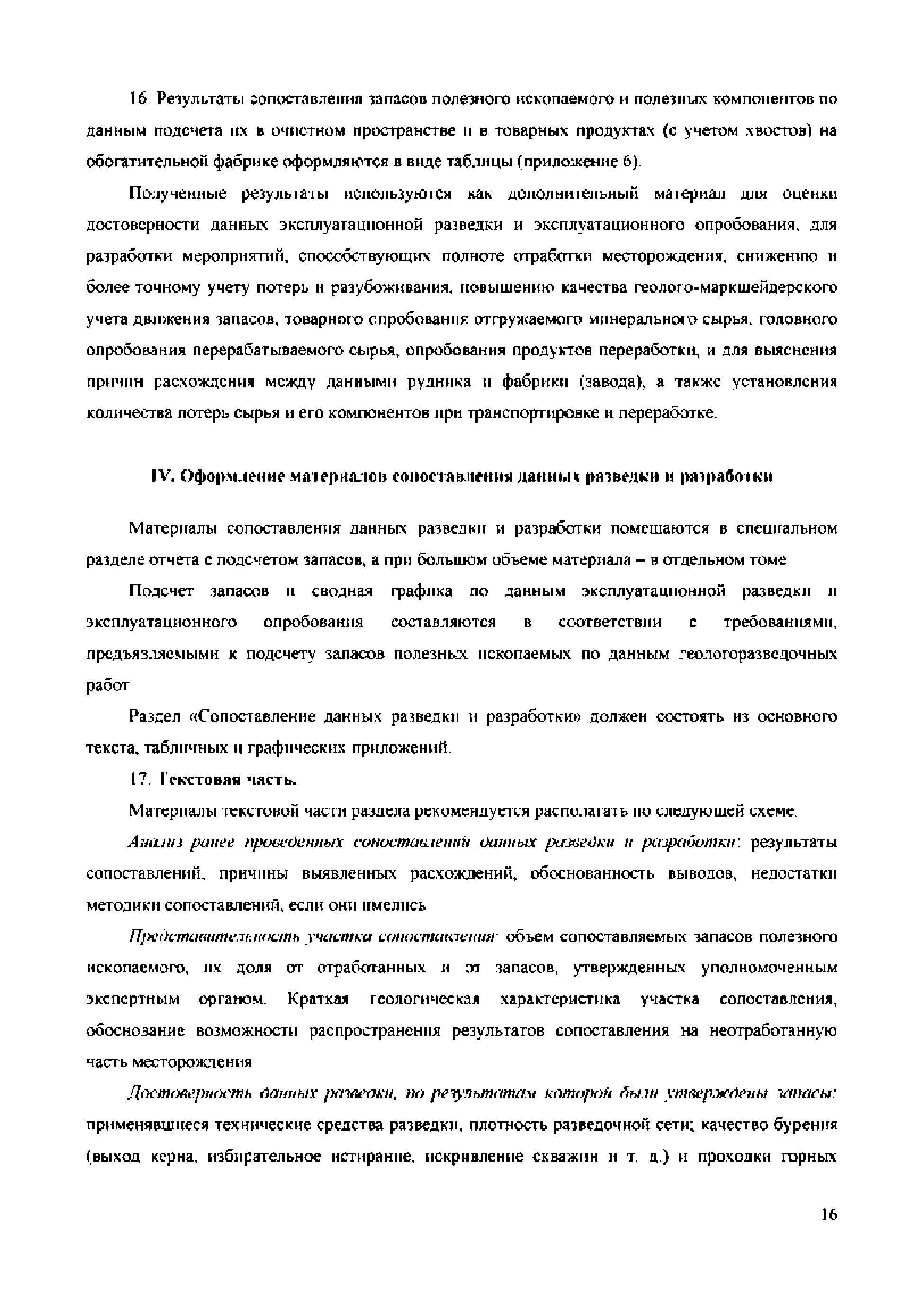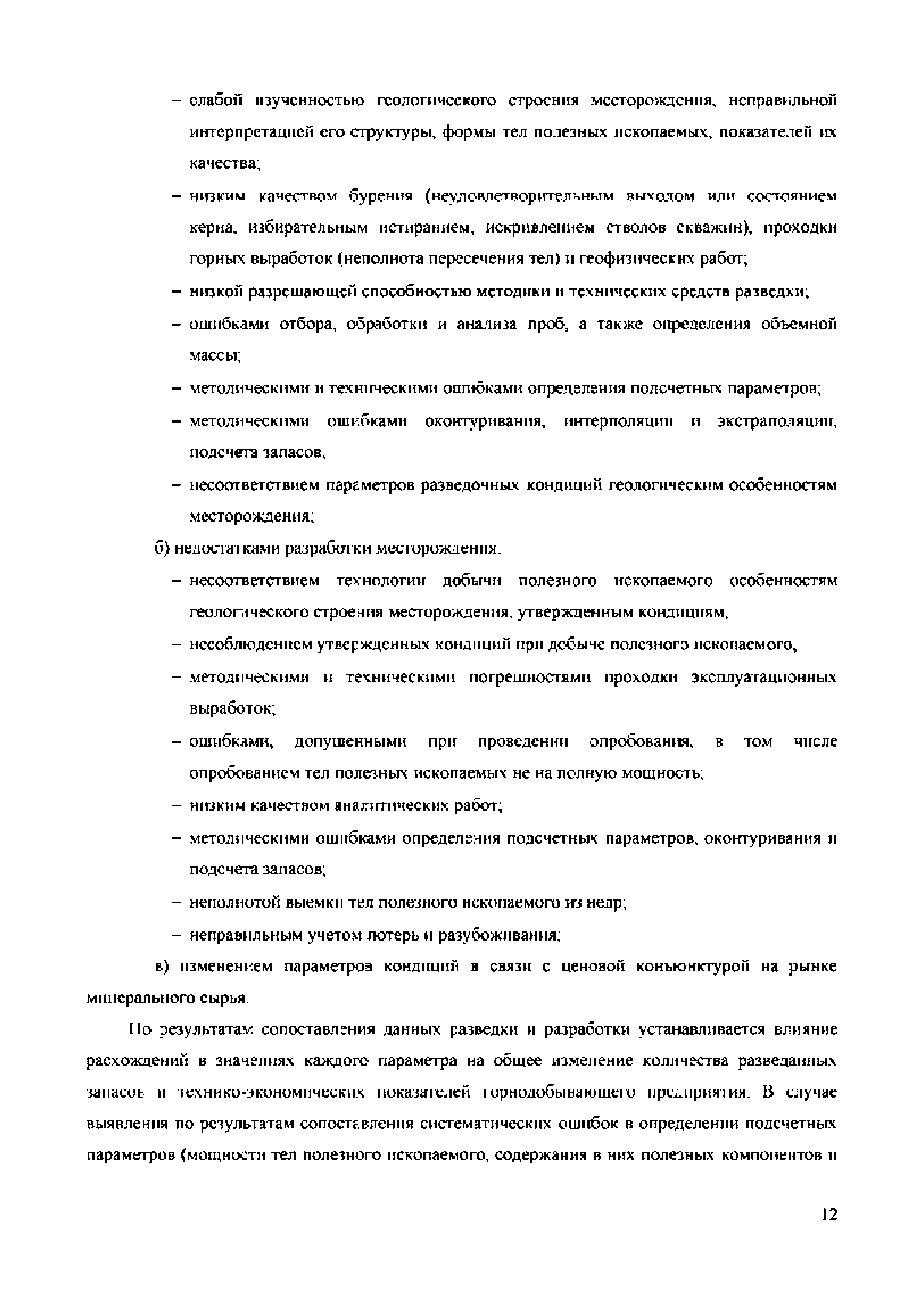 Методические рекомендации по сопоставлению данных разведки и разработки месторождений твердых полезных ископаемых| Статус: | действует | | Название рус.: | Методические рекомендации по сопоставлению данных разведки и разработки месторождений твердых полезных ископаемых | | Дата добавления в базу: | 01.02.2017 | | Дата актуализации: | 01.01.2021 | | Область применения: | Документ предназначен для работников предприятий и организаций, осуществляющих свою деятельность в сфере недропользования, независимо от их ведомственной принадлежности и форм собственности | | Оглавление: | I Общие положения II Состав, требования и методические основы сопоставления данных разведки и разработки III Сопоставление запасов, подсчитанных в очистном пространстве, с данными товарного опробования руды и данными переработки IV Оформление материалов сопоставления данных разведки и разработки V Требования к сопоставлению данных разведки и разработки отдельных участков месторождения, обработка которых производилась с использованием эксплуатационных кондиций Приложение 1. Сопоставление запасов полезного ископаемого и его качества по данным разведки и разработки Приложение 2. Сопоставление подсчетных параметров полезного ископаемого Приложение 3. Сводный баланс запасов полезного ископаемого и полезных компонентов Приложение 4. Баланс запасов по блокам, отдельным телам полезного ископаемого и в целом по месторождению Приложение 5. Сводная таблица балансовых запасов на месторождении (шахтном поле) Приложение 6. Сравнение данных добычи и переработки полезного ископаемого Приложение 7. Сопоставление основных показателей обработки месторождения в пределах выемочной единицы (блоками) | | Разработан: | ФГУ ГКЗ