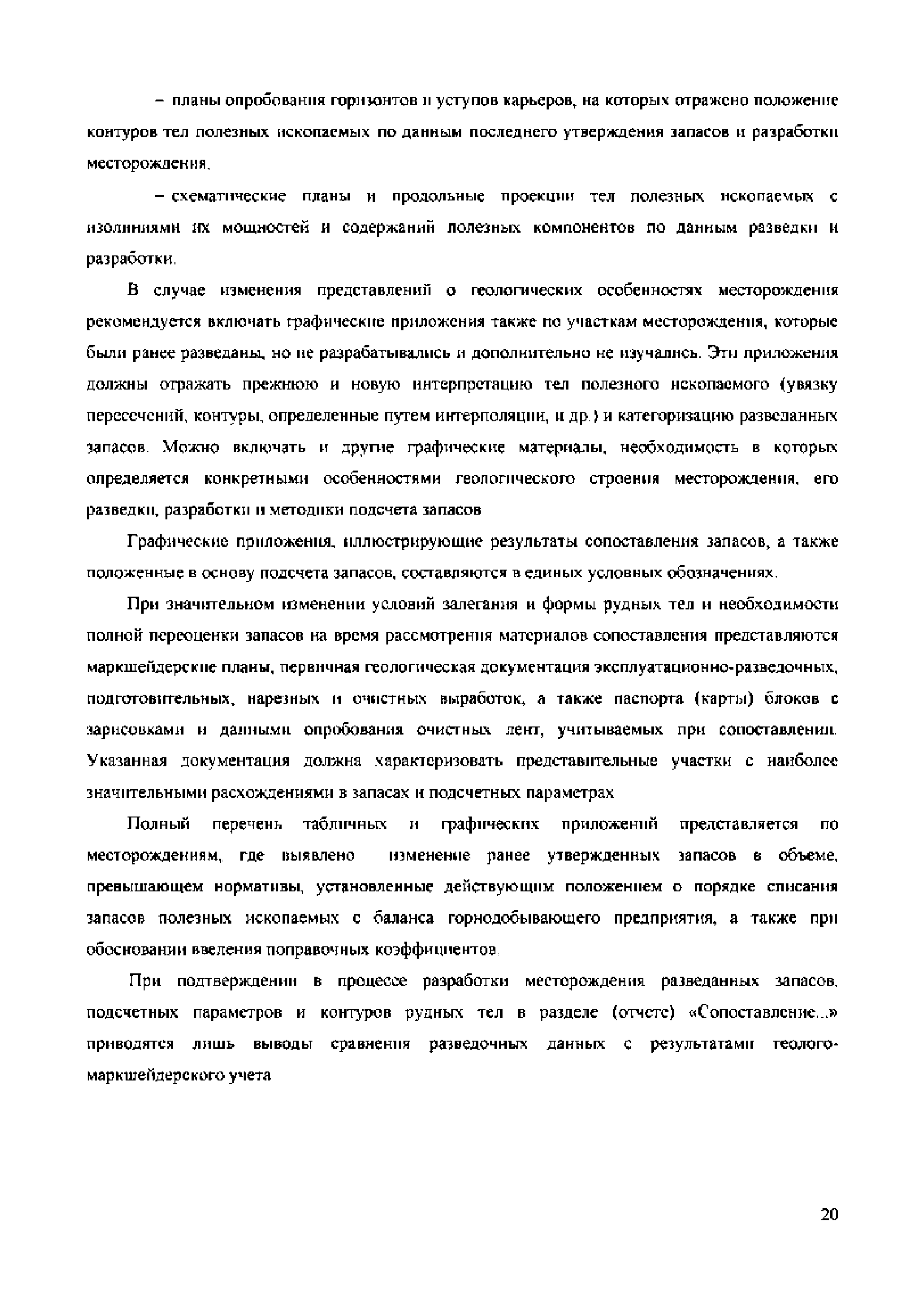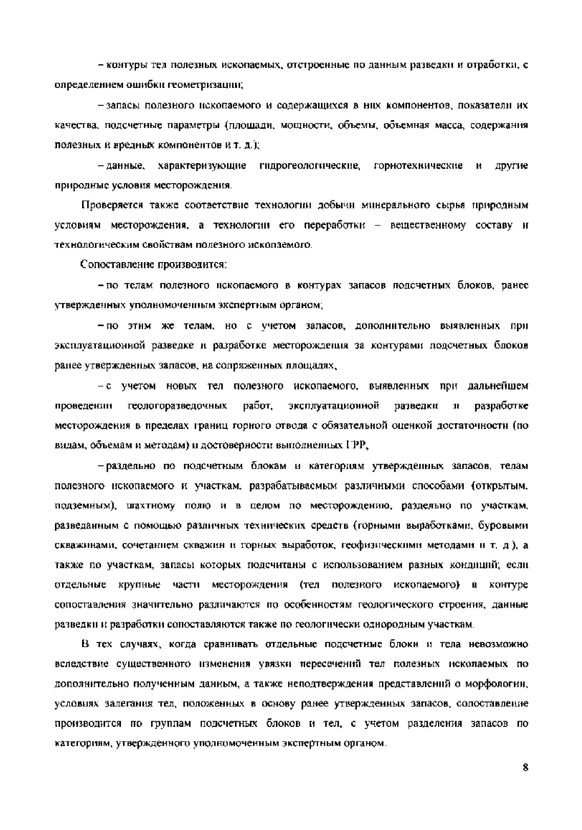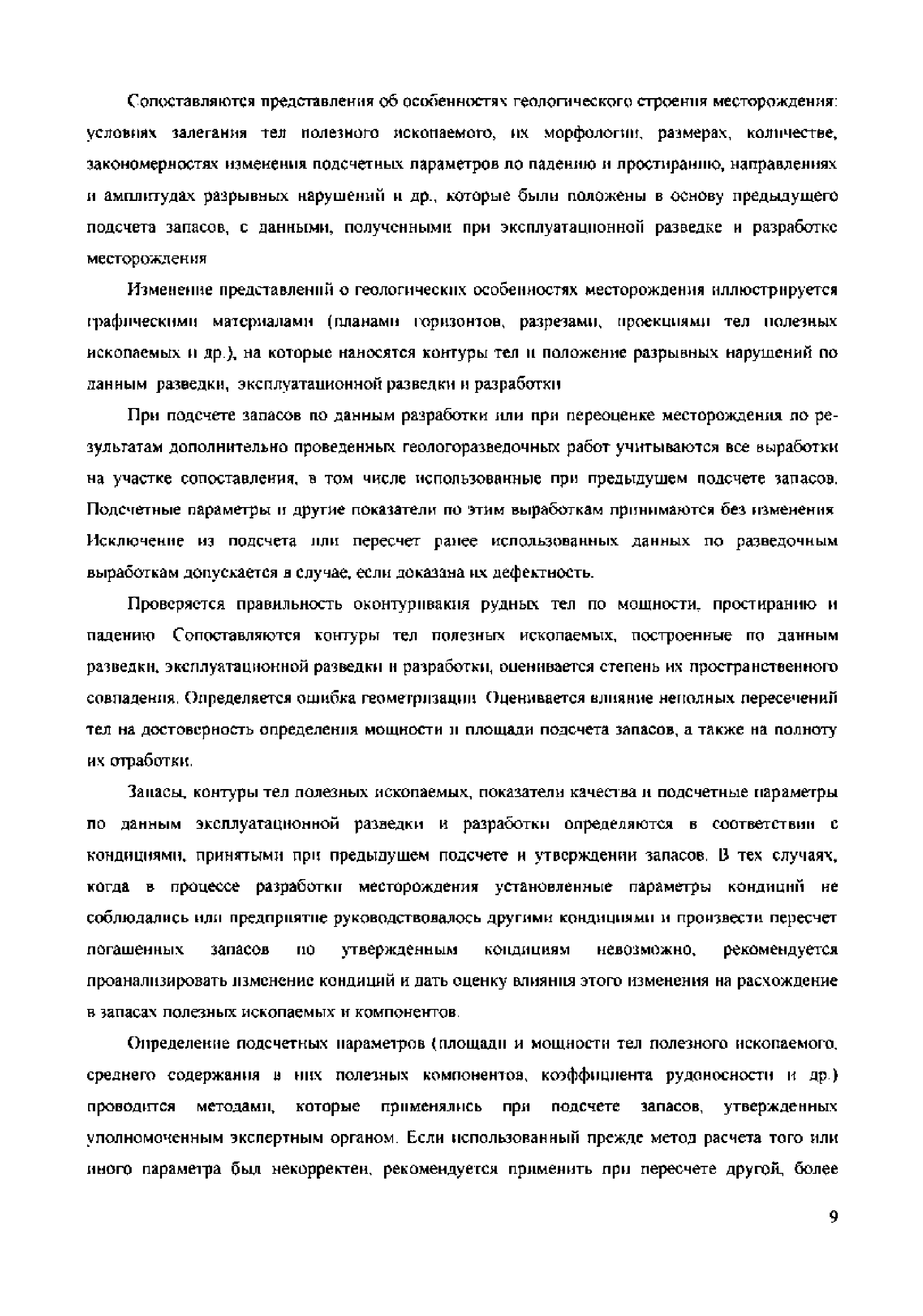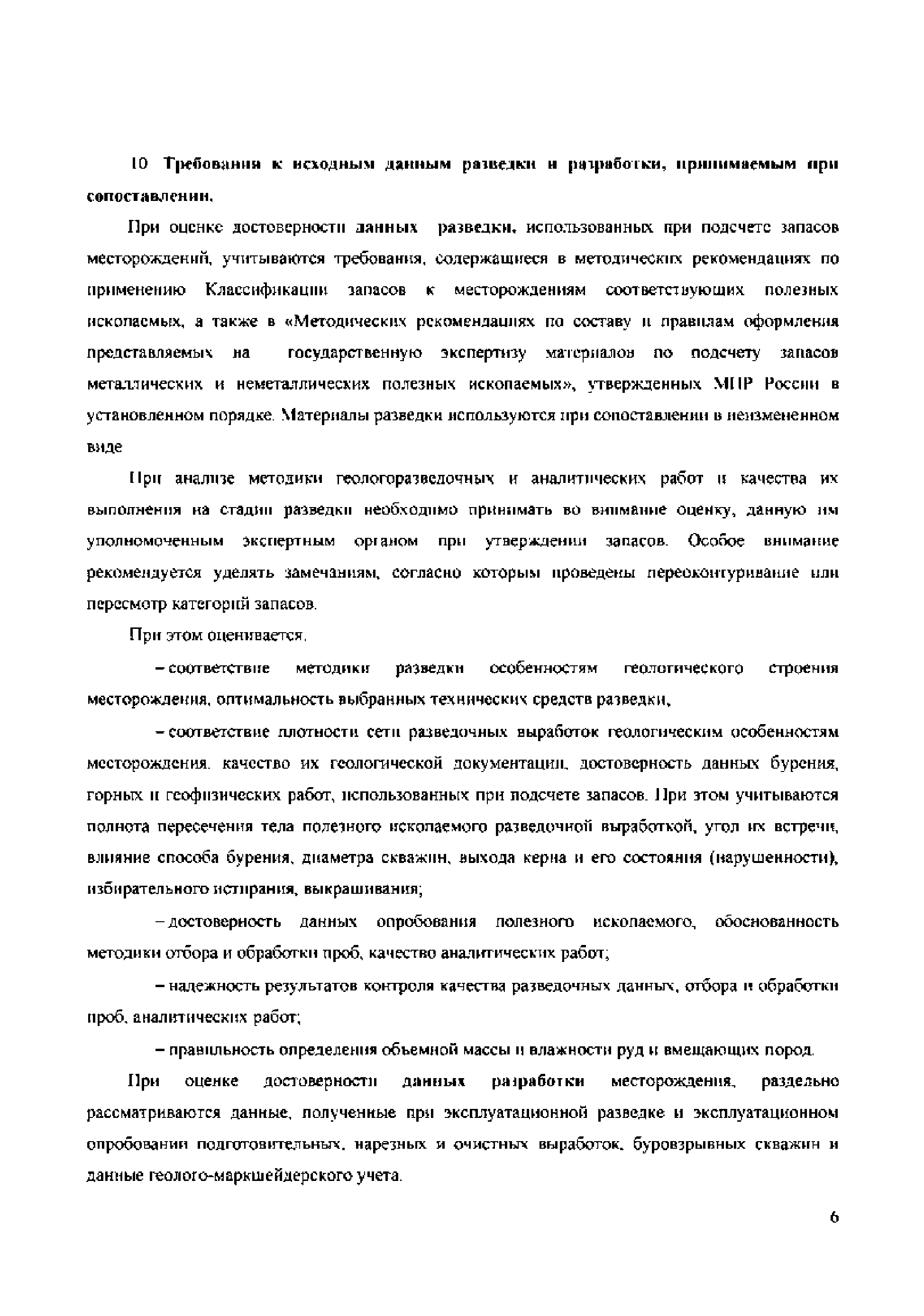 Методические рекомендации по сопоставлению данных разведки и разработки месторождений твердых полезных ископаемых| Статус: | действует | | Название рус.: | Методические рекомендации по сопоставлению данных разведки и разработки месторождений твердых полезных ископаемых | | Дата добавления в базу: | 01.02.2017 | | Дата актуализации: | 01.01.2021 | | Область применения: | Документ предназначен для работников предприятий и организаций, осуществляющих свою деятельность в сфере недропользования, независимо от их ведомственной принадлежности и форм собственности | | Оглавление: | I Общие положения II Состав, требования и методические основы сопоставления данных разведки и разработки III Сопоставление запасов, подсчитанных в очистном пространстве, с данными товарного опробования руды и данными переработки IV Оформление материалов сопоставления данных разведки и разработки V Требования к сопоставлению данных разведки и разработки отдельных участков месторождения, обработка которых производилась с использованием эксплуатационных кондиций Приложение 1. Сопоставление запасов полезного ископаемого и его качества по данным разведки и разработки Приложение 2. Сопоставление подсчетных параметров полезного ископаемого Приложение 3. Сводный баланс запасов полезного ископаемого и полезных компонентов Приложение 4. Баланс запасов по блокам, отдельным телам полезного ископаемого и в целом по месторождению Приложение 5. Сводная таблица балансовых запасов на месторождении (шахтном поле) Приложение 6. Сравнение данных добычи и переработки полезного ископаемого Приложение 7. Сопоставление основных показателей обработки месторождения в пределах выемочной единицы (блоками) | | Разработан: | ФГУ ГКЗ