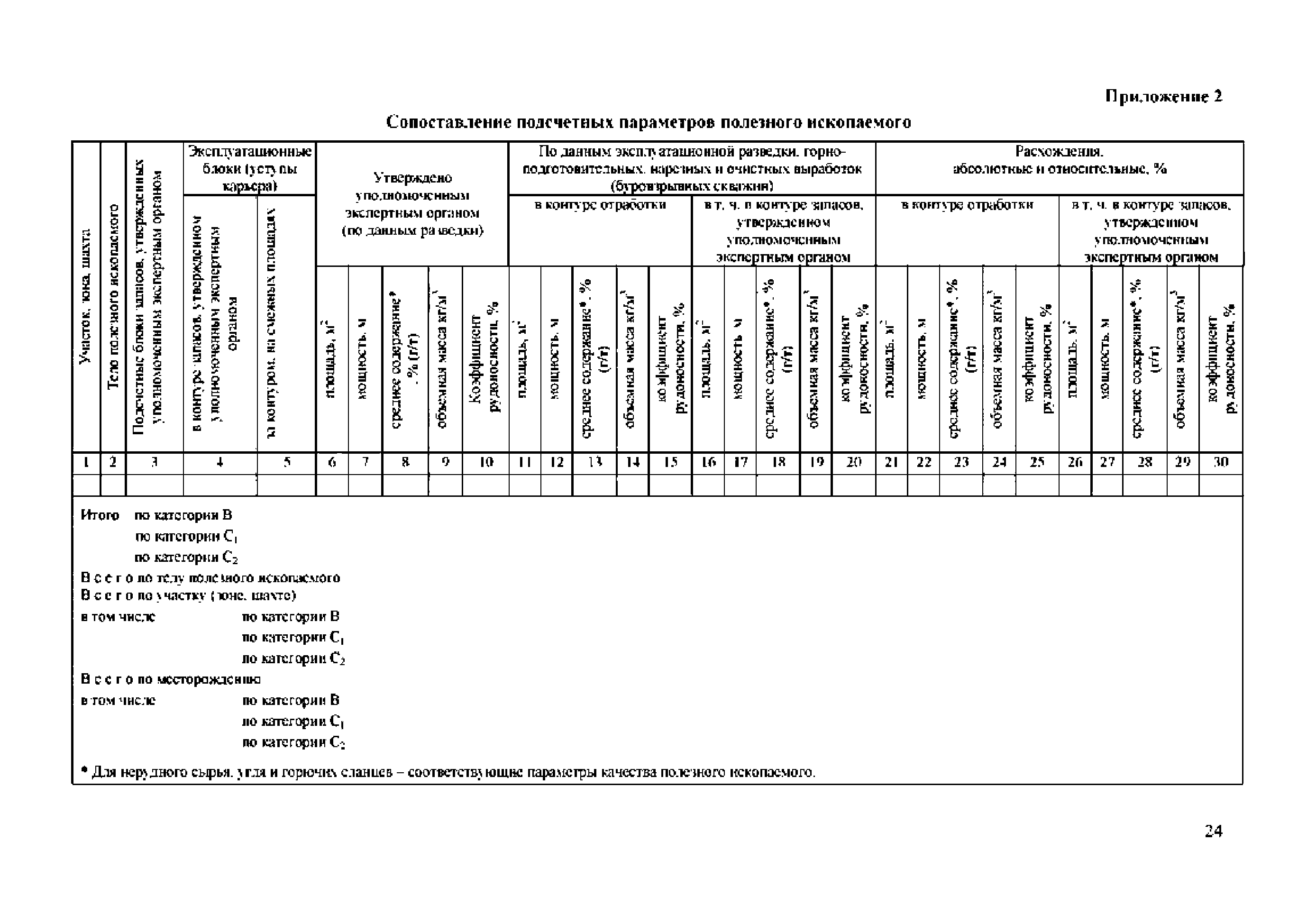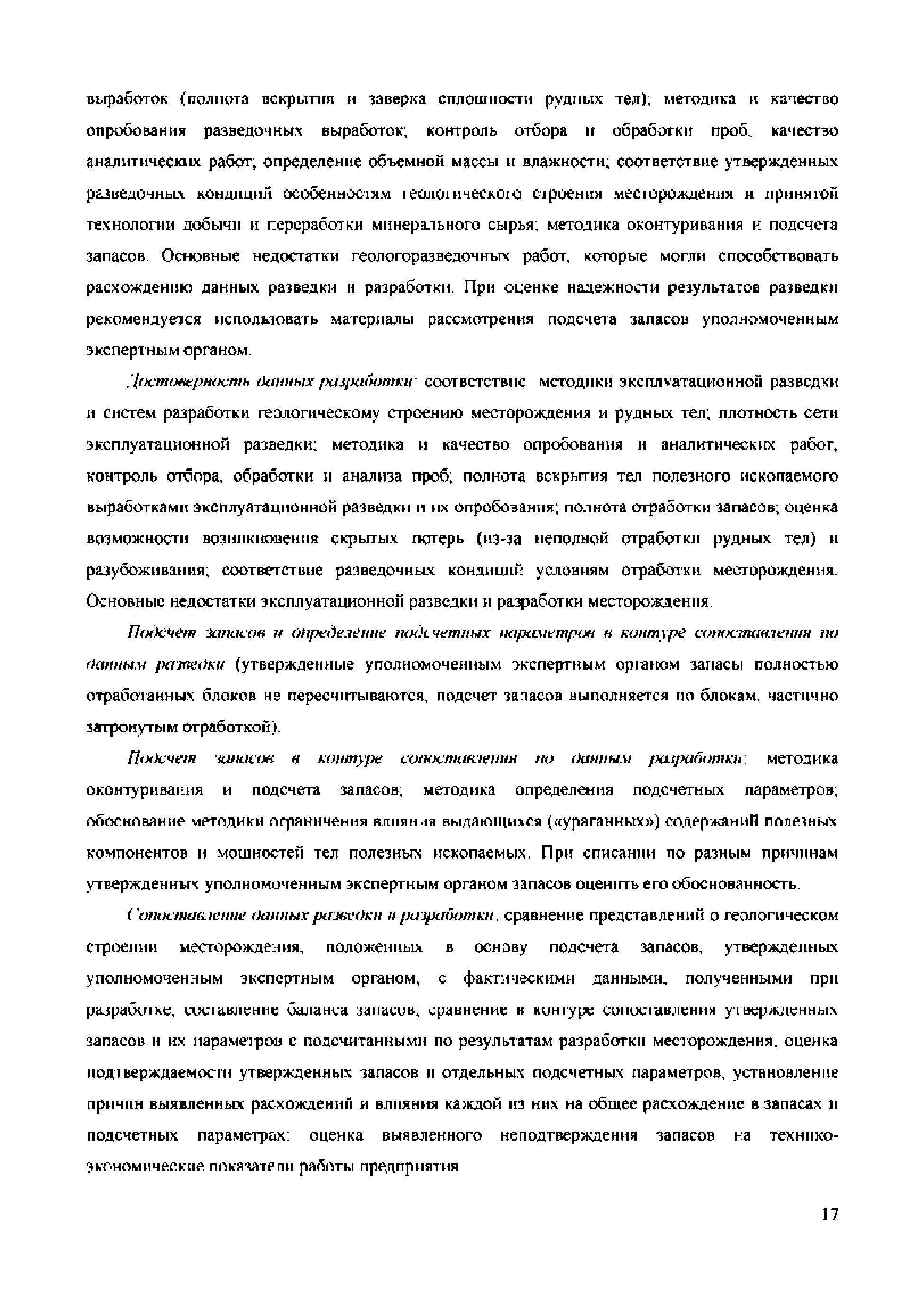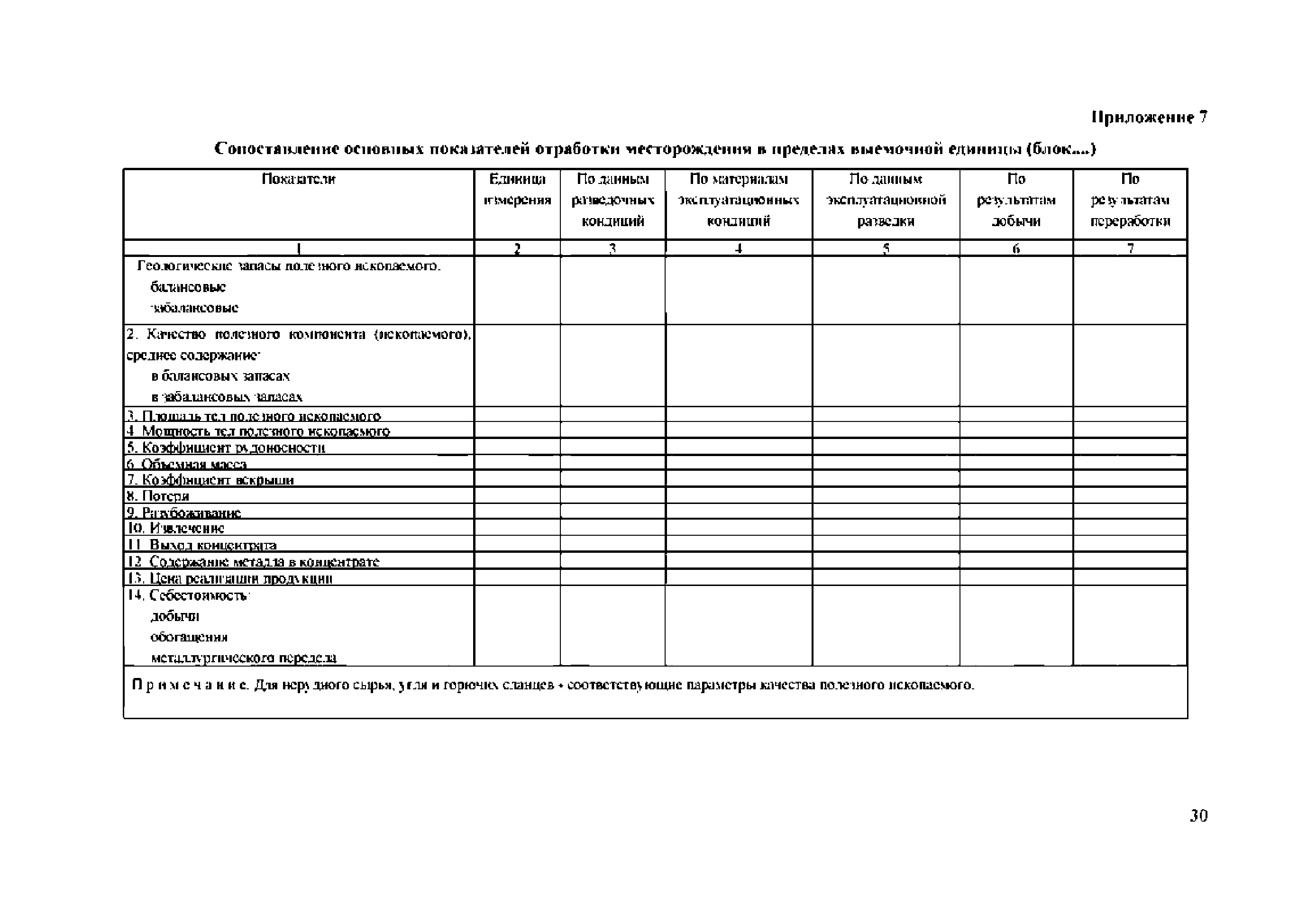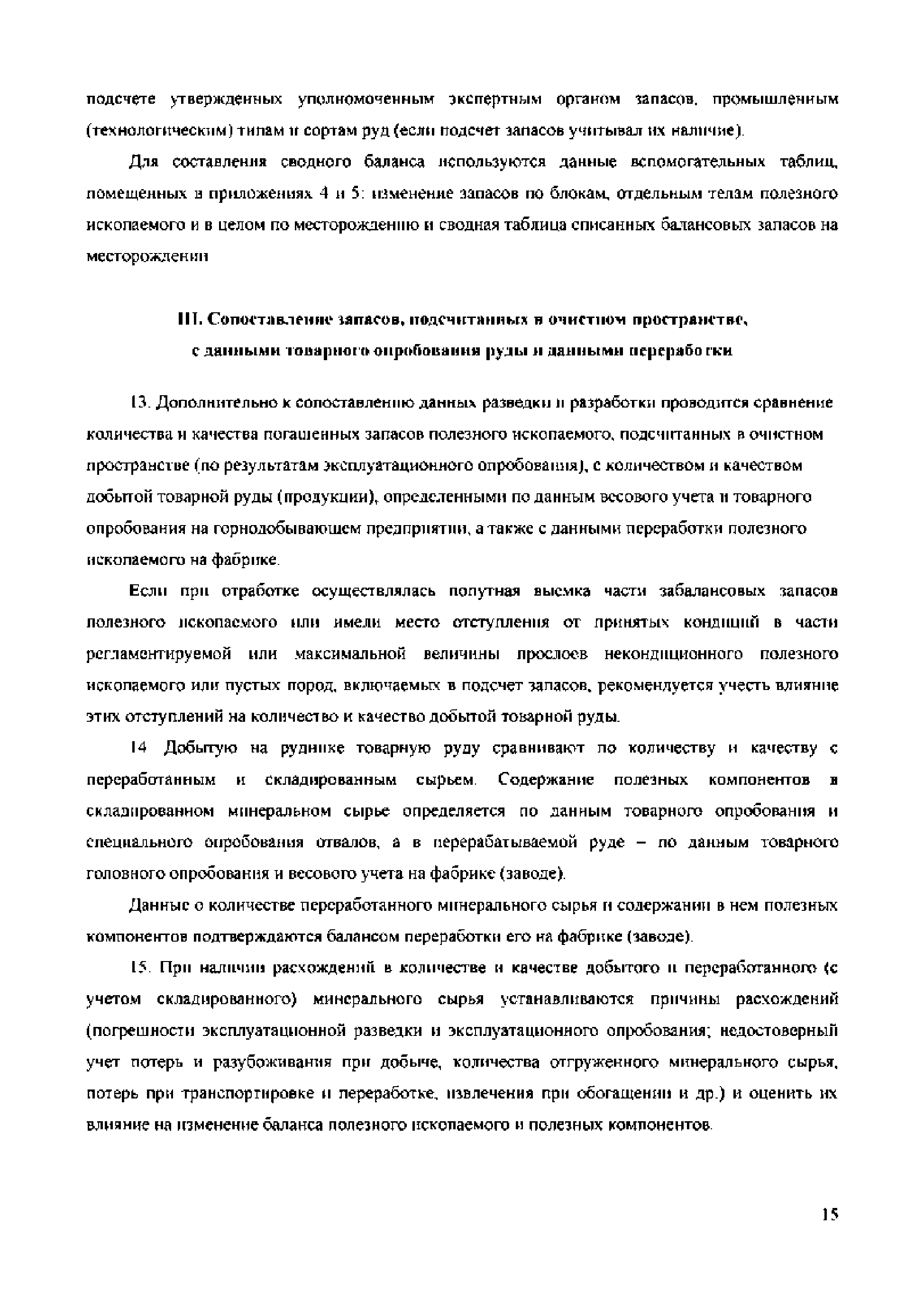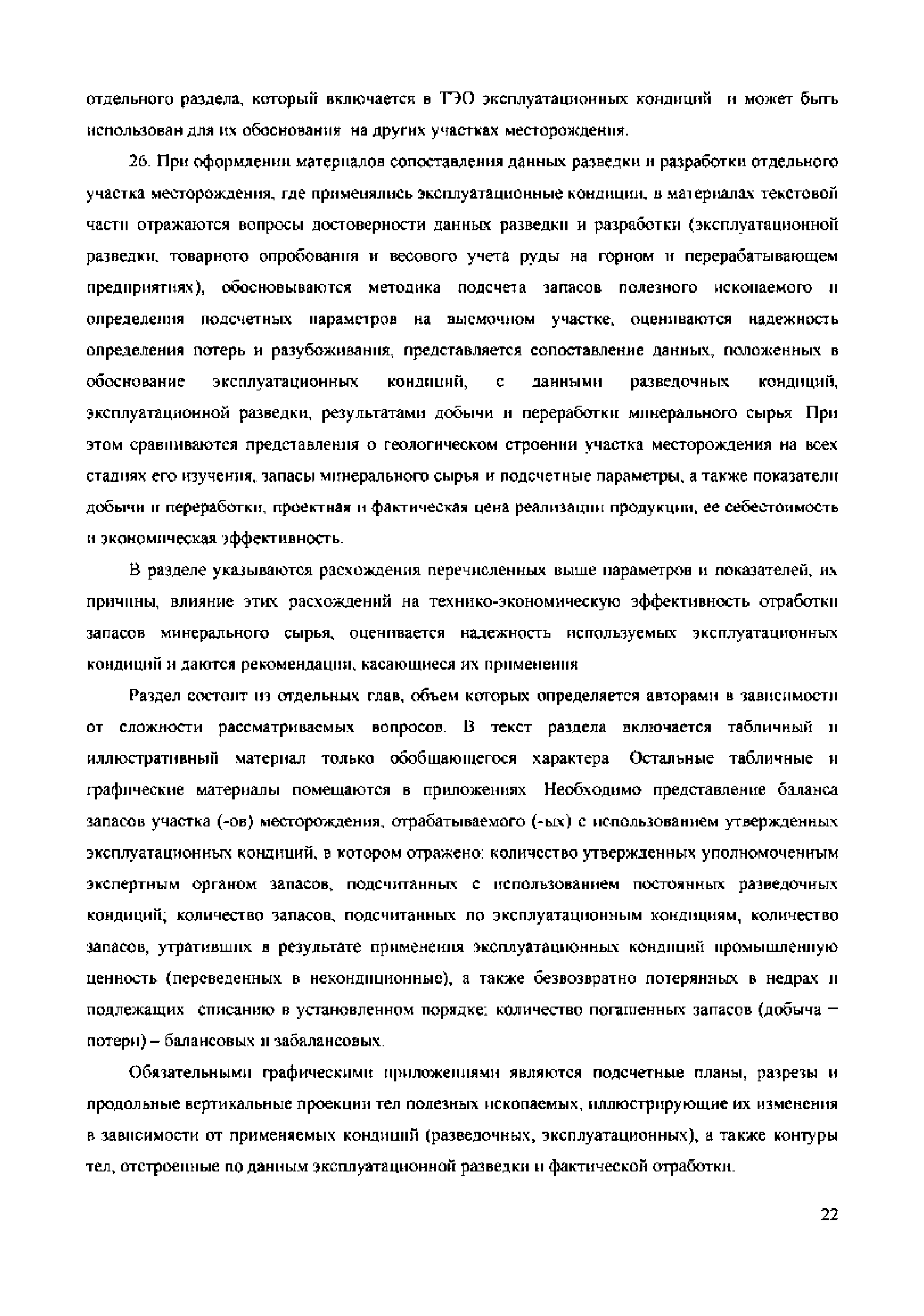 Методические рекомендации по сопоставлению данных разведки и разработки месторождений твердых полезных ископаемых| Статус: | действует | | Название рус.: | Методические рекомендации по сопоставлению данных разведки и разработки месторождений твердых полезных ископаемых | | Дата добавления в базу: | 01.02.2017 | | Дата актуализации: | 01.01.2021 | | Область применения: | Документ предназначен для работников предприятий и организаций, осуществляющих свою деятельность в сфере недропользования, независимо от их ведомственной принадлежности и форм собственности | | Оглавление: | I Общие положения II Состав, требования и методические основы сопоставления данных разведки и разработки III Сопоставление запасов, подсчитанных в очистном пространстве, с данными товарного опробования руды и данными переработки IV Оформление материалов сопоставления данных разведки и разработки V Требования к сопоставлению данных разведки и разработки отдельных участков месторождения, обработка которых производилась с использованием эксплуатационных кондиций Приложение 1. Сопоставление запасов полезного ископаемого и его качества по данным разведки и разработки Приложение 2. Сопоставление подсчетных параметров полезного ископаемого Приложение 3. Сводный баланс запасов полезного ископаемого и полезных компонентов Приложение 4. Баланс запасов по блокам, отдельным телам полезного ископаемого и в целом по месторождению Приложение 5. Сводная таблица балансовых запасов на месторождении (шахтном поле) Приложение 6. Сравнение данных добычи и переработки полезного ископаемого Приложение 7. Сопоставление основных показателей обработки месторождения в пределах выемочной единицы (блоками) | | Разработан: | ФГУ ГКЗ