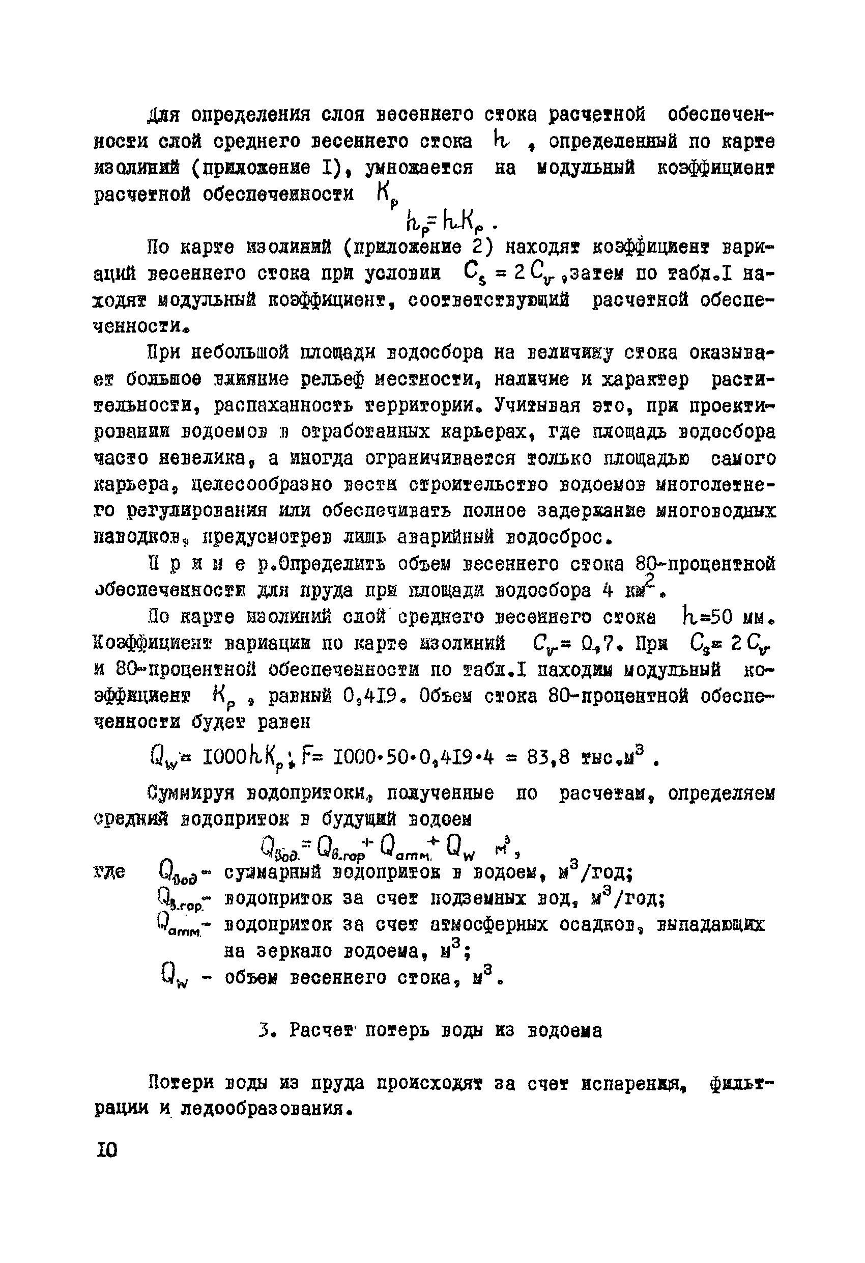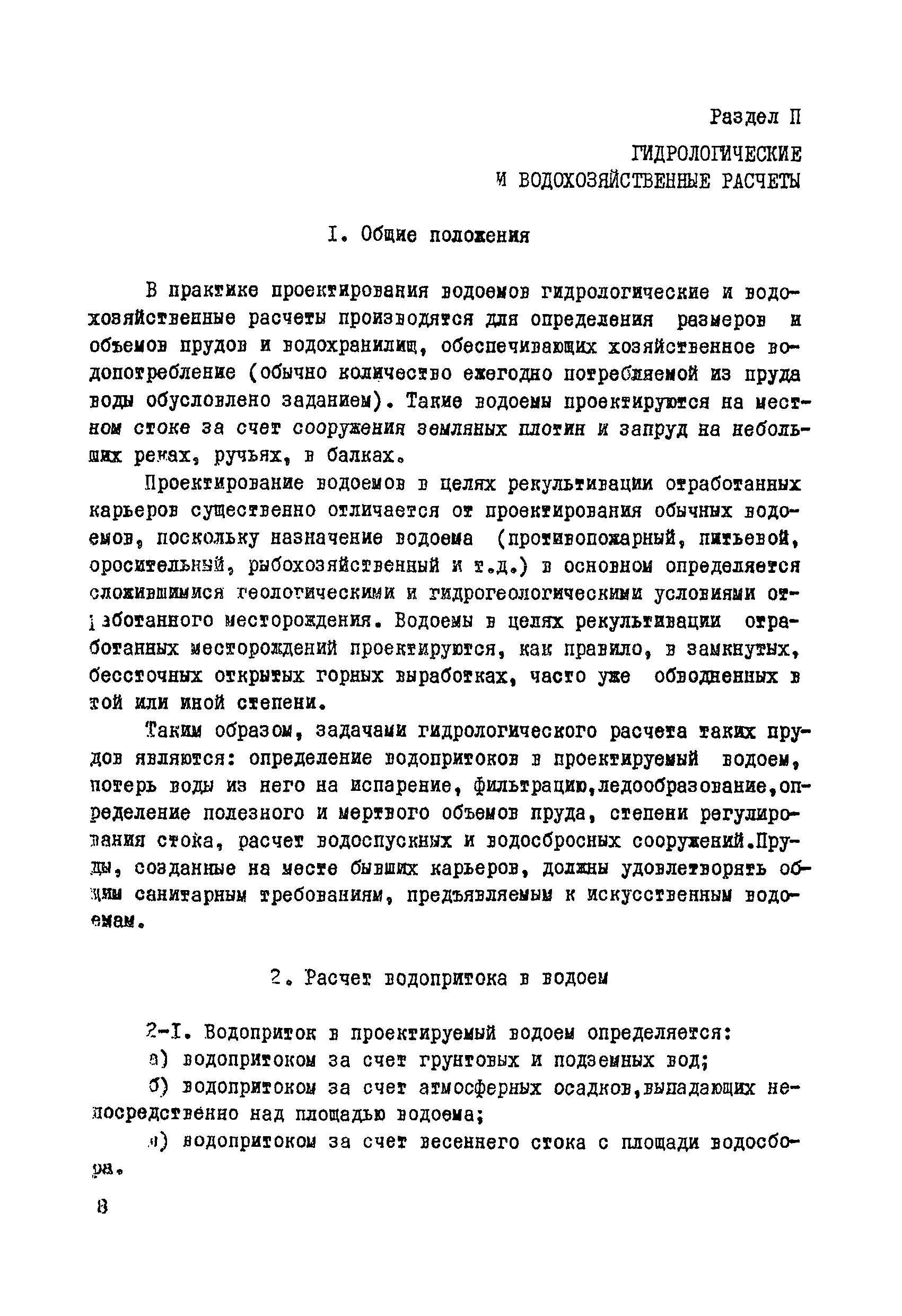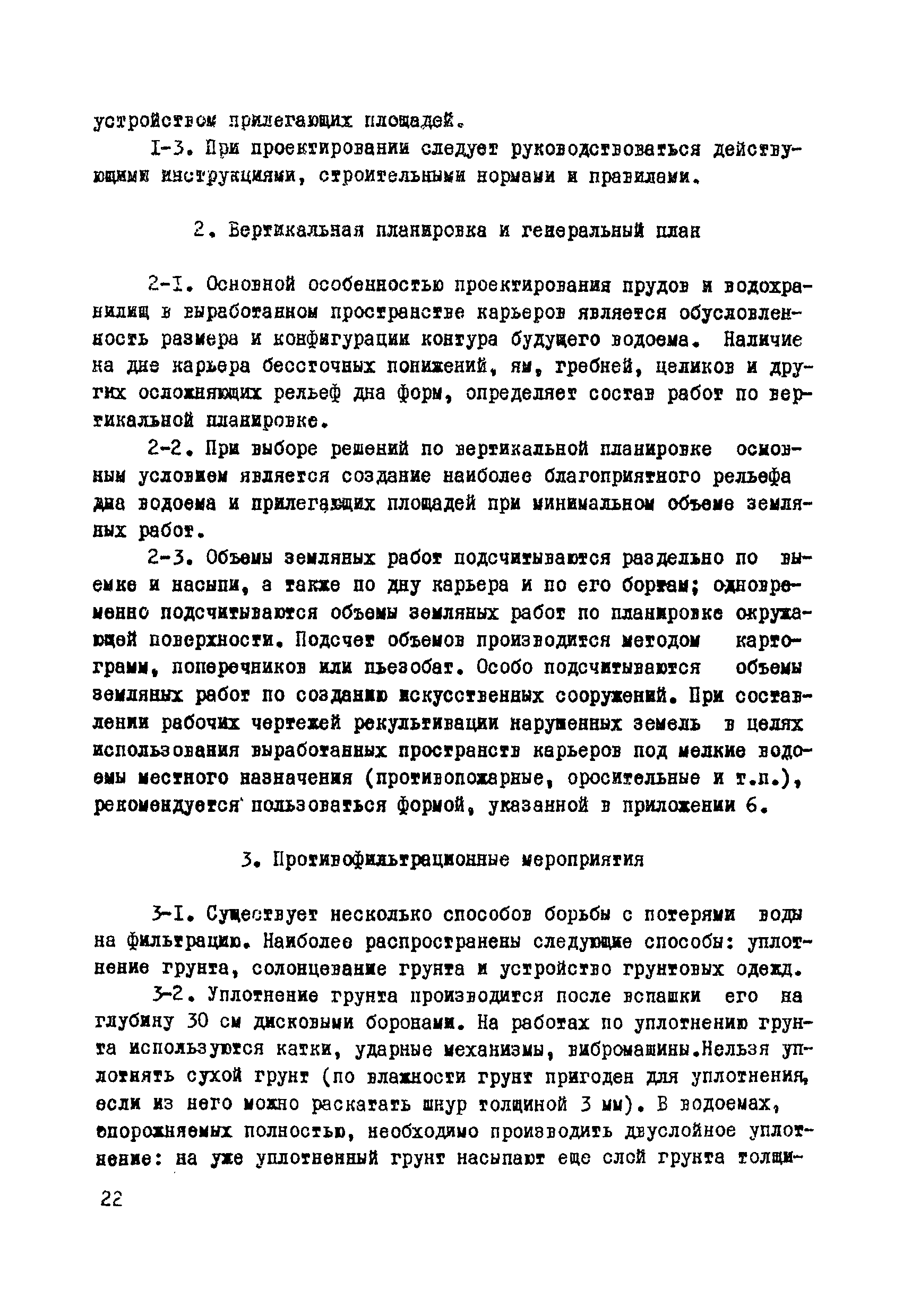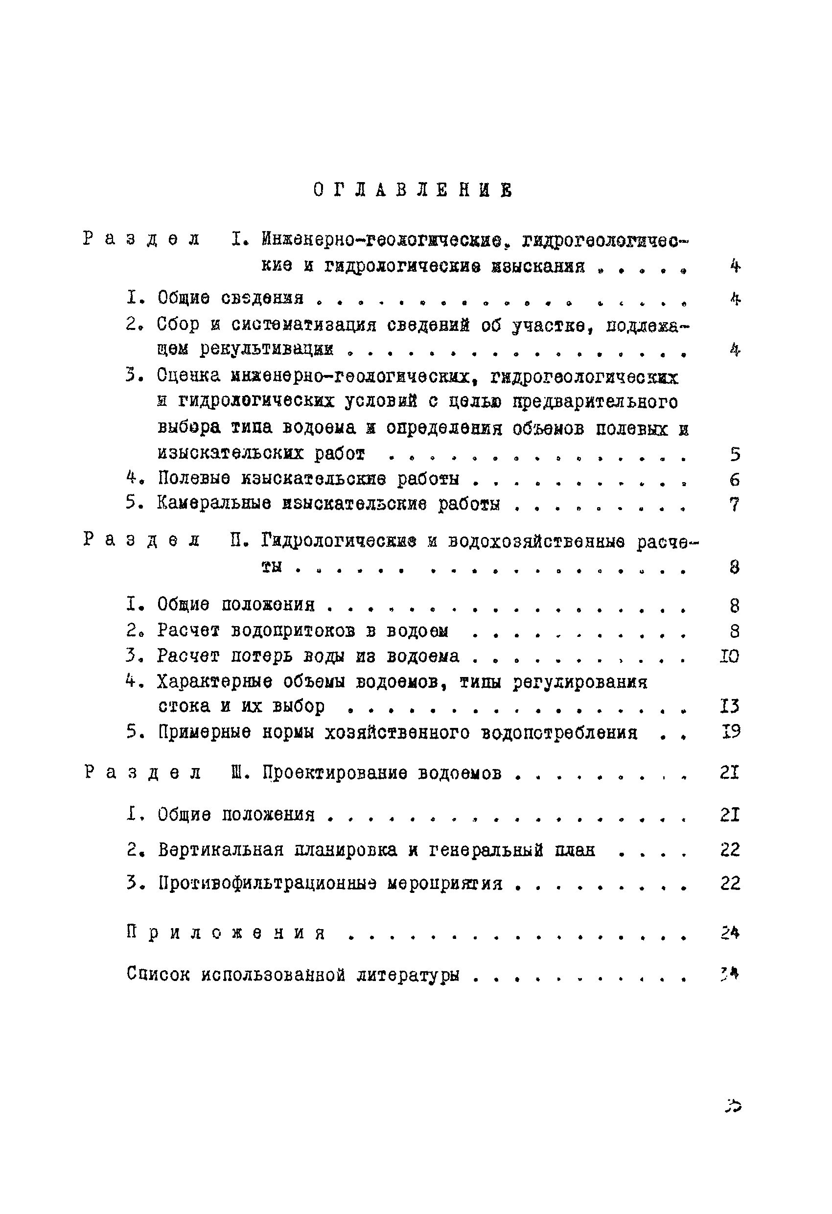 | Оглавление: | Раздел I. Инженерно-геологические, гидрогеологические и гидрологические изыскания 1 Общие сведения 2 Сбор и систематизация сведений об участке, подлежащем рекультивации 3 Оценка инженерно-геологических, гидрогеологических и гидрологических условии с целью предварительного выбора типа водоема и определения объемов полевых изыскательских работ 4 Полевые изыскательские работы 5 Камеральные изыскательские работы Раздел II. Гидрологические и водохозяйственные расчеты 1 Общие положения 2 Расчет водопритока в водоем 3 Расчет потерь воды из водоема 4 Характерные объемы водоемов, типы регулирования стока, их выбор 5 Примерные нормы хозяйственного водопотребления Раздел III. Проектирование водоемов 1 Общие положения 2 Вертикальная планировка и генеральный план 3 Противофильтрационные мероприятия Приложение 1. Средний слой весеннего поверхностного стока Приложение 2. Карта изолиний коэффициентов вариаций весеннего стока на территории степных и лесостепных районов Европейской части СССР Приложение 3. Карта изолиний среднего годового слоя испарения Приложение 4. Карта изолиний параметра А максимального весеннего стока 5 % обеспеченности Приложение 5. Карта изолиний параметра А максимального весеннего стока 1 % обеспеченности Приложение 6. Проект пруда Приложение 7. Топографическая характеристика водоема |