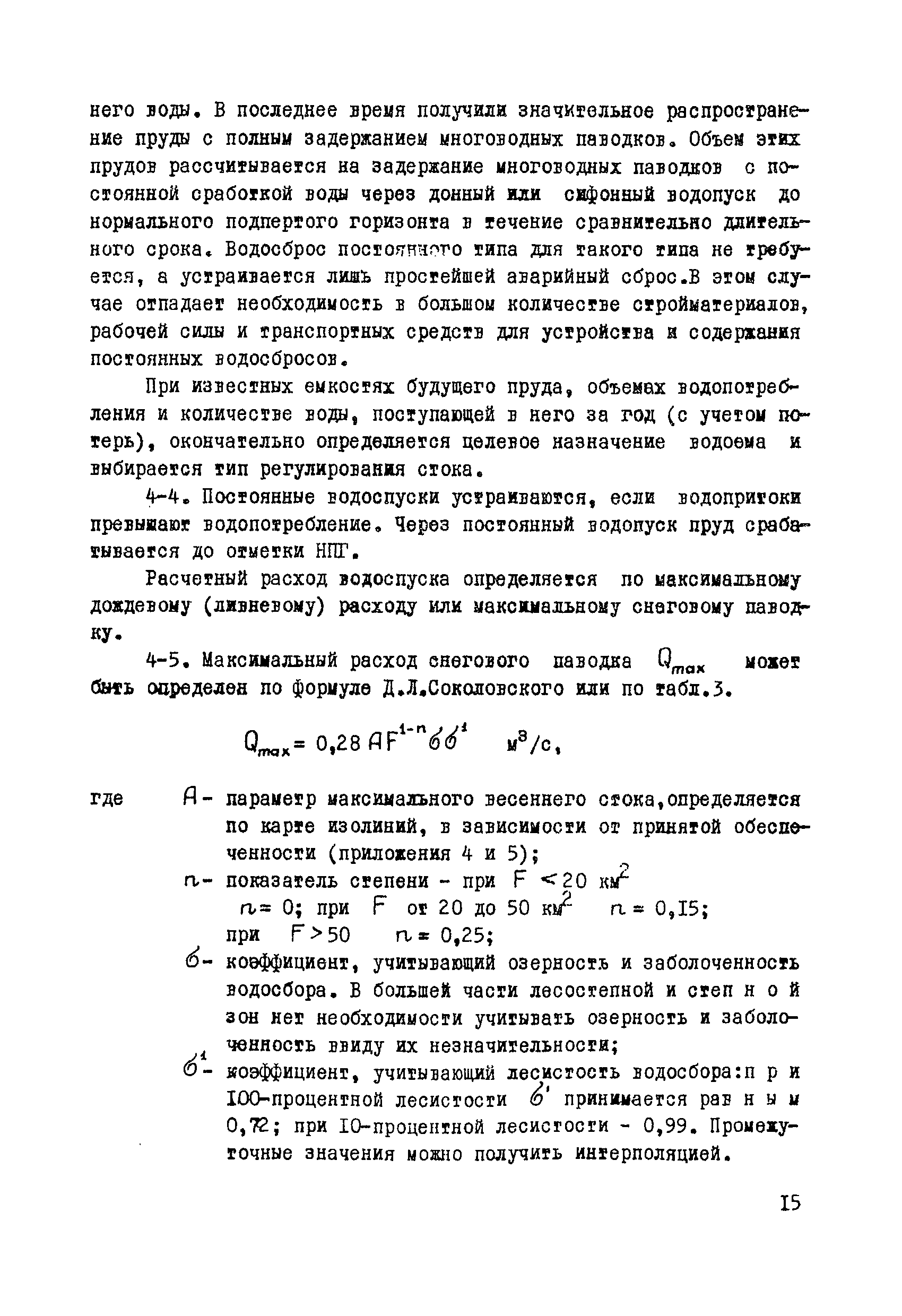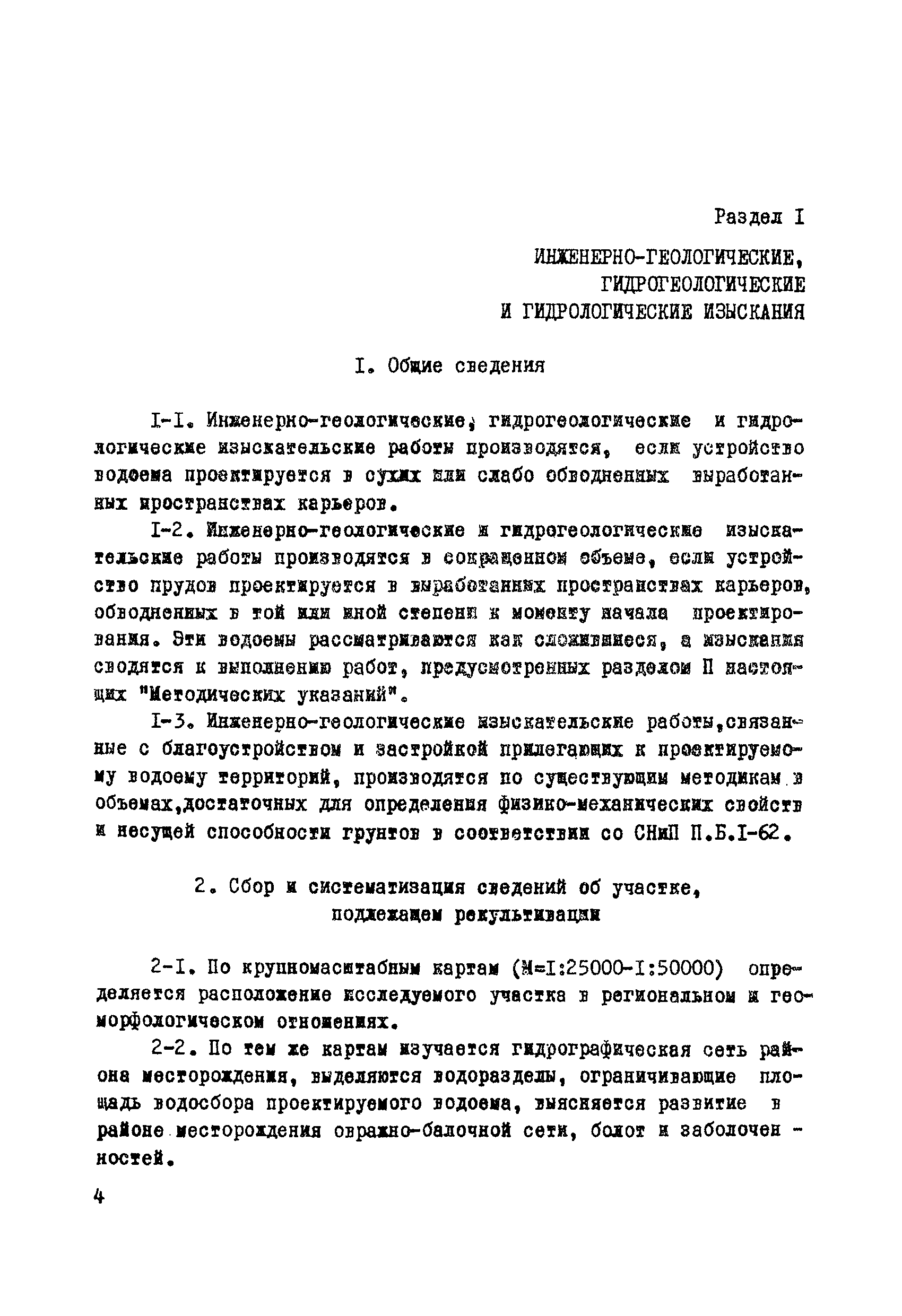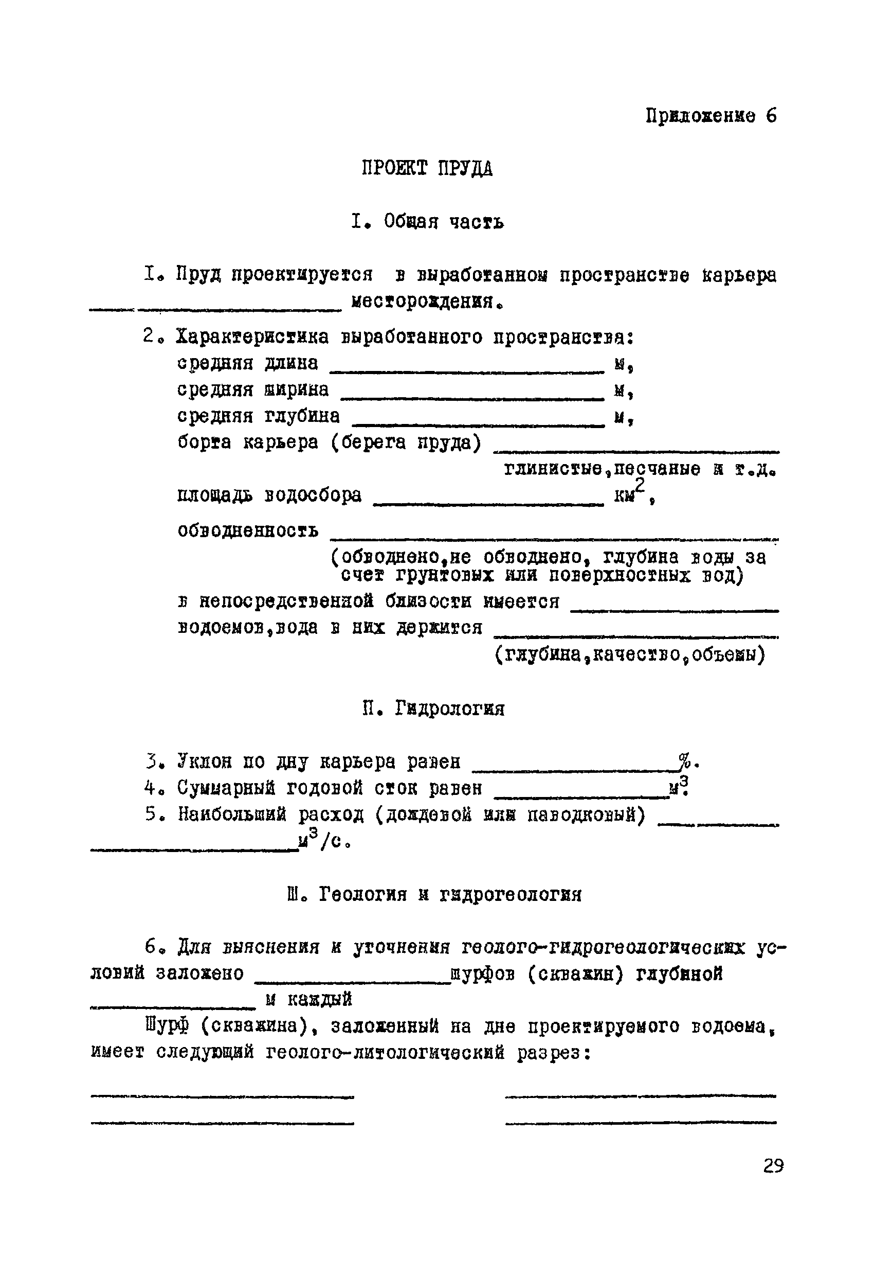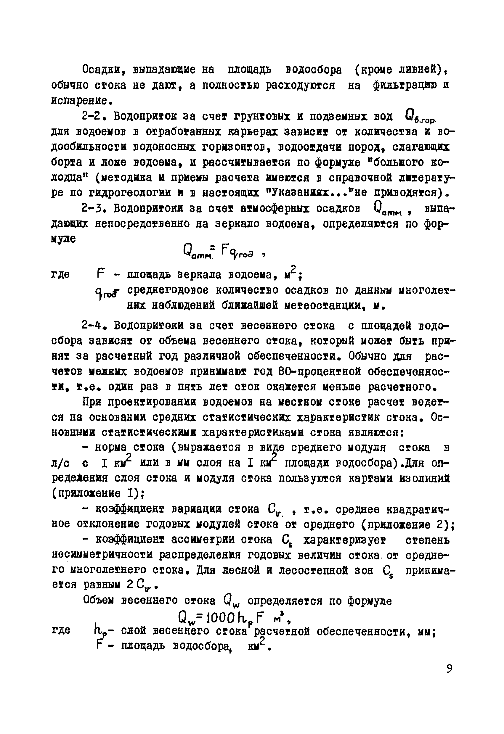 | Оглавление: | Раздел I. Инженерно-геологические, гидрогеологические и гидрологические изыскания 1 Общие сведения 2 Сбор и систематизация сведений об участке, подлежащем рекультивации 3 Оценка инженерно-геологических, гидрогеологических и гидрологических условии с целью предварительного выбора типа водоема и определения объемов полевых изыскательских работ 4 Полевые изыскательские работы 5 Камеральные изыскательские работы Раздел II. Гидрологические и водохозяйственные расчеты 1 Общие положения 2 Расчет водопритока в водоем 3 Расчет потерь воды из водоема 4 Характерные объемы водоемов, типы регулирования стока, их выбор 5 Примерные нормы хозяйственного водопотребления Раздел III. Проектирование водоемов 1 Общие положения 2 Вертикальная планировка и генеральный план 3 Противофильтрационные мероприятия Приложение 1. Средний слой весеннего поверхностного стока Приложение 2. Карта изолиний коэффициентов вариаций весеннего стока на территории степных и лесостепных районов Европейской части СССР Приложение 3. Карта изолиний среднего годового слоя испарения Приложение 4. Карта изолиний параметра А максимального весеннего стока 5 % обеспеченности Приложение 5. Карта изолиний параметра А максимального весеннего стока 1 % обеспеченности Приложение 6. Проект пруда Приложение 7. Топографическая характеристика водоема |
