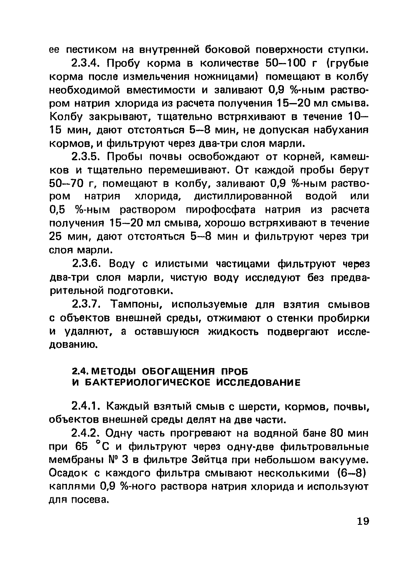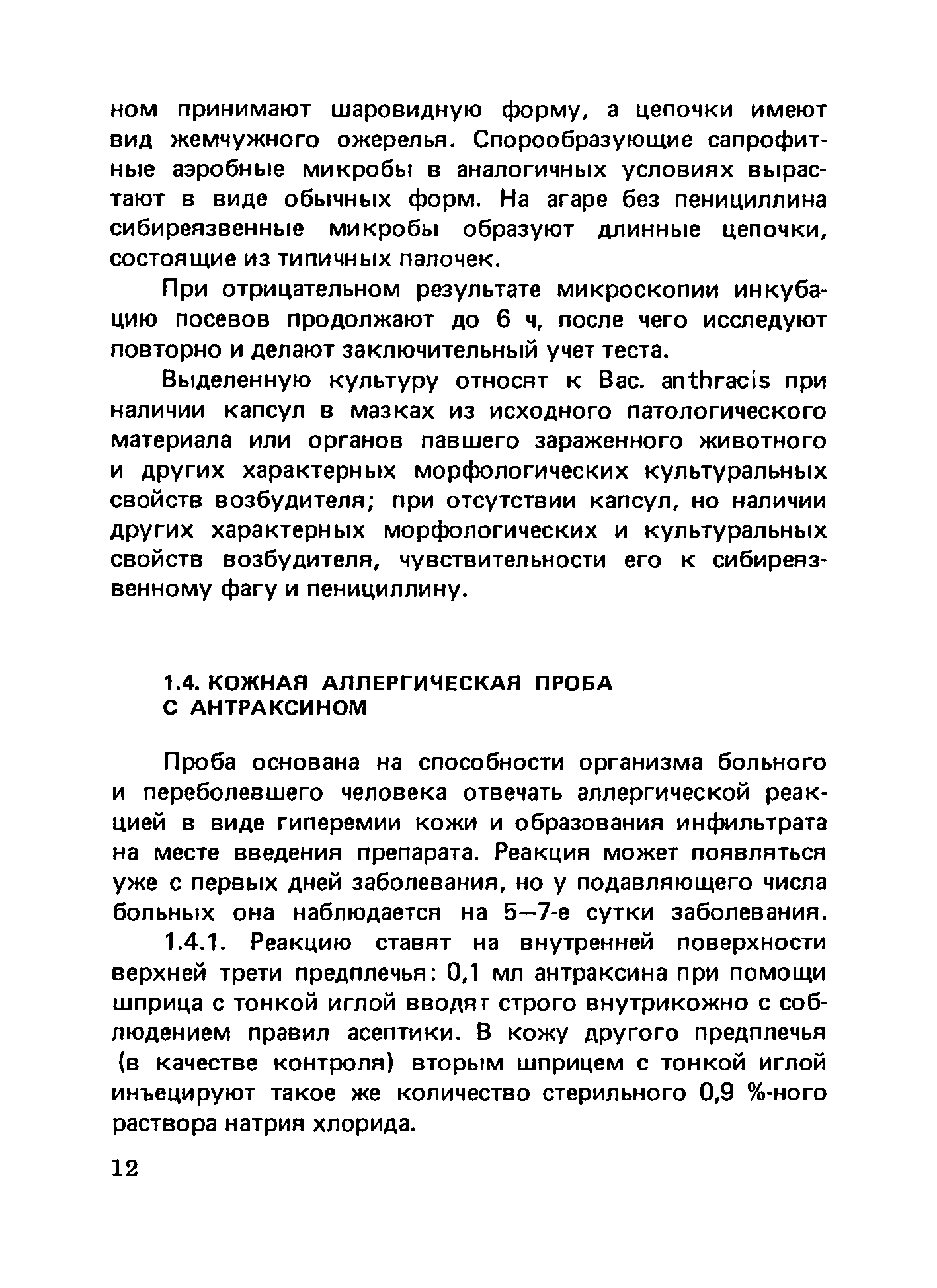 | Оглавление: | 1. Диагностика сибирской язвы 1.1. Общие положения 1.2. Взятие и пересылка патологического материала для исследования 1.3. Порядок проведения исследования 1.4. Кожная аллергическая проба с антраксином 1.5. Выдача заключения по результатам исследования 1.6. Сроки исследования 2. Обнаружение возбудителя сибирской язвы в сырье животного происхождения и объектах внешней среды 2.1. Цель исследования 2.2. Взятие материала для исследования 2.3. Подготовка проб к исследованию 2.4. Методы обогащения проб и бактериологическое исследование 2.5. Постановка и учет реакции диск-преципитации 2.6. Идентификация культур 2.7. Учет результатов идентификации культур 2.8. Определение вирулентности сибиреязвенных культур 3. Требования к режиму работы и передаче выделенных культур Приложение |