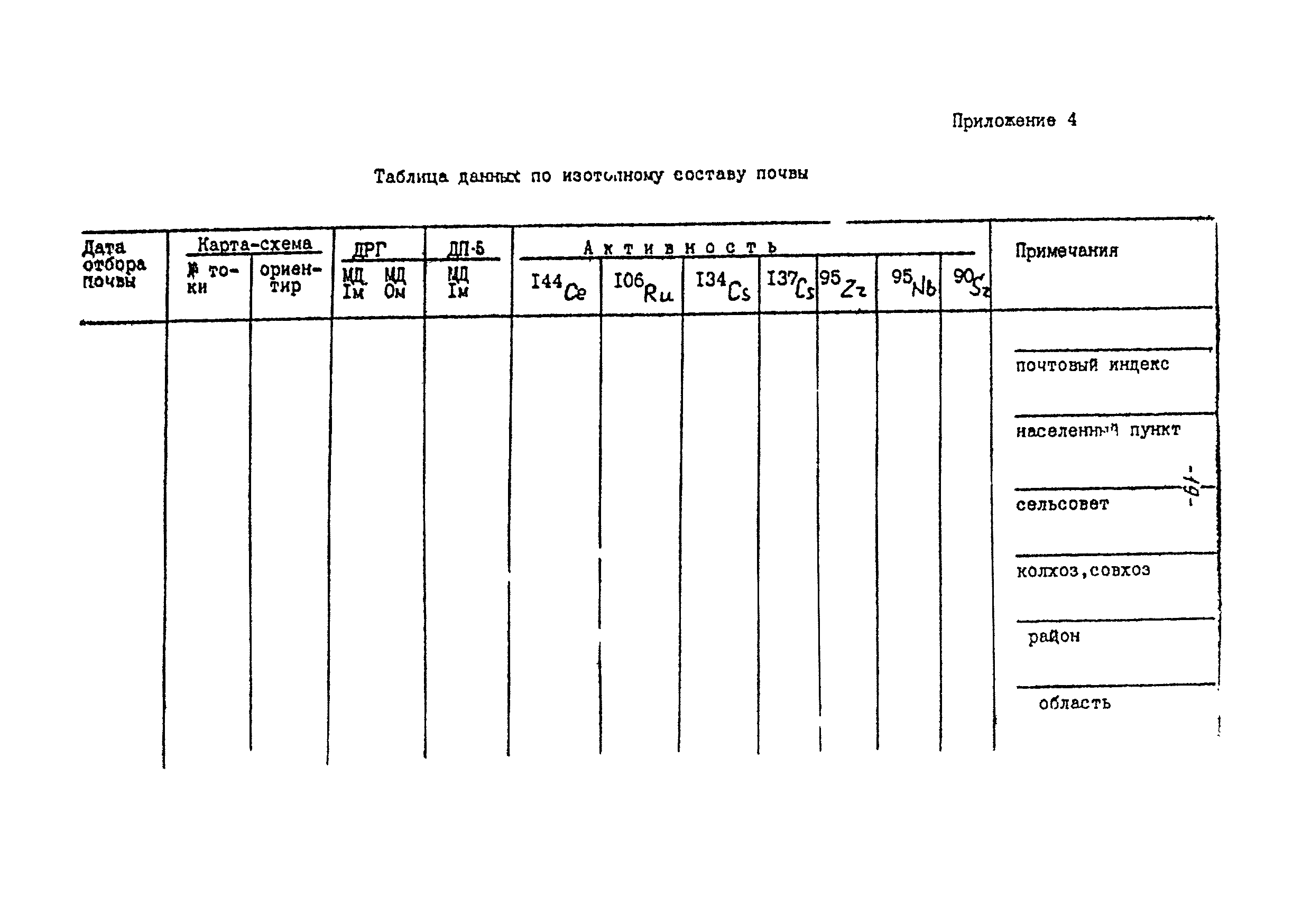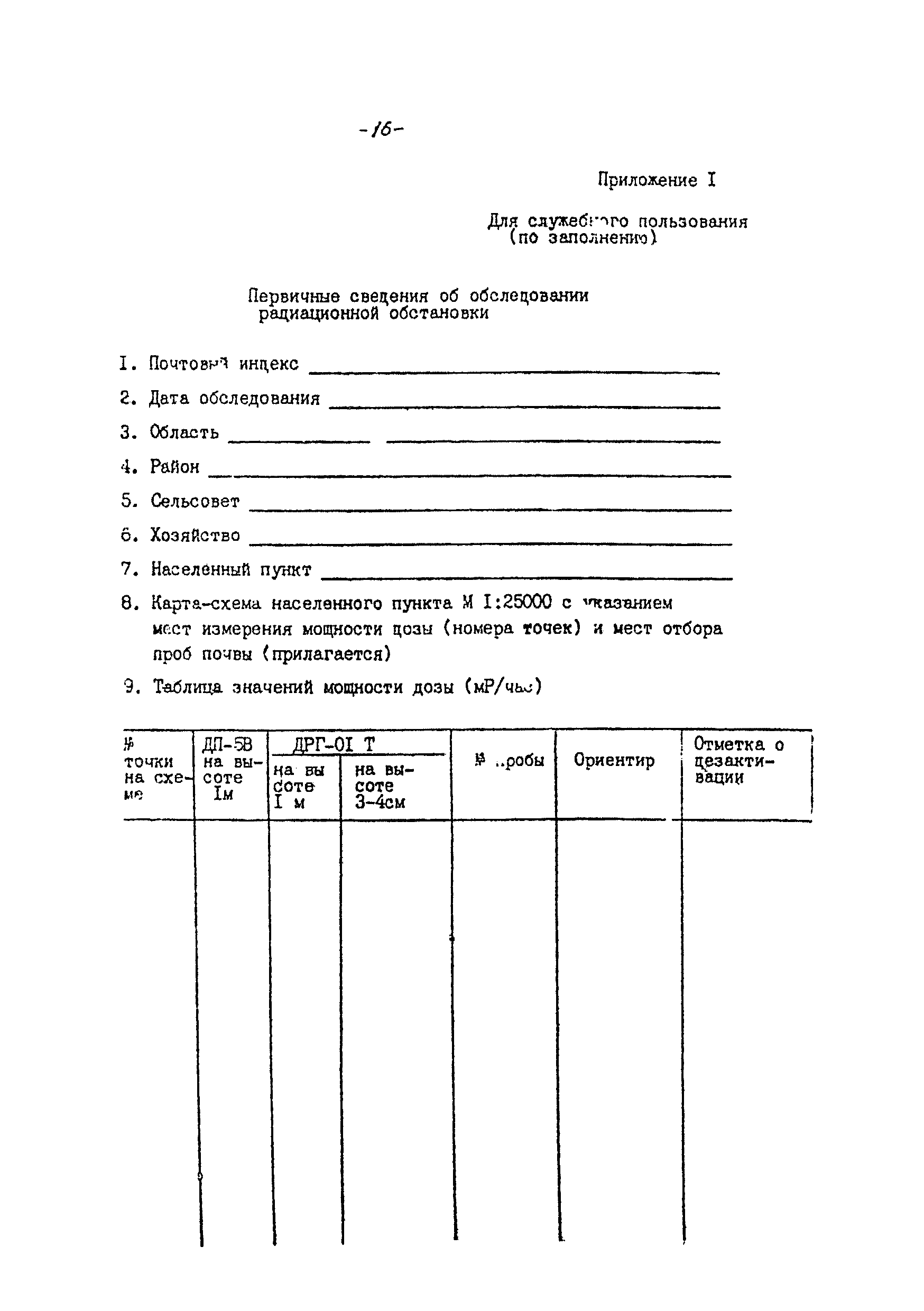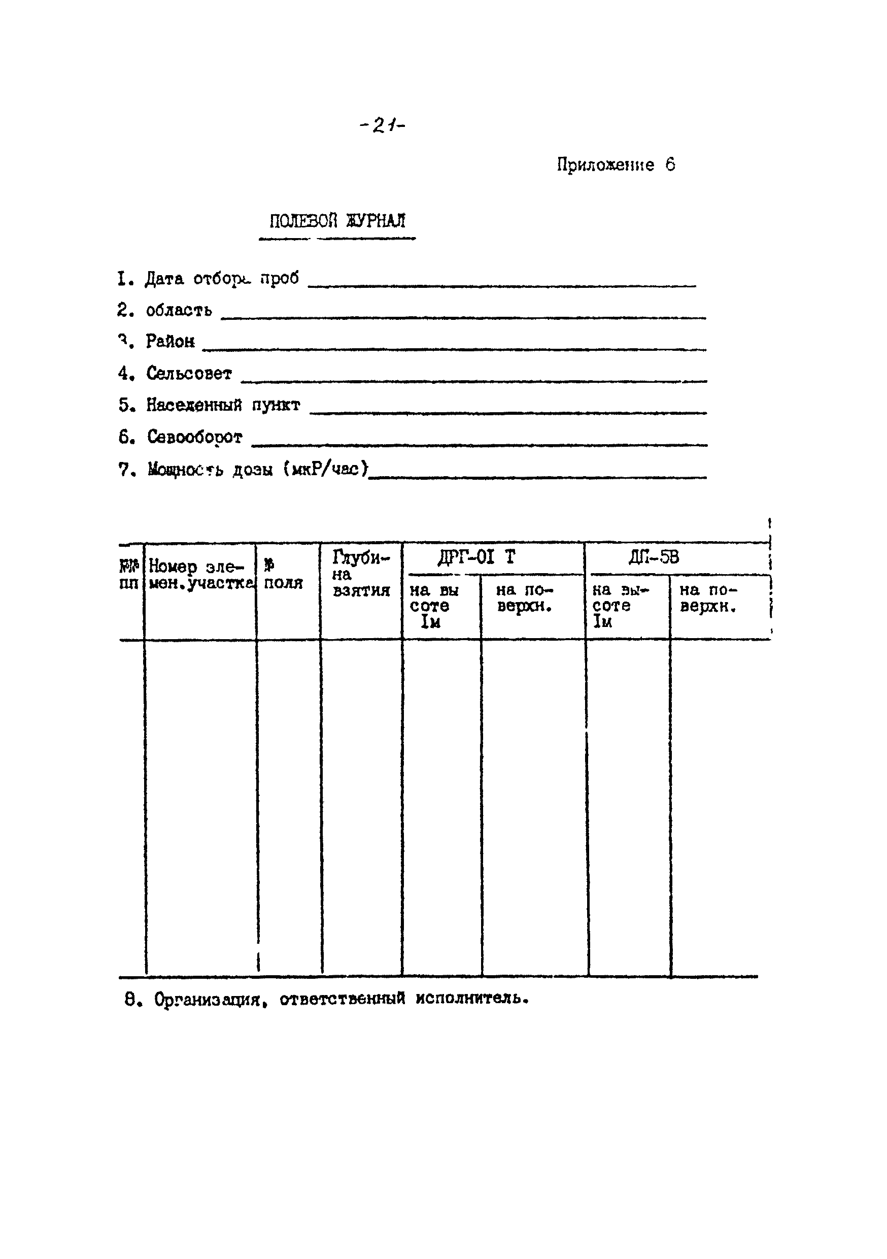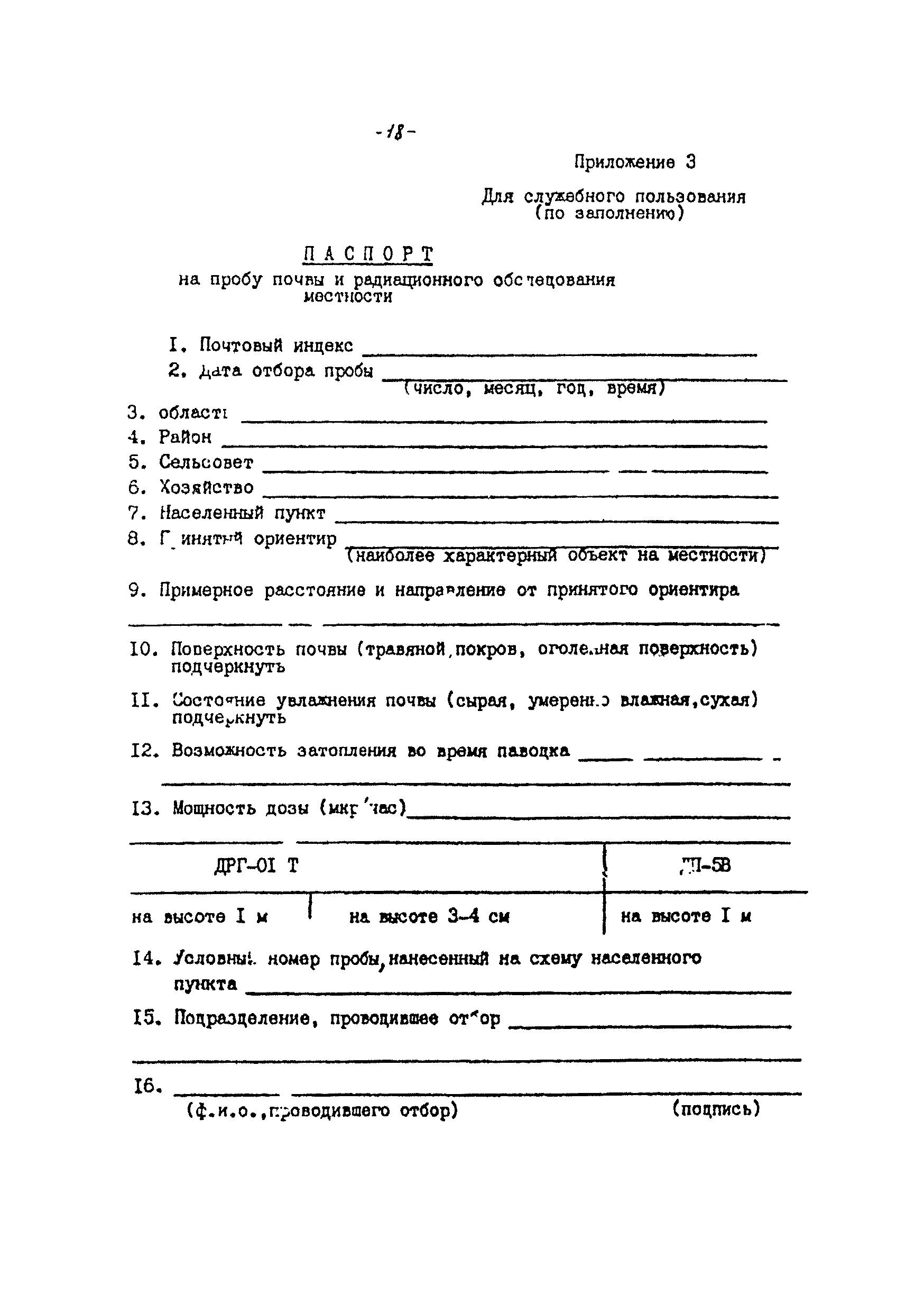 | Оглавление: | 1 Порядок обследования радиационной обстановки в населенном пункте 2 Отбор проб почвы в населенных пунктах для последующего анализа на содержание радионуклидов 3 Отбор проб почвы на сельскохозяйственных угодьях для последующего анализа на содержание радионуклидов 4 Методика изучения поля гамма-излучения для определения дозовых нагрузок на население в загрязненных районах Приложение 1. Первичные сведения об обследовании радиационной обстановки Приложение 3. Паспорт на пробу почвы и радиационного обследования местности Приложение 4. Таблица данных по изотопному составу почвы Приложение 5. Сопроводительный талон проб почв сельскохозяйственных угодий Приложение 6. Полевой журнал Приложение 7. Карточка уровней гамма-излучения в населенном пункте |