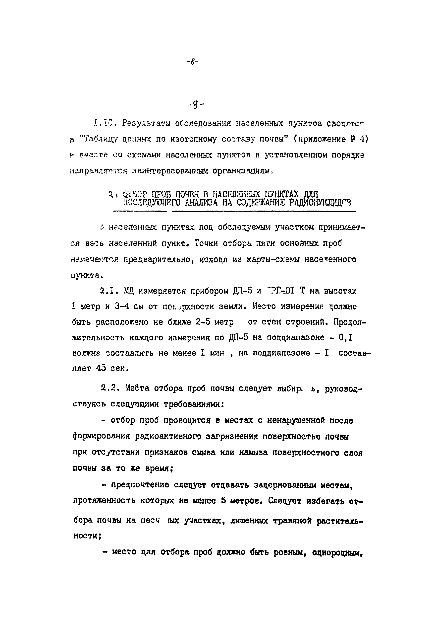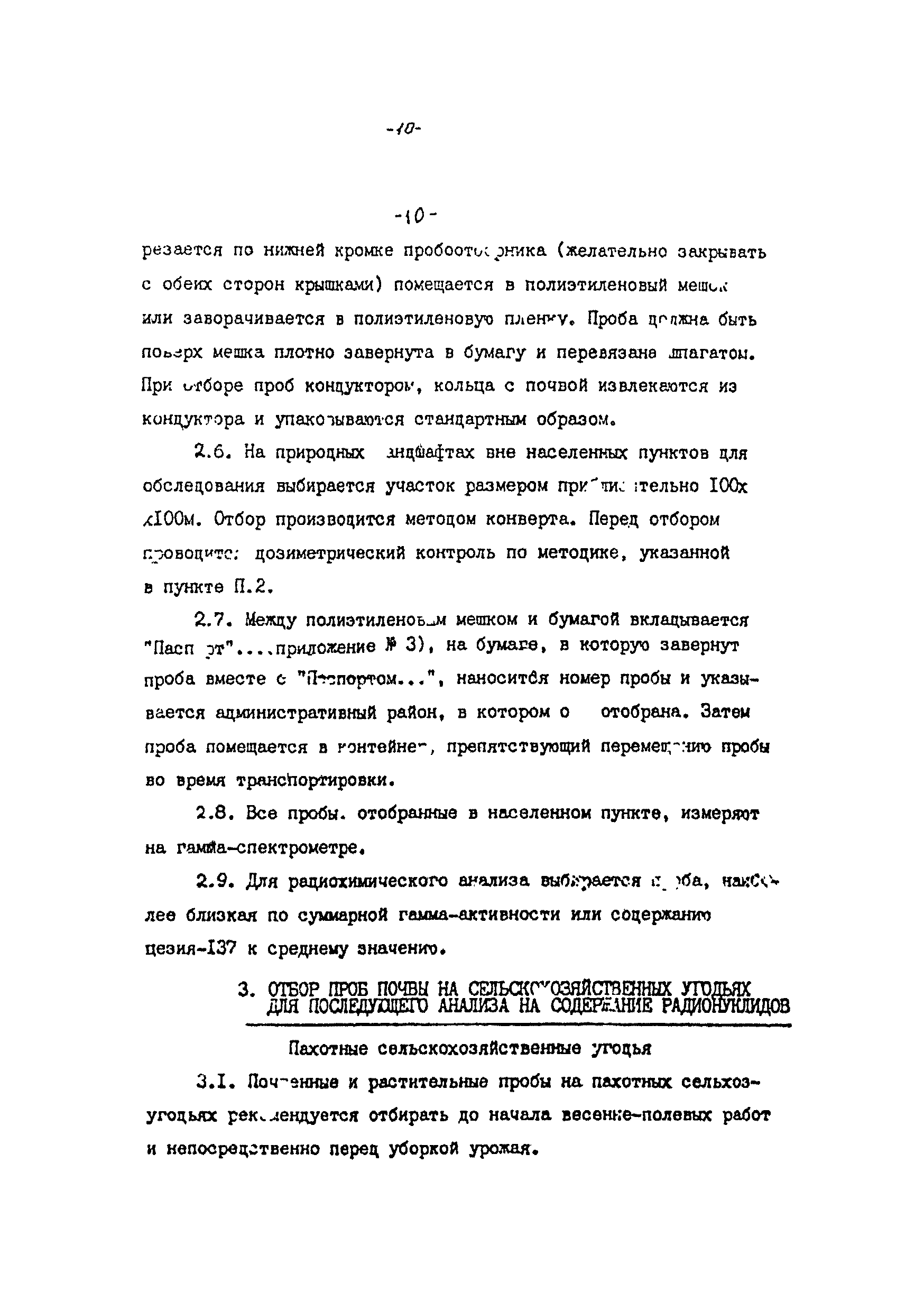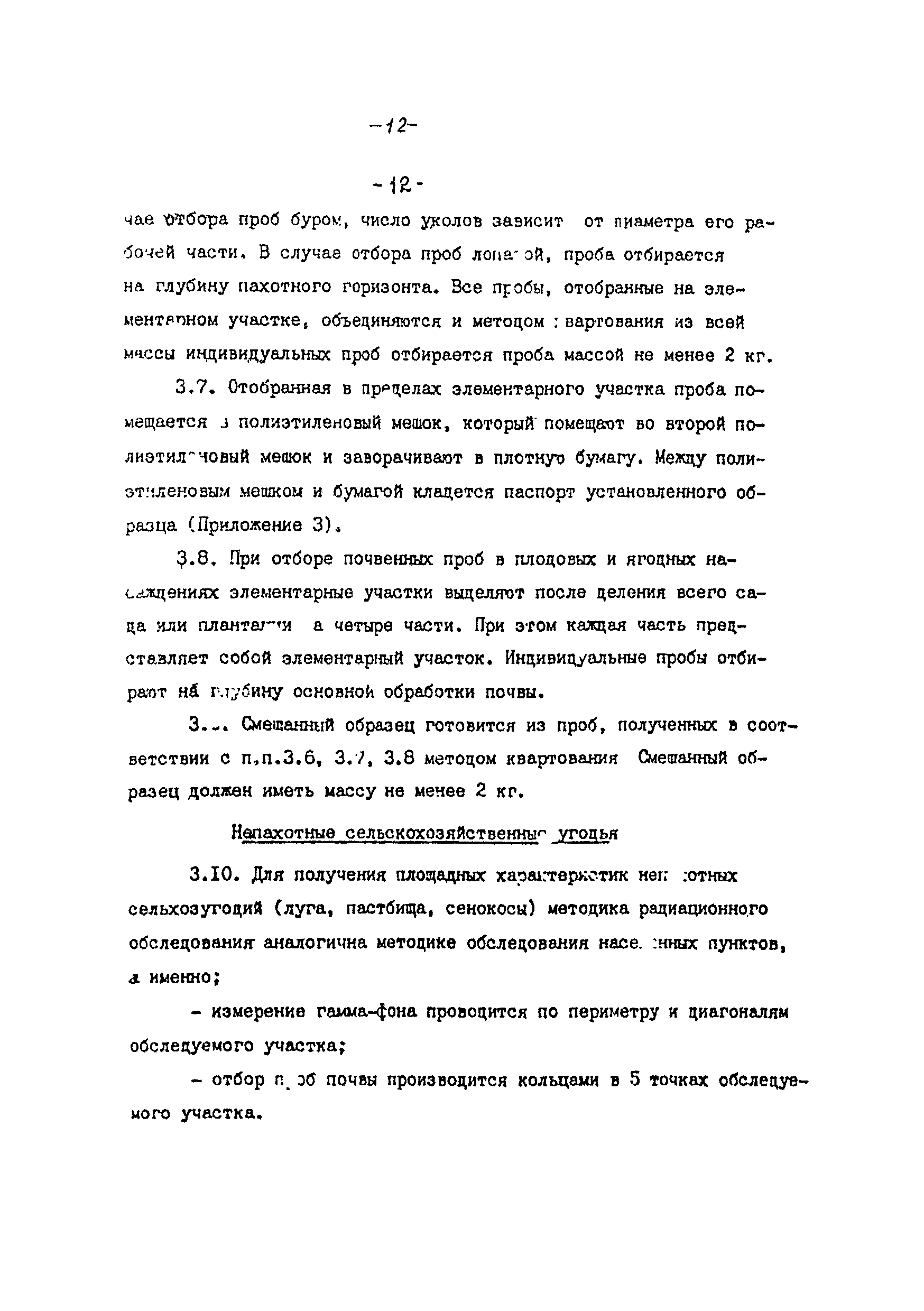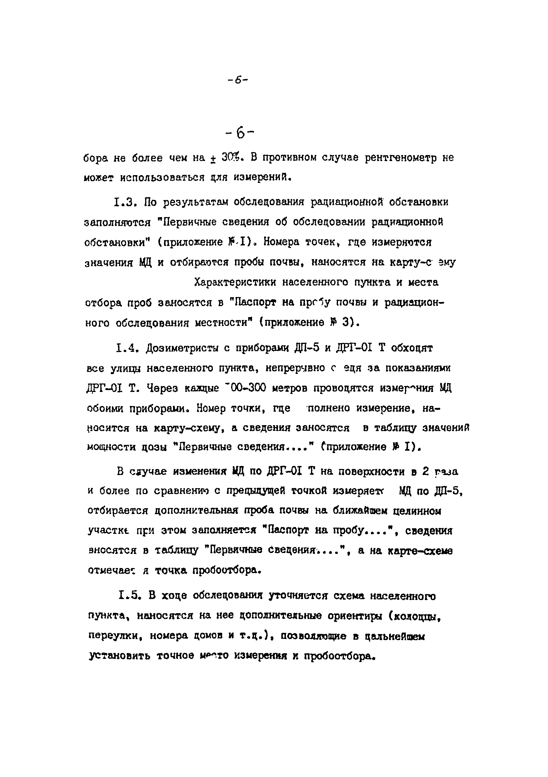 | Оглавление: | 1 Порядок обследования радиационной обстановки в населенном пункте 2 Отбор проб почвы в населенных пунктах для последующего анализа на содержание радионуклидов 3 Отбор проб почвы на сельскохозяйственных угодьях для последующего анализа на содержание радионуклидов 4 Методика изучения поля гамма-излучения для определения дозовых нагрузок на население в загрязненных районах Приложение 1. Первичные сведения об обследовании радиационной обстановки Приложение 3. Паспорт на пробу почвы и радиационного обследования местности Приложение 4. Таблица данных по изотопному составу почвы Приложение 5. Сопроводительный талон проб почв сельскохозяйственных угодий Приложение 6. Полевой журнал Приложение 7. Карточка уровней гамма-излучения в населенном пункте |