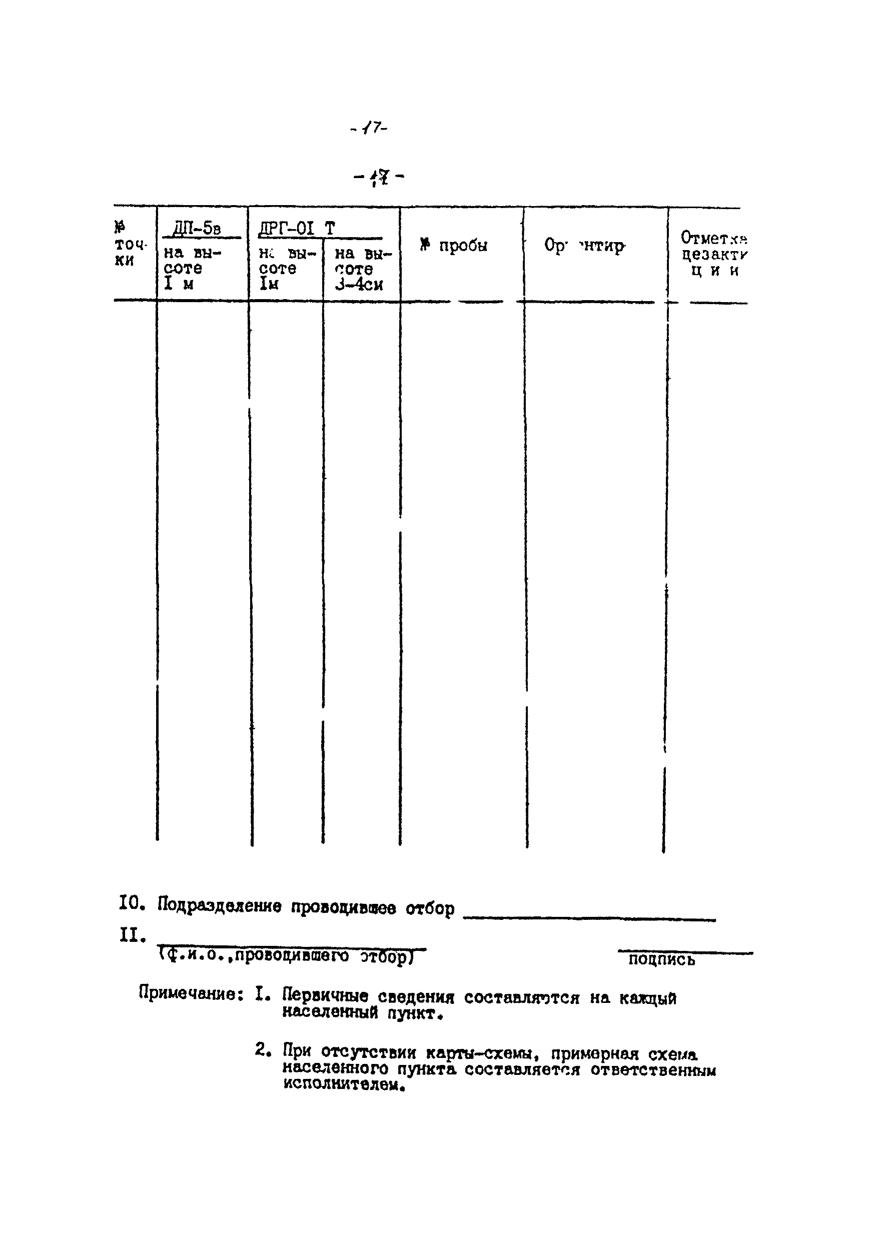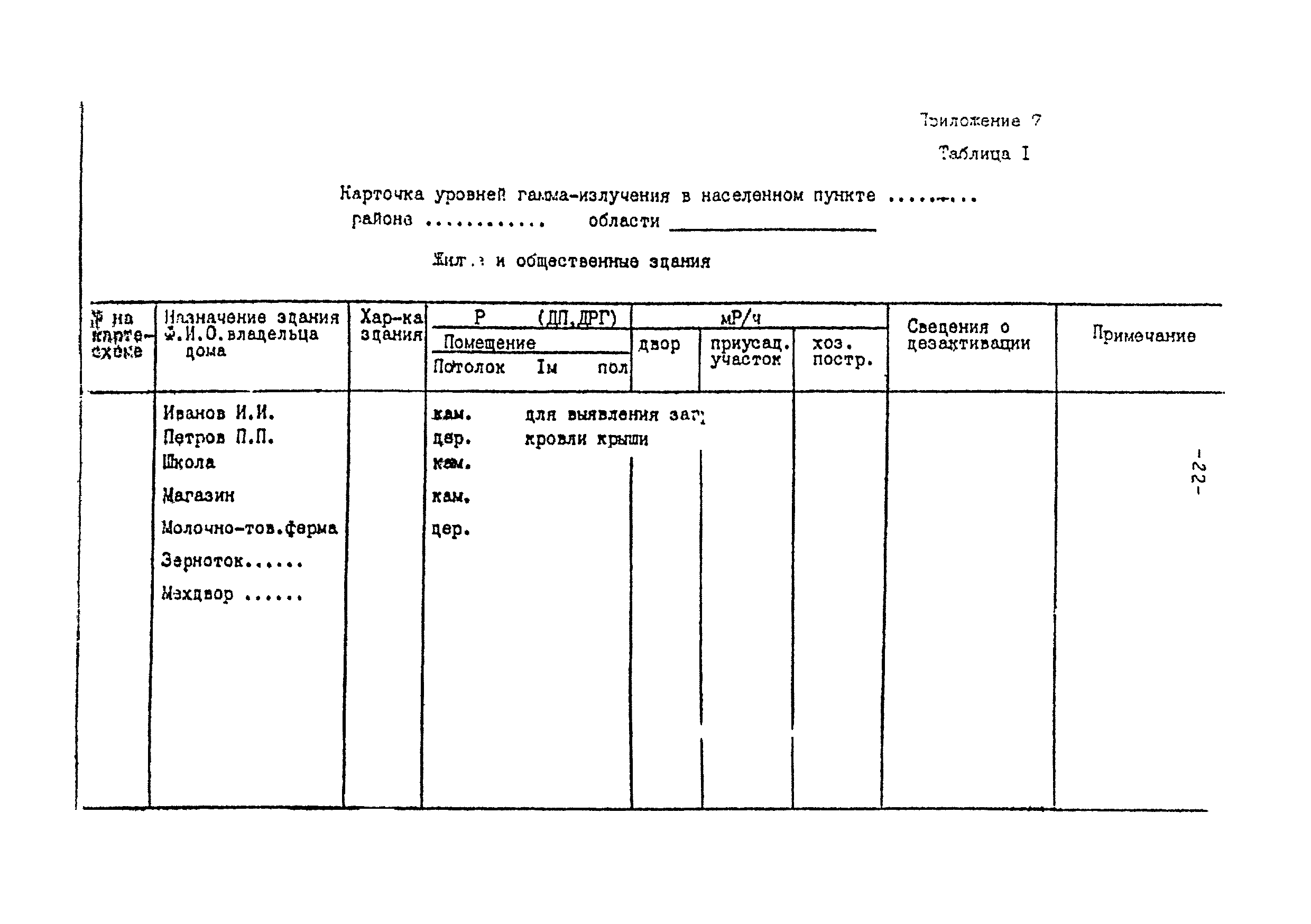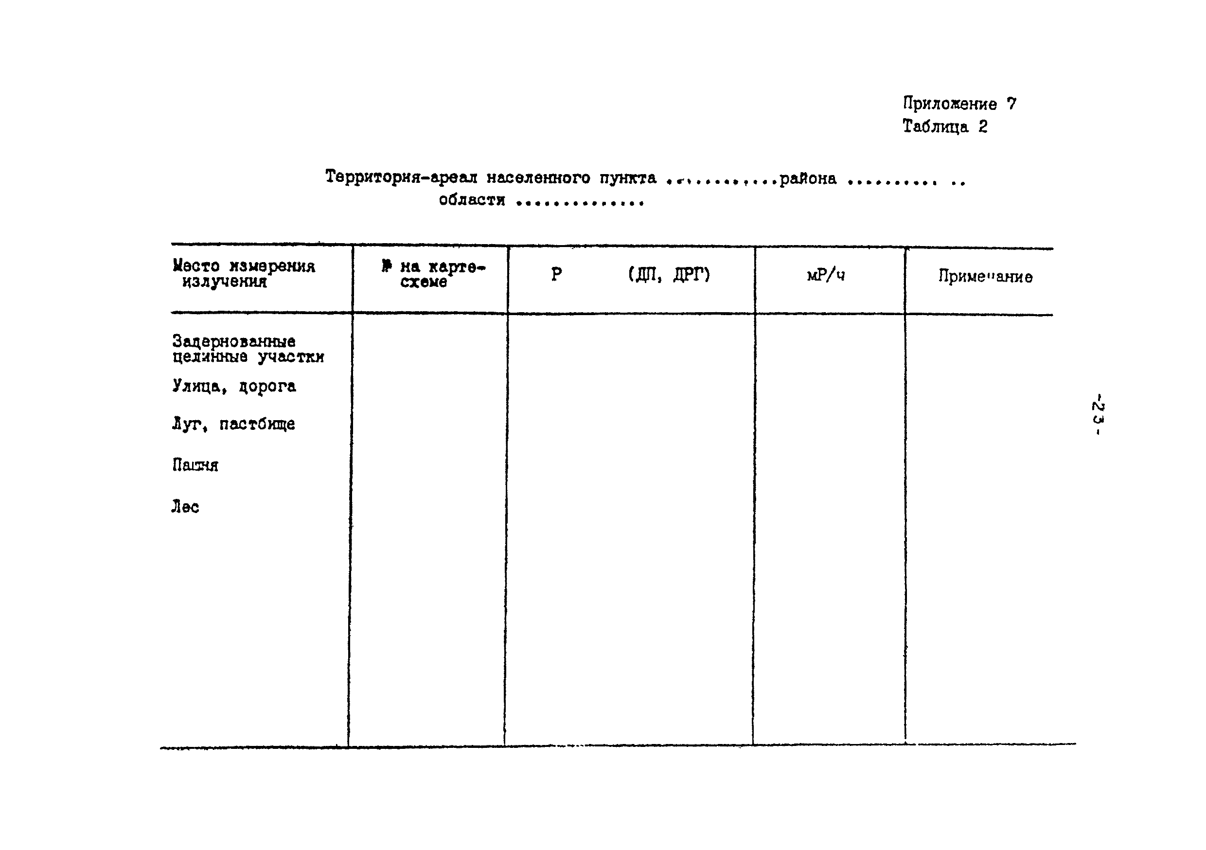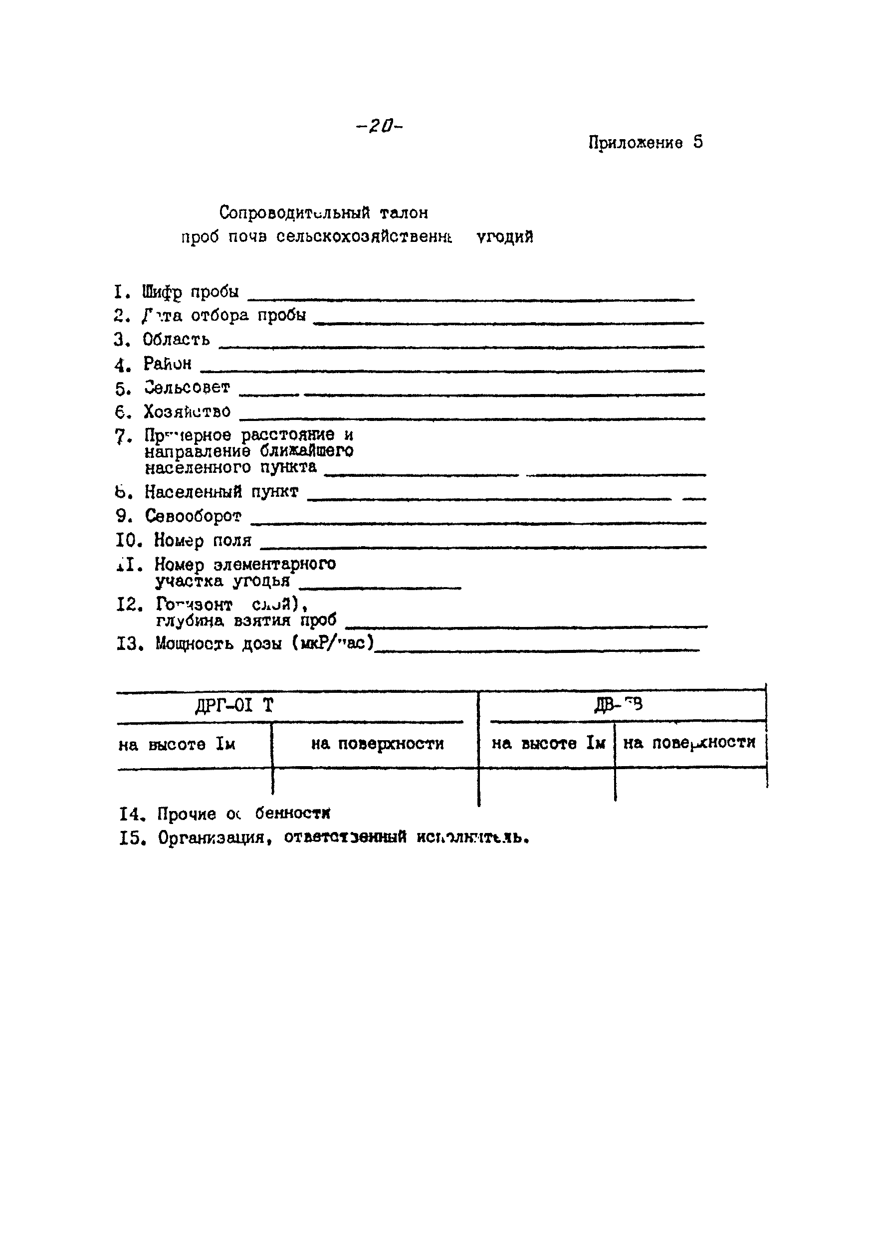 | Оглавление: | 1 Порядок обследования радиационной обстановки в населенном пункте 2 Отбор проб почвы в населенных пунктах для последующего анализа на содержание радионуклидов 3 Отбор проб почвы на сельскохозяйственных угодьях для последующего анализа на содержание радионуклидов 4 Методика изучения поля гамма-излучения для определения дозовых нагрузок на население в загрязненных районах Приложение 1. Первичные сведения об обследовании радиационной обстановки Приложение 3. Паспорт на пробу почвы и радиационного обследования местности Приложение 4. Таблица данных по изотопному составу почвы Приложение 5. Сопроводительный талон проб почв сельскохозяйственных угодий Приложение 6. Полевой журнал Приложение 7. Карточка уровней гамма-излучения в населенном пункте |