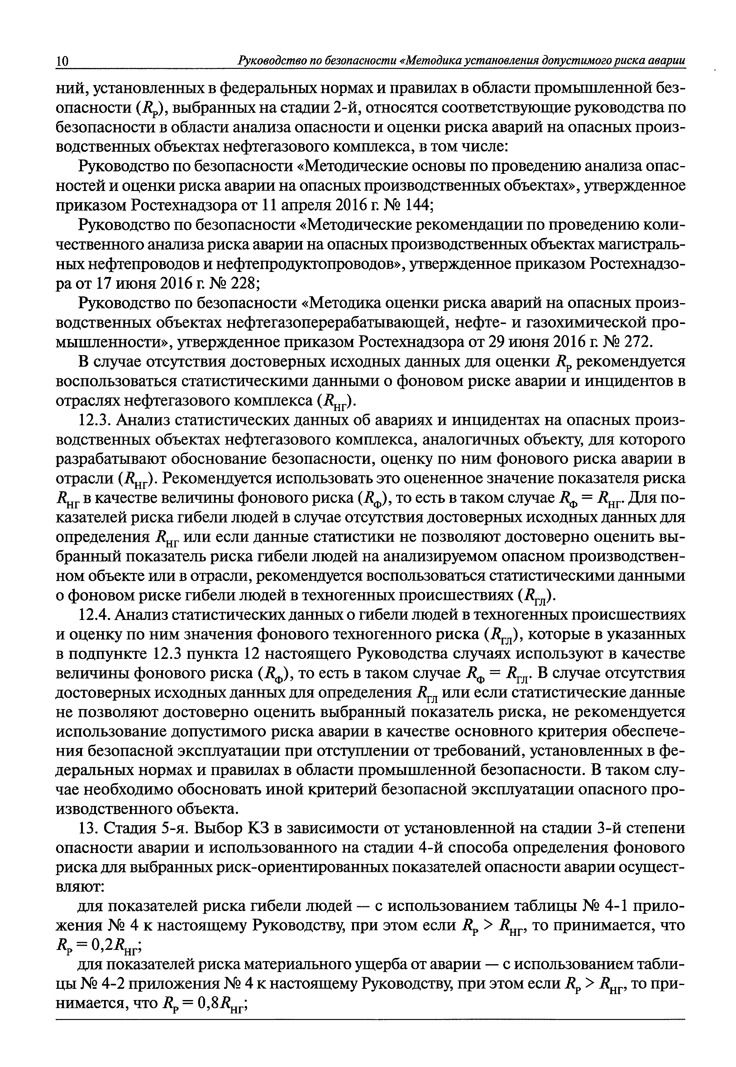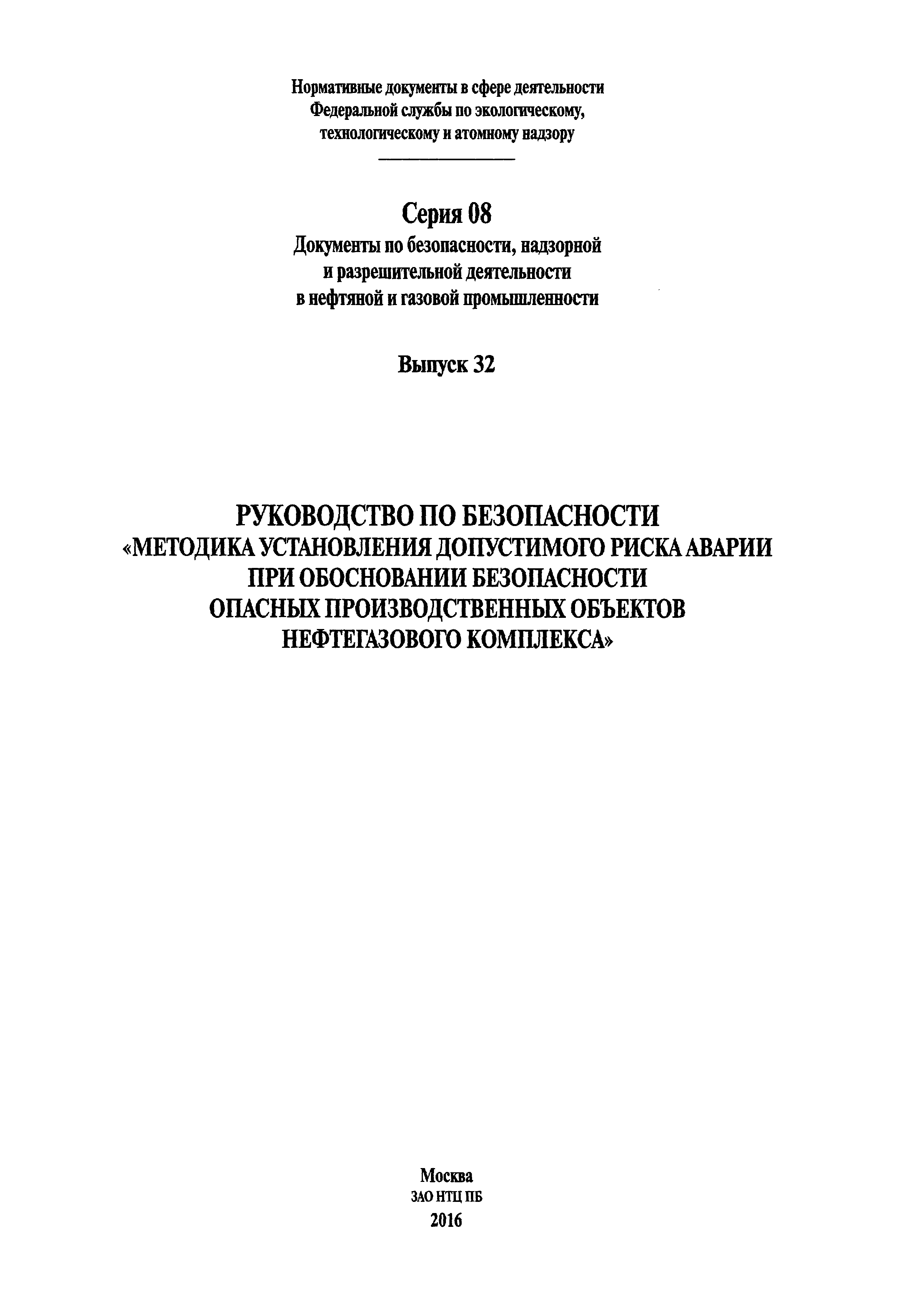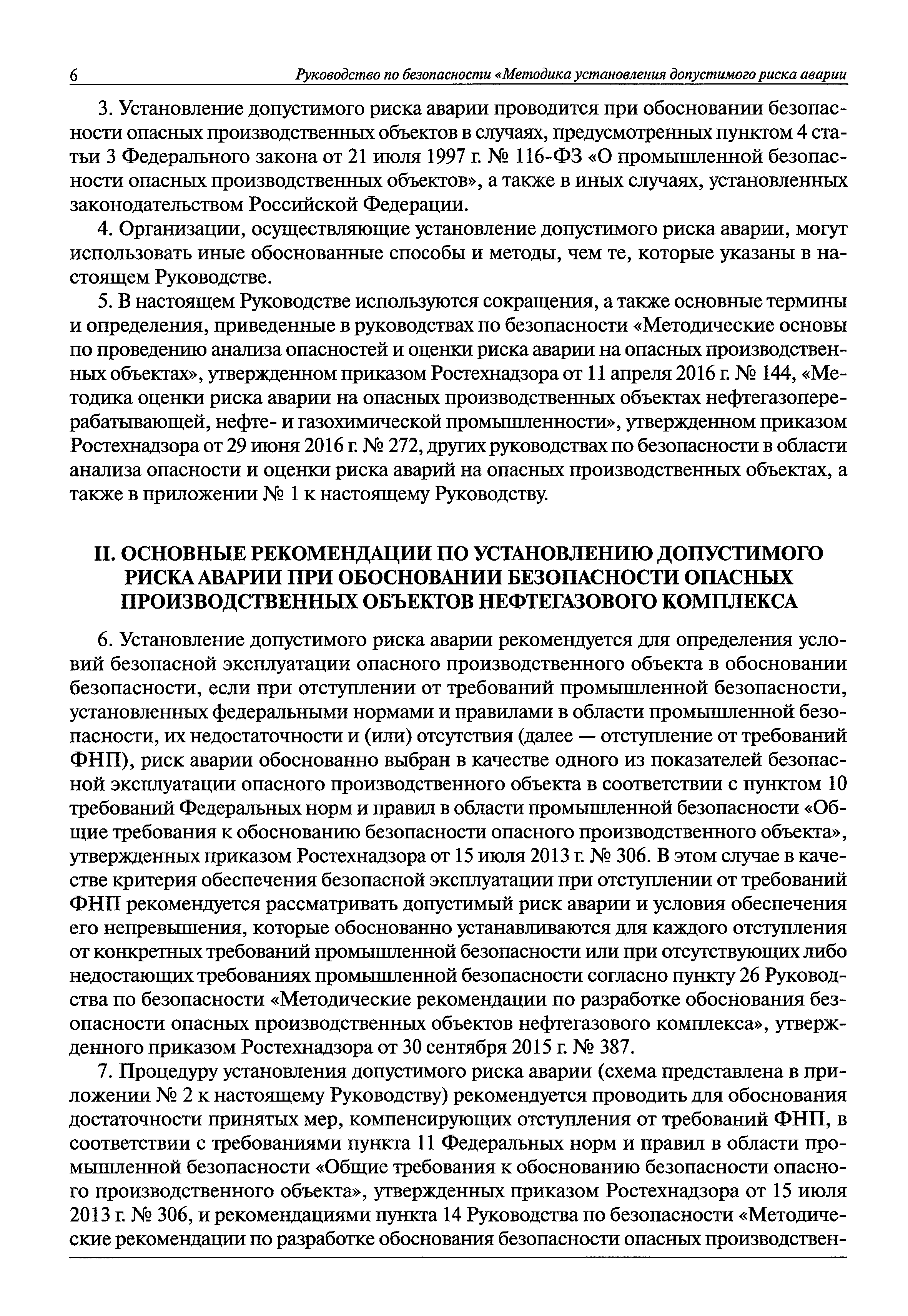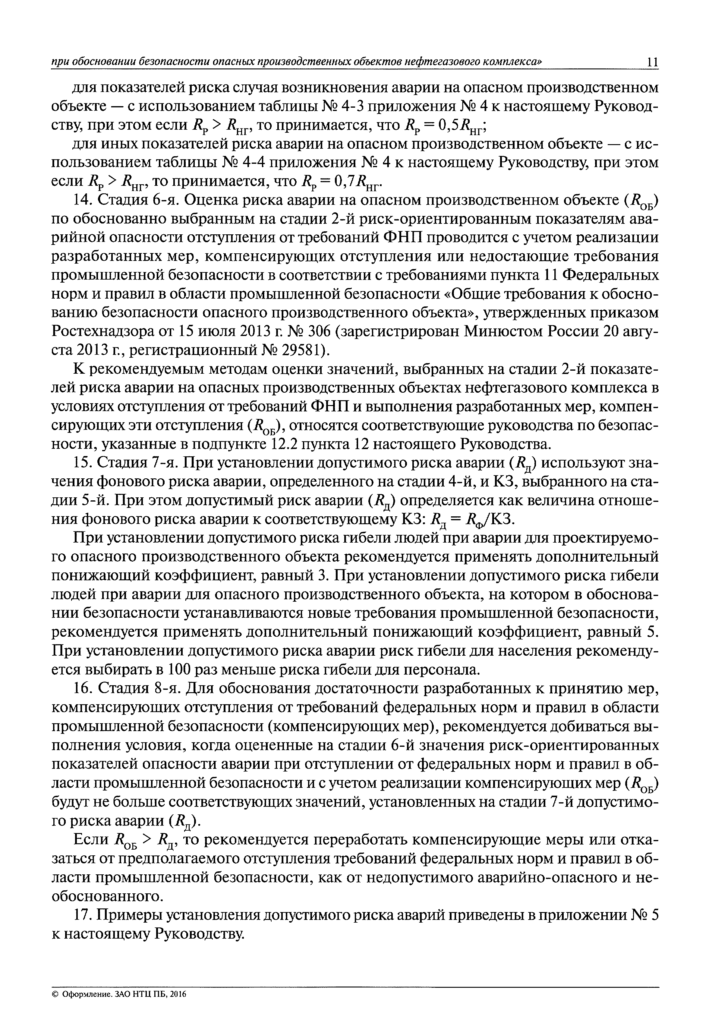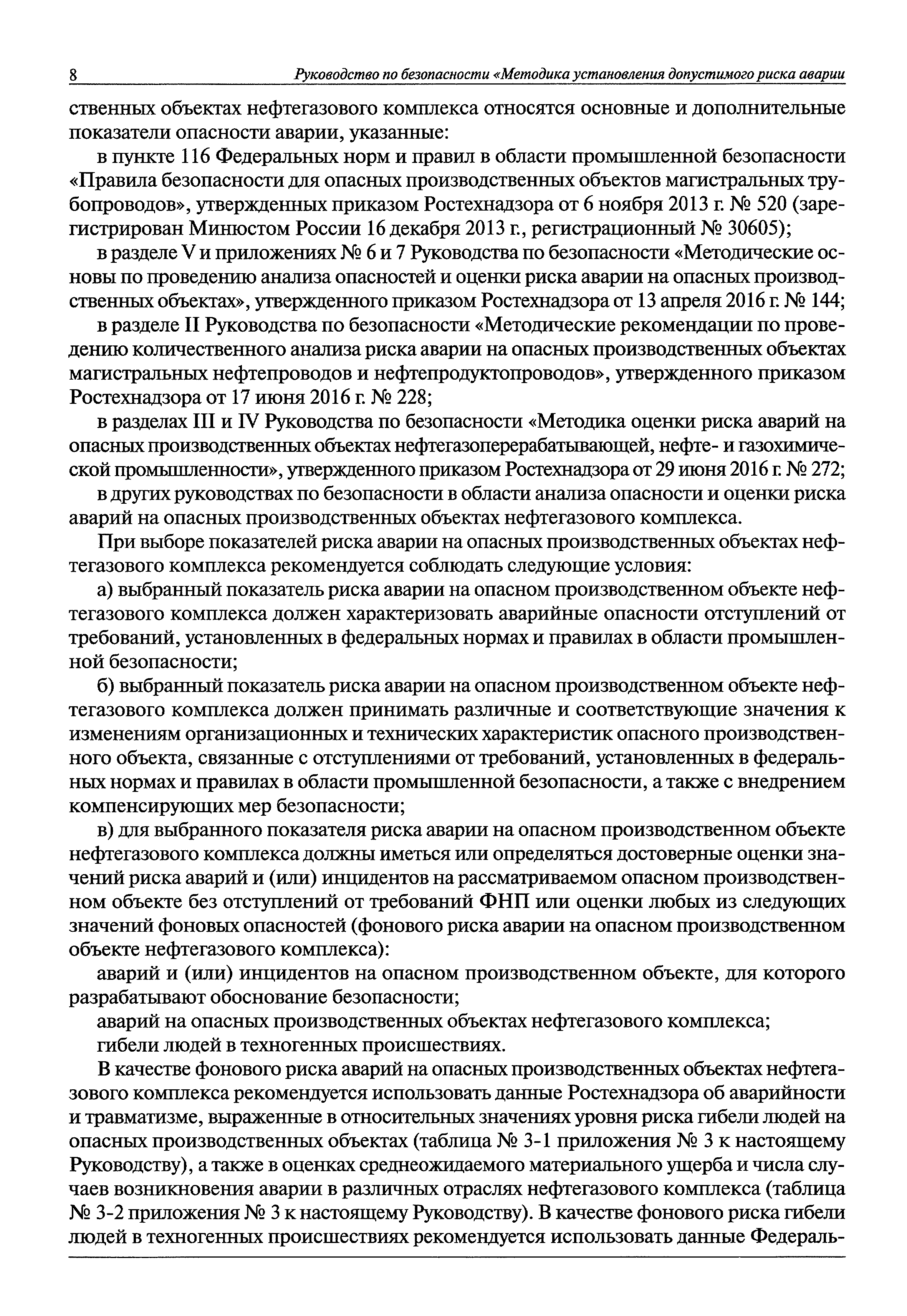 | Оглавление: | I. Общие положения II. Основные рекомендации по установлению допустимого риска аварии при обосновании безопасности опасных производственных объектов нефтегазового комплекса IV Рекомендации к процедуре установления допустимого риска аварии при обосновании безопасности опасных производственных объектов нефтегазового комплекс Приложение 1. Список терминов и сокращений Приложение 2. Схема процедуры установления допустимого риска аварии при обосновании безопасности опасных производственных объектов нефтегазового комплекса Приложение 3. Таблицы фоновых рисков Приложение 4. Таблицы коэффициентов запаса Приложение 5. Примеры установления допустимого риска аварии |
