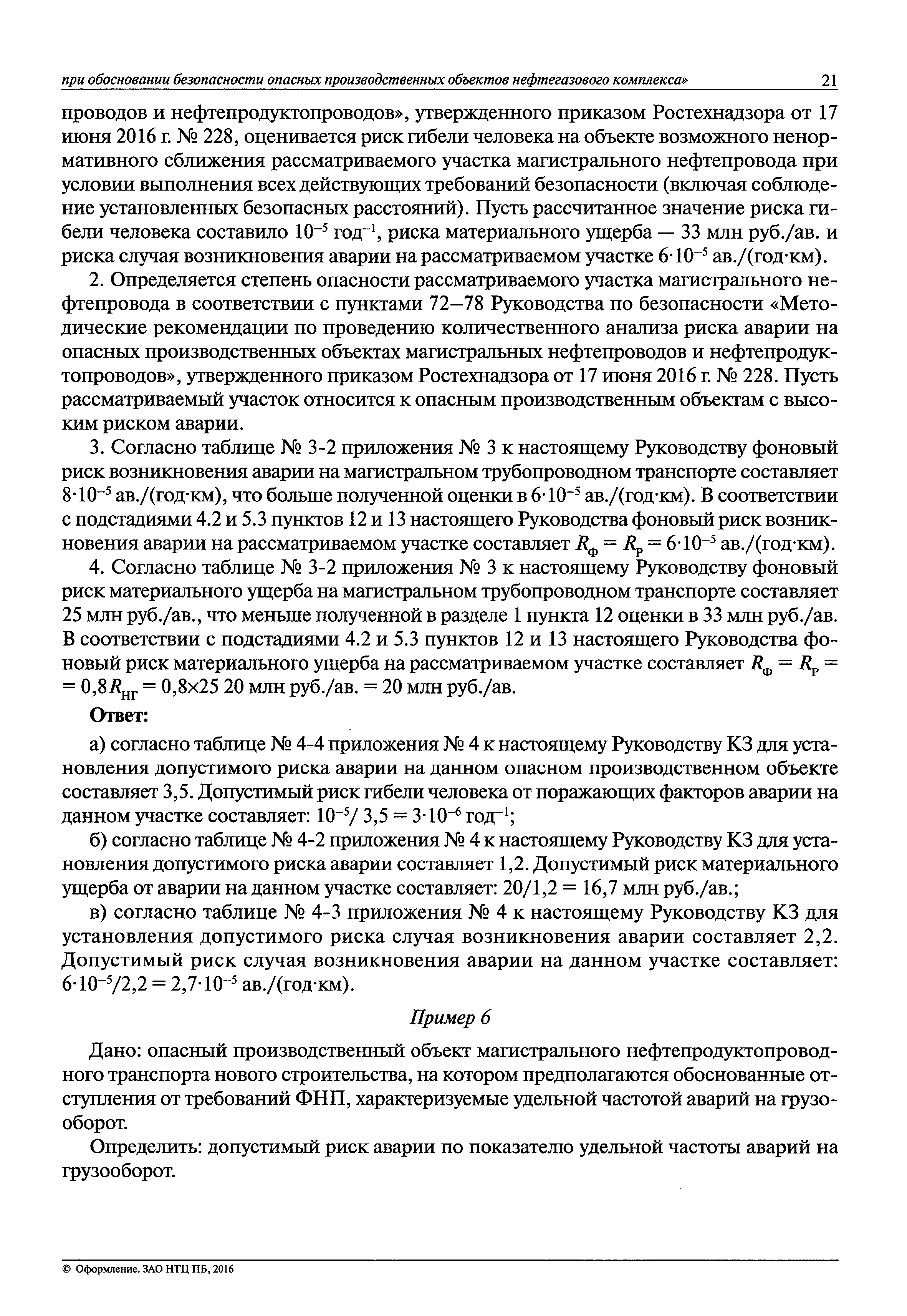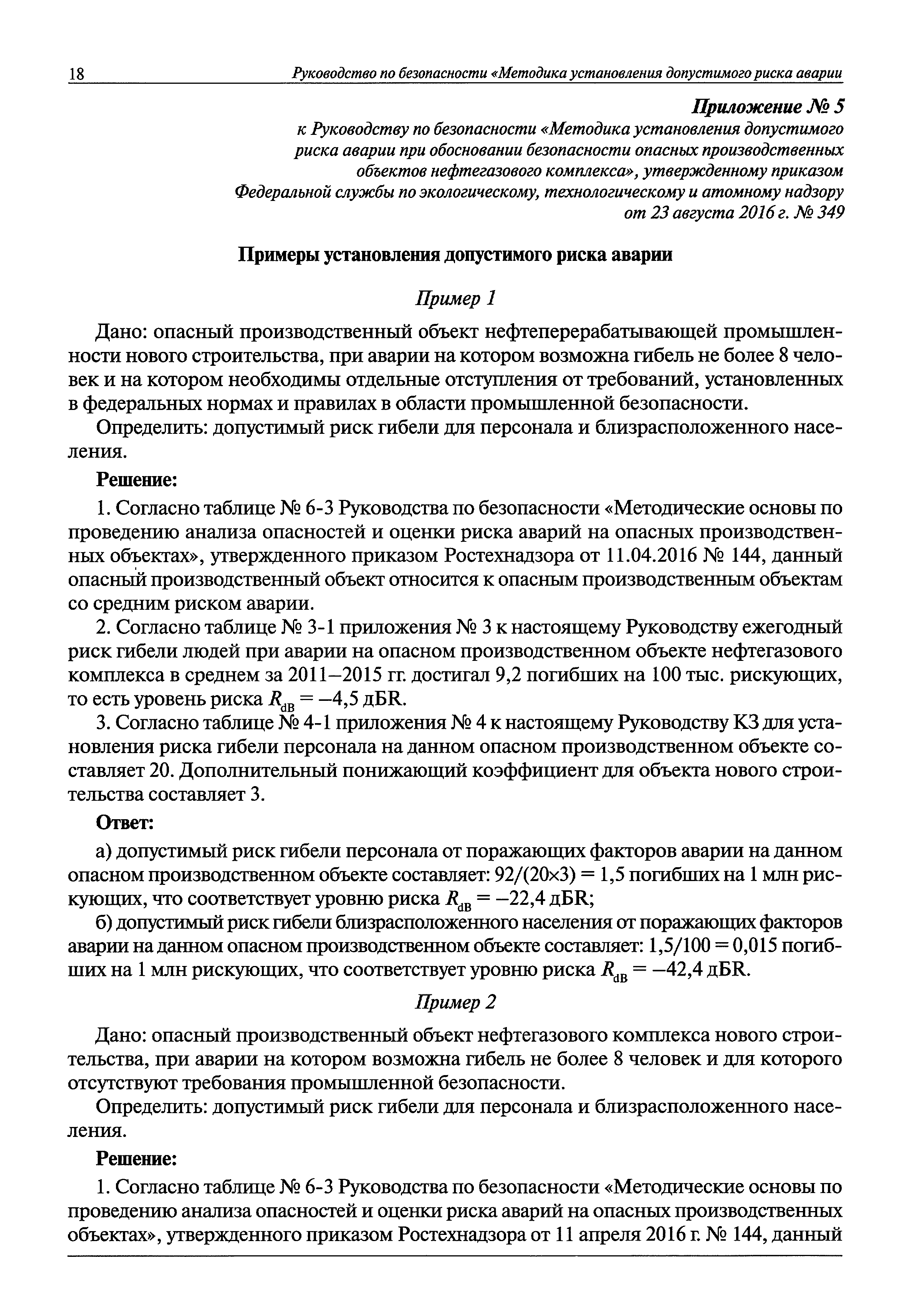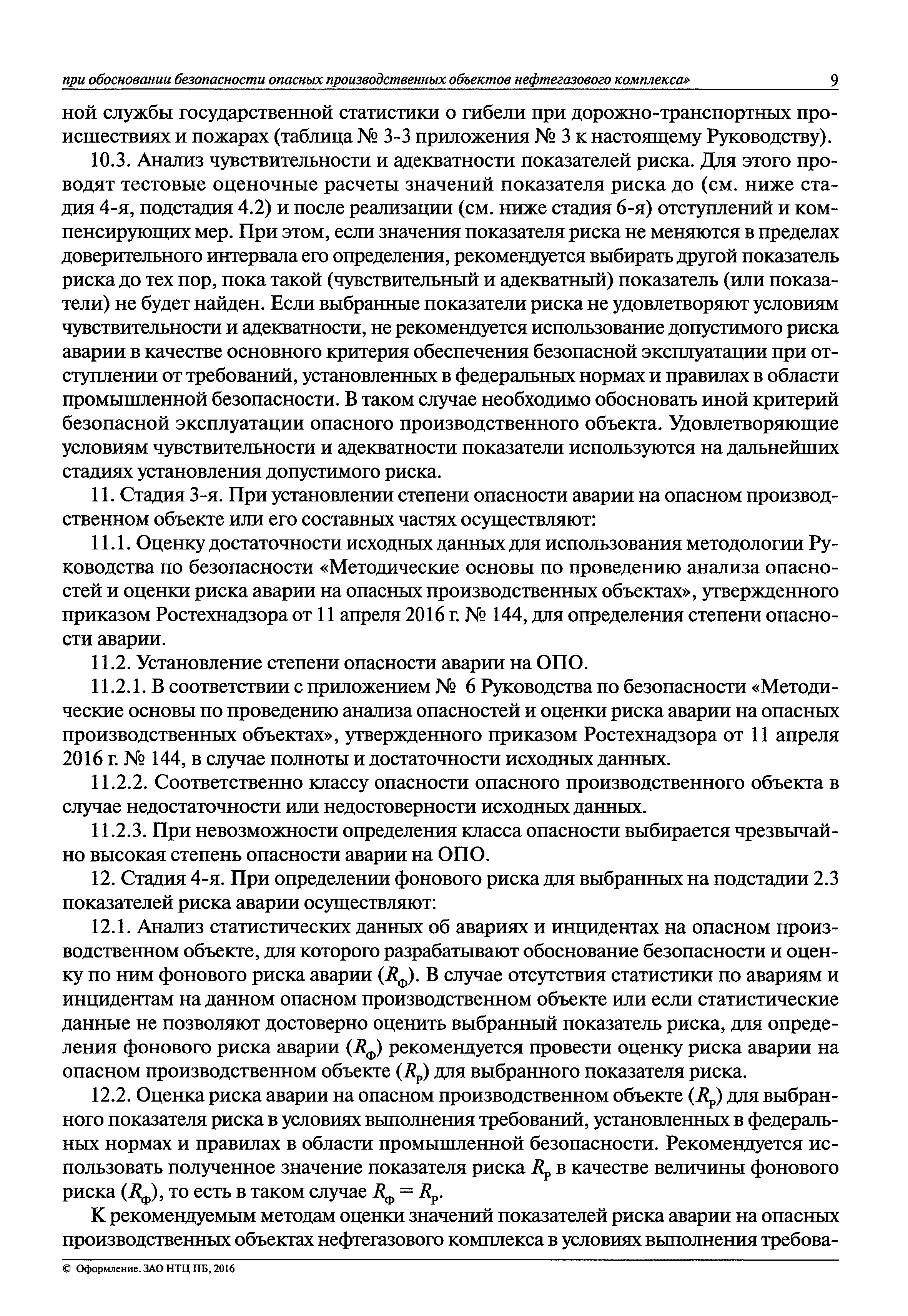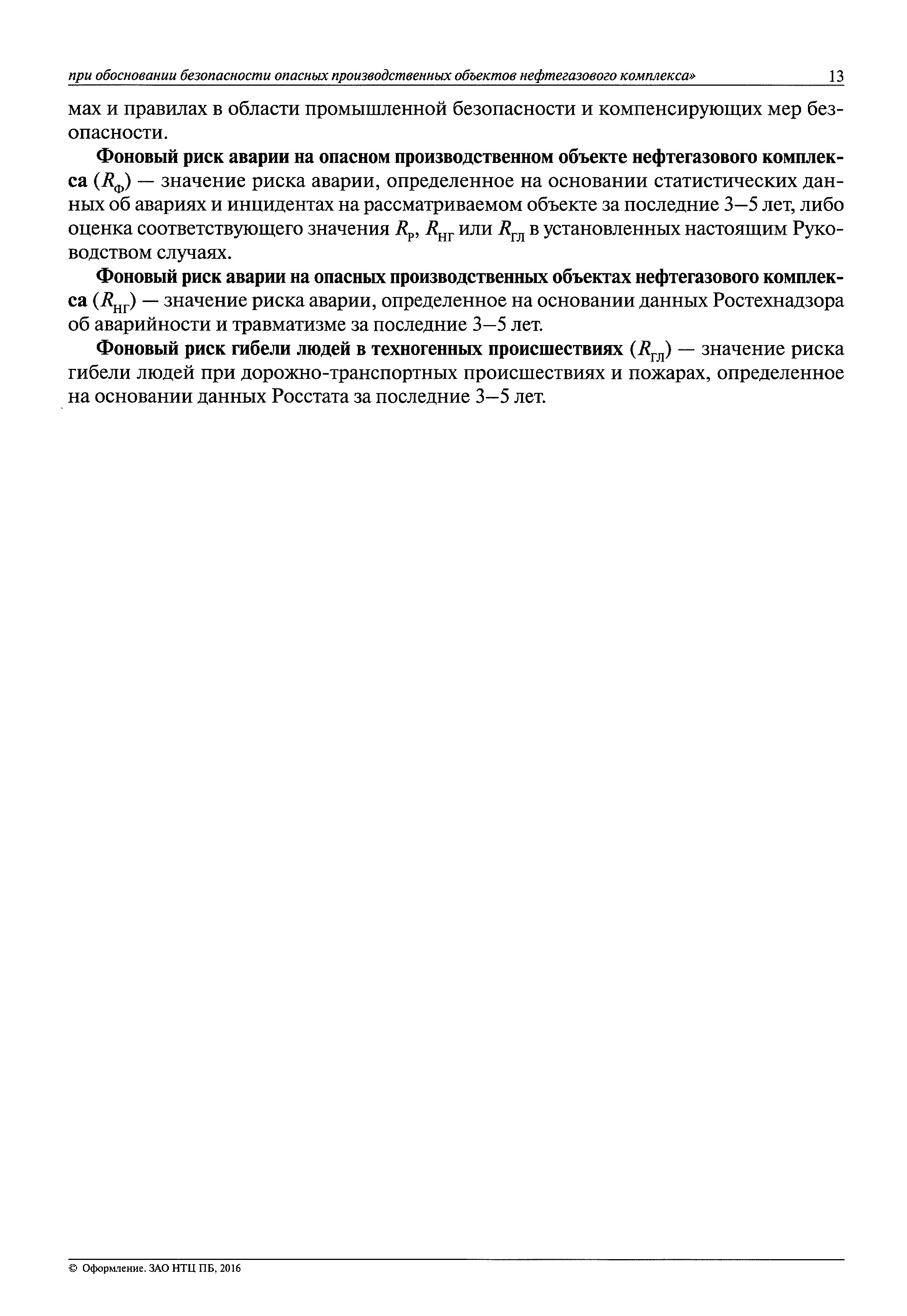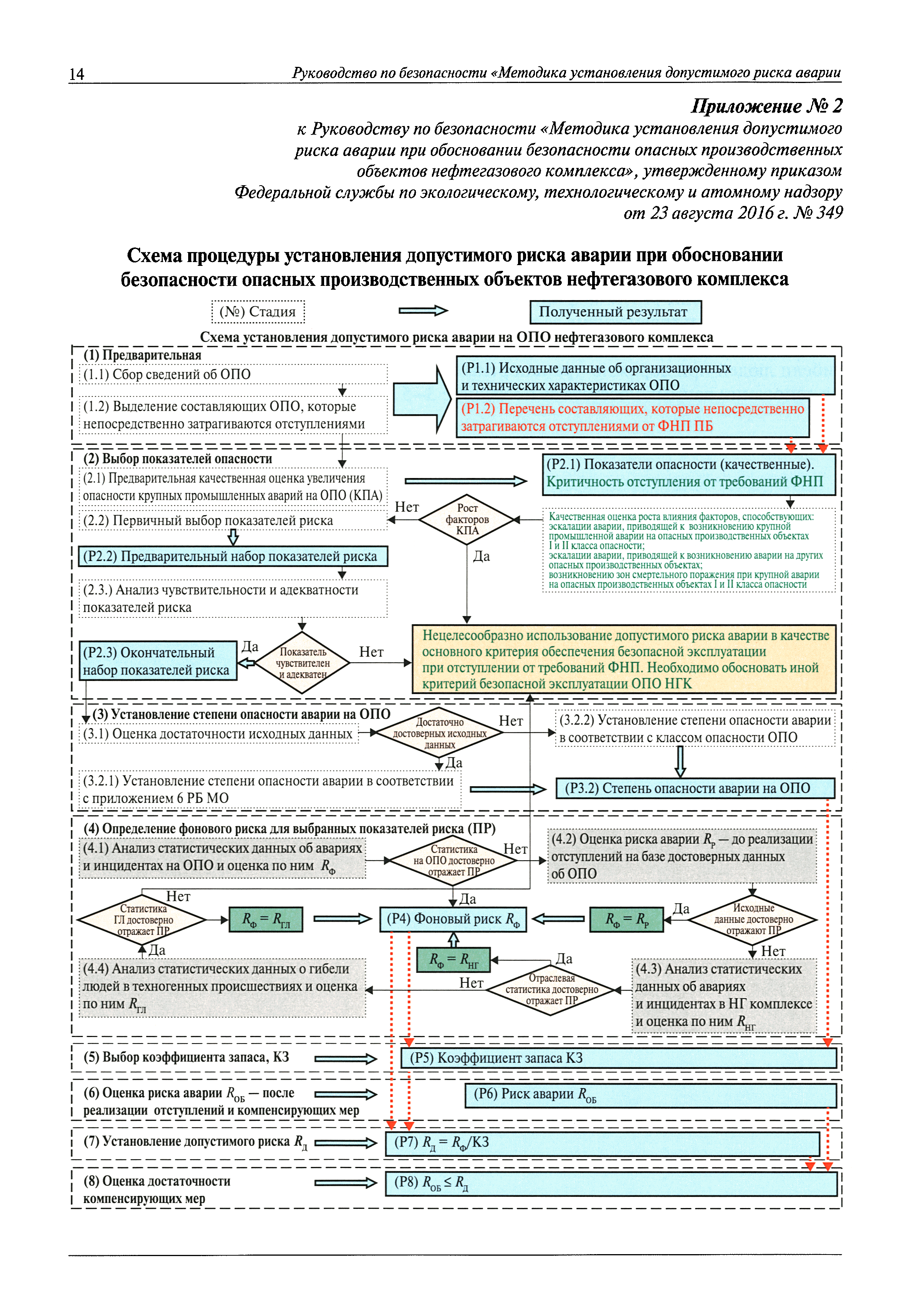 | Оглавление: | I. Общие положения II. Основные рекомендации по установлению допустимого риска аварии при обосновании безопасности опасных производственных объектов нефтегазового комплекса IV Рекомендации к процедуре установления допустимого риска аварии при обосновании безопасности опасных производственных объектов нефтегазового комплекс Приложение 1. Список терминов и сокращений Приложение 2. Схема процедуры установления допустимого риска аварии при обосновании безопасности опасных производственных объектов нефтегазового комплекса Приложение 3. Таблицы фоновых рисков Приложение 4. Таблицы коэффициентов запаса Приложение 5. Примеры установления допустимого риска аварии |