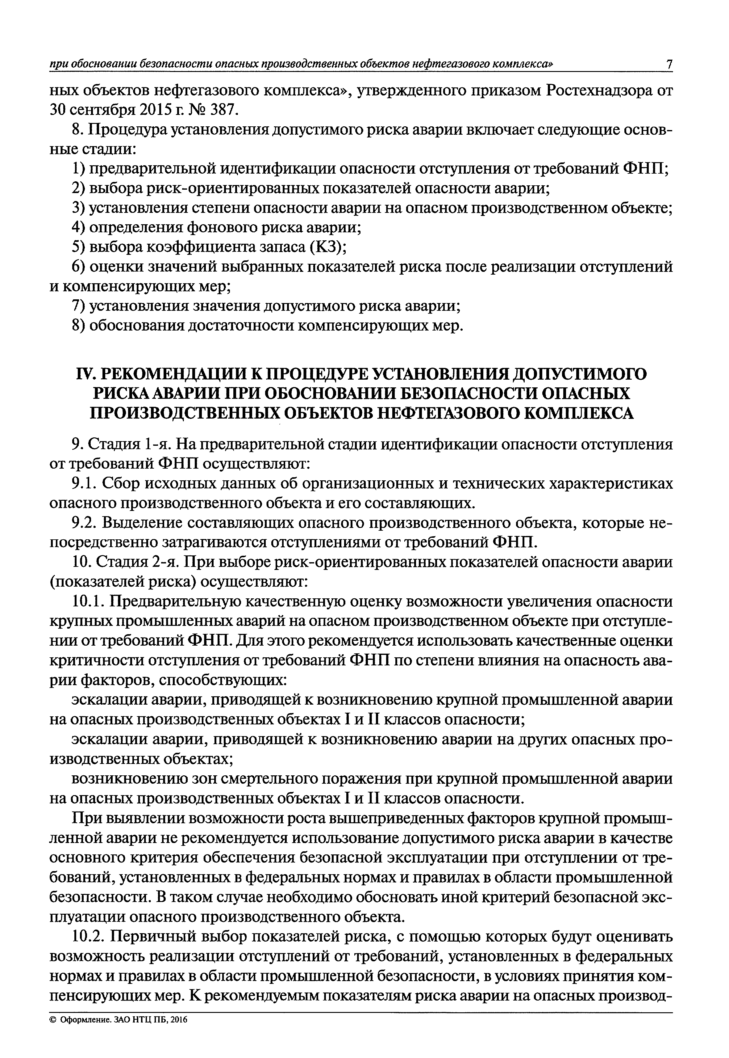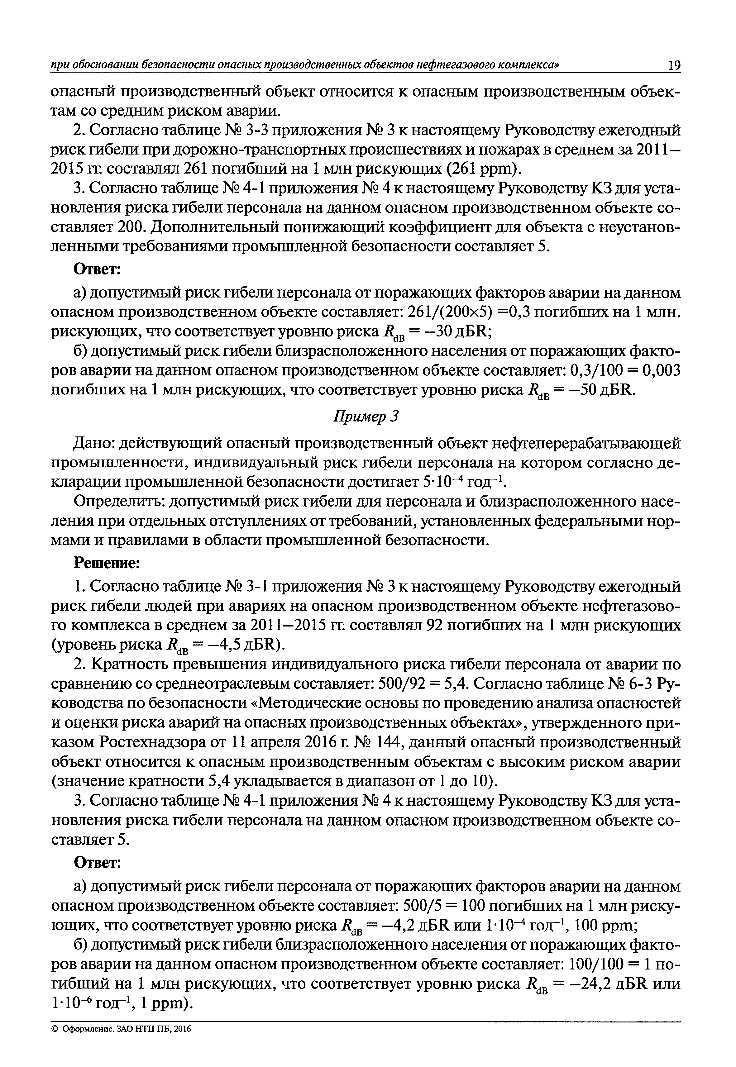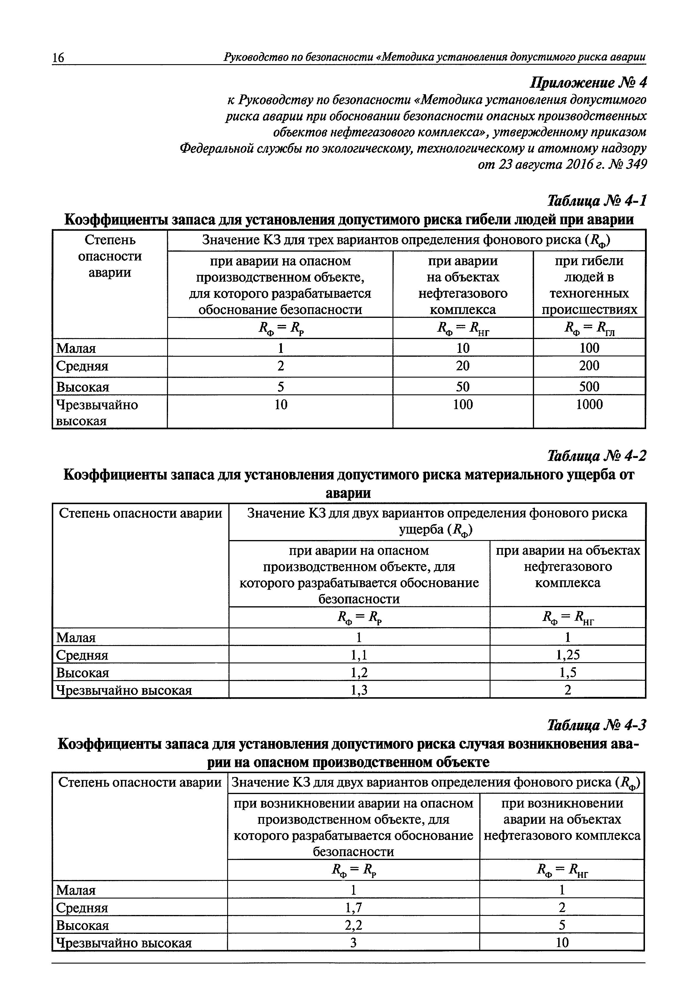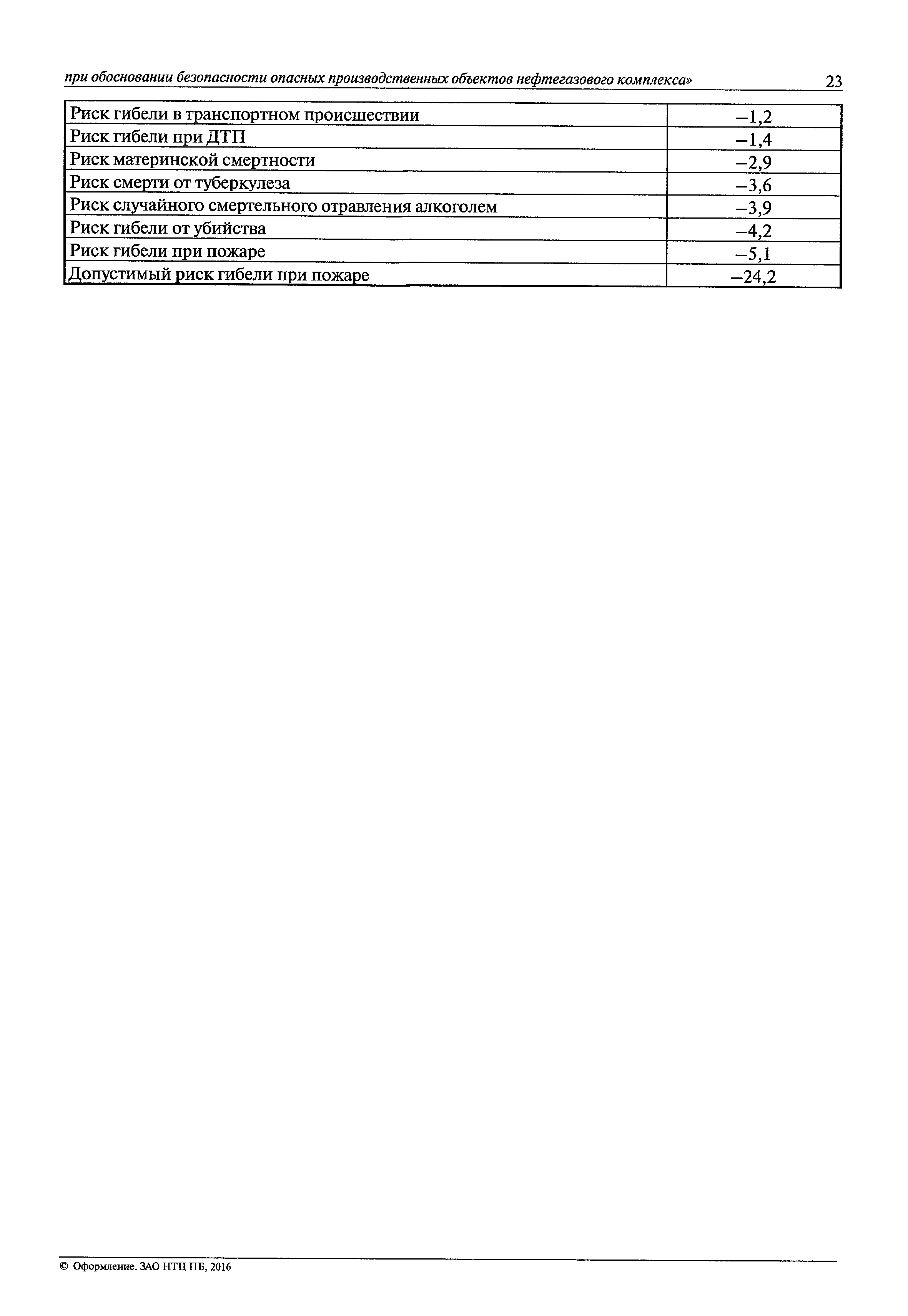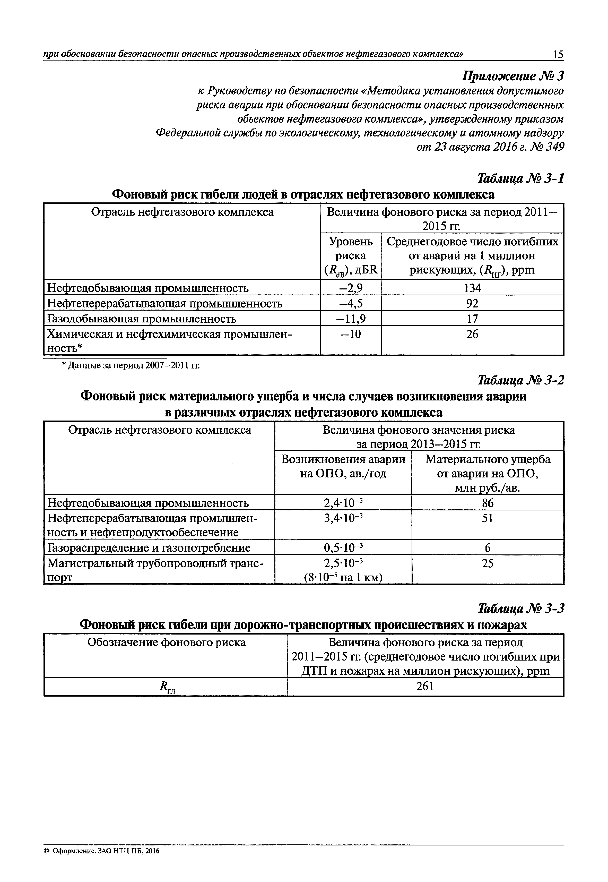 | Оглавление: | I. Общие положения II. Основные рекомендации по установлению допустимого риска аварии при обосновании безопасности опасных производственных объектов нефтегазового комплекса IV Рекомендации к процедуре установления допустимого риска аварии при обосновании безопасности опасных производственных объектов нефтегазового комплекс Приложение 1. Список терминов и сокращений Приложение 2. Схема процедуры установления допустимого риска аварии при обосновании безопасности опасных производственных объектов нефтегазового комплекса Приложение 3. Таблицы фоновых рисков Приложение 4. Таблицы коэффициентов запаса Приложение 5. Примеры установления допустимого риска аварии |