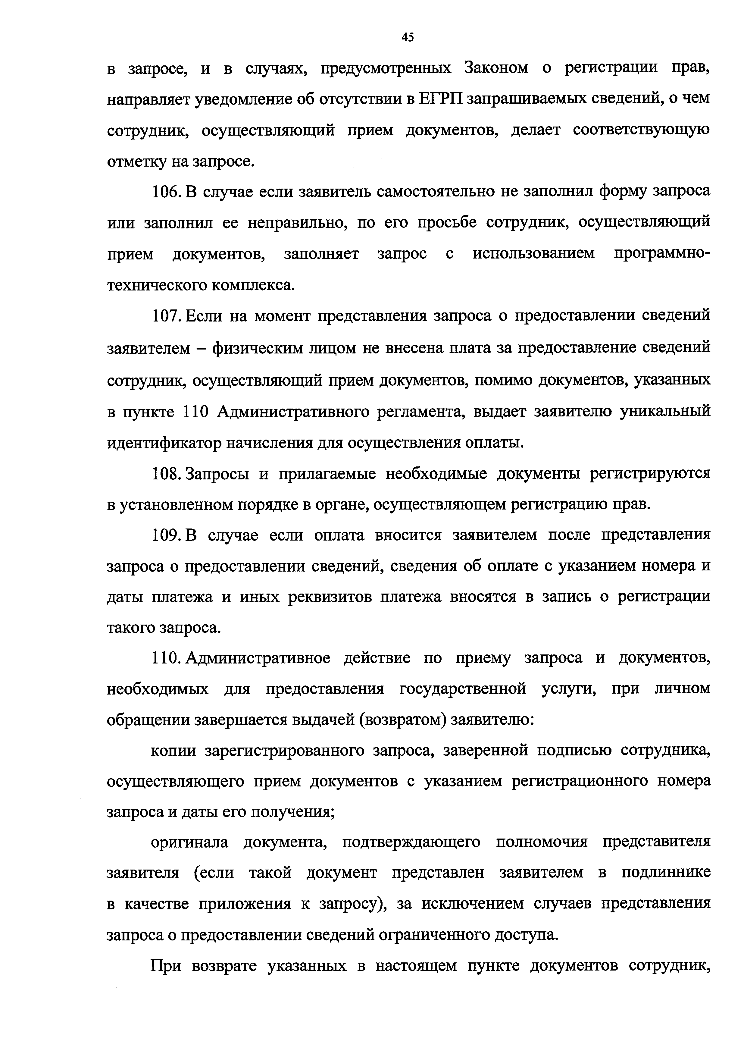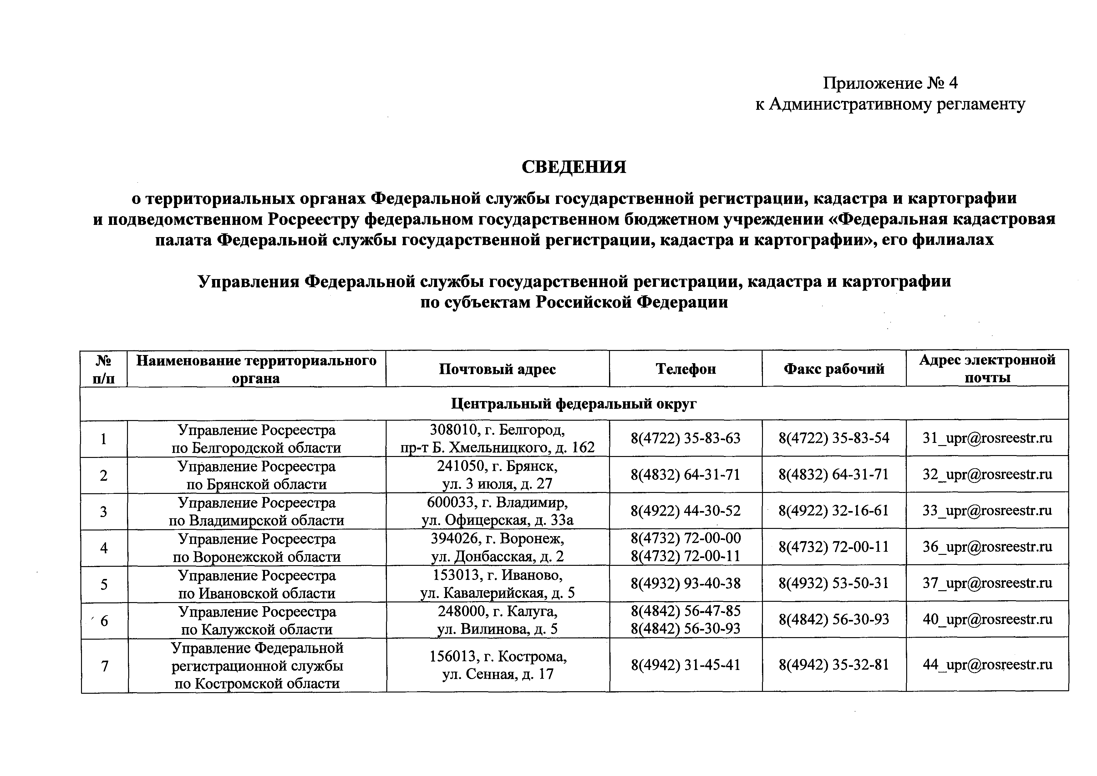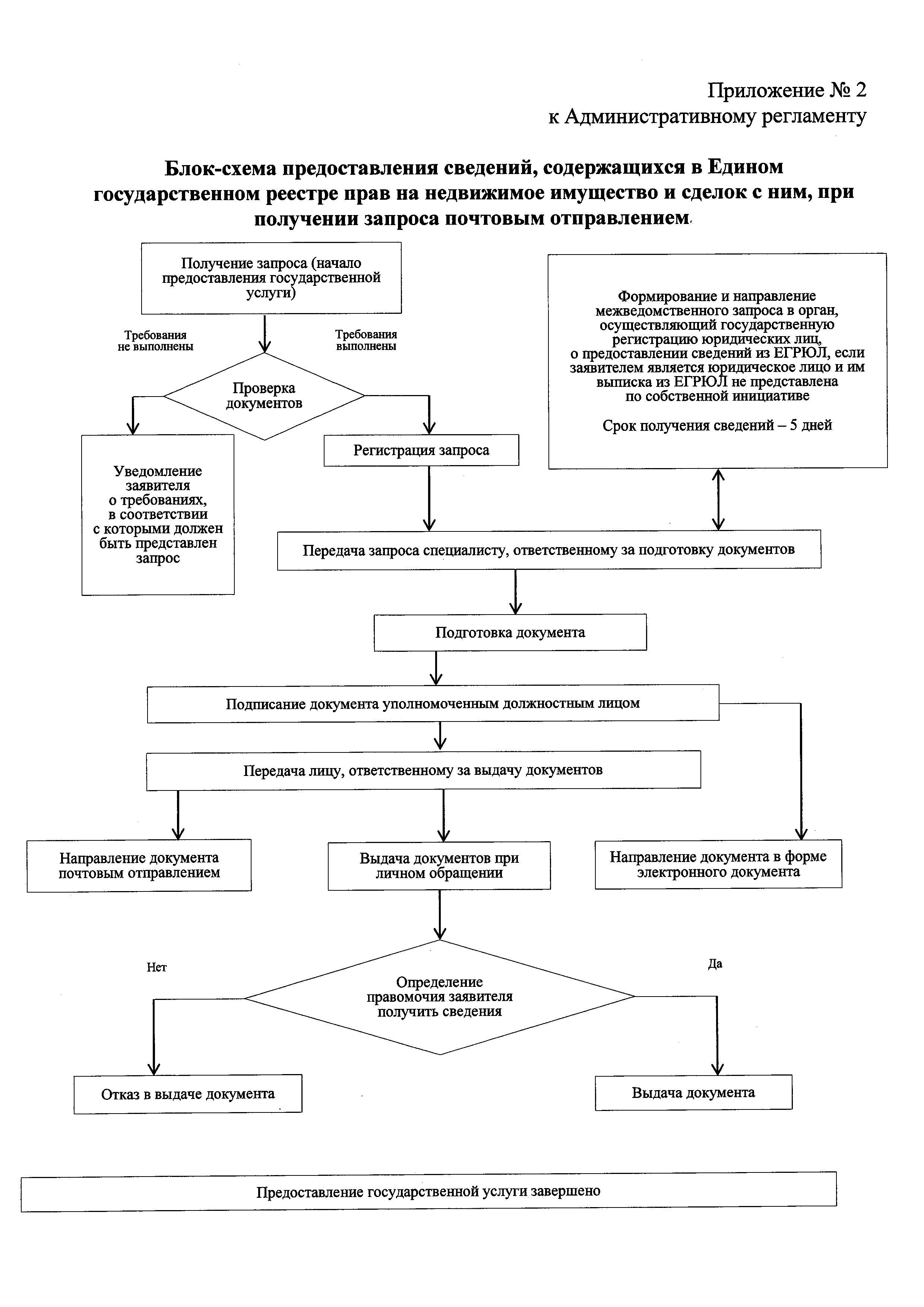 | Оглавление: | I. Общие положения II. Стандарт предоставления государственной услуги III. Состав, последовательность и сроки выполнения административных процедур по предоставлению государственной услуги, требования к порядку их выполнения, в том числе особенности выполнения административных процедур в электронной форме IV. Формы контроля за исполнением Административного регламента V. Досудебный (внесудебный) порядок обжалования действий (бездействия) и решений органа, предоставляющего государственную услугу, а также его должностных лиц Приложение № 1. Блок-схема предоставления сведений, содержащихся в Едином государственном реестре прав на недвижимое имущество и сделок с ним, при получении запроса при личном обращении заявителя Приложение № 2. Блок-схема предоставления сведений, содержащихся в Едином государственном реестре прав на недвижимое имущество и сделок с ним, при получении запроса почтовым отправлением Приложение № 3. Блок-схема предоставления сведений, содержащихся в Едином государственном реестре прав на недвижимое имущество и сделок с ним, при получении запроса в виде электронного документа Приложение № 4. Сведения о территориальных органах Федеральной службы государственной регистрации, кадастра и картографии и подведомственном Росреестру федеральном государственном бюджетном учреждении "Федеральная кадастровая палата Федеральной службы государственной регистрации, кадастра и картографии", его филиалах |