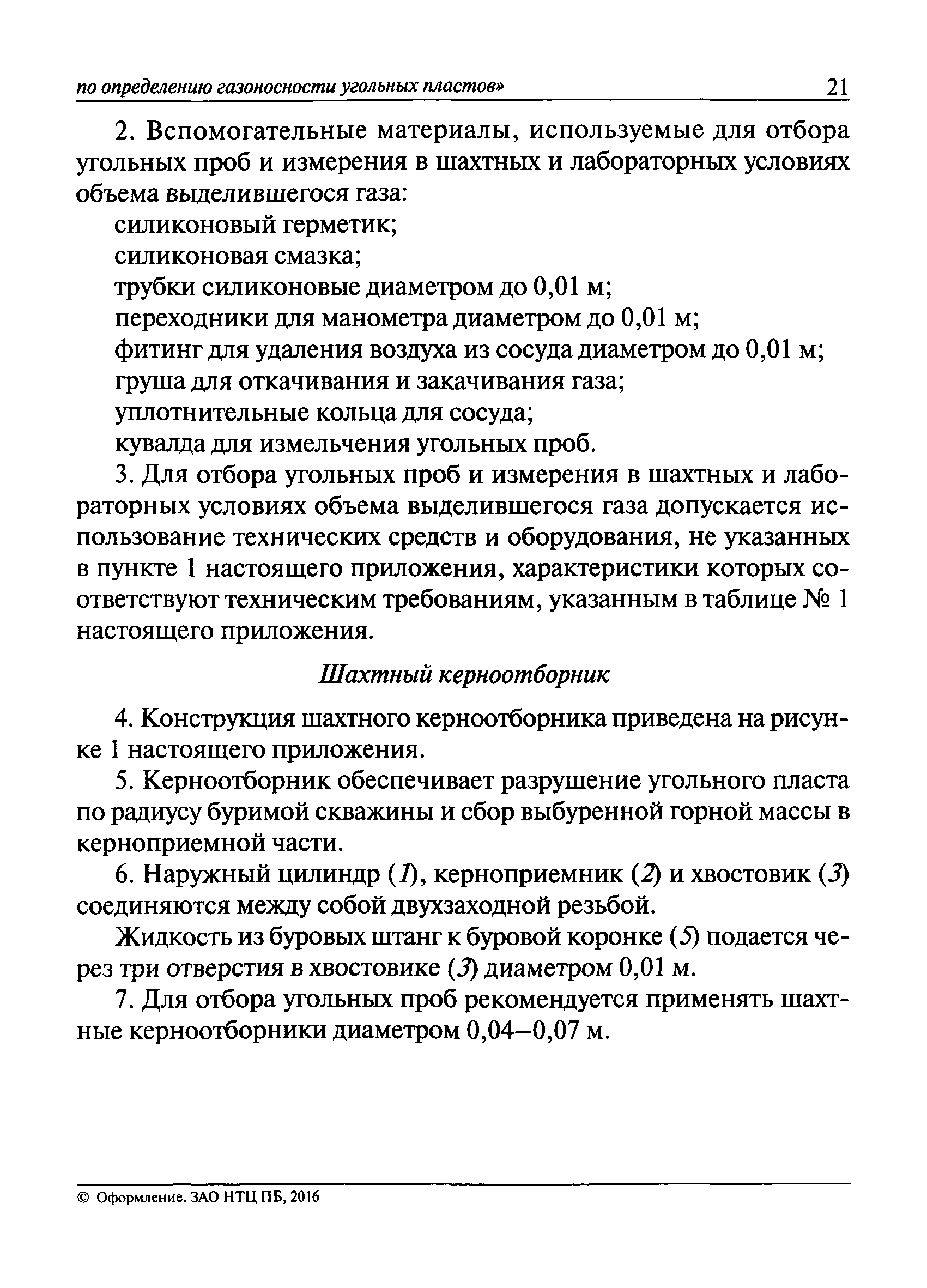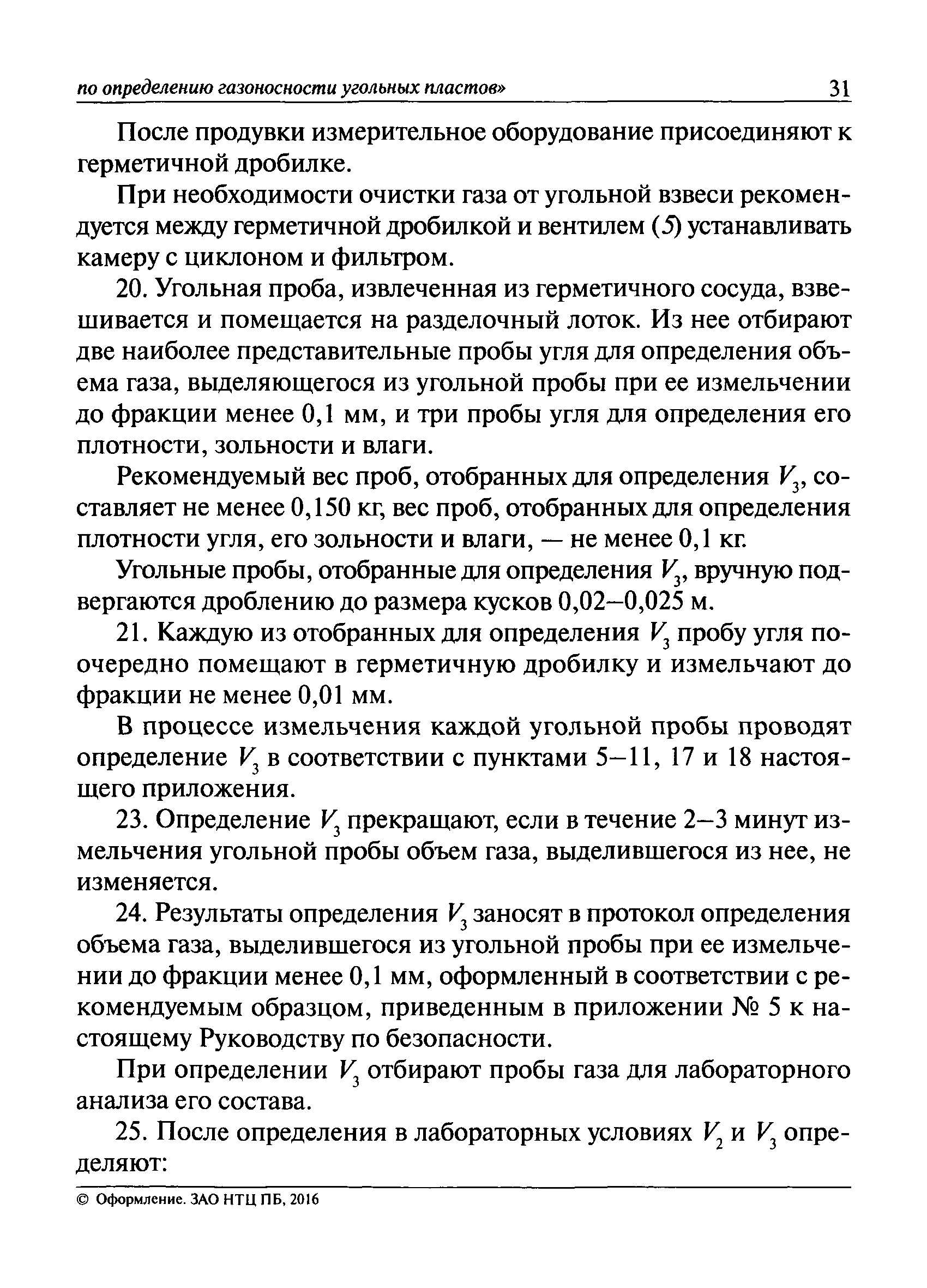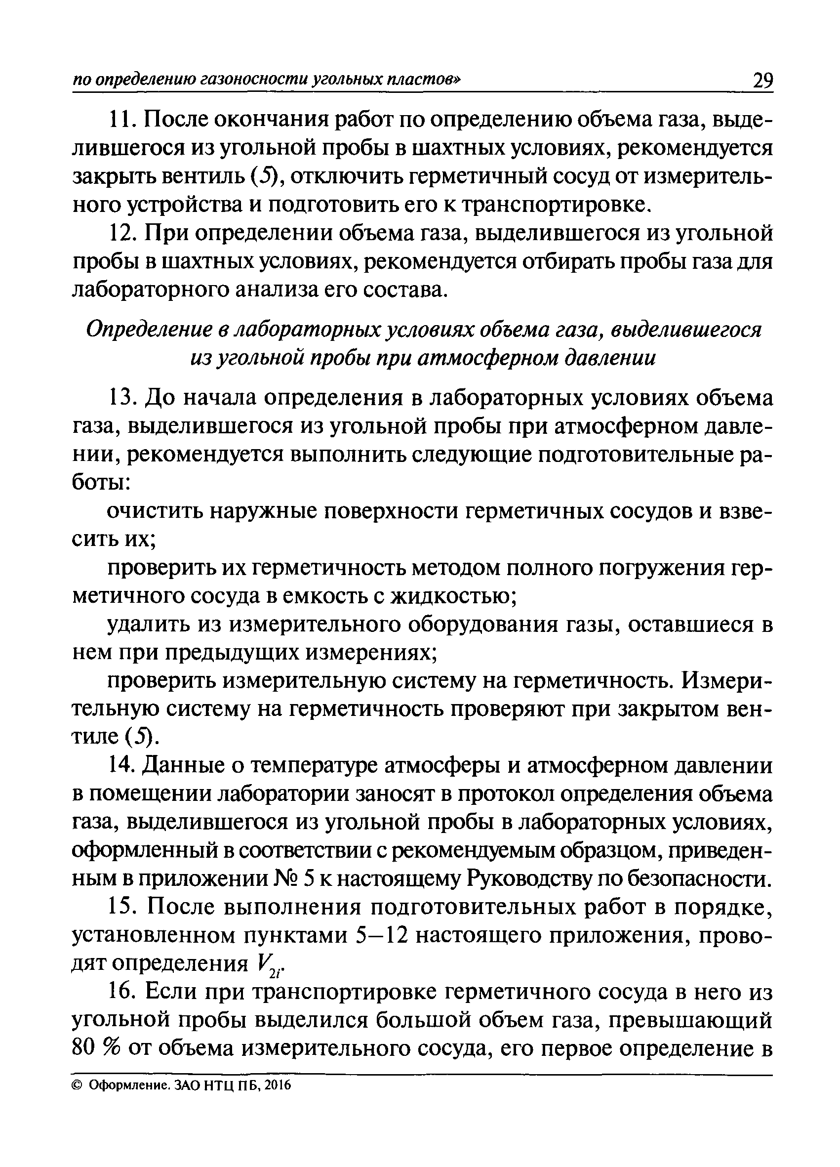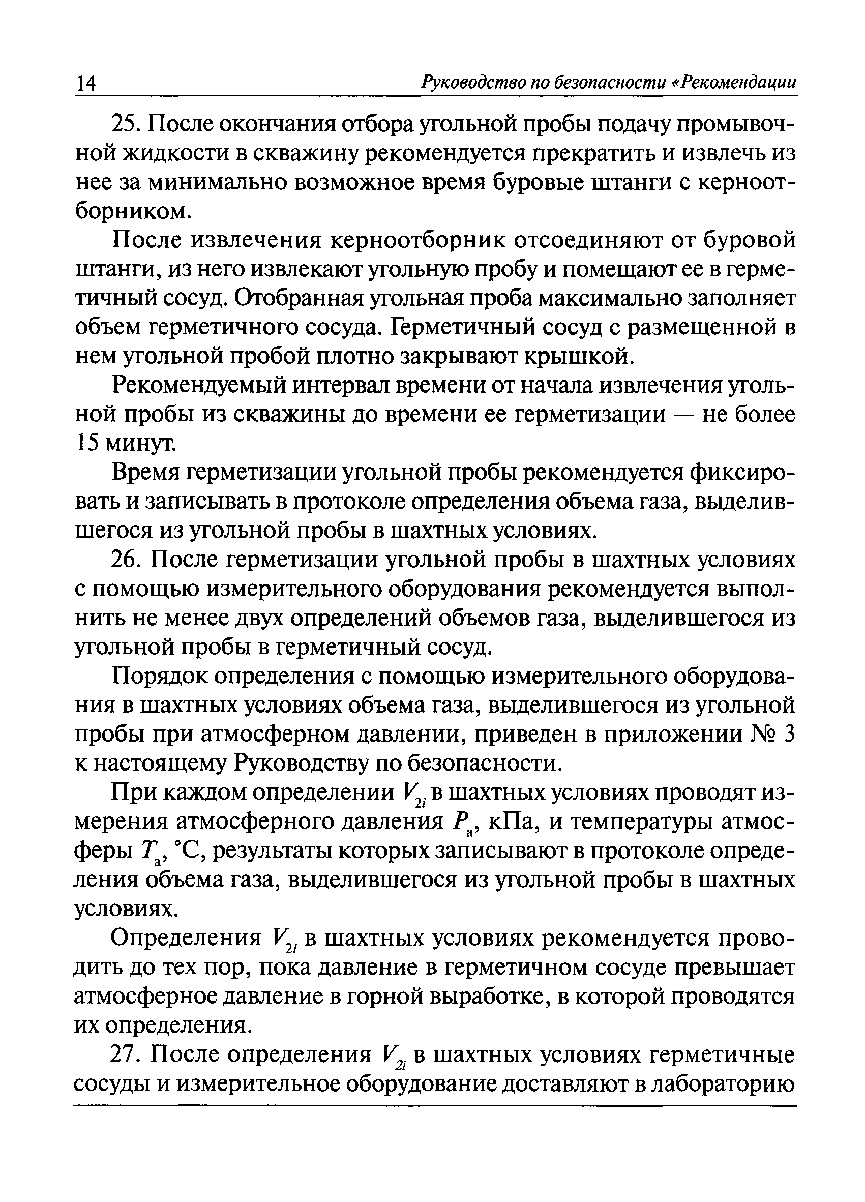 | Оглавление: | I. Общие положения II. Порядок выполнения работ по оценке газоносности угольных пластов Приложение 1. Термины и их определения, условные обозначения Приложение 2. Аппаратура и вспомогательные материалы Приложение 3. Порядок определения с помощью измерительного оборудования объема газа, выделившегося из угольной пробы Приложение 4. Порядок определения свободного объема герметичного сосуда и свободного объема дробилки Приложение 5. Формуляр герметичного сосуда Приложение 6. Ссылочные нормативные документы |