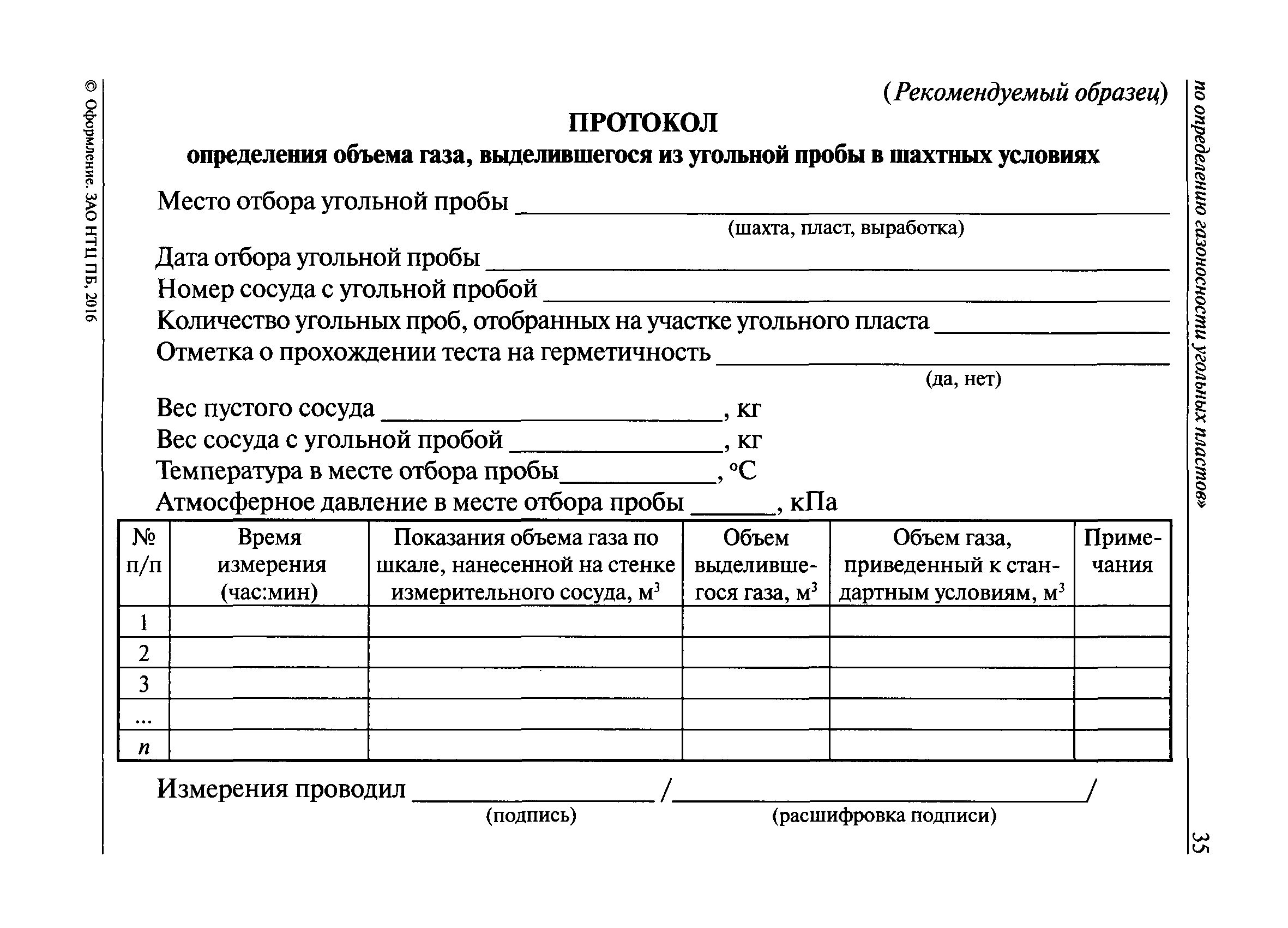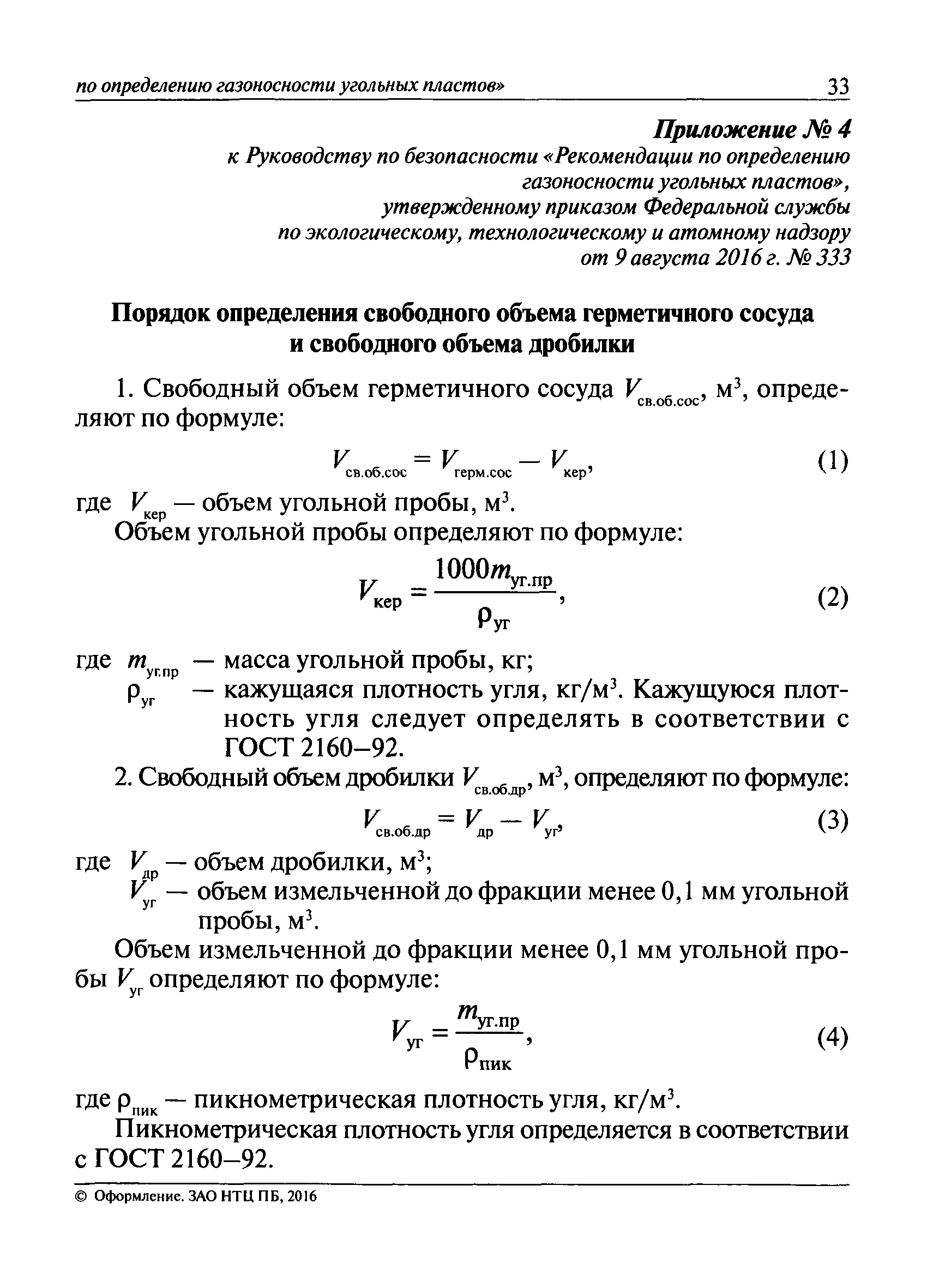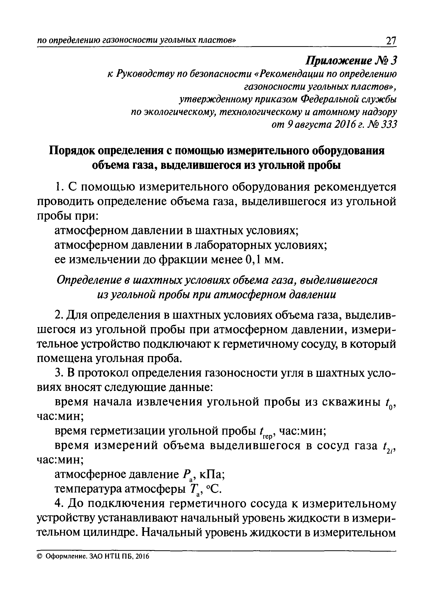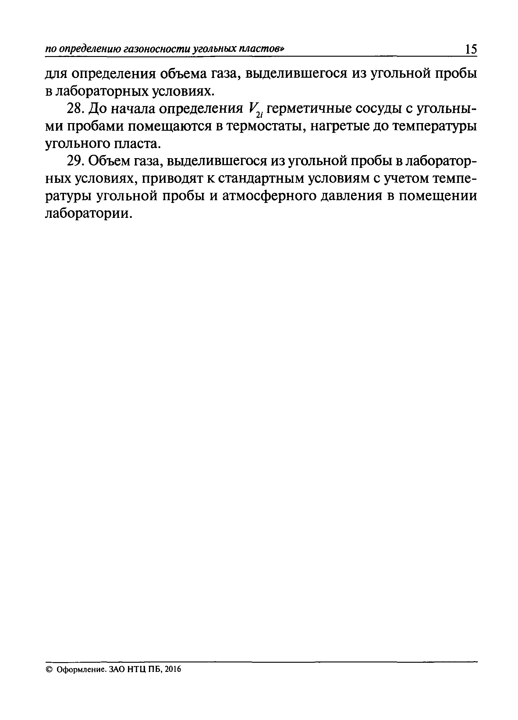 | Оглавление: | I. Общие положения II. Порядок выполнения работ по оценке газоносности угольных пластов Приложение 1. Термины и их определения, условные обозначения Приложение 2. Аппаратура и вспомогательные материалы Приложение 3. Порядок определения с помощью измерительного оборудования объема газа, выделившегося из угольной пробы Приложение 4. Порядок определения свободного объема герметичного сосуда и свободного объема дробилки Приложение 5. Формуляр герметичного сосуда Приложение 6. Ссылочные нормативные документы |