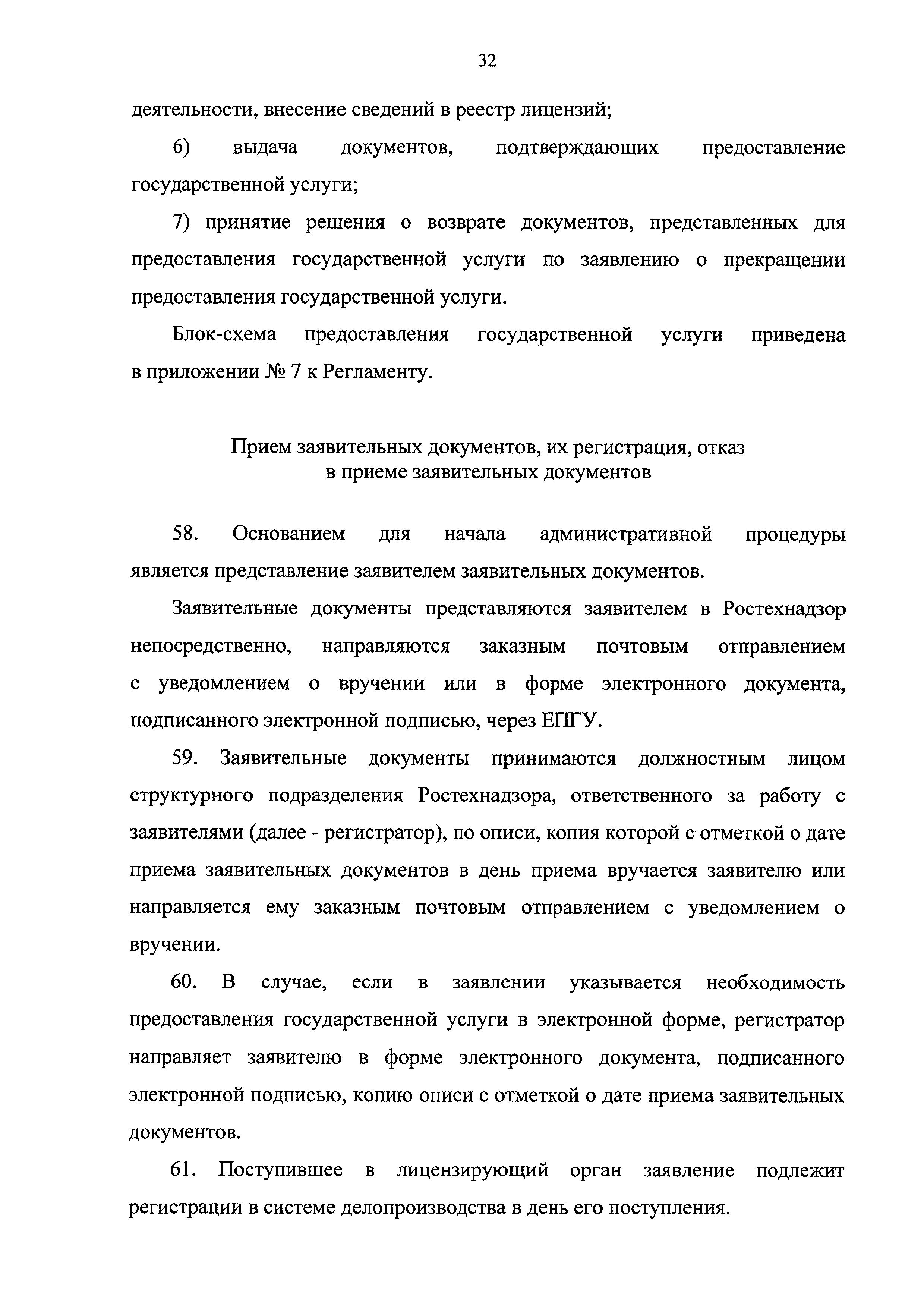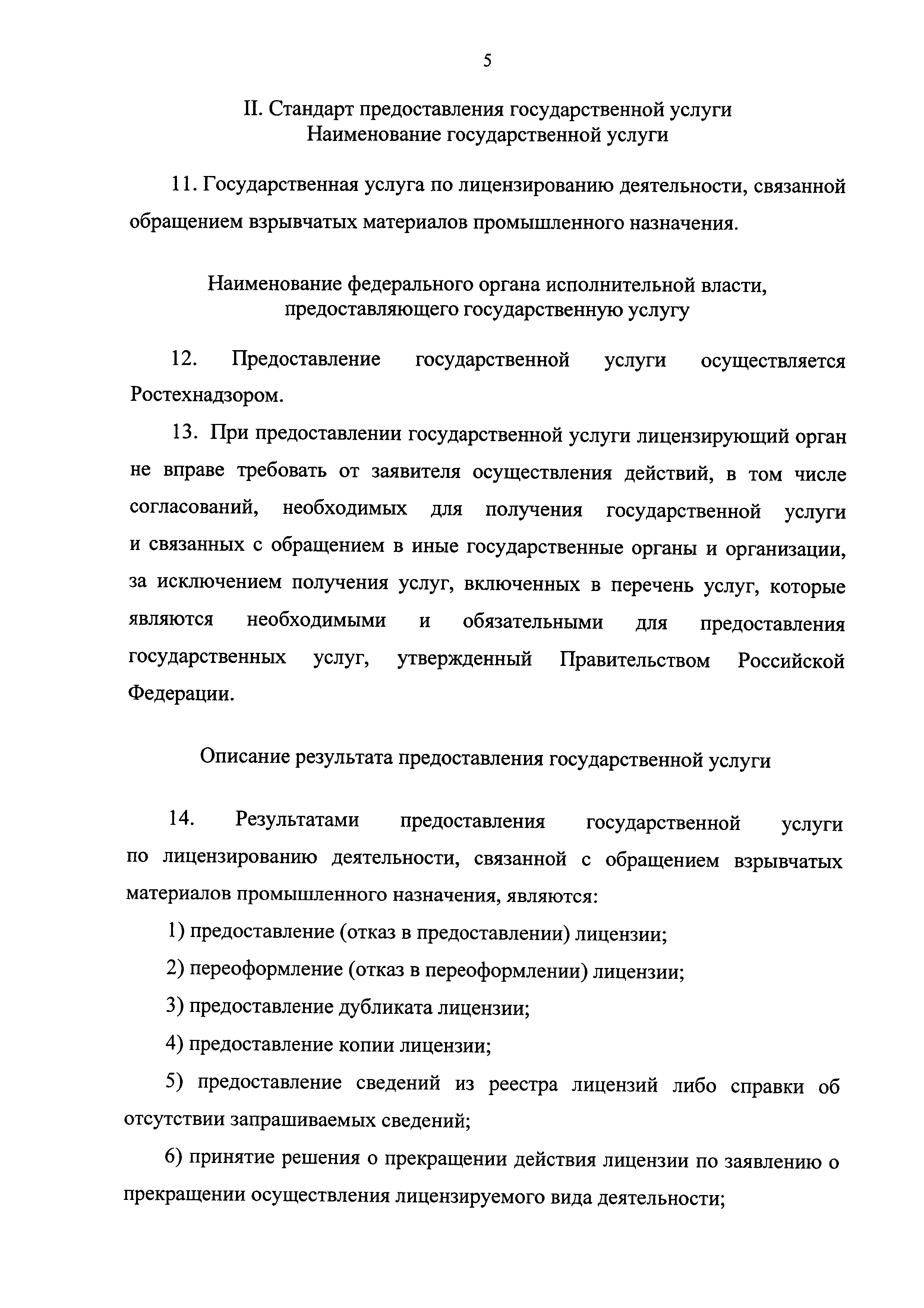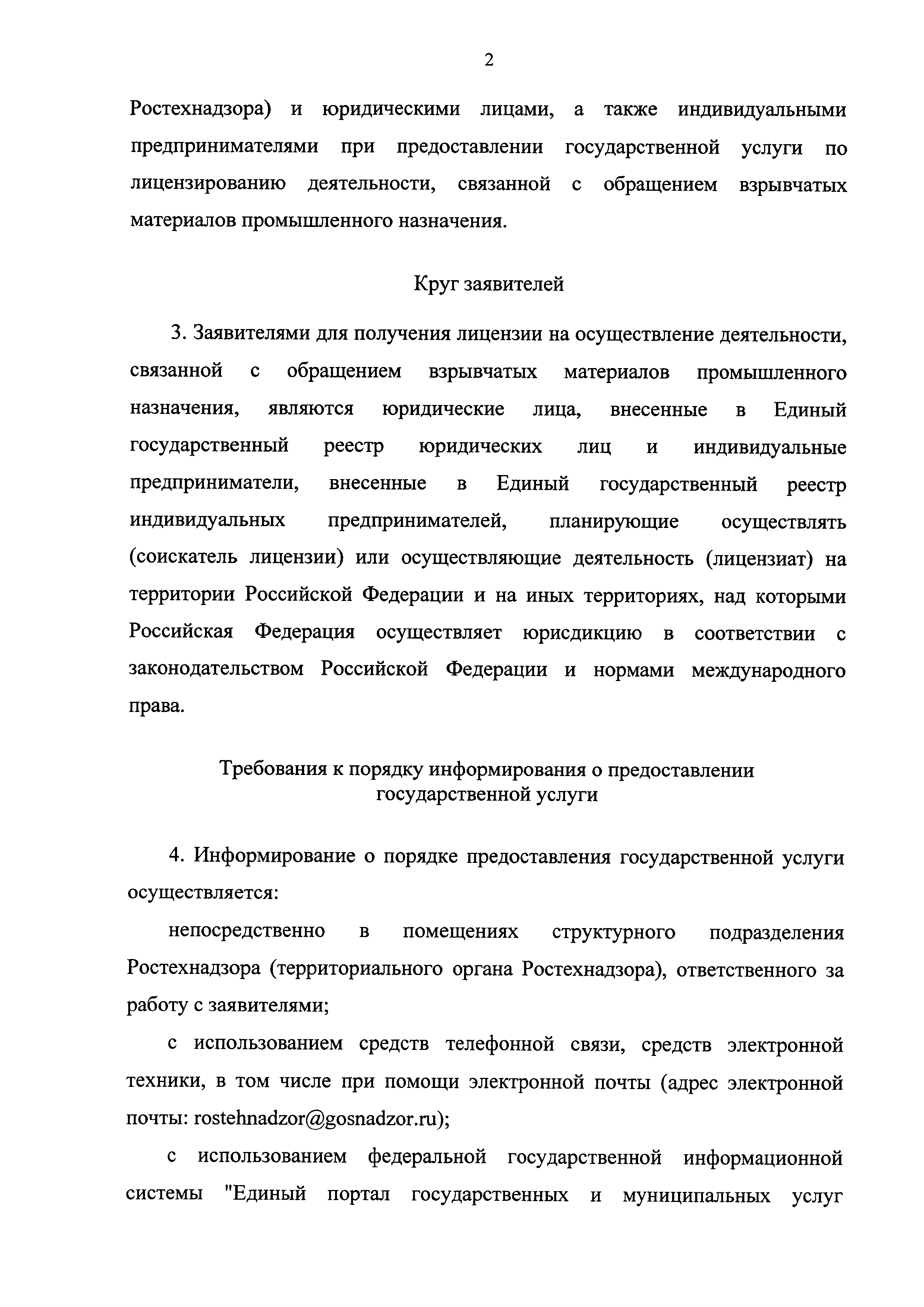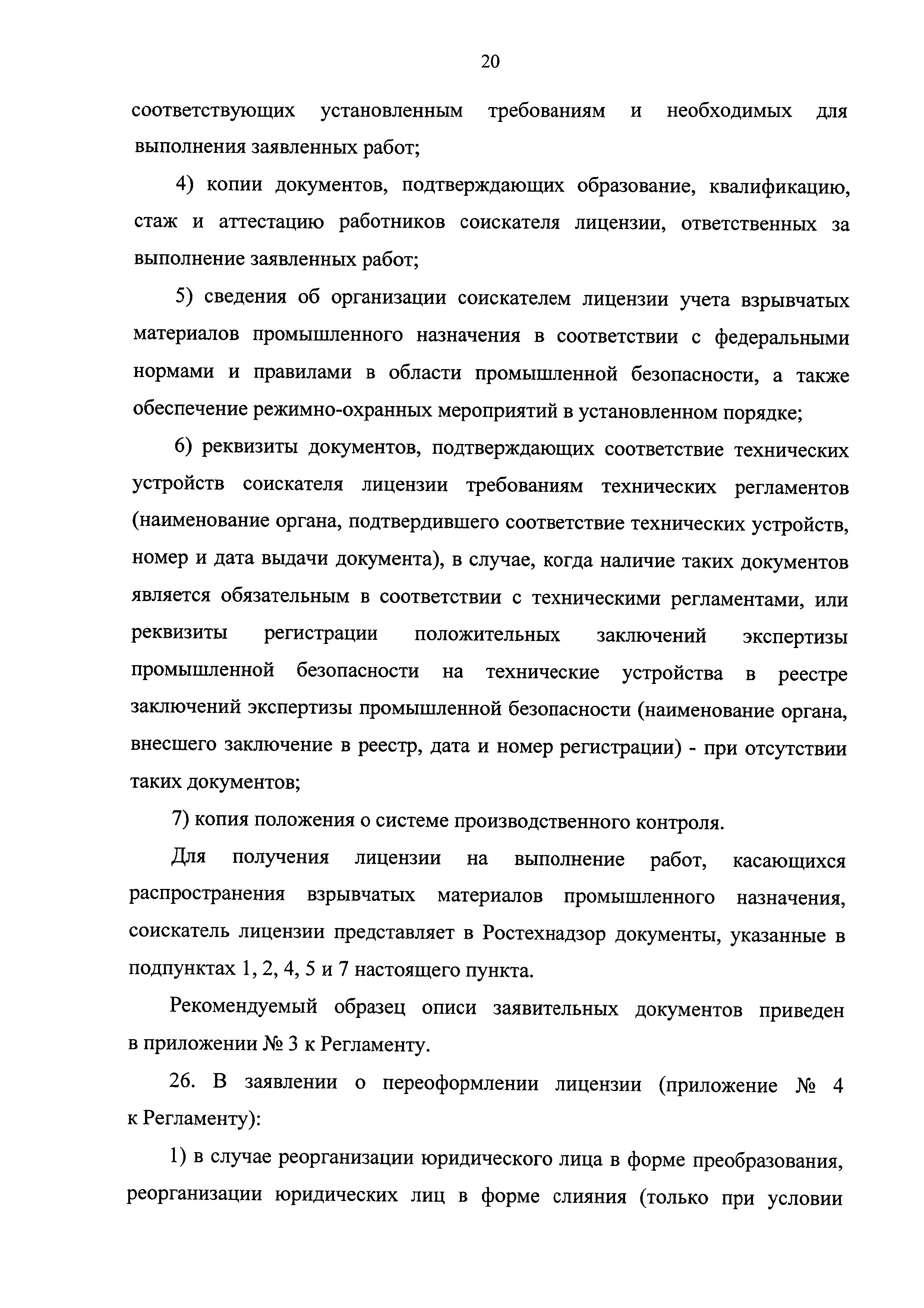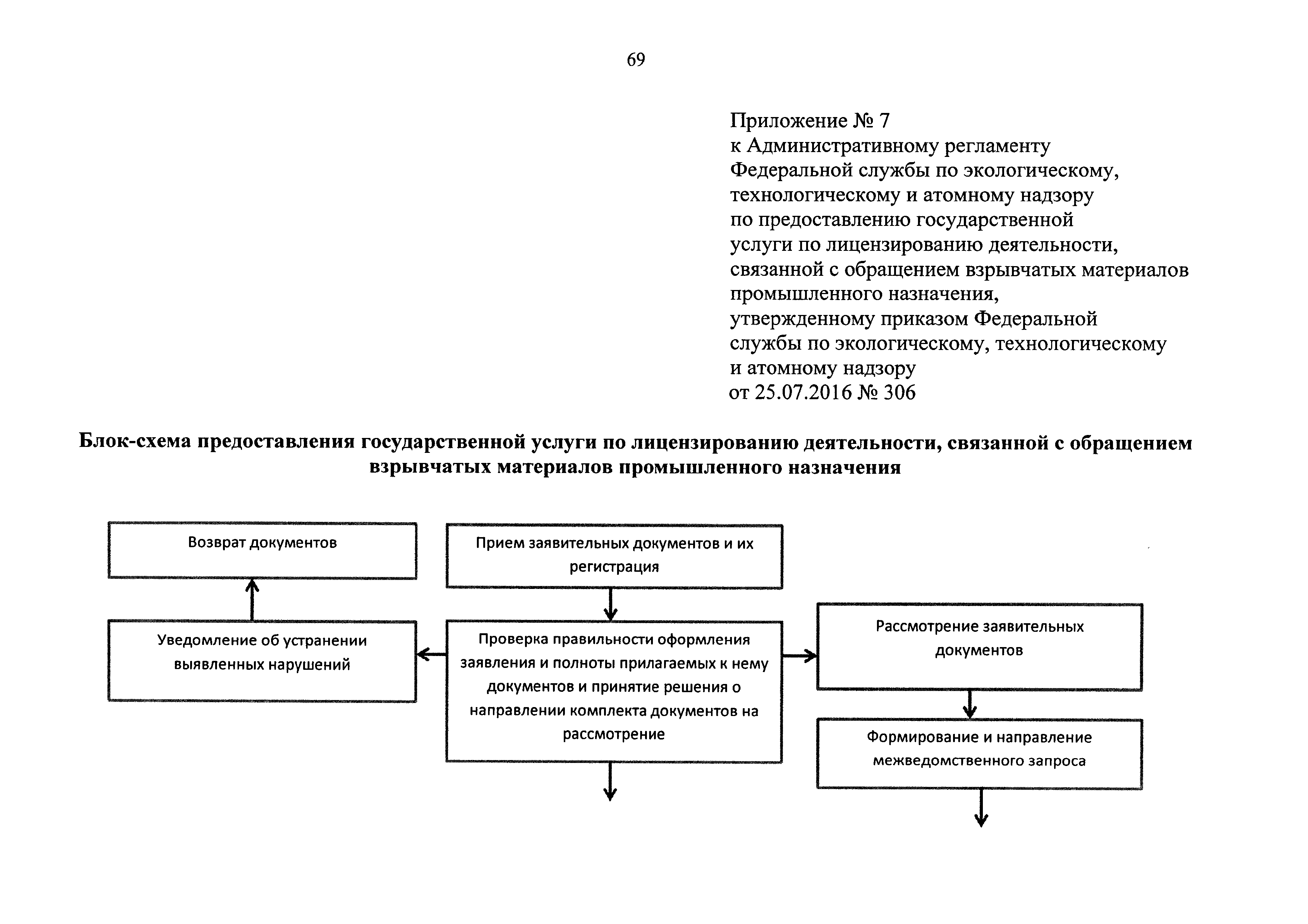 | Оглавление: | I. Общие положения II. Стандарт предоставления государственной услуги III. Состав, последовательность и сроки выполнения административных процедур (действий), требования к порядку их выполнения, в том числе особенности выполнения административных процедур (действий) в электронной форме IV. Формы контроля за исполнением Регламента V. Досудебный (внесудебный) порядок обжалования решений и действий (бездействия) Ростехнадзора, а также его должностных лиц Приложение № 1. Информация о местах нахождения, контактных телефонах, официальных сайтах, адресах электронной почты центрального аппарата и территориальных органов Ростехнадзора Приложение № 2. Заявление о предоставлении лицензии Приложение № 3. Опись документов Приложение № 4. Заявление о переоформлении лицензии Приложение № 5. Заявление о предоставлении дубликата или копии лицензии Приложение № 6. Заявление о прекращении лицензируемого вида деятельности Приложение № 7. Блок-схема предоставления государственной услуги по лицензированию деятельности, связанной с обращением взрывчатых материалов промышленного назначения |