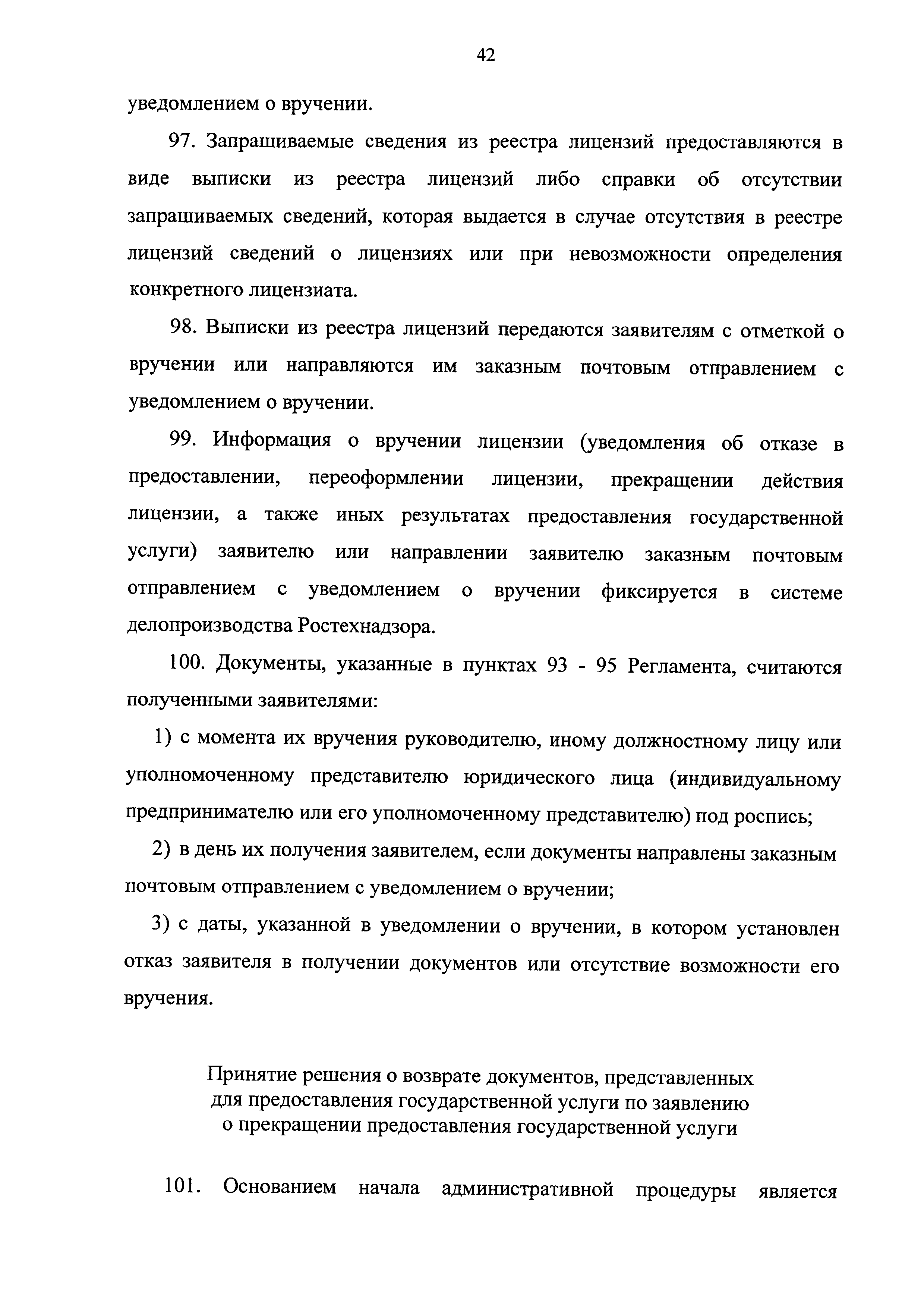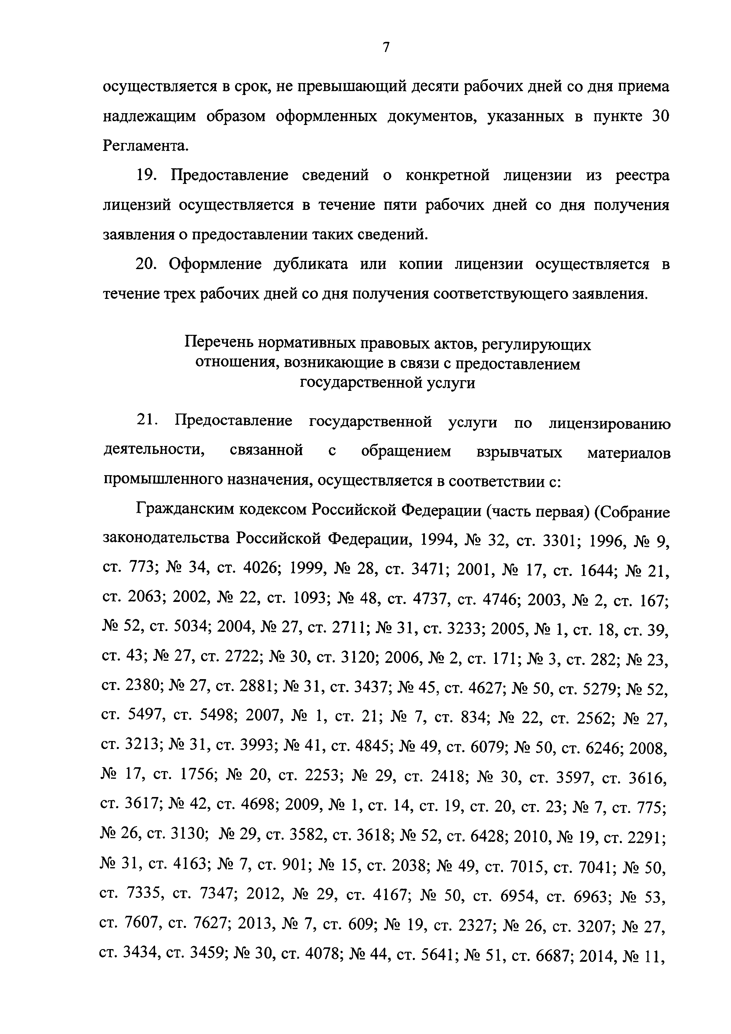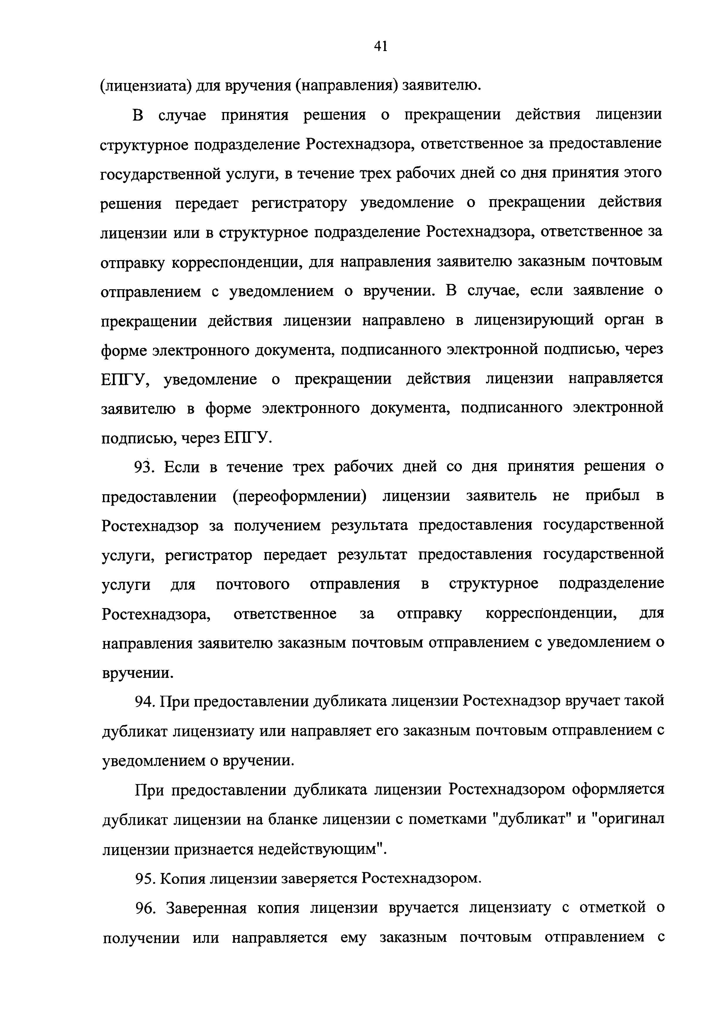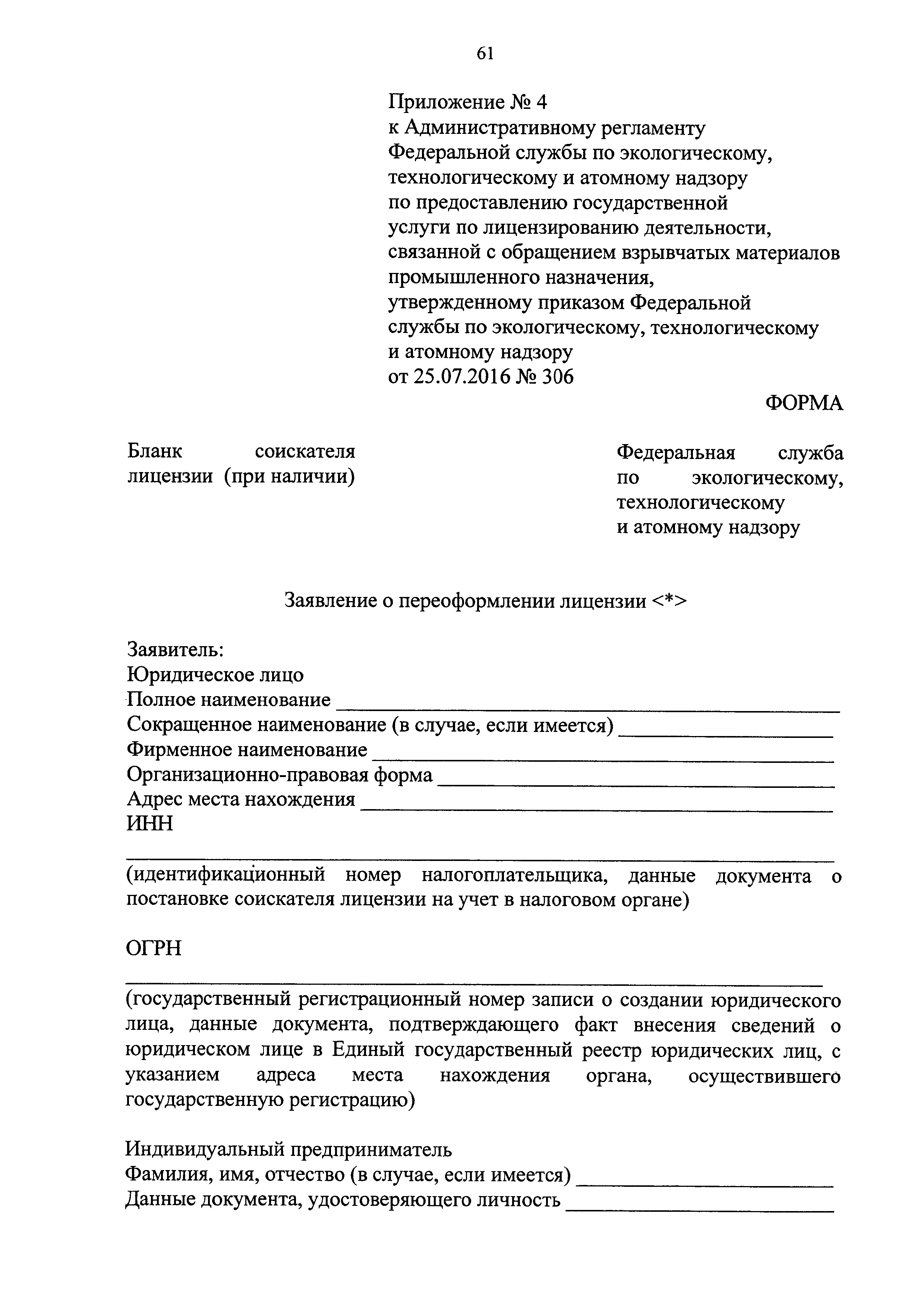 | Оглавление: | I. Общие положения II. Стандарт предоставления государственной услуги III. Состав, последовательность и сроки выполнения административных процедур (действий), требования к порядку их выполнения, в том числе особенности выполнения административных процедур (действий) в электронной форме IV. Формы контроля за исполнением Регламента V. Досудебный (внесудебный) порядок обжалования решений и действий (бездействия) Ростехнадзора, а также его должностных лиц Приложение № 1. Информация о местах нахождения, контактных телефонах, официальных сайтах, адресах электронной почты центрального аппарата и территориальных органов Ростехнадзора Приложение № 2. Заявление о предоставлении лицензии Приложение № 3. Опись документов Приложение № 4. Заявление о переоформлении лицензии Приложение № 5. Заявление о предоставлении дубликата или копии лицензии Приложение № 6. Заявление о прекращении лицензируемого вида деятельности Приложение № 7. Блок-схема предоставления государственной услуги по лицензированию деятельности, связанной с обращением взрывчатых материалов промышленного назначения |