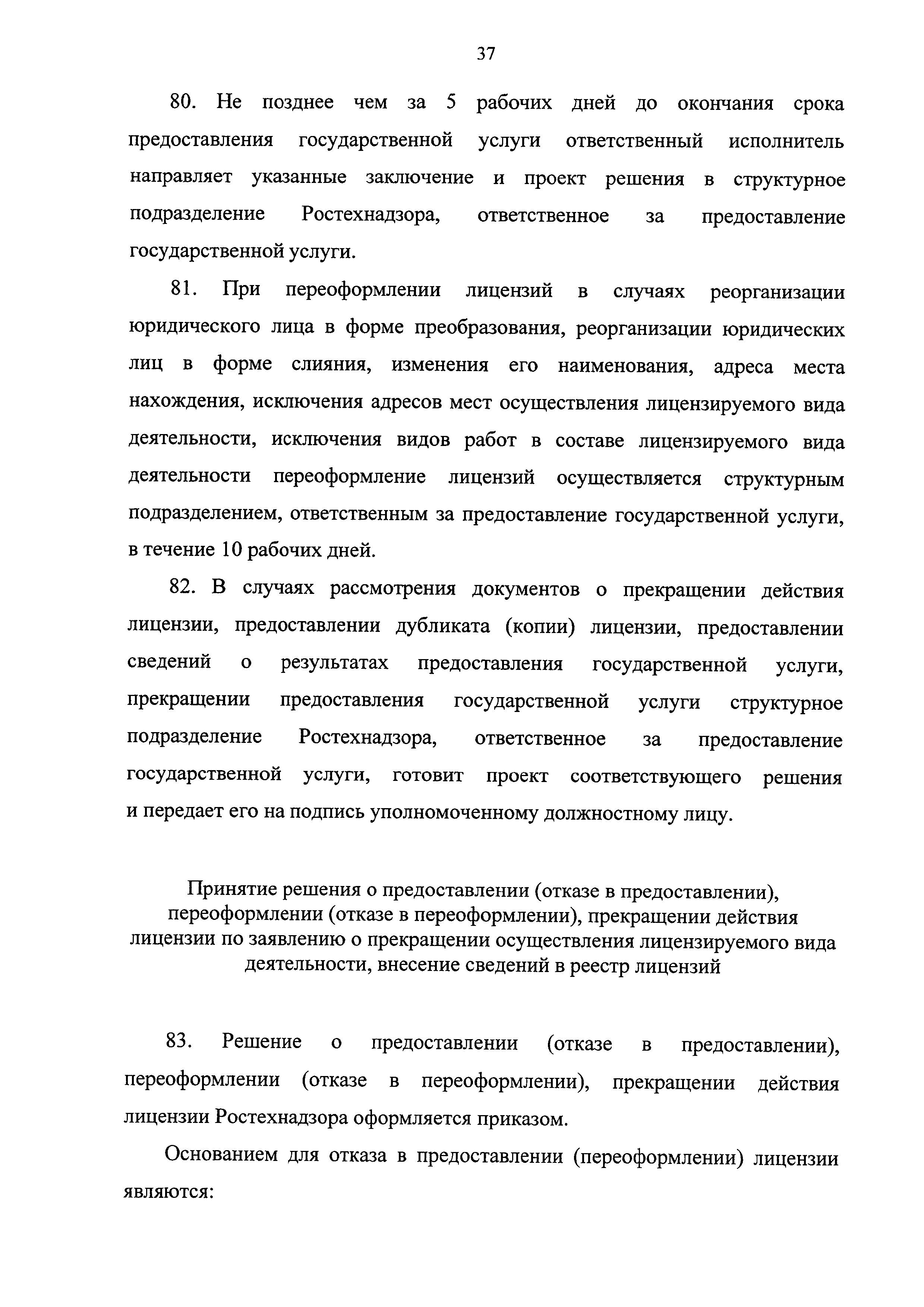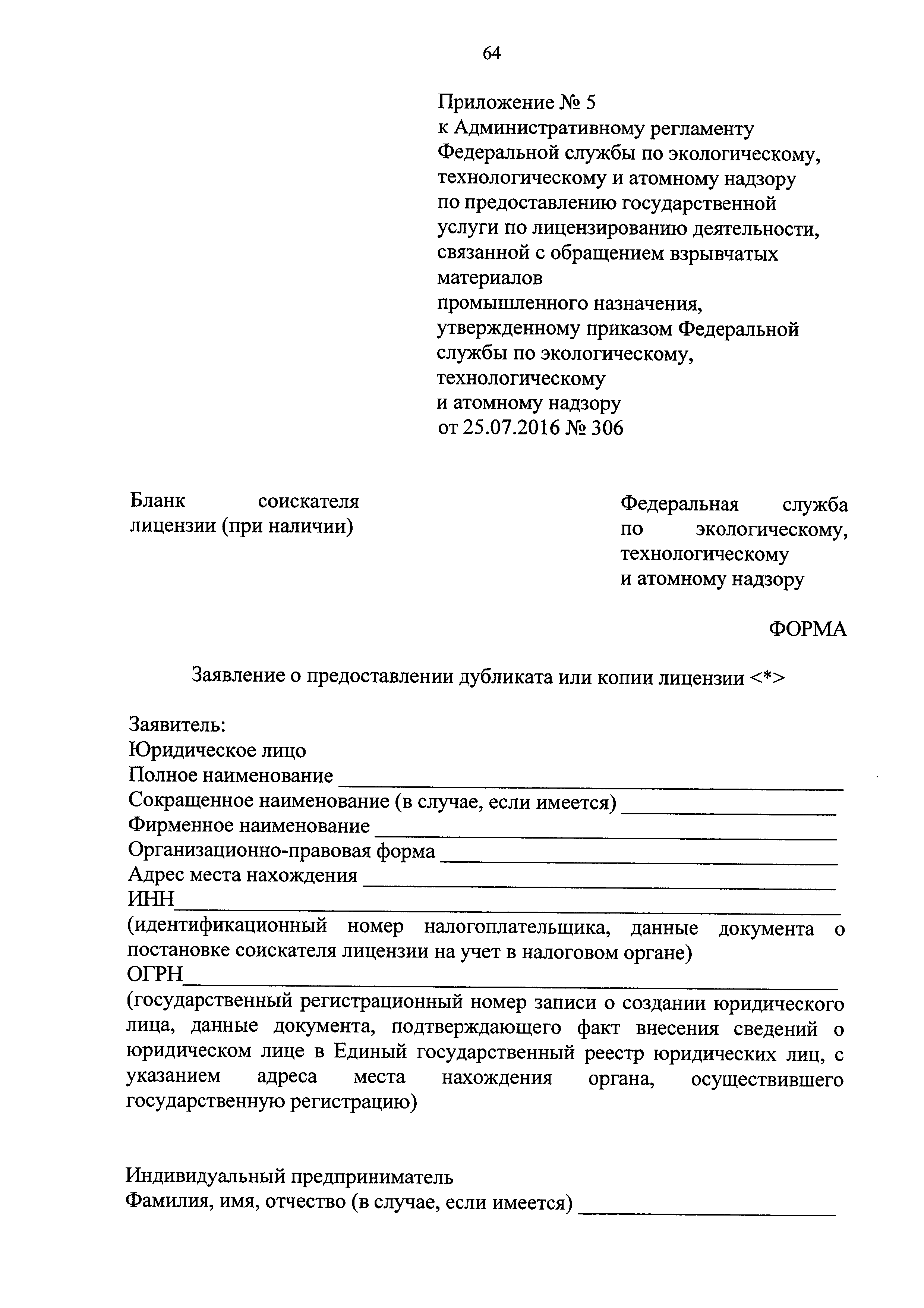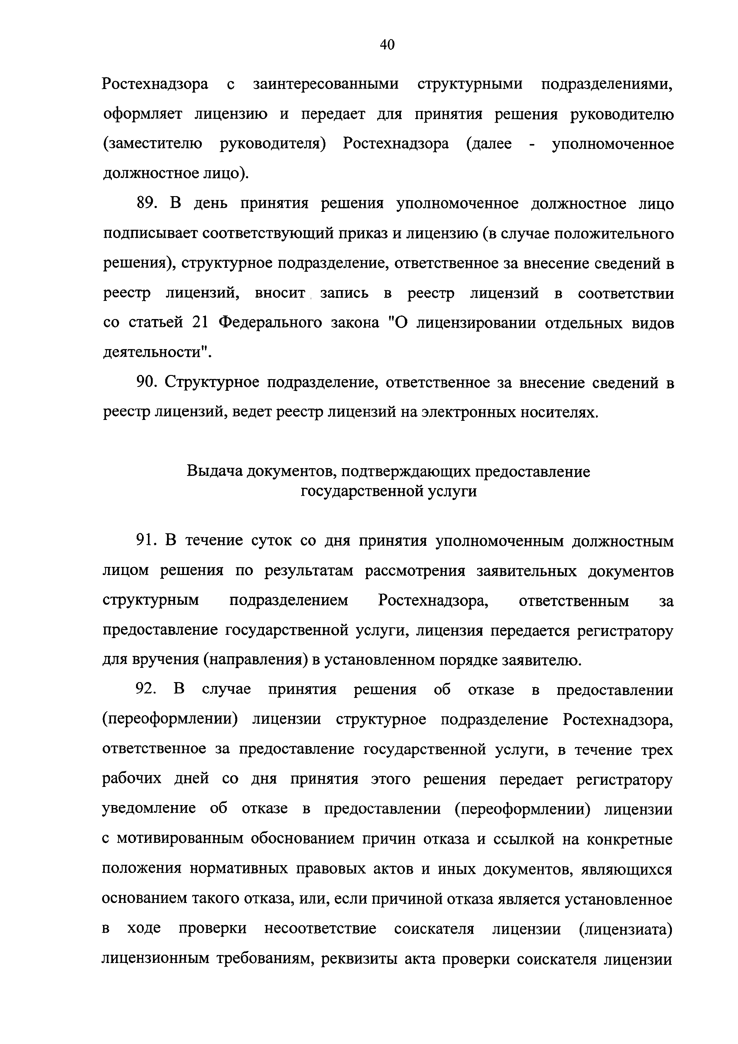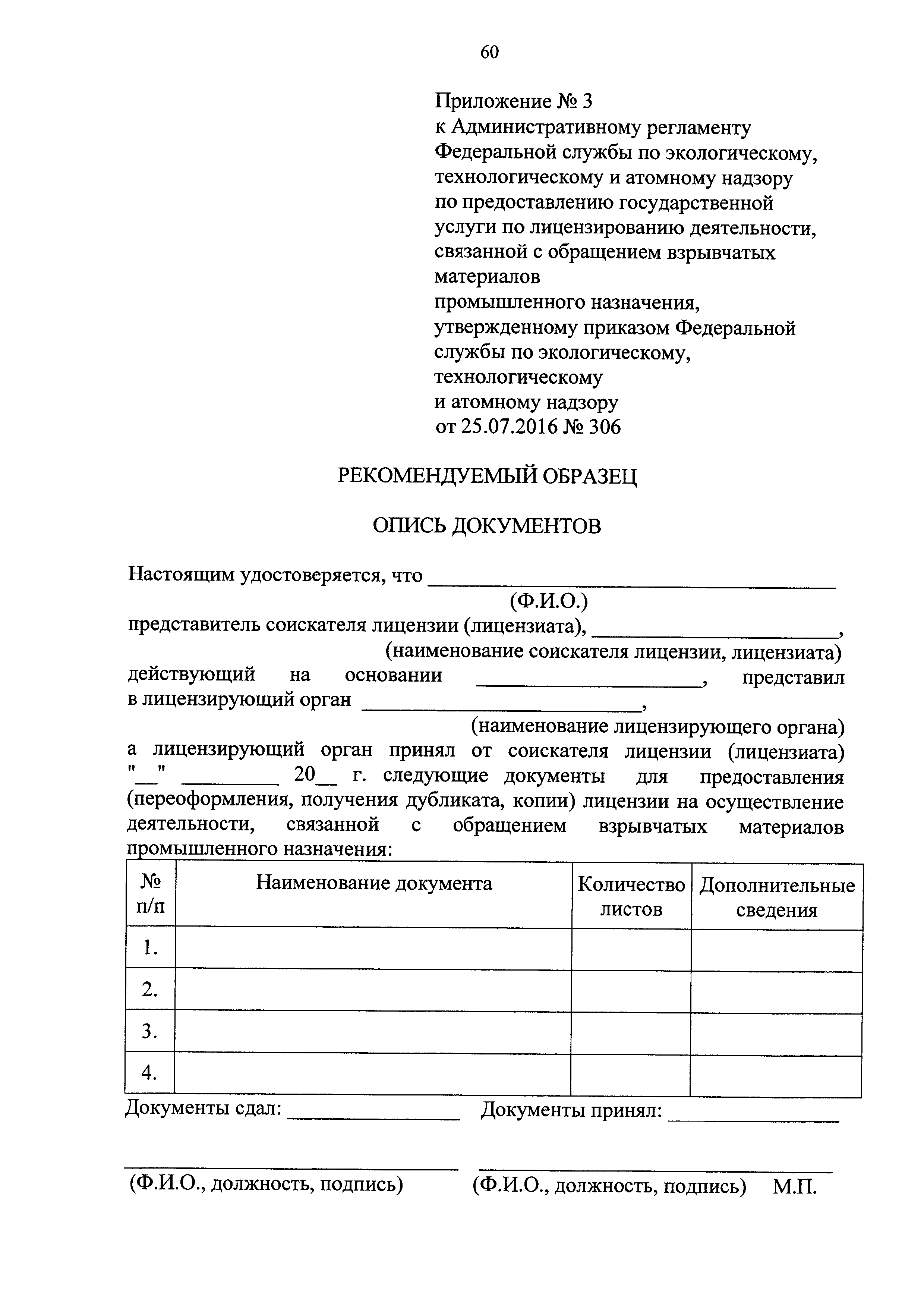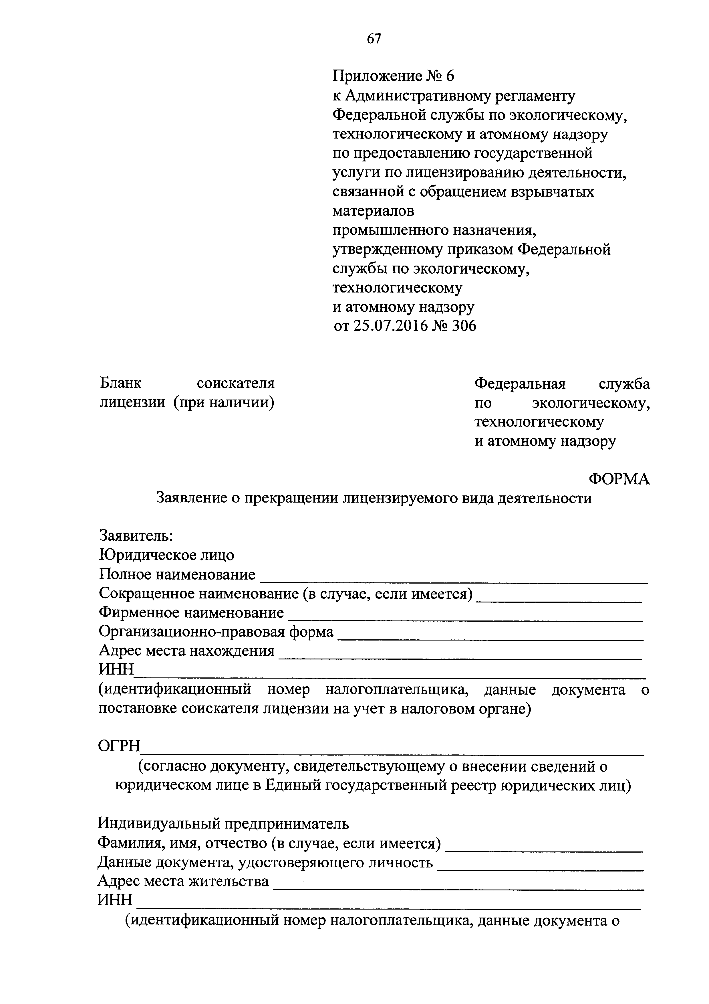 | Оглавление: | I. Общие положения II. Стандарт предоставления государственной услуги III. Состав, последовательность и сроки выполнения административных процедур (действий), требования к порядку их выполнения, в том числе особенности выполнения административных процедур (действий) в электронной форме IV. Формы контроля за исполнением Регламента V. Досудебный (внесудебный) порядок обжалования решений и действий (бездействия) Ростехнадзора, а также его должностных лиц Приложение № 1. Информация о местах нахождения, контактных телефонах, официальных сайтах, адресах электронной почты центрального аппарата и территориальных органов Ростехнадзора Приложение № 2. Заявление о предоставлении лицензии Приложение № 3. Опись документов Приложение № 4. Заявление о переоформлении лицензии Приложение № 5. Заявление о предоставлении дубликата или копии лицензии Приложение № 6. Заявление о прекращении лицензируемого вида деятельности Приложение № 7. Блок-схема предоставления государственной услуги по лицензированию деятельности, связанной с обращением взрывчатых материалов промышленного назначения |