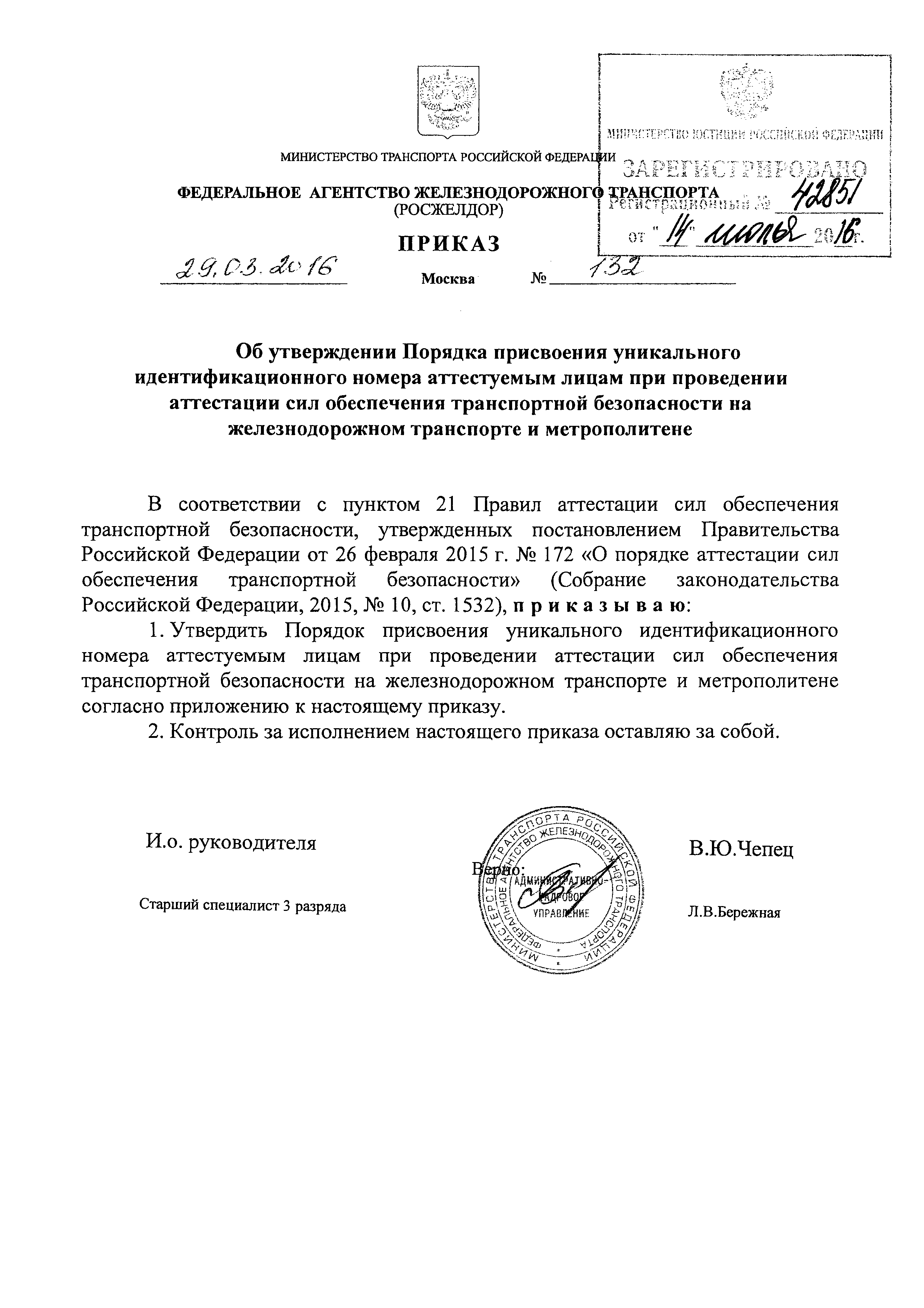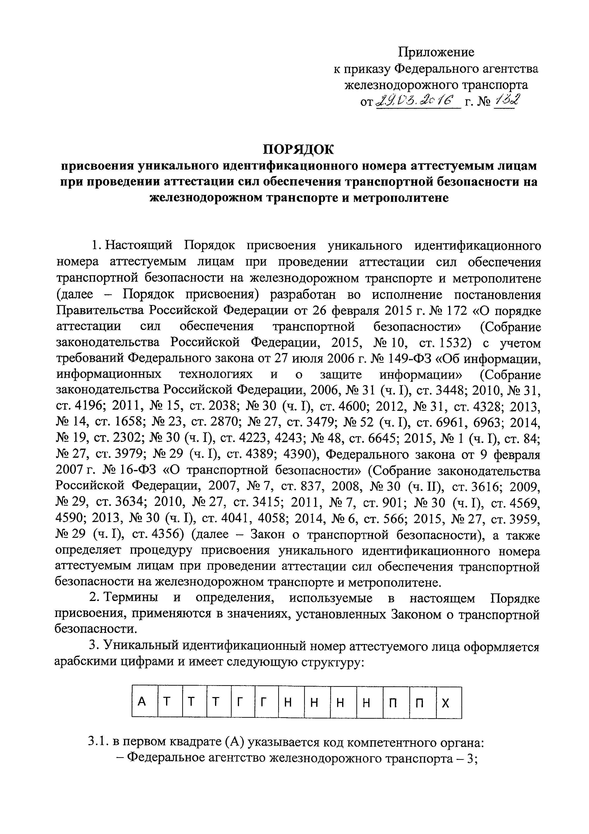 | Название рус.: | Порядок присвоения уникального идентификационного номера аттестуемым лицам при проведении аттестации сил обеспечения транспортной безопасности на железнодорожном транспорте и метрополитене |