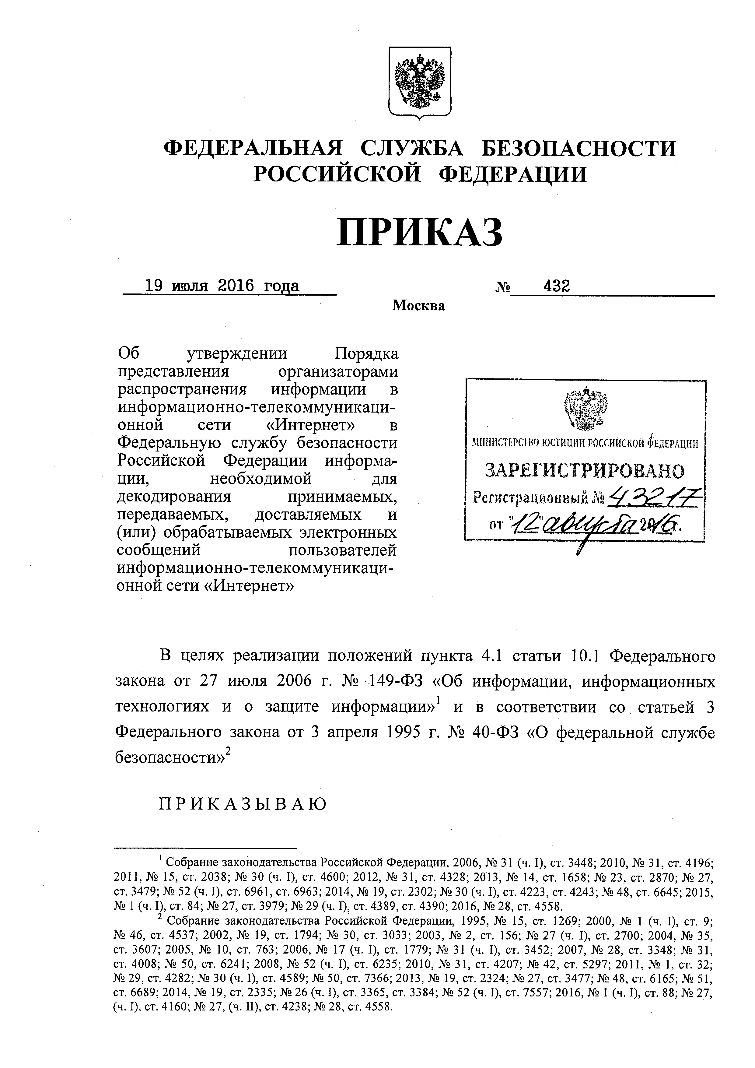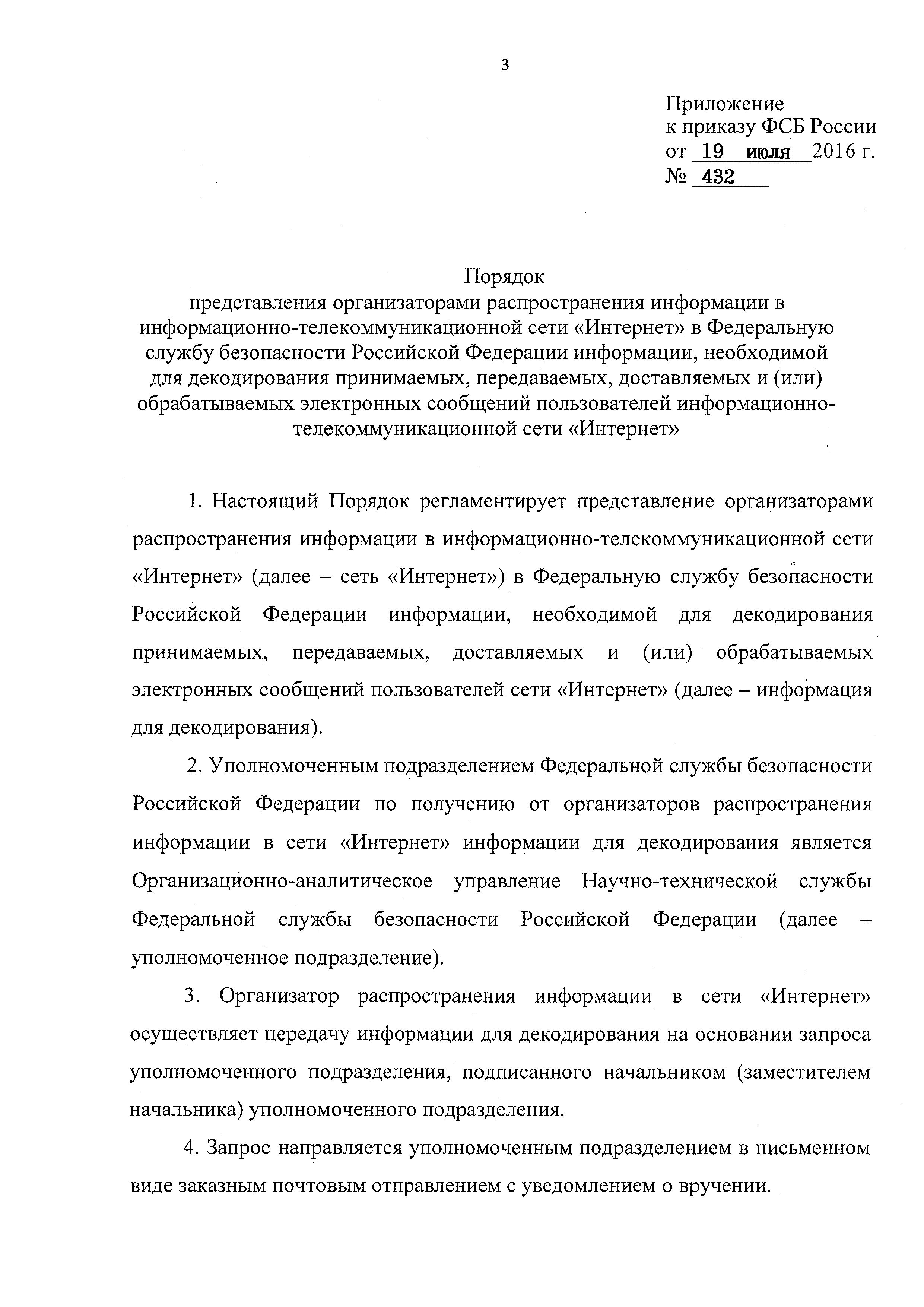 Порядок представления организаторами распространения информации в информационно-телекоммуникационной сети "Интернет" в Федеральную службу безопасности Российской Федерации информации, необходимой для декодирования принимаемых, передаваемых, доставляемых и (или) обрабатываемых электронных сообщений пользователей информационно-телекоммуникационной сети "Интернет"| Статус: | действует | | Название рус.: | Порядок представления организаторами распространения информации в информационно-телекоммуникационной сети "Интернет" в Федеральную службу безопасности Российской Федерации информации, необходимой для декодирования принимаемых, передаваемых, доставляемых и (или) обрабатываемых электронных сообщений пользователей информационно-телекоммуникационной сети "Интернет" | | Дата добавления в базу: | 01.02.2017 | | Дата актуализации: | 01.01.2021 | | Дата введения: | 23.08.2016 | | Область применения: | Порядок регламентирует представление организаторами распространения информации в информационно-телекоммуникационной сети "Интернет" в Федеральную службу безопасности Российской Федерации информации, необходимой для декодирования принимаемых, передаваемых, доставляемых и (или) обрабатываемых электронных сообщений пользователей сети "Интернет" | | Утверждён: | 19.07.2016 ФСБ РФ (432)