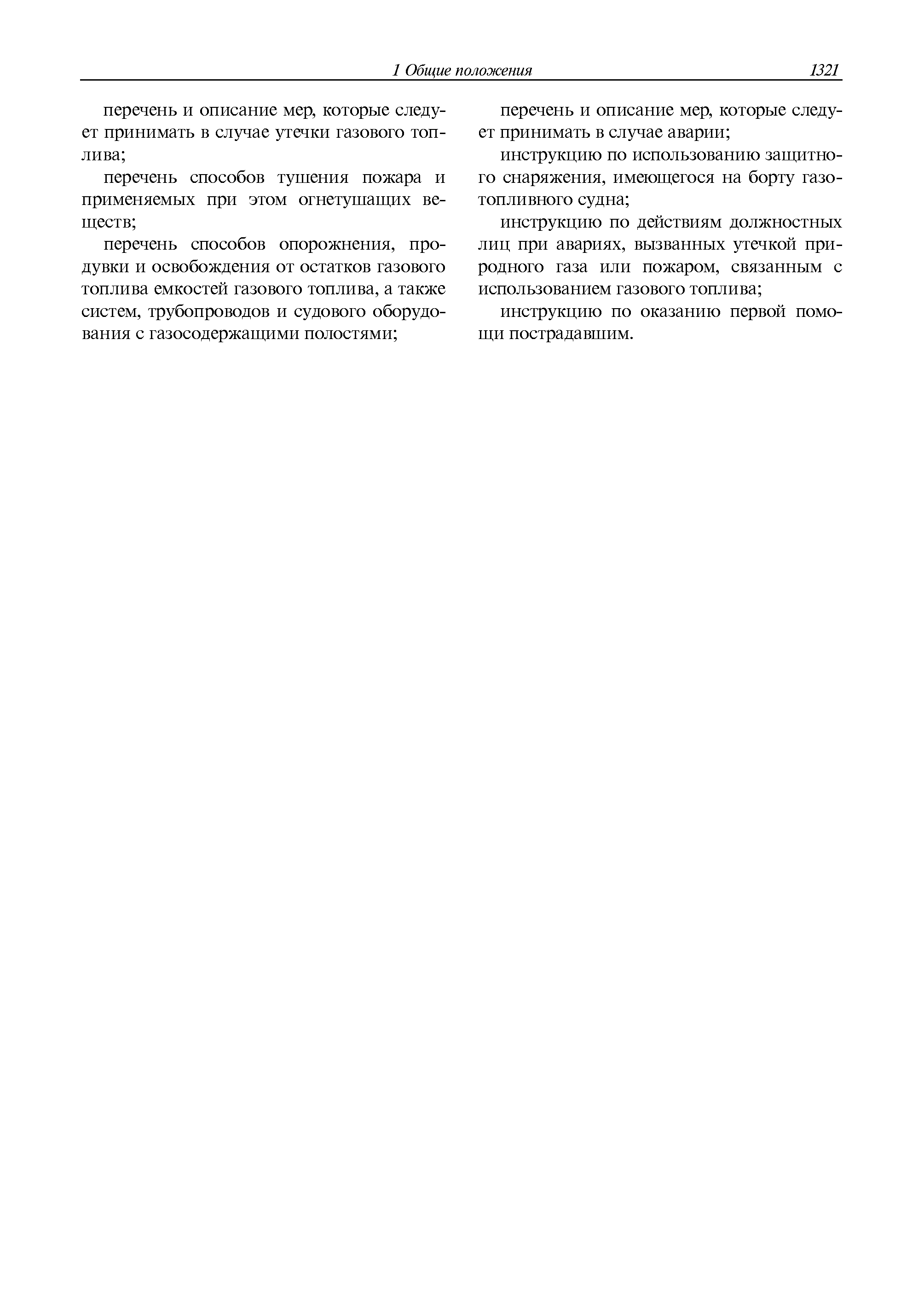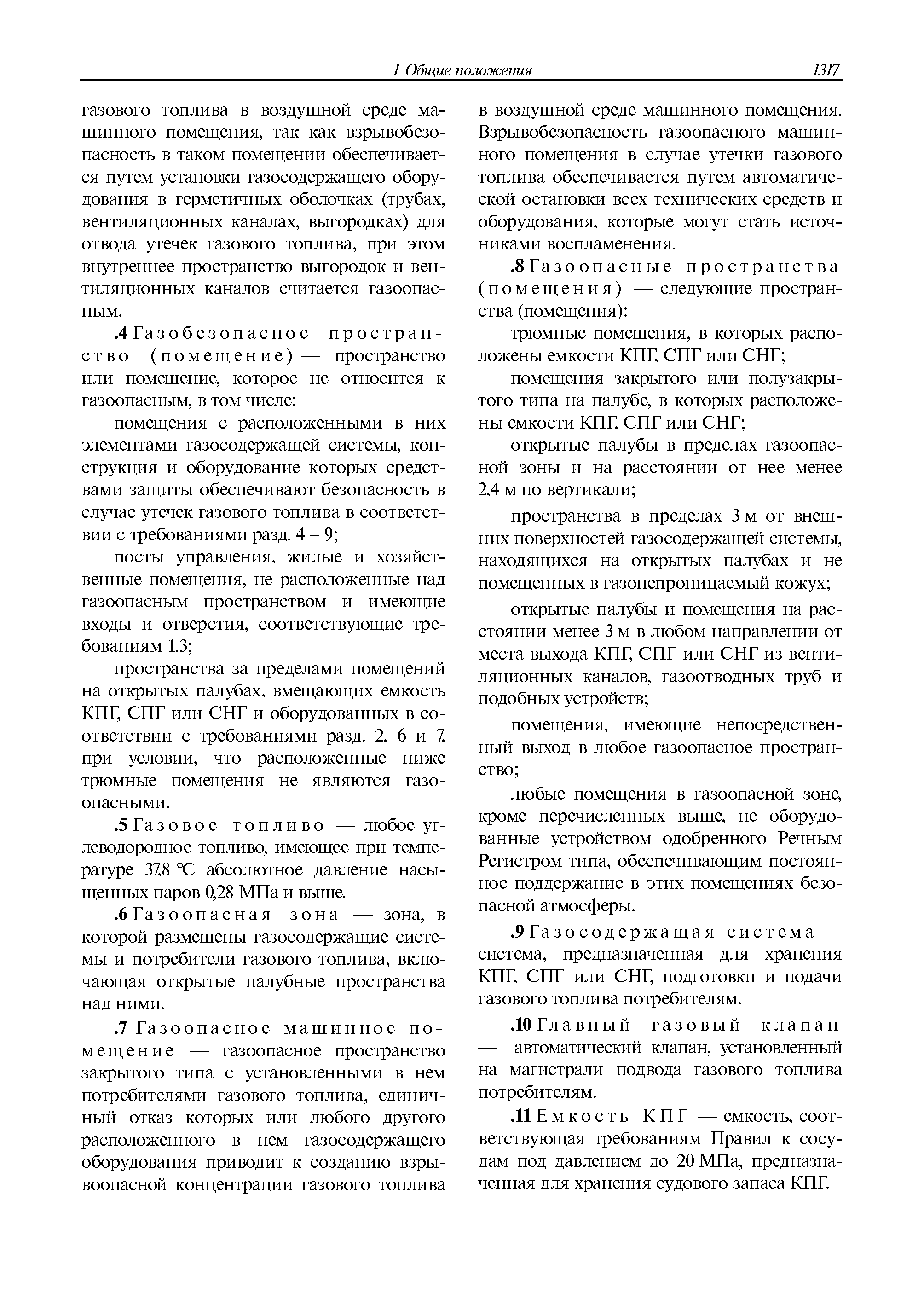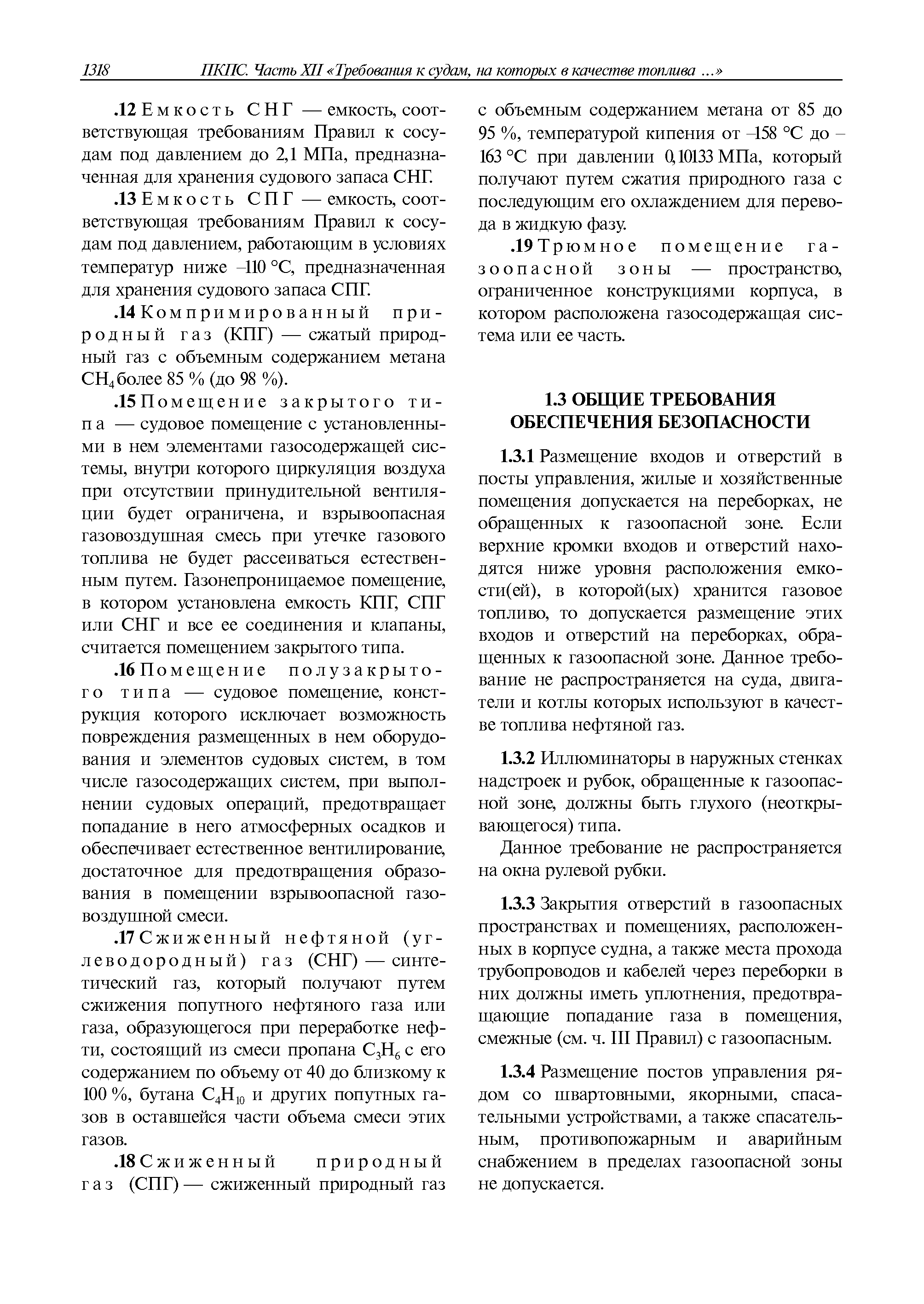 Часть XII. Требования к судам, на которых в качестве топлива используется природный или нефтяной газ| Статус: | продлен срок действия | | Название рус.: | Часть XII. Требования к судам, на которых в качестве топлива используется природный или нефтяной газ | | Дата добавления в базу: | 01.02.2017 | | Дата актуализации: | 01.01.2021 | | Дата введения: | 09.09.2015 | | Область применения: | Часть Правил устанавливает требования к судам, использующим компримированный природный газ в качестве топлива для судовых потребителей, при условии их соответствия требованиям частей 0 - ХI Правил. Требования настоящей части Правил распространяются на суда, кроме нефтеналивных, на которых в качестве топлива для главных, вспомогательных двигателей и автономных котлов используется КПГ с объемной долей метана более 85 процентов. Требования настоящей части Правил предназначены для применения при проектировании, постройке и эксплуатации судов, указанных в 1.1.2, а также при переоборудовании судов иных типов, находящихся в эксплуатации, в газотопливные суда. | | Оглавление: | 1 Общие положения 1.1 Область применения 1.2 Термины и их определения 1.3 Общие требования обеспечения безопасности 1.4 Газоопасные и газобезопасные машинные помещения 1.5 Техническая и эксплуатационная документация. Информационные материалы 2 Емкости для хранения запасов газового топлива 2.1 Размещение и крепление емкостей для газового топлива 2.2 Емкости КПГ 2.3 Емкости СПГ 2.4 Емкости СНГ 2.5 Предохранительные клапаны 3 Оборудование и системы для подготовки газового топлива и подачи его потребителям 3.1 Общие требования 3.2 Оборудование и трубопроводы, содержащие КПГ 3.3 Оборудование и трубопроводы, содержащие СПГ 3.4 Оборудование и трубопроводы, содержащие СНГ 3.5 Компрессорные помещения и станции приема (выдачи) запасов СНГ 4 Потребители газового топлива 4.1 Главные и вспомогательные двигатели 4.2 Котлы 4.3 Прочие потребители 5 Вентиляция помещений 5.1 Помещения, обслуживаемые экипажем 5.2 Редко посещаемые и другие помещения 6 Контроль загазованности помещении 6.1 Общие требования 7 Противопожарная защита 7.1 Конструктивная противопожарная защита 7.2 Противопожарное оборудование и системы пожаротушения 8 Электрооборудование 8.1 Общие требования 9 Автоматизация 9.1 Объем функций системы автоматизации 10 Защита экипажа 10.1 Общие требования | | Разработан: | Российский Речной Регистр